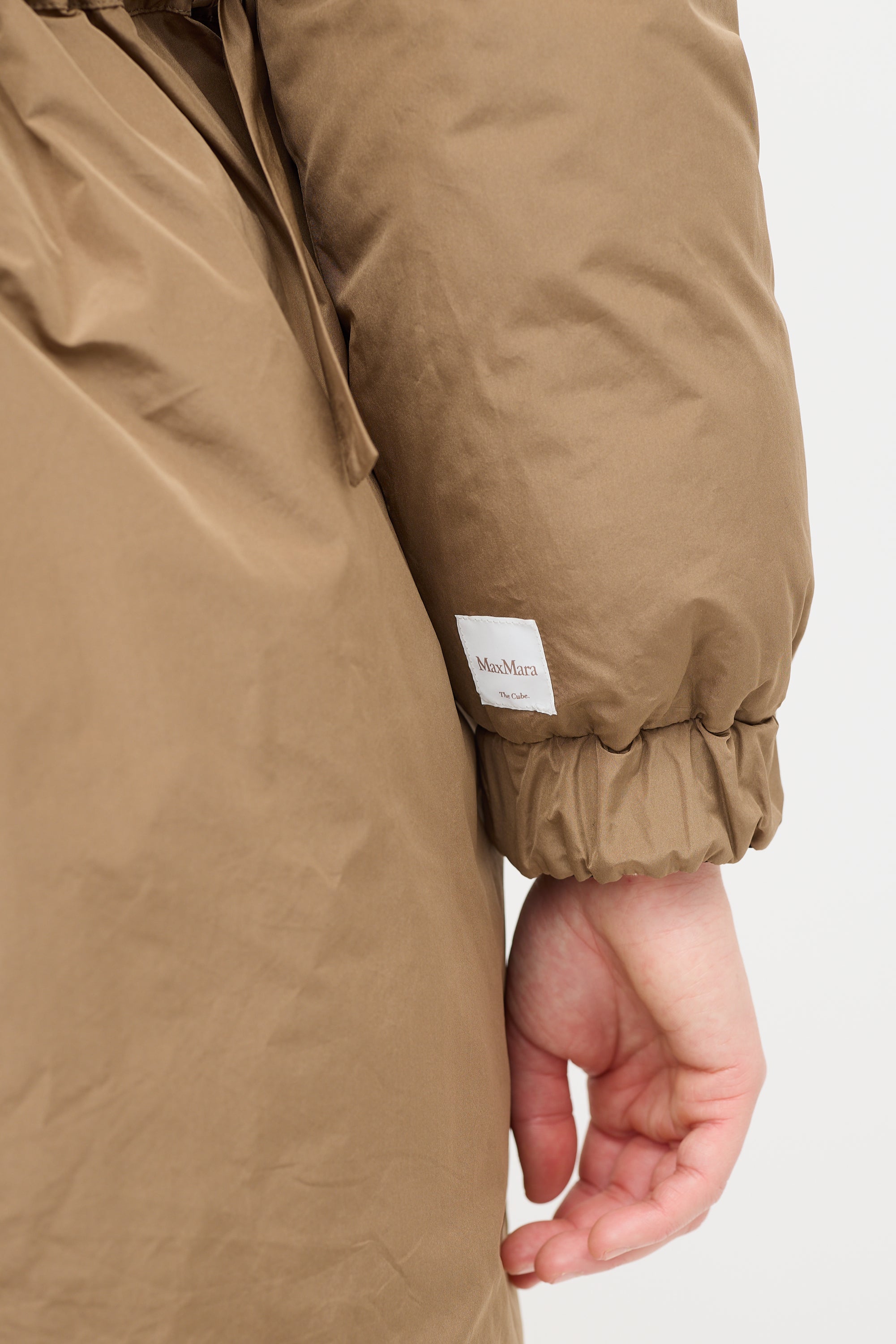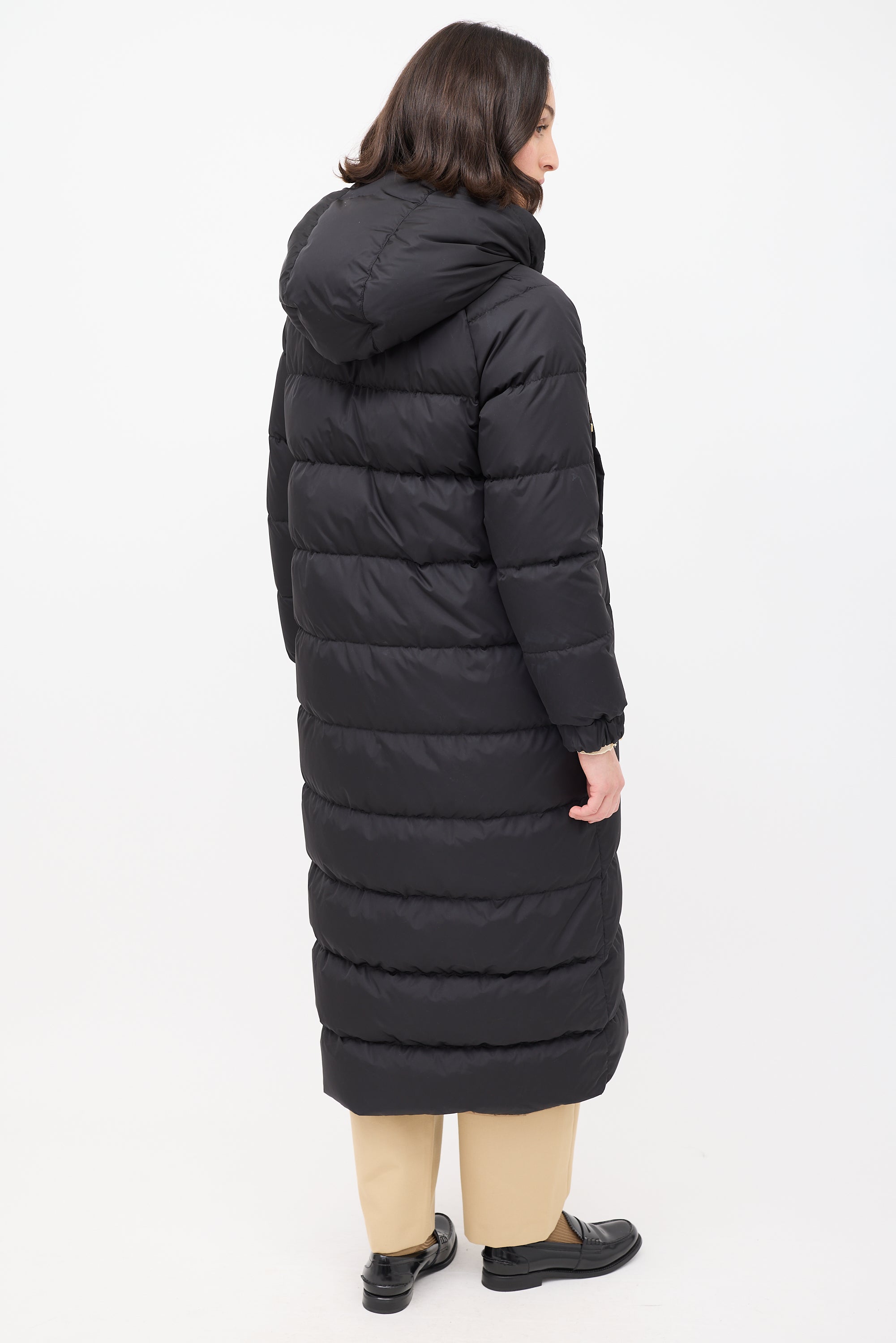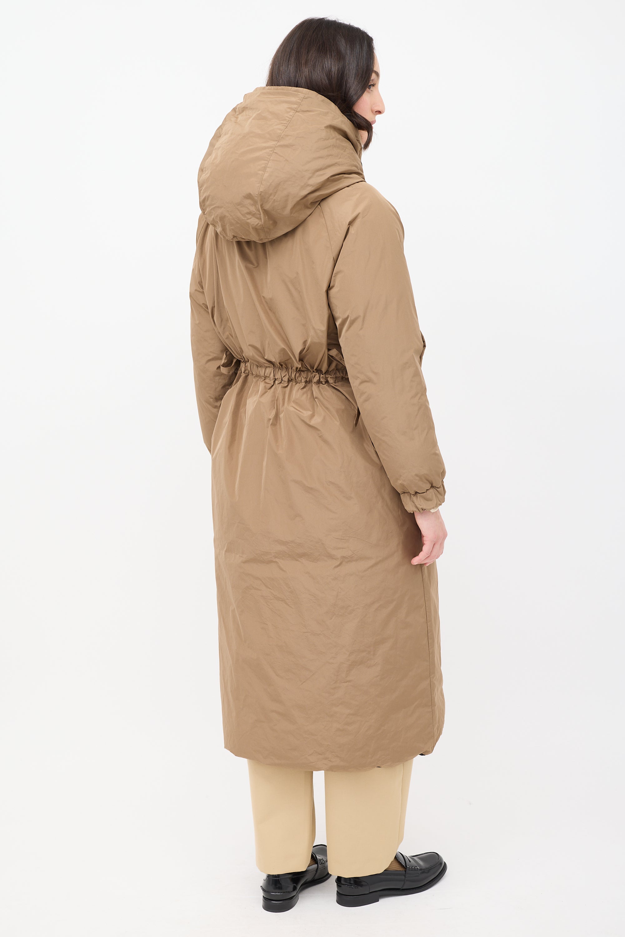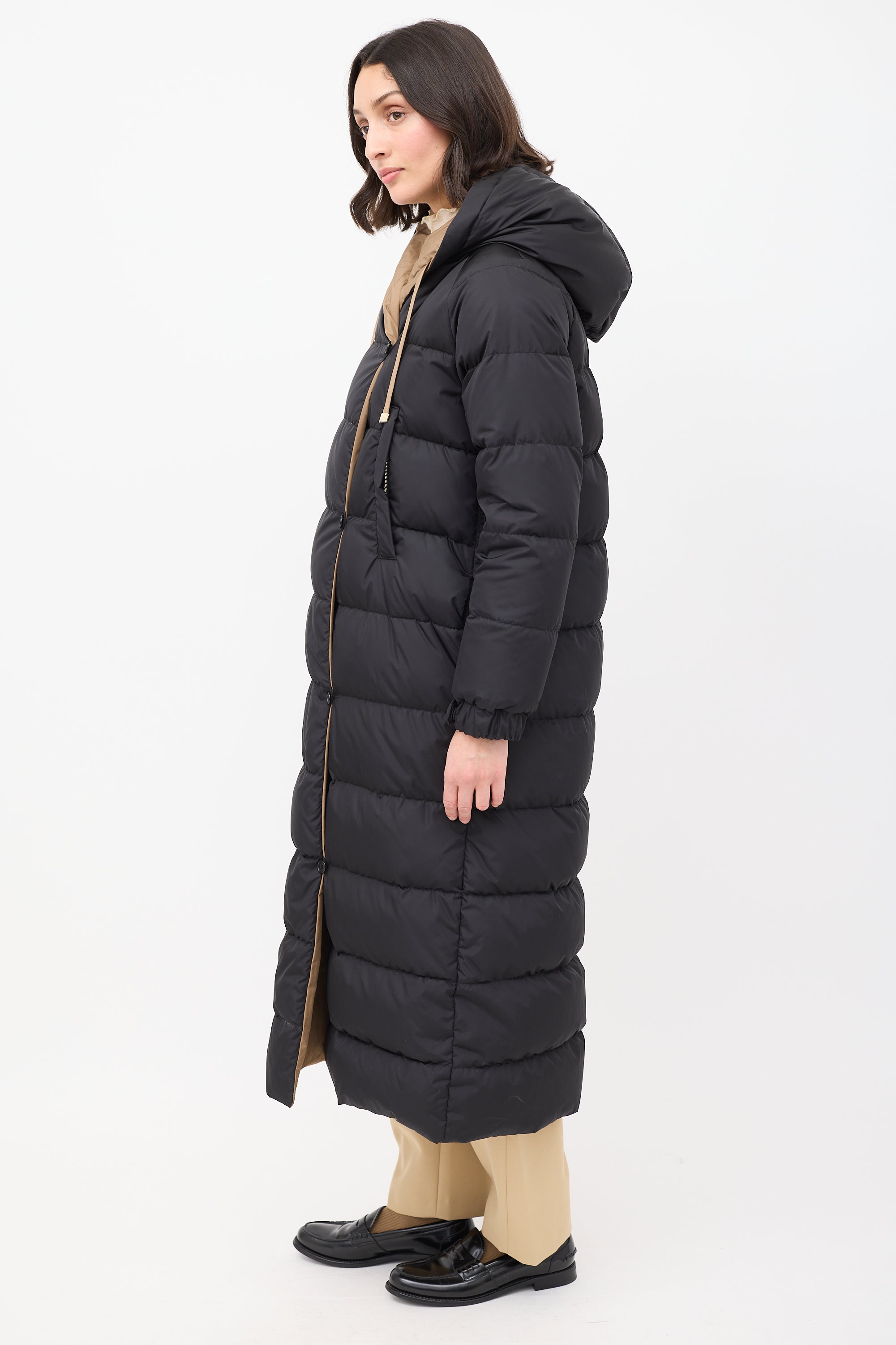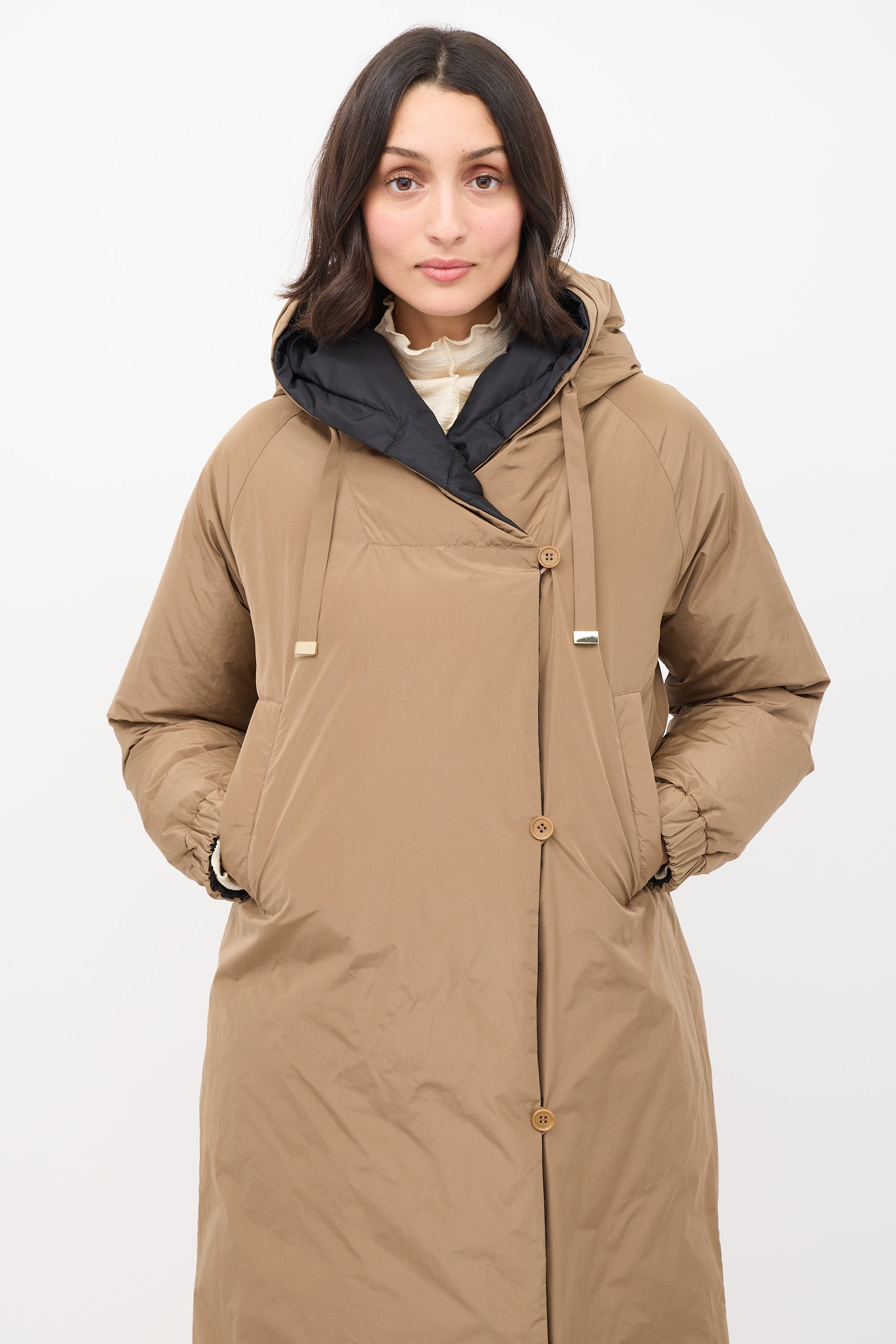 Pre-owned Max Mara reversible hooded long padded coat featuring brown side with drawstring with gold tone logo accents at hood, asymmetrical button up front closure, two hand warming pockets at chest, tie drawstring back waist, long sleeves with elasticized cuffs, and white logo tab at right cuff. Black reverse side features asymmetrical button up front closure, two hand warming pockets at chest, long sleeves with elasticized cuffs, reflective logo tab at right cuff, and quilting throughout.
