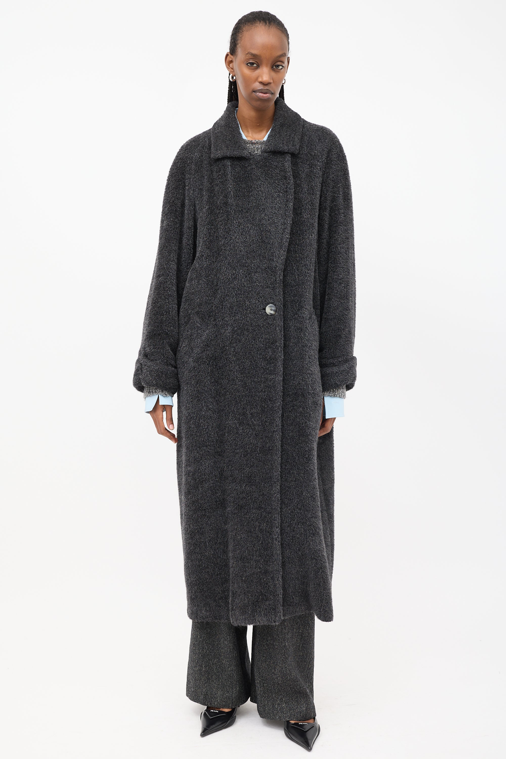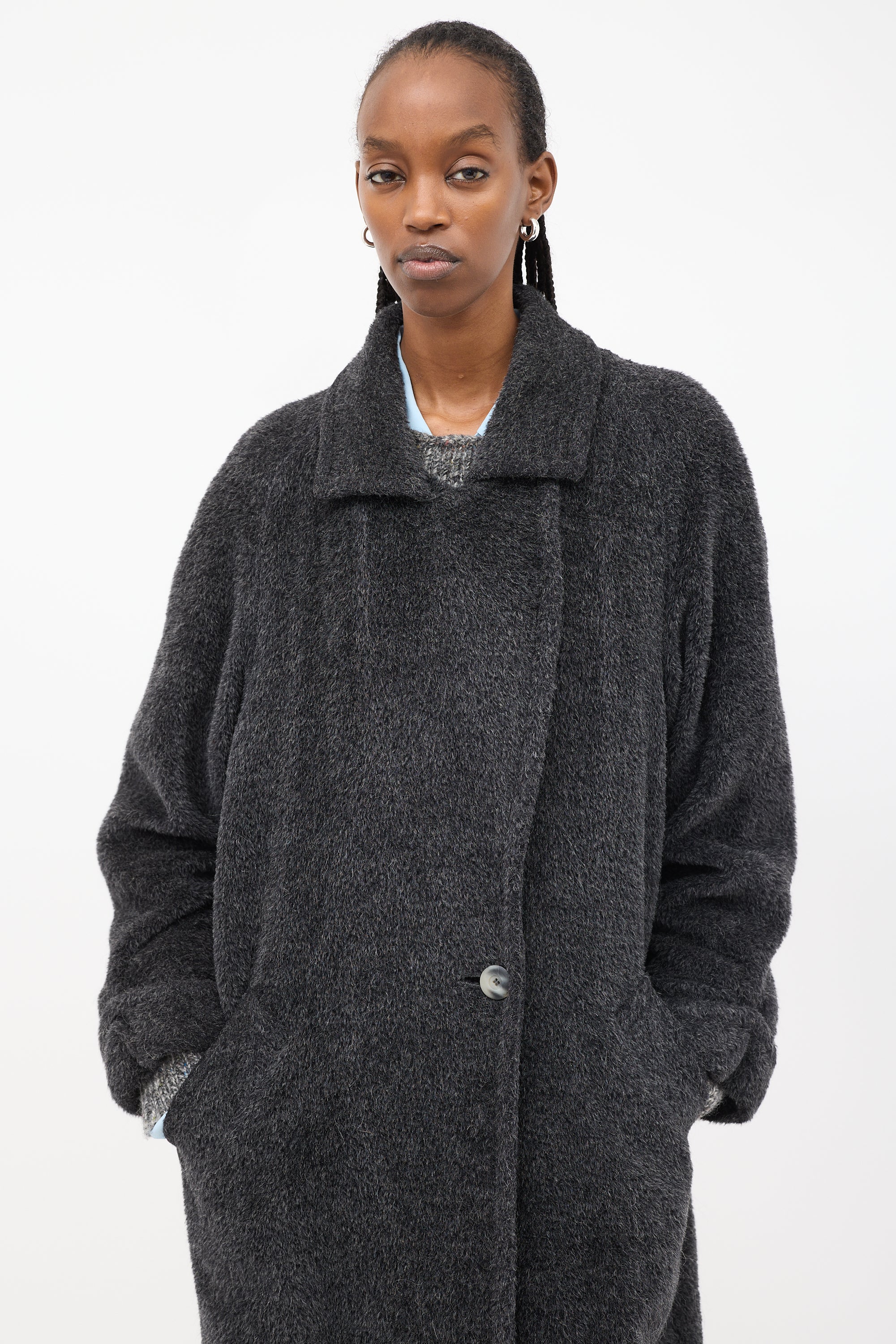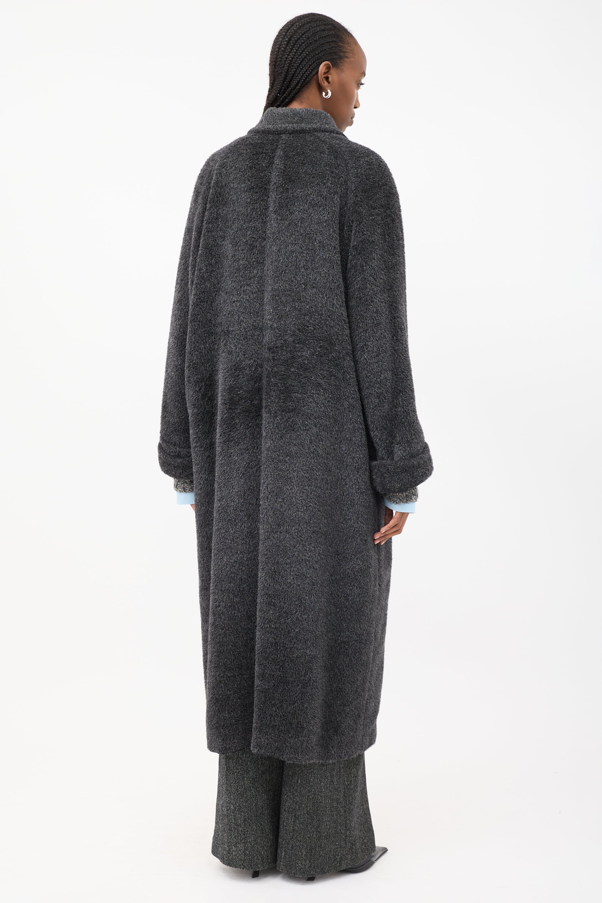 Pre-owned Max Mara dark grey fuzzy wool blend long coat featuring a wide notched collar, front single button closure, two welt pockets at front hip, and cuffed long sleeves. Lined.