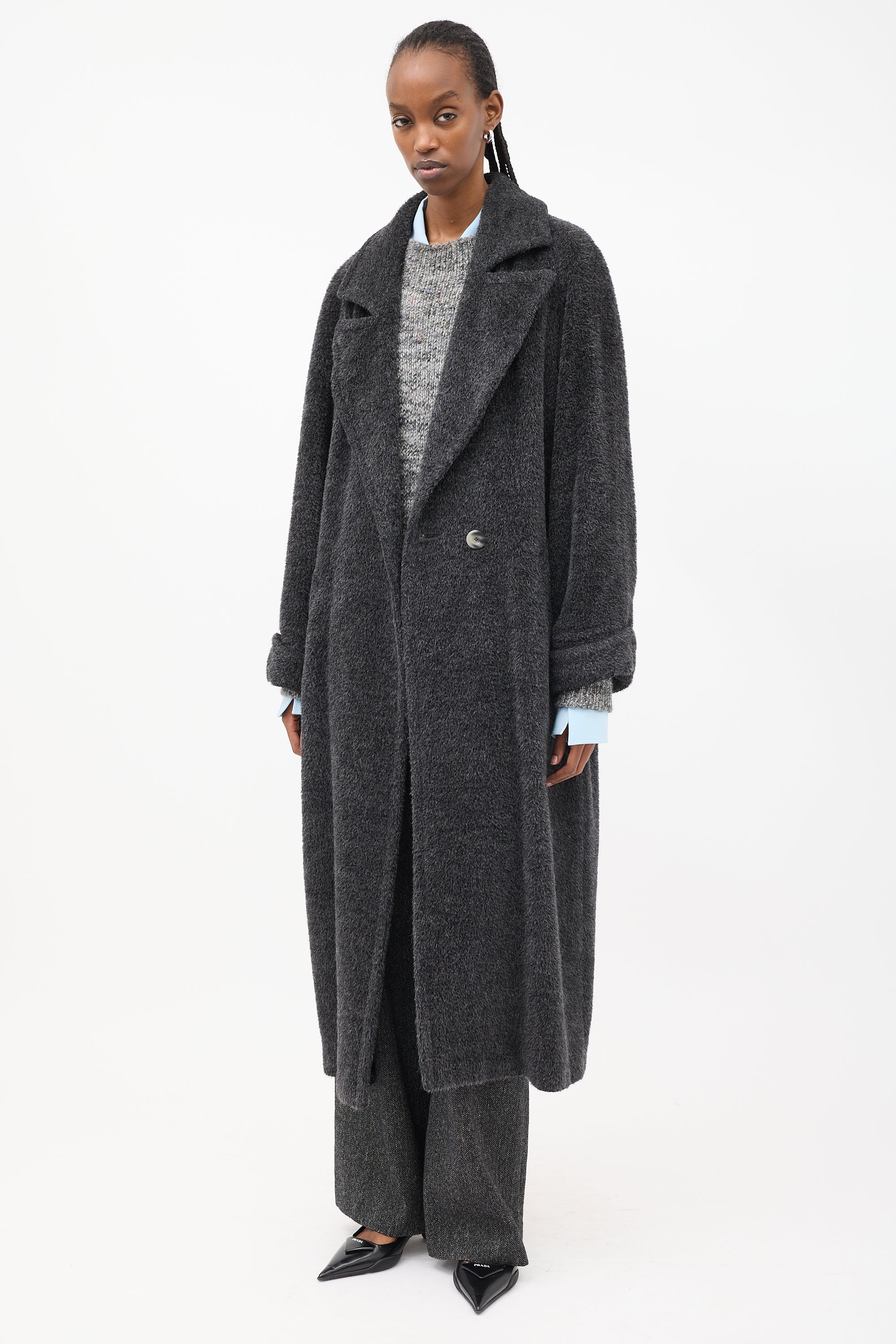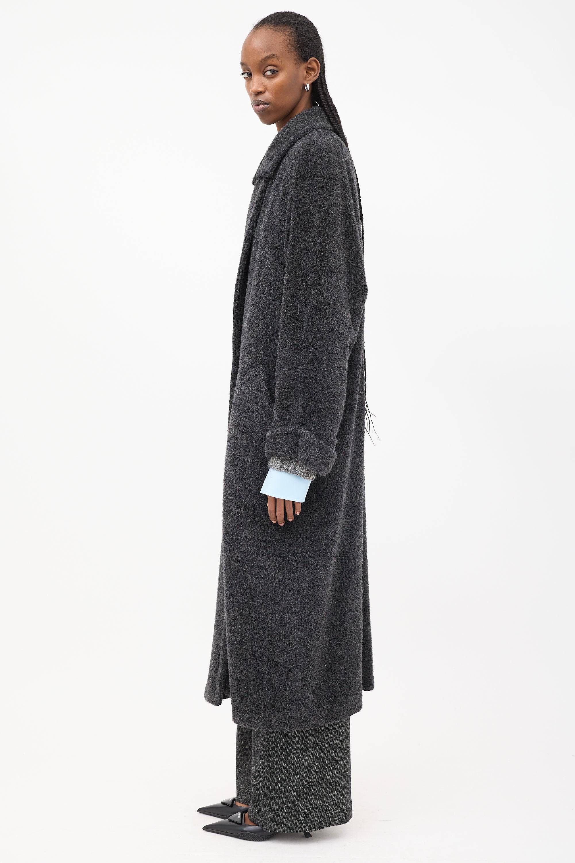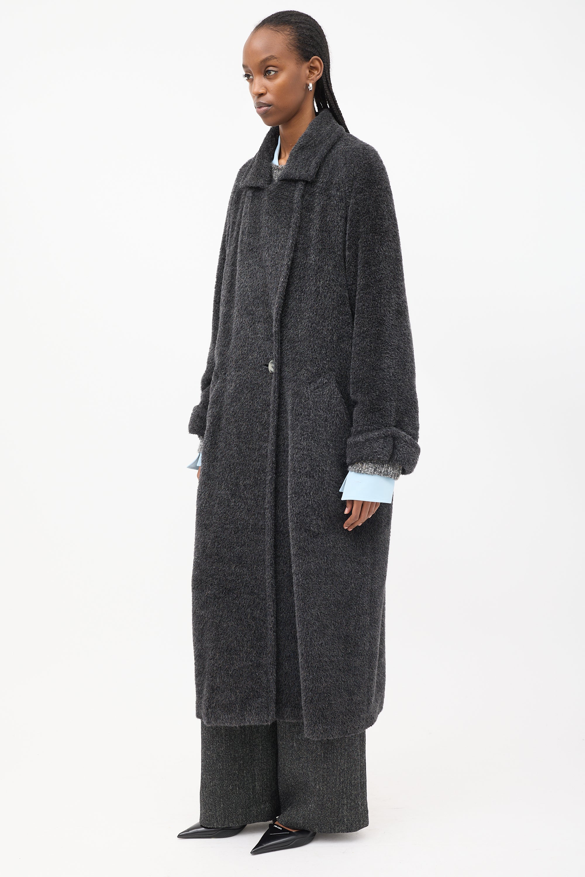 Pre-owned Max Mara dark grey fuzzy wool blend long coat featuring a wide notched collar, front single button closure, two welt pockets at front hip, and cuffed long sleeves. Lined.