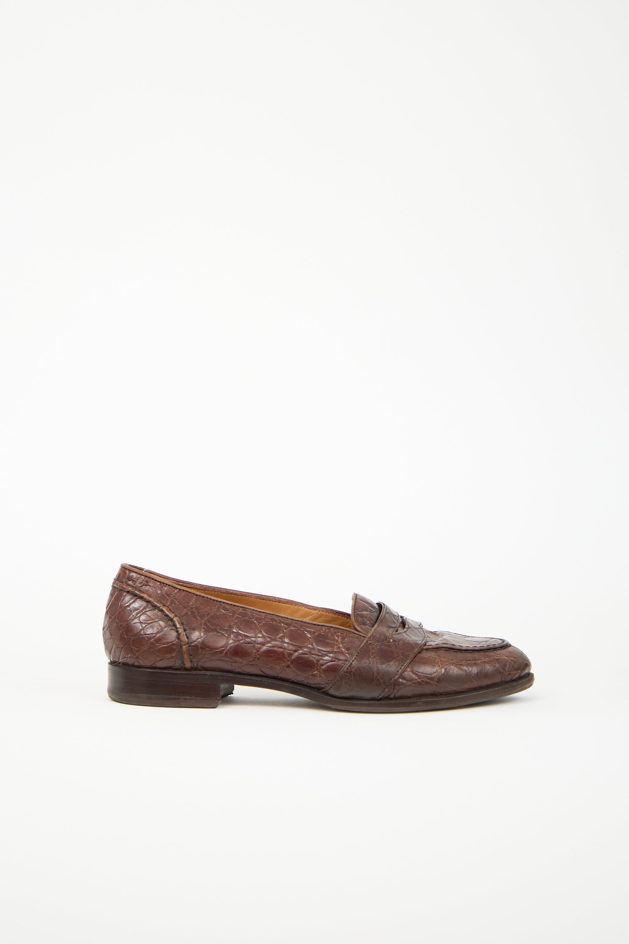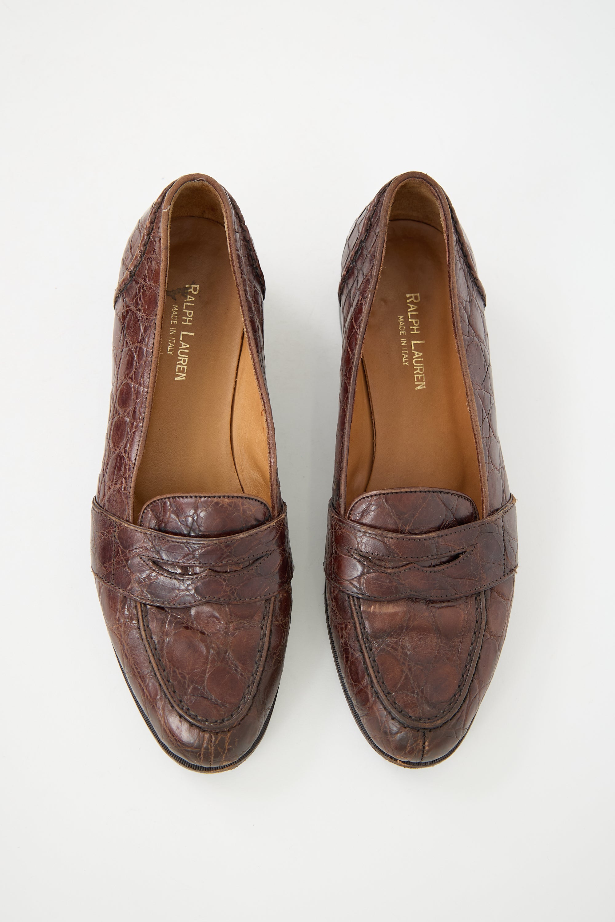 Pre-owned Ralph Lauren brown embossed croc leather loafers featuring a rounded toe, notched topline, strap across vamp with cutout, tonal stitching, and a stacked block heel.