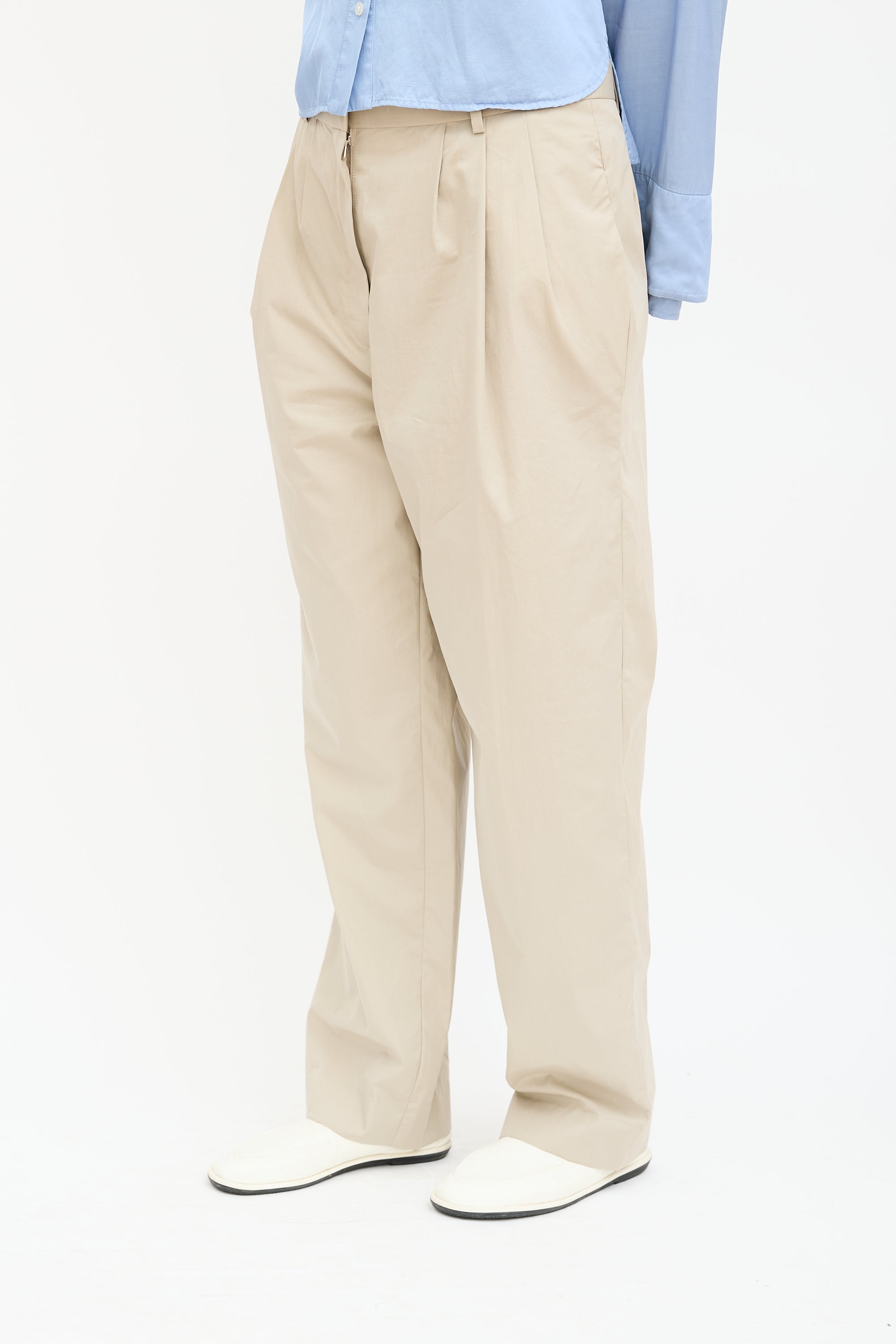 Pre-owned The Row beige wide leg trousers featuring belt loops, zip fly with clasp fastening, pleated front, two slash pockets at hips, and one welt pocket at back.