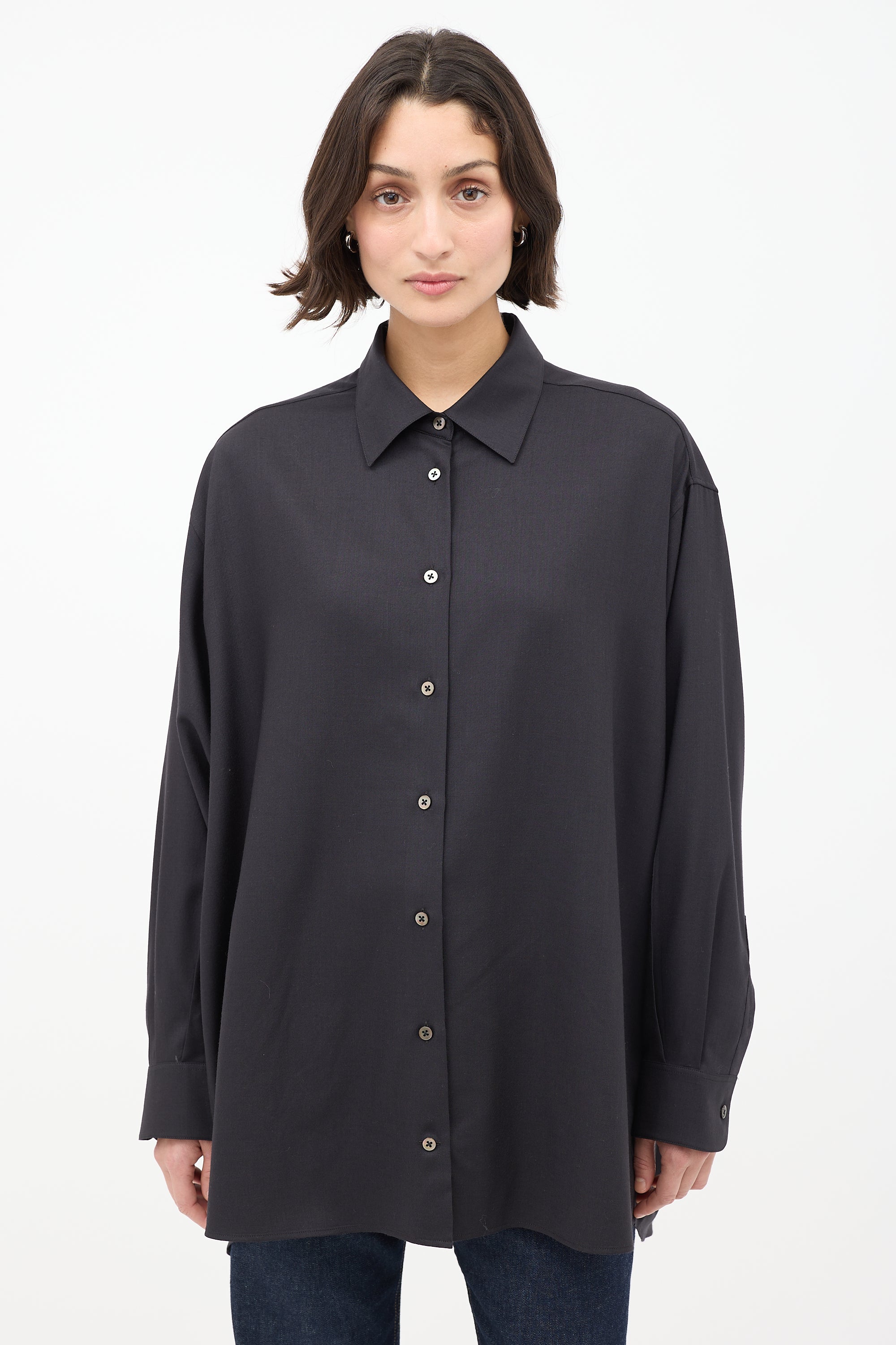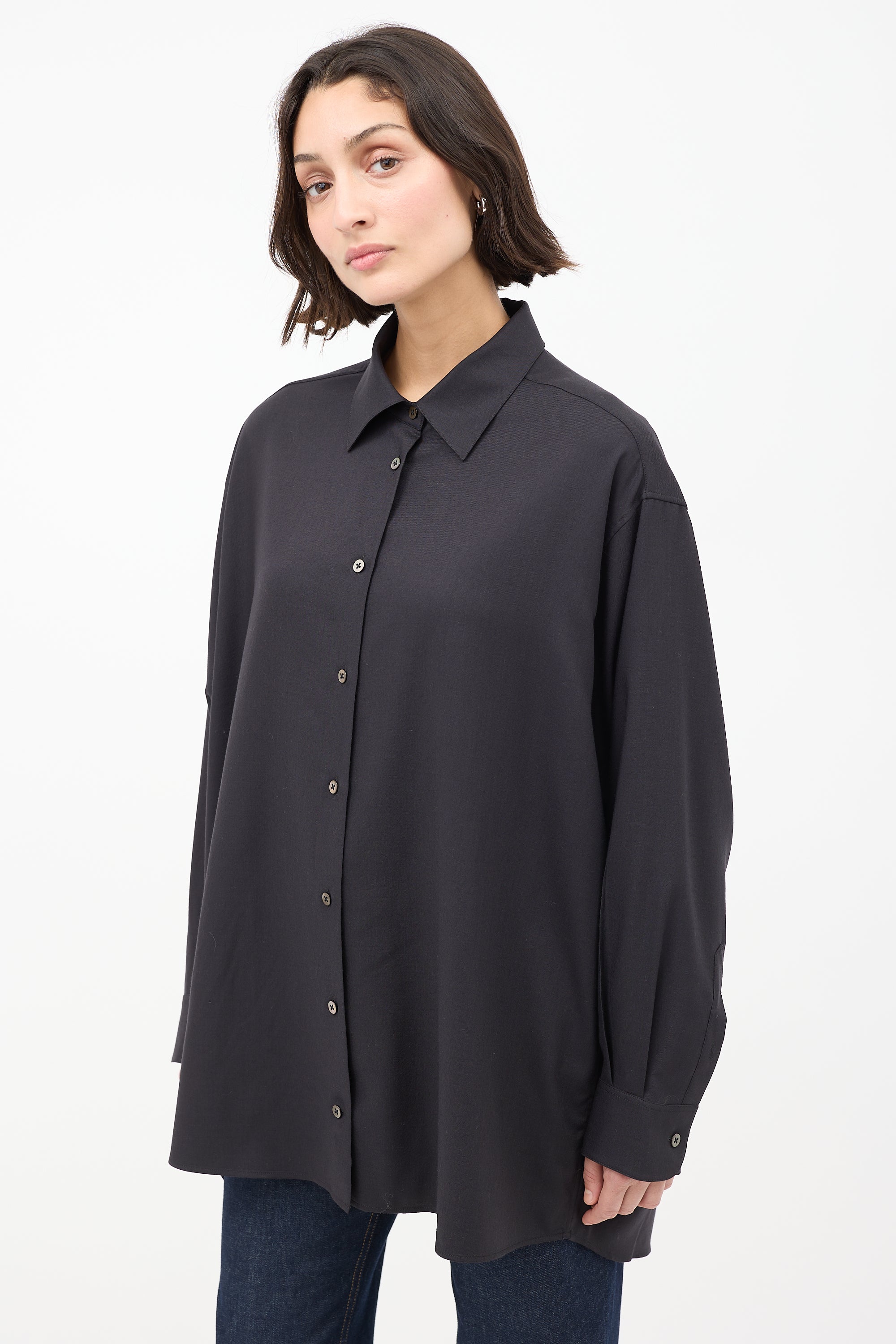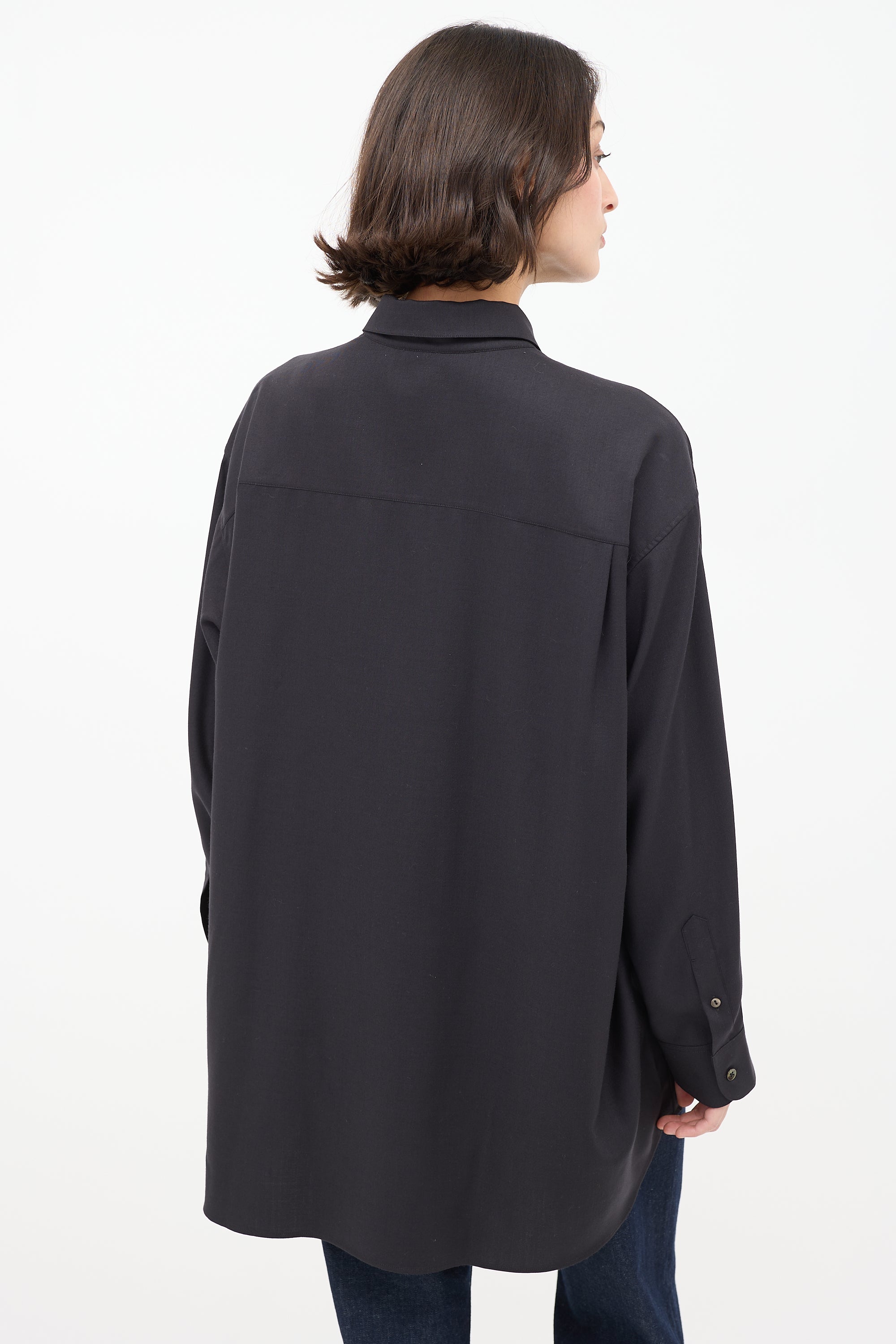 Pre-owned The Row "Giorgio" black cashmere long shirt featuring a spread collar, button up front, wide fit, pleated back yoke, and long sleeves with pleated and buttoned cuffs.