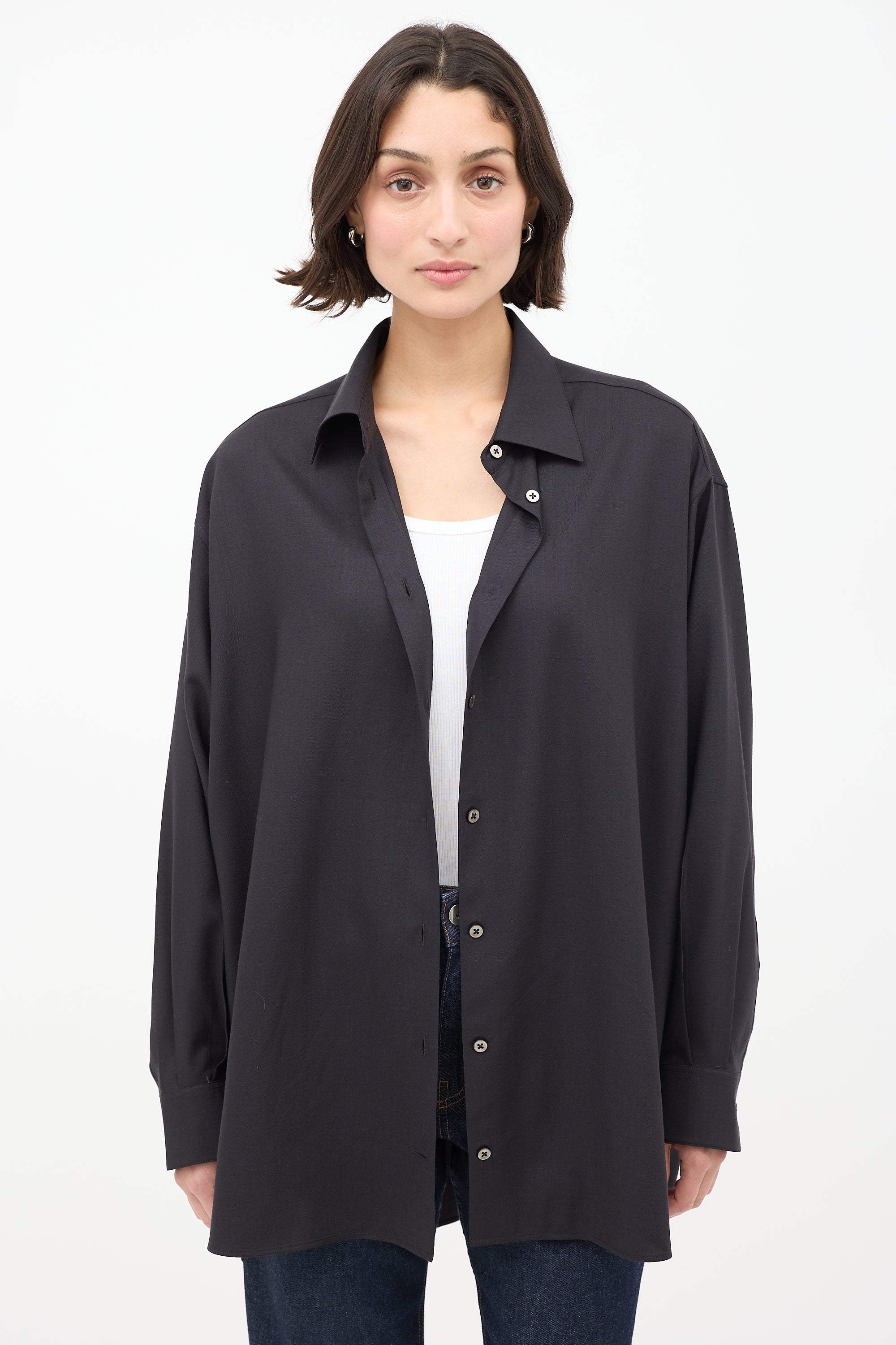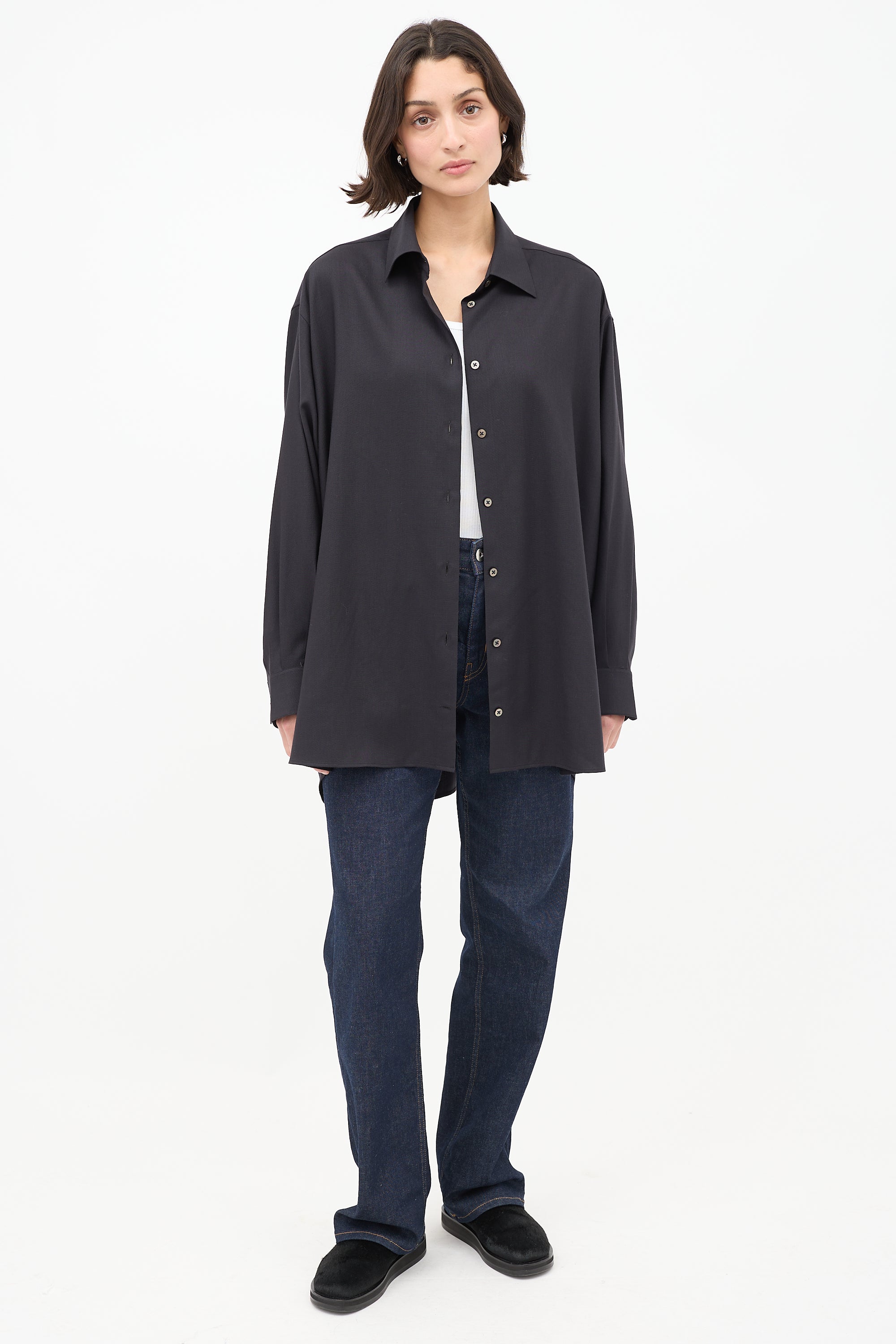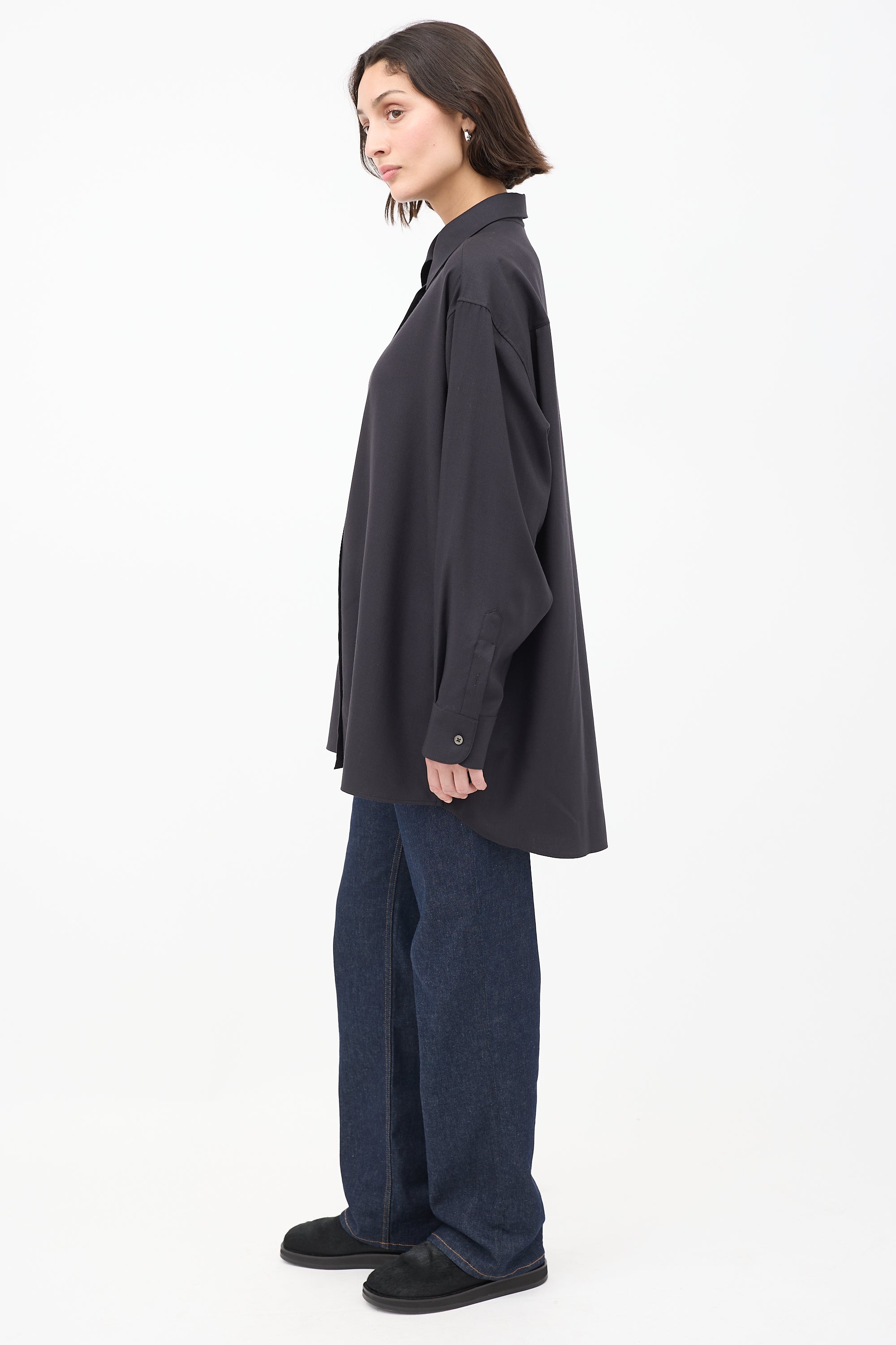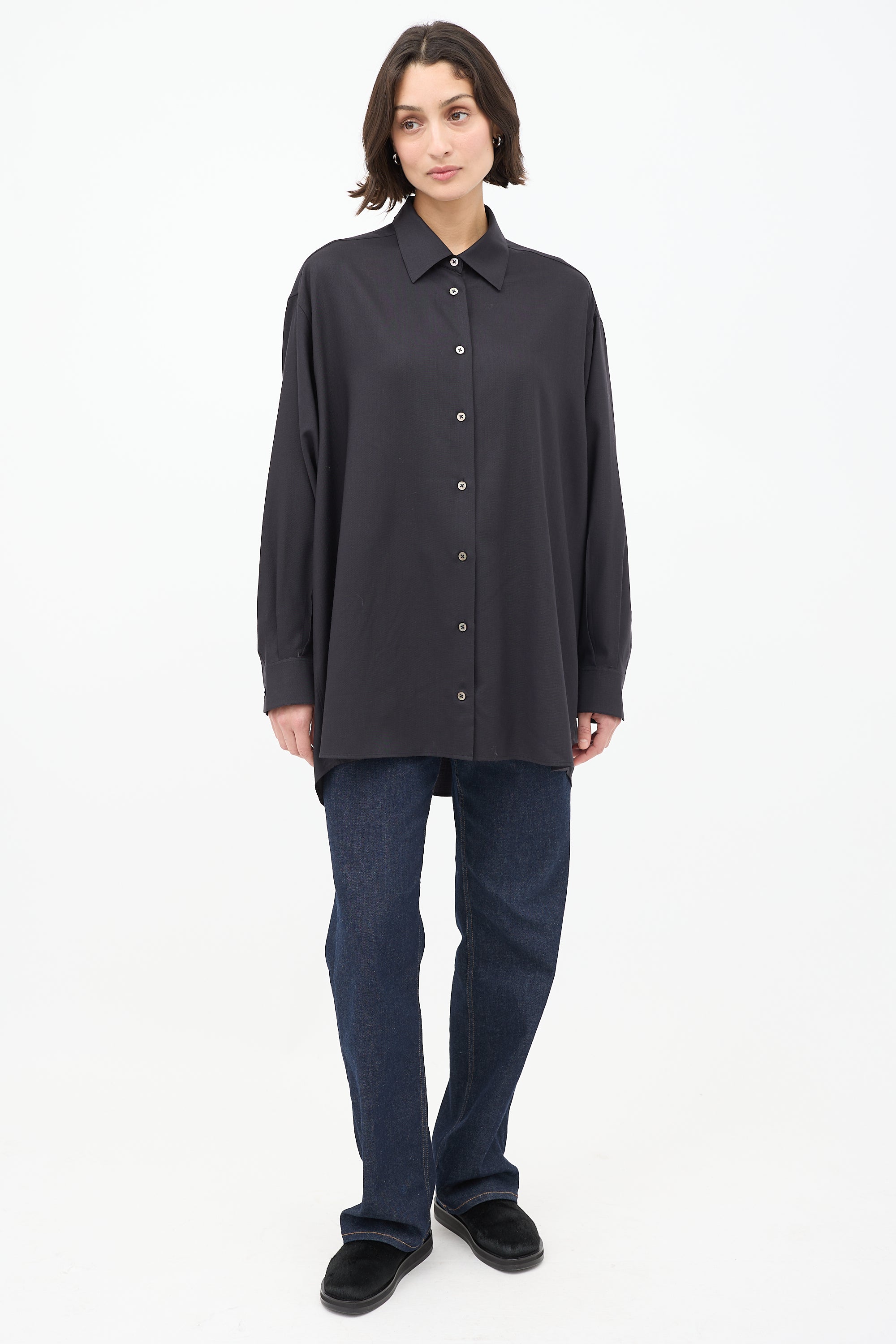 Pre-owned The Row "Giorgio" black cashmere long shirt featuring a spread collar, button up front, wide fit, pleated back yoke, and long sleeves with pleated and buttoned cuffs.