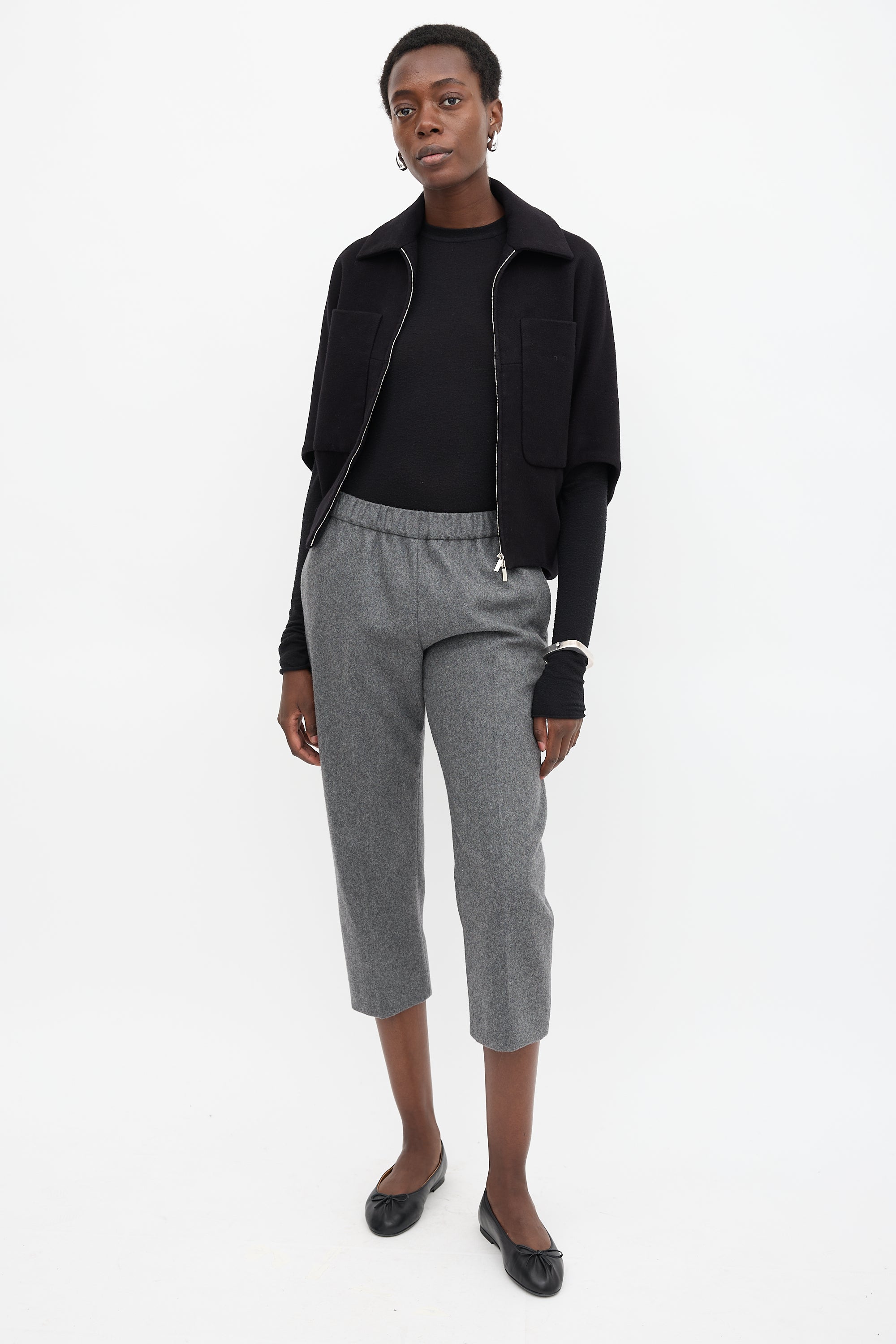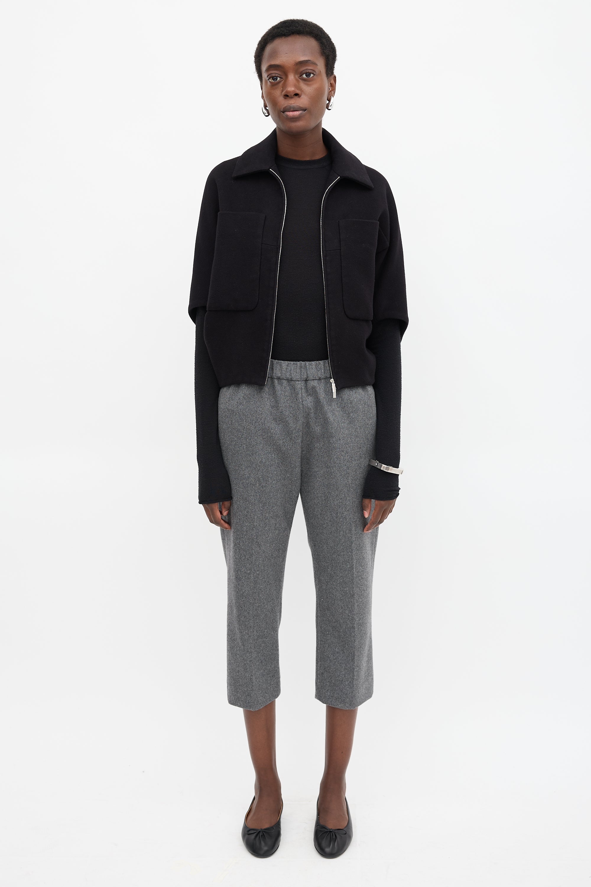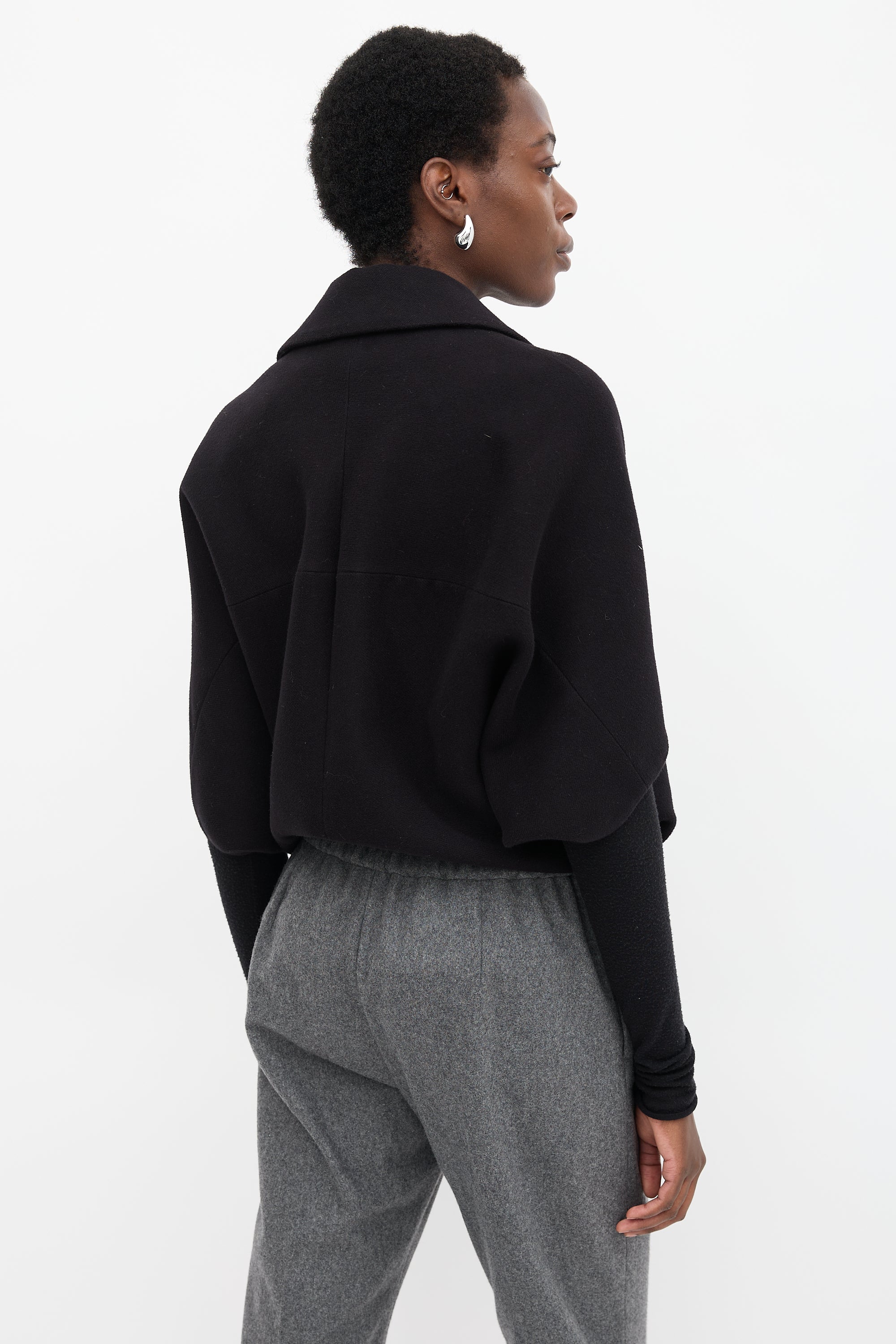 Pre-owned The Row black wool blend cocoon jacket featuring spread collar, two way zip up front, and two large patch pockets at chest. Lined.