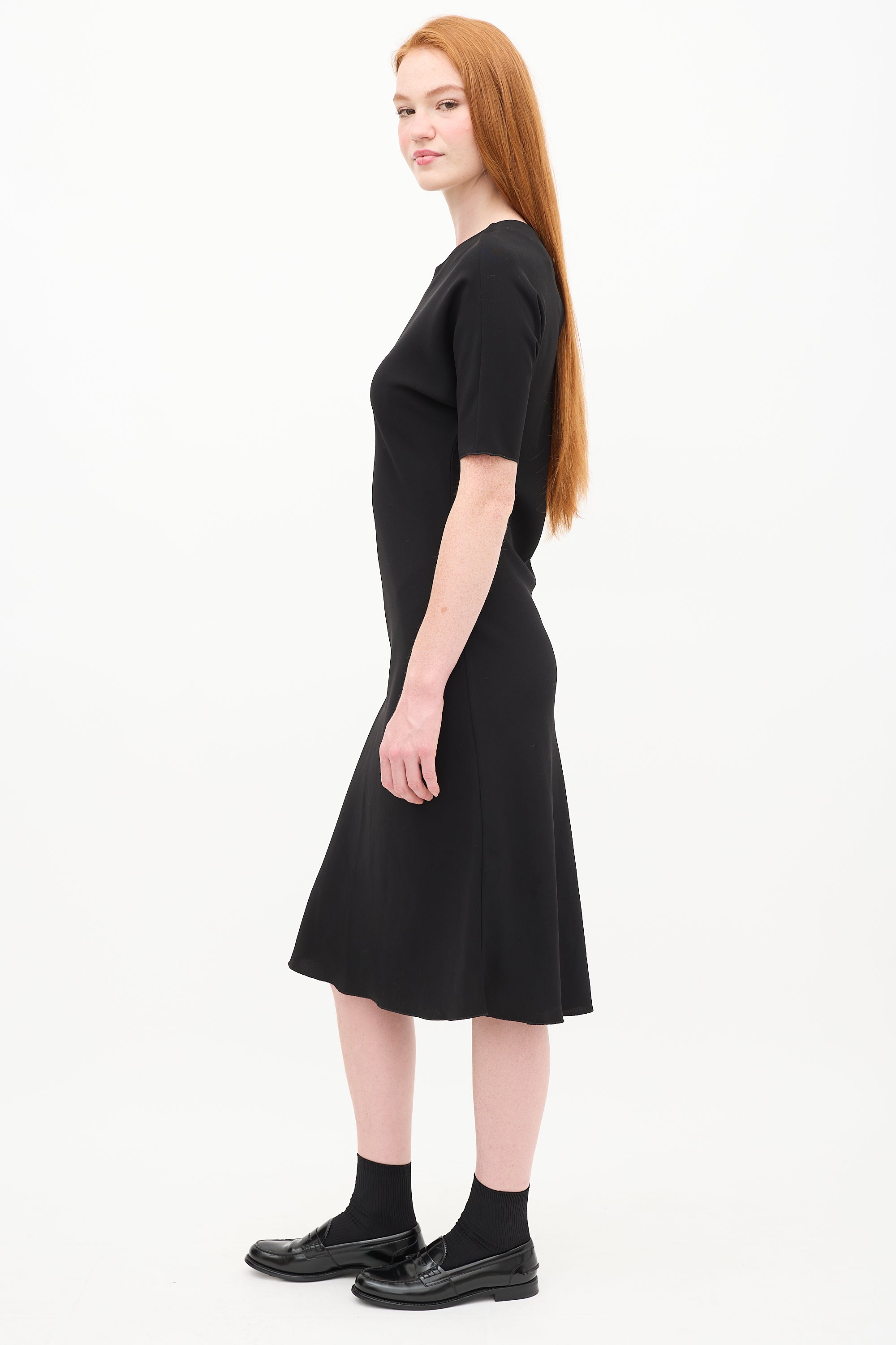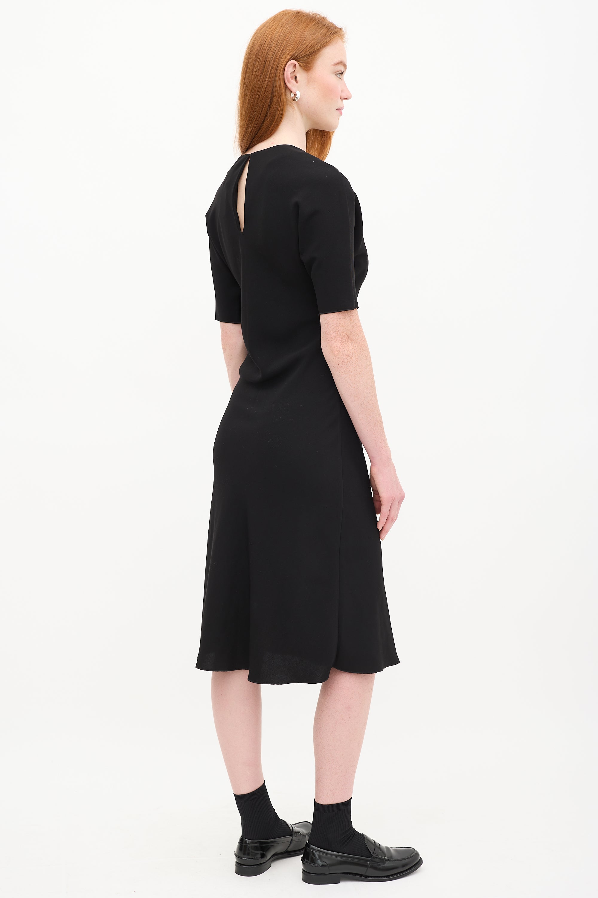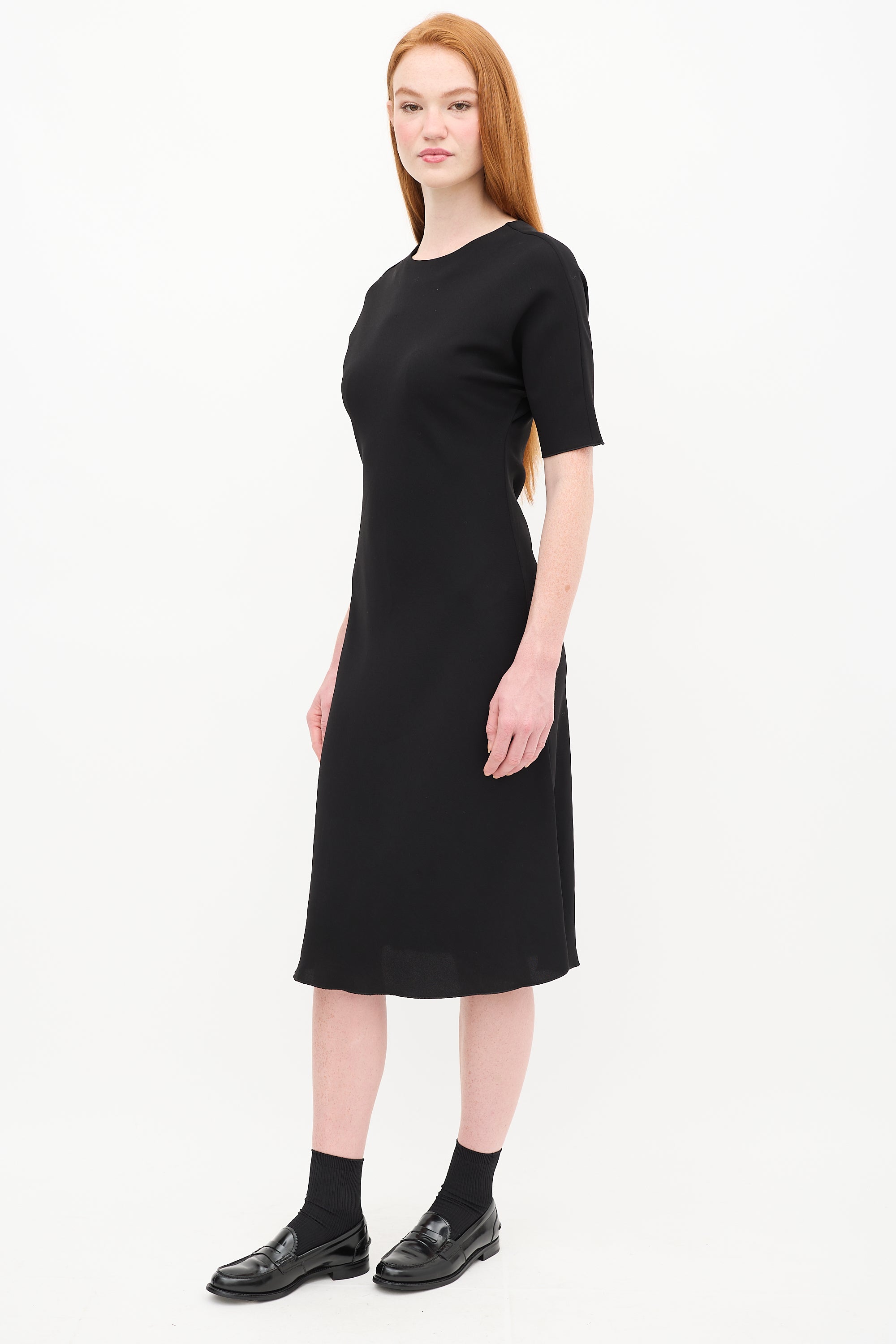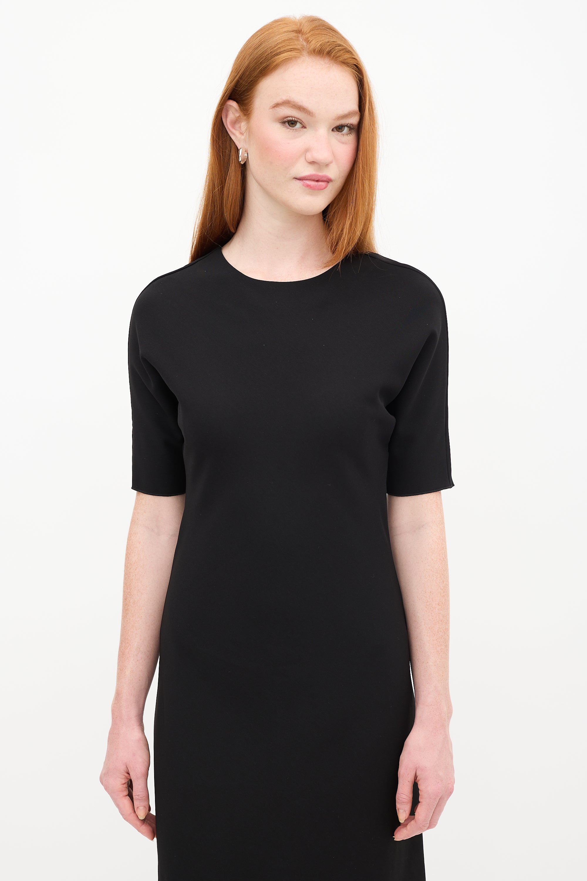 Pre-owned Toteme black midi dress featuring a round neckline, short batwing sleeves, and hook and eye closure at back.