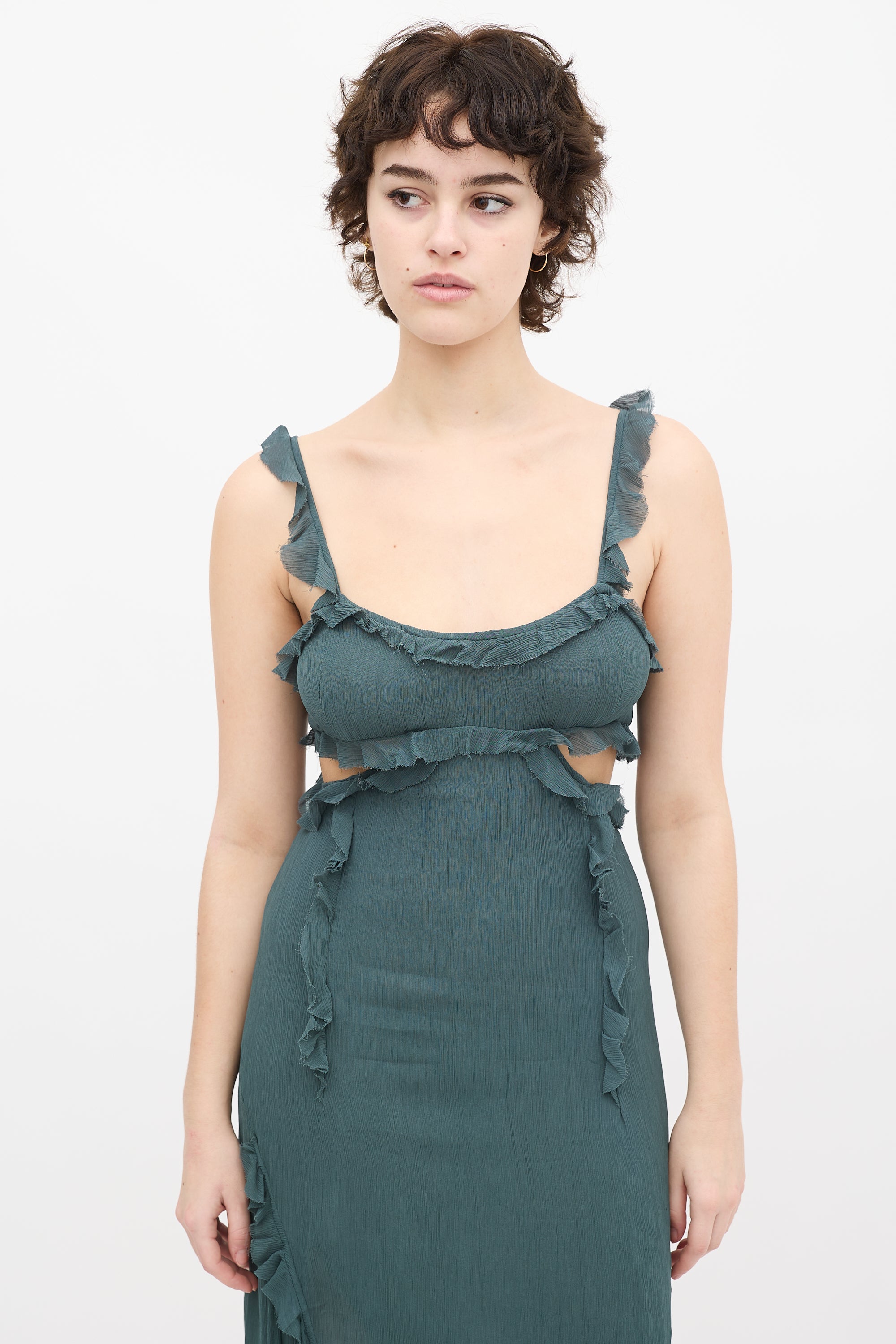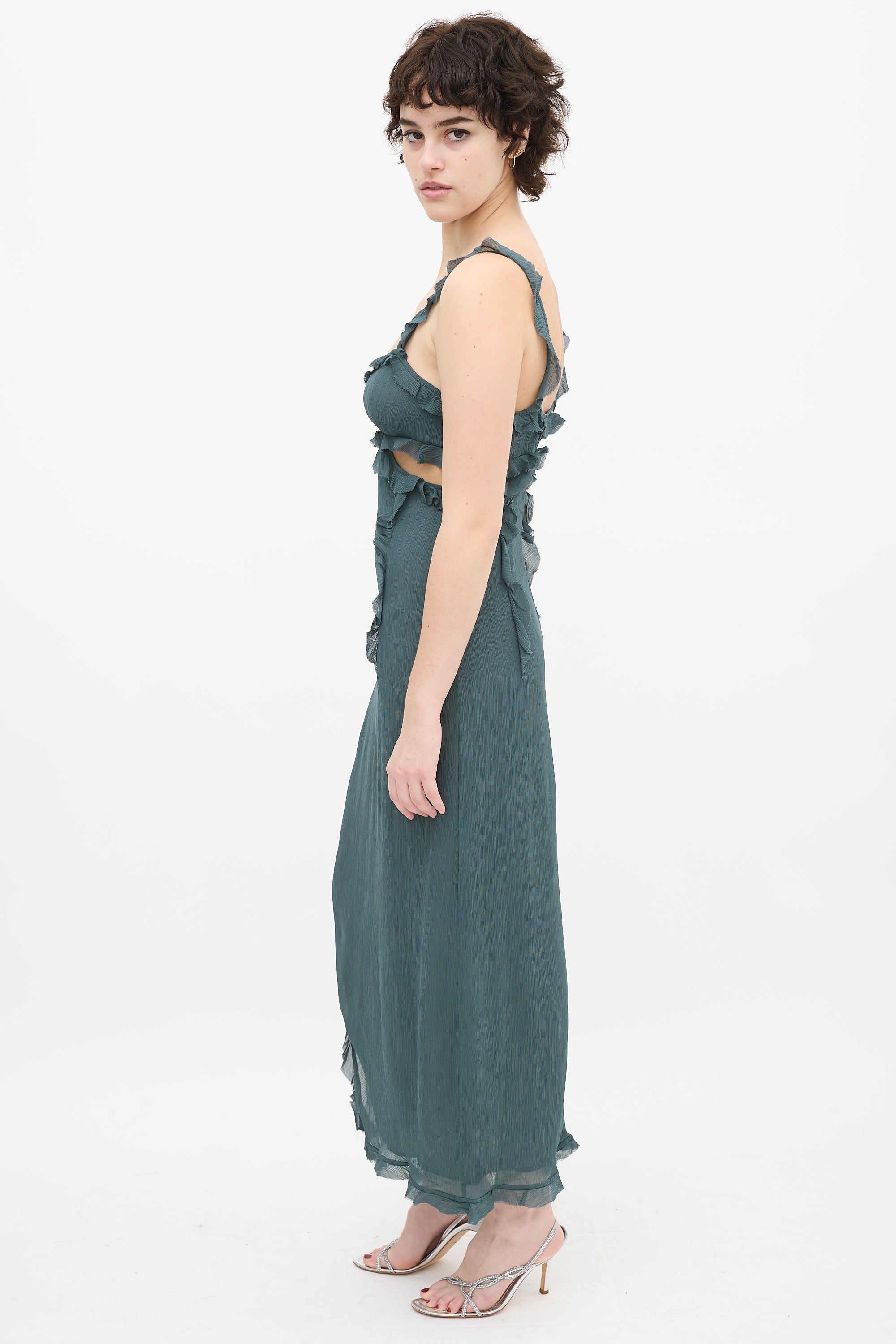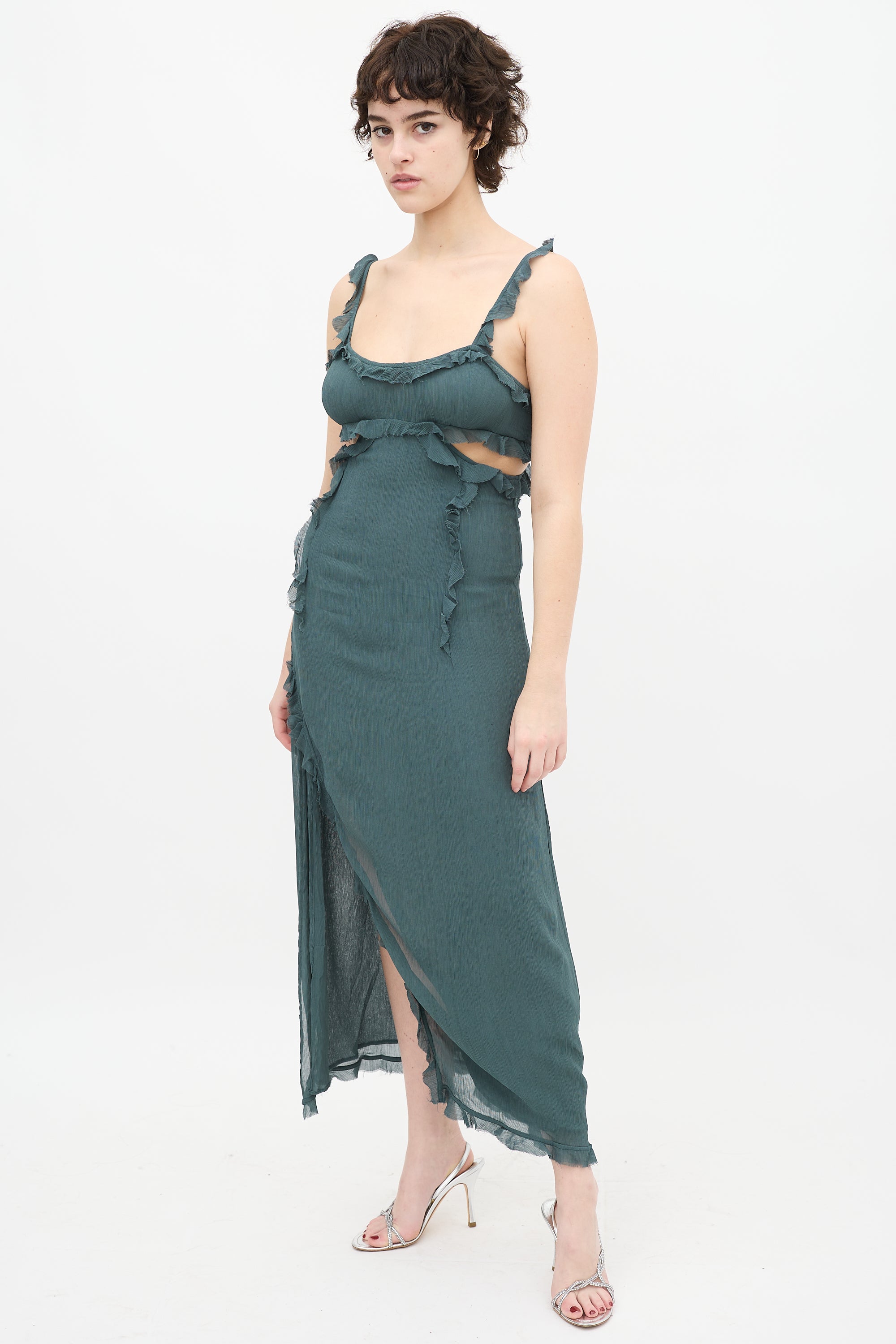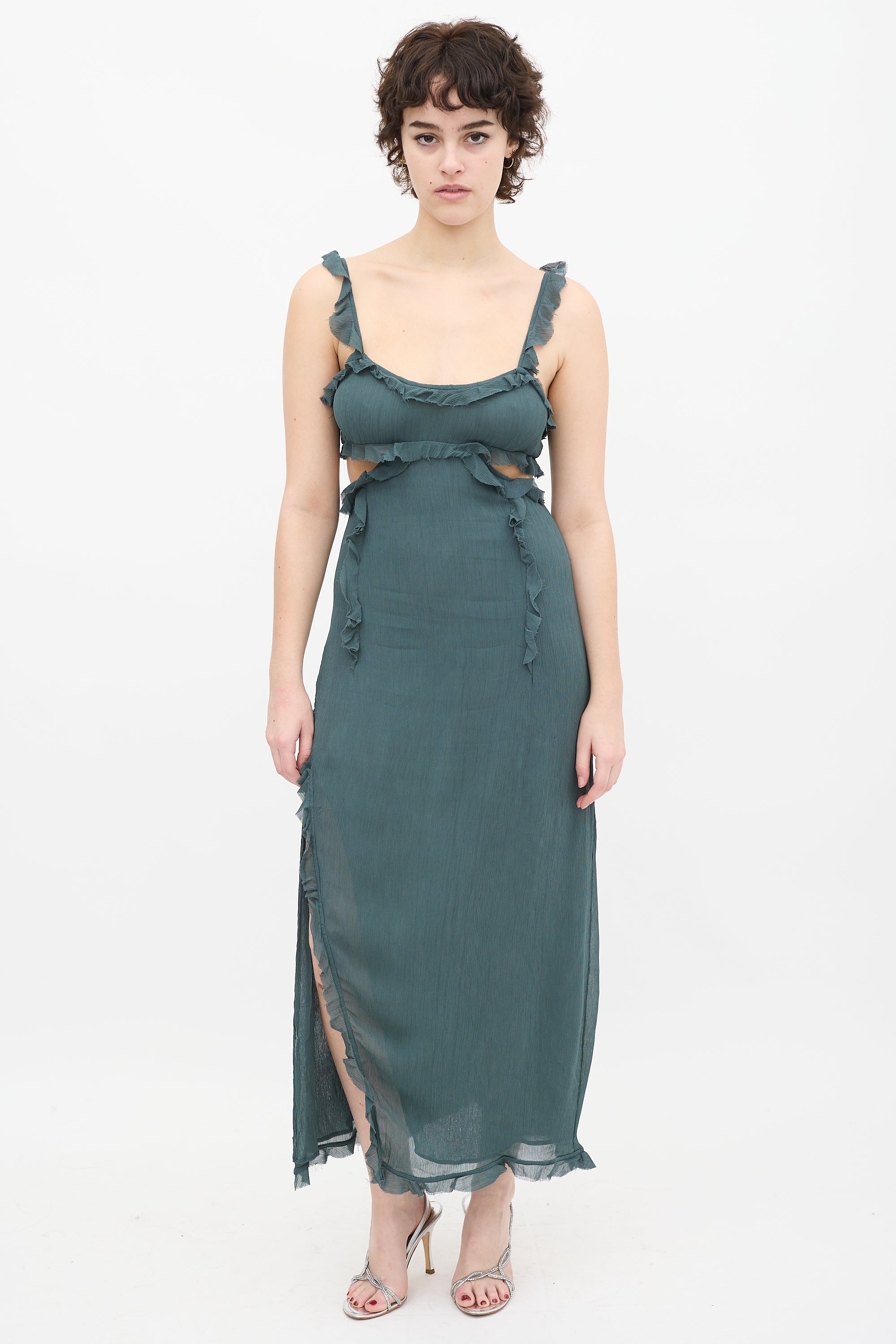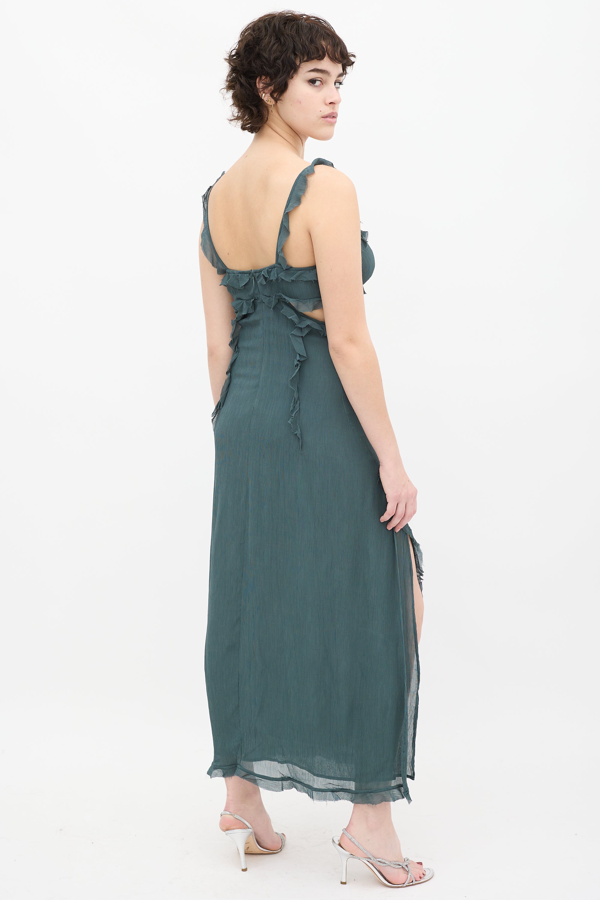 Pre-owned Acne Studios teal sleeveless maxi dress featuring scoop neckline, spaghetti straps with ruffle trim, chest side cutouts, ruffle trim with raw finish throughout, side slit, and back zip closure.