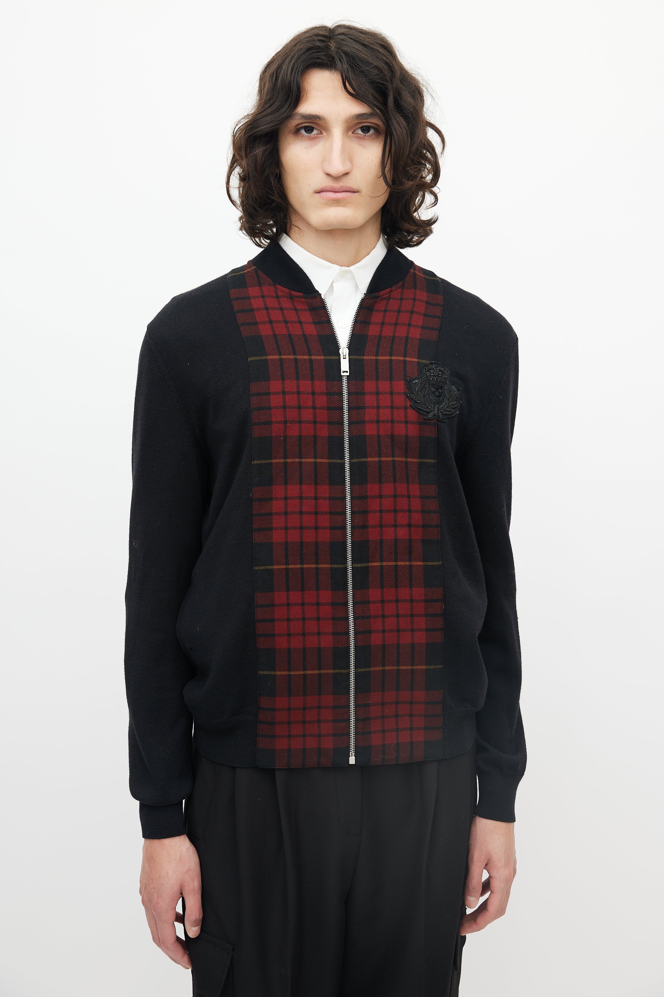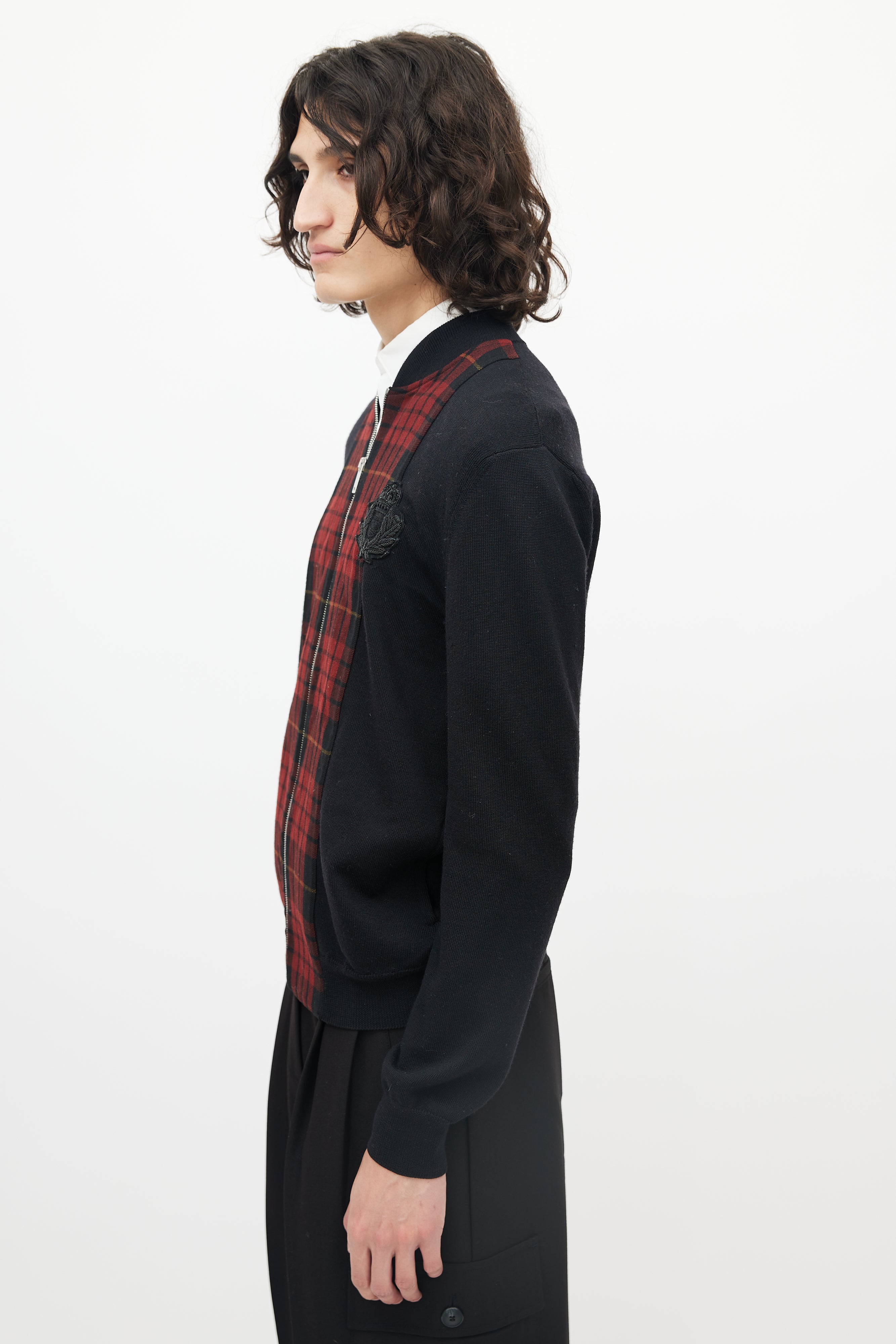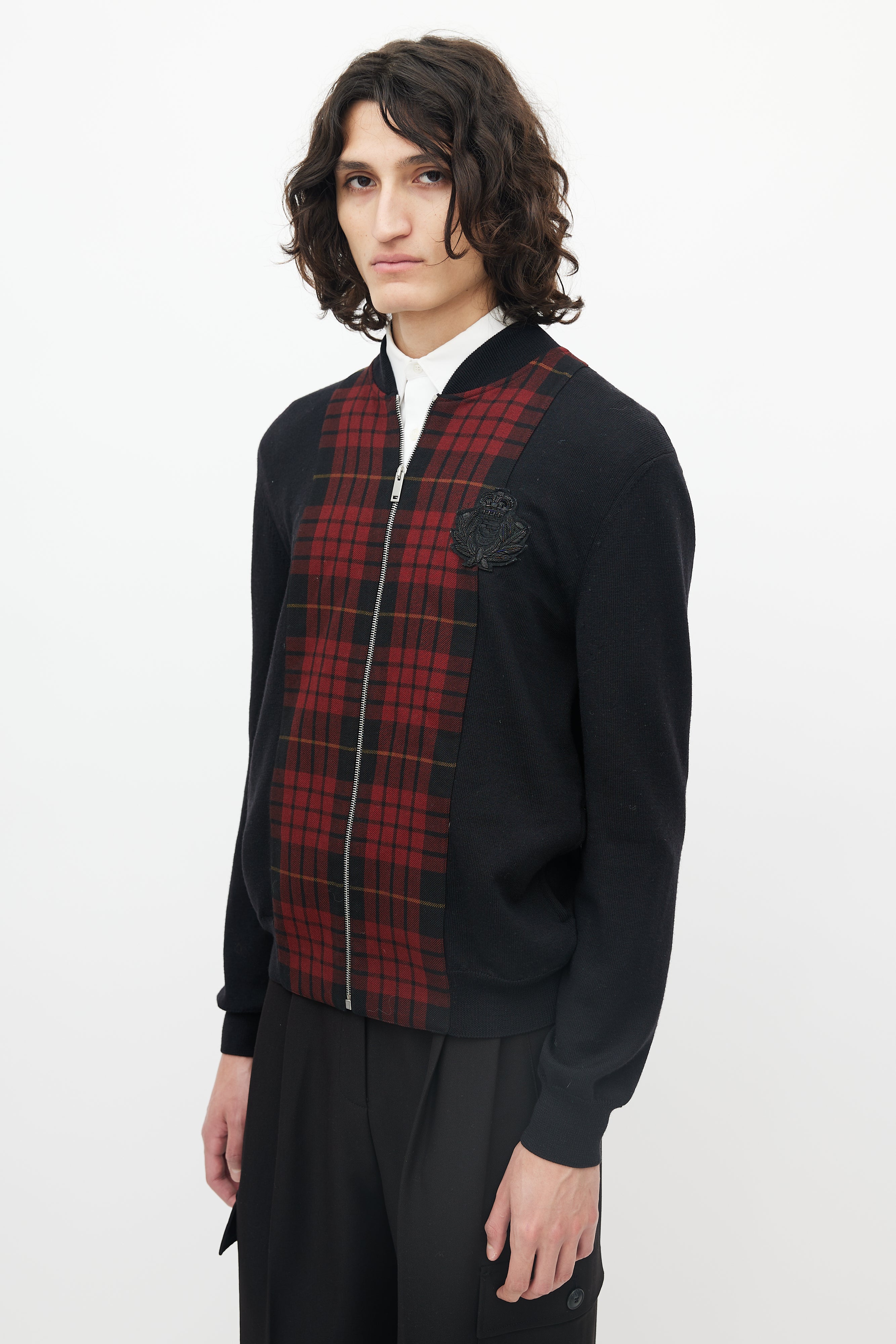 Pre-owned Alexander McQueen black wool knit jacket featuring red plaid panel at front, exposed silver tone front zip, concealed pockets at sides and beaded emblem at left chest.