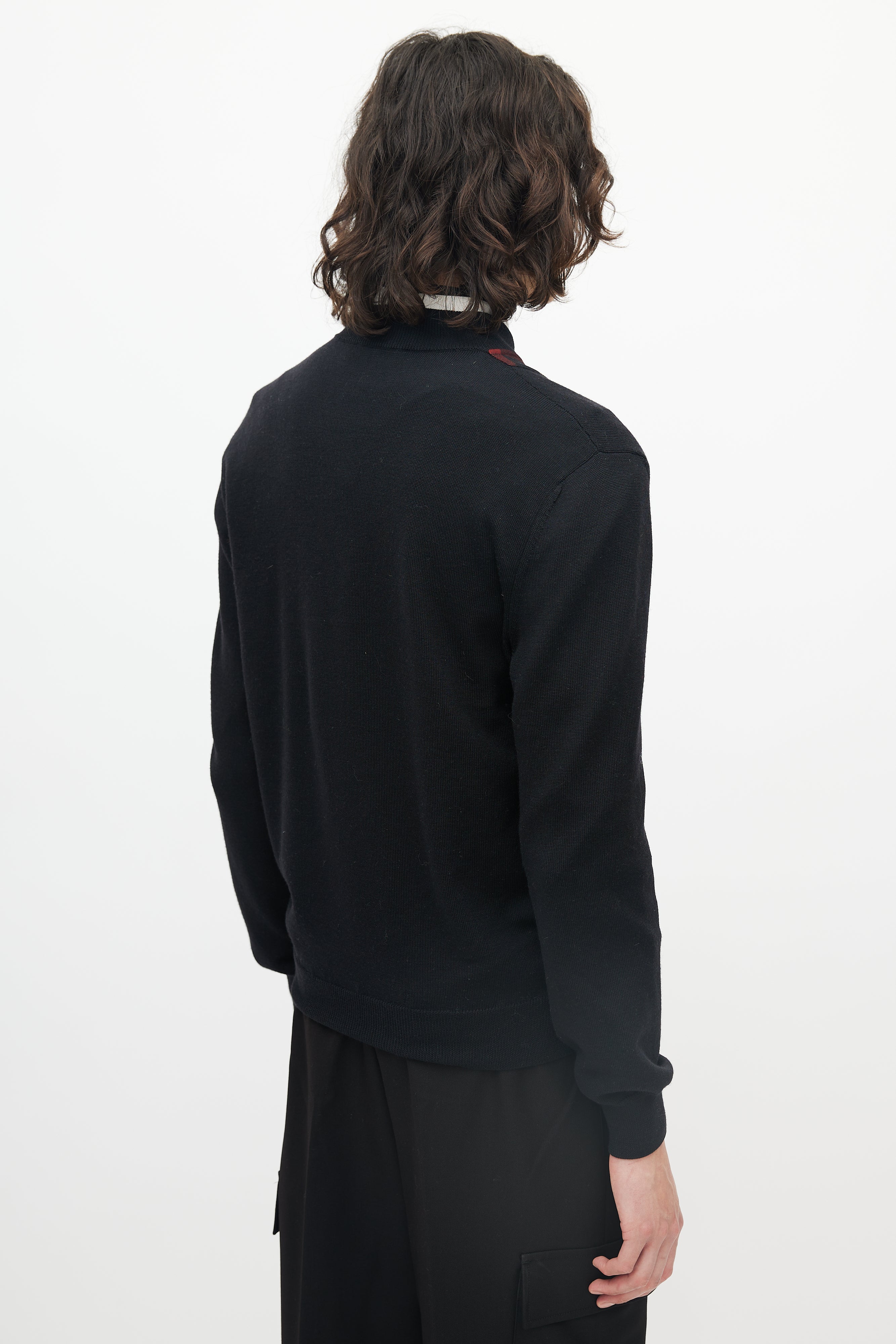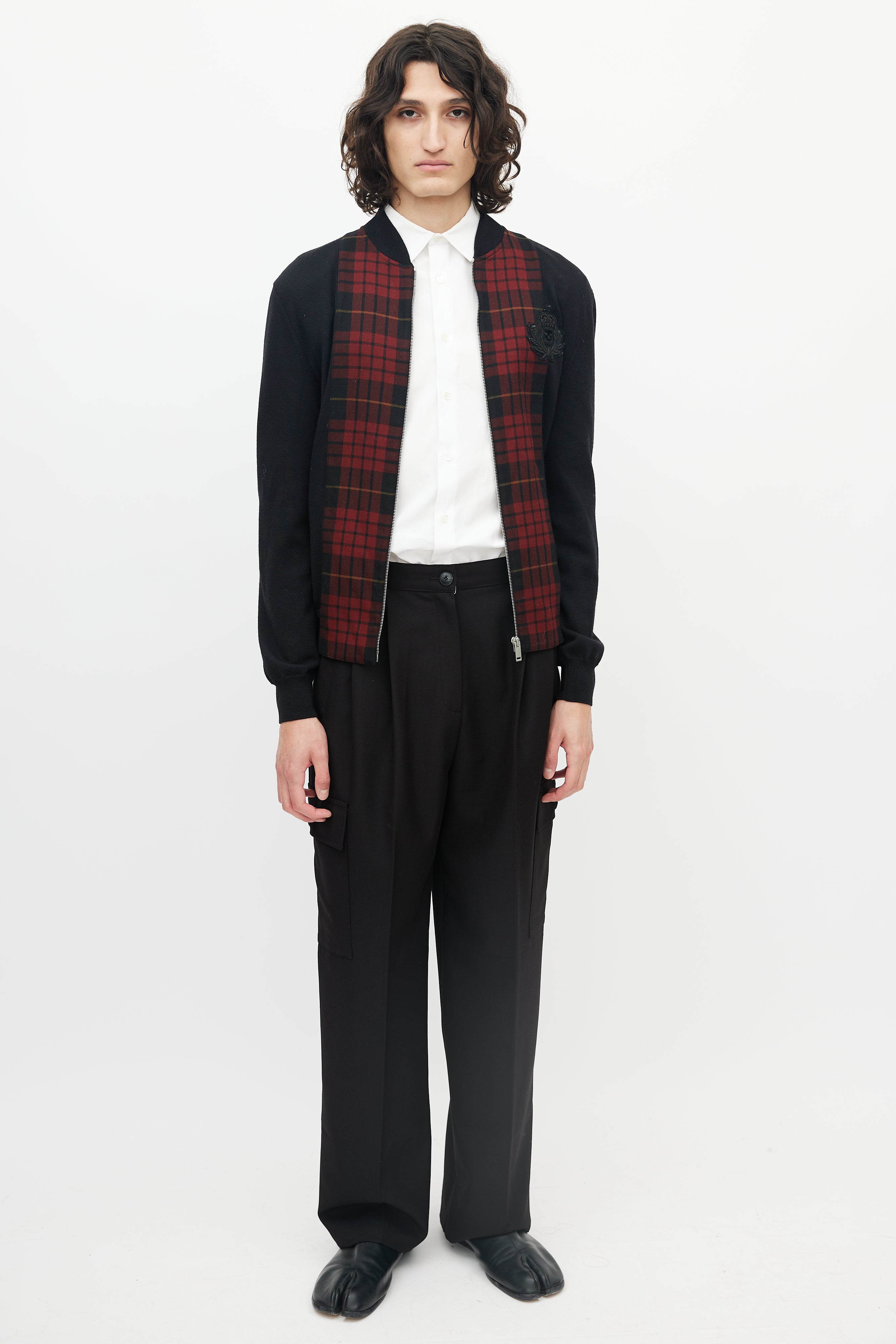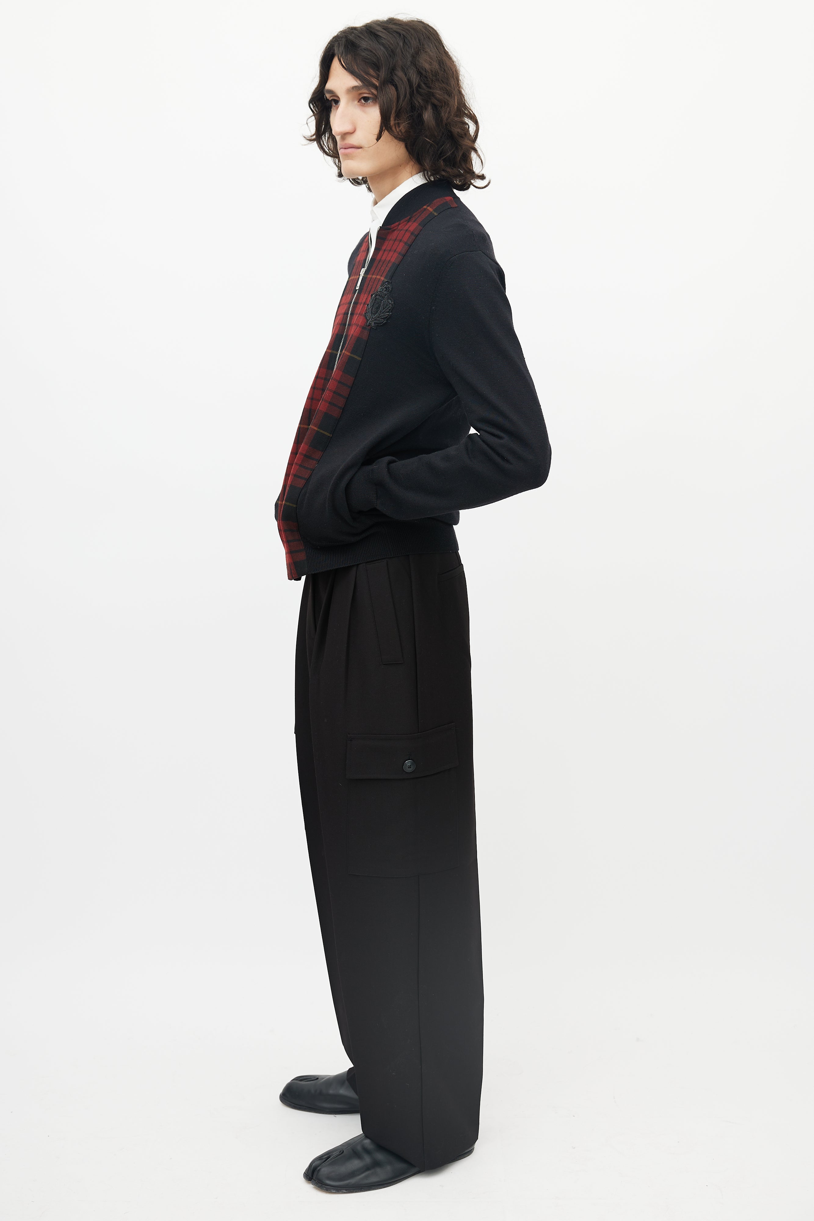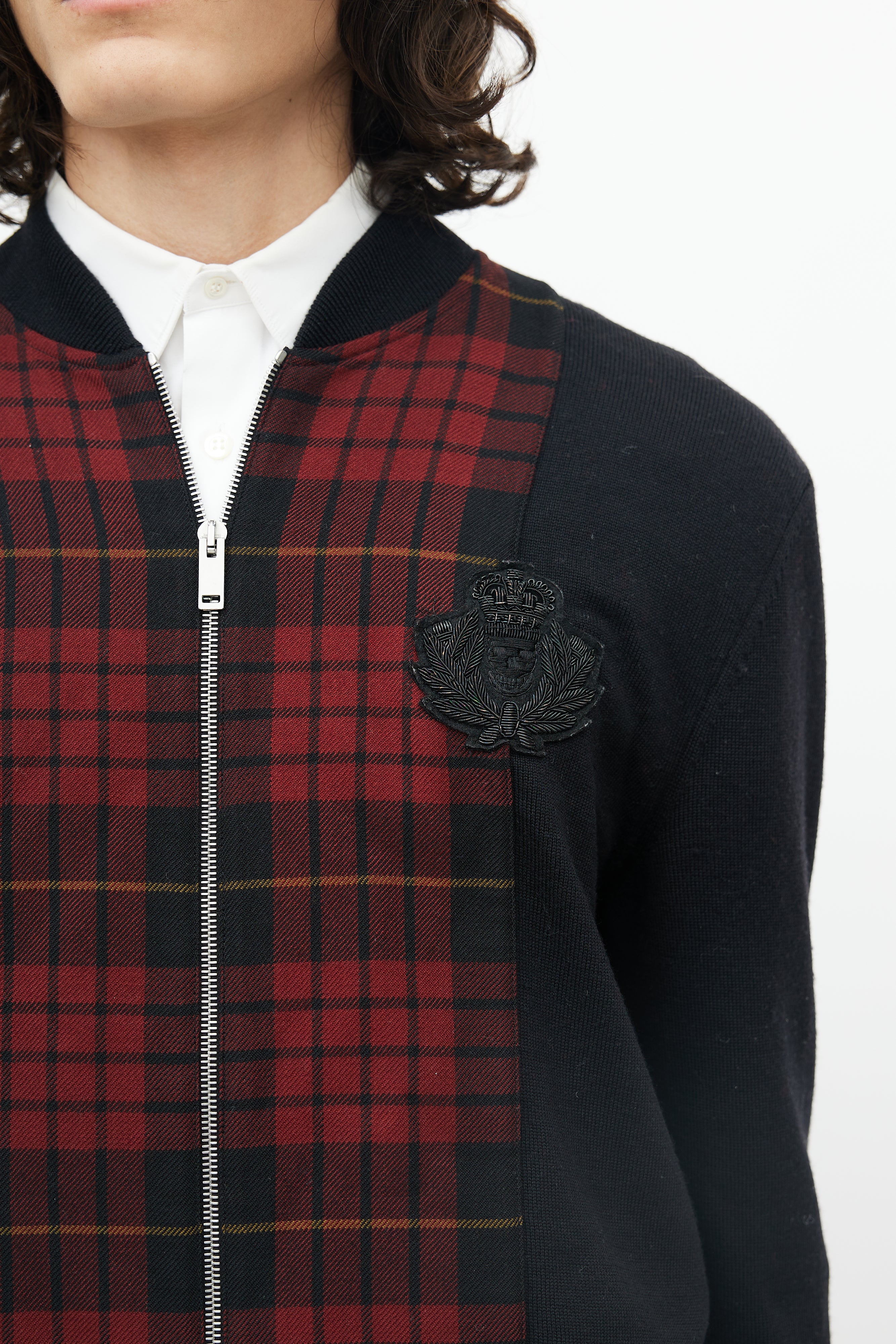 Pre-owned Alexander McQueen black wool knit jacket featuring red plaid panel at front, exposed silver tone front zip, concealed pockets at sides and beaded emblem at left chest.