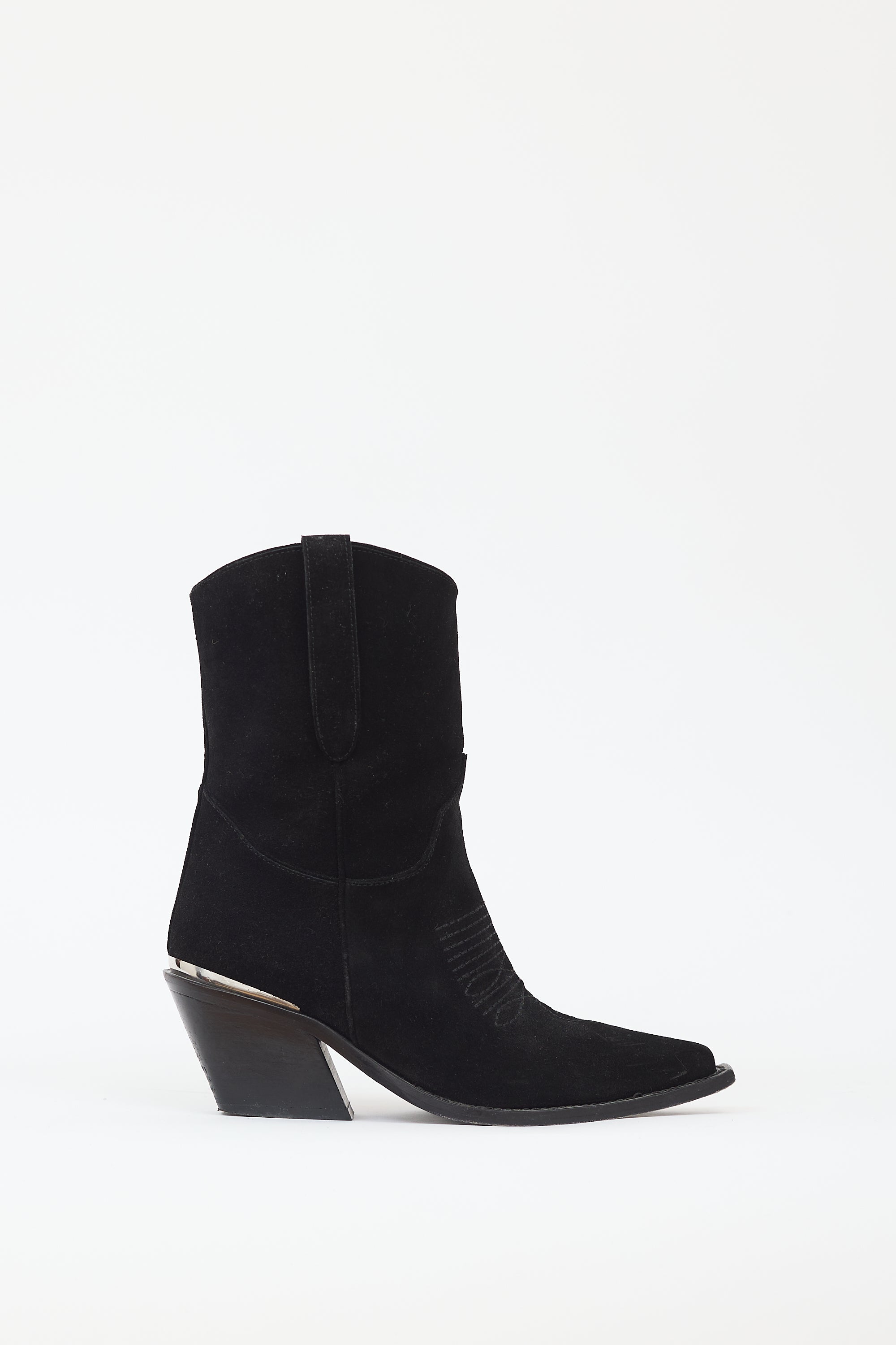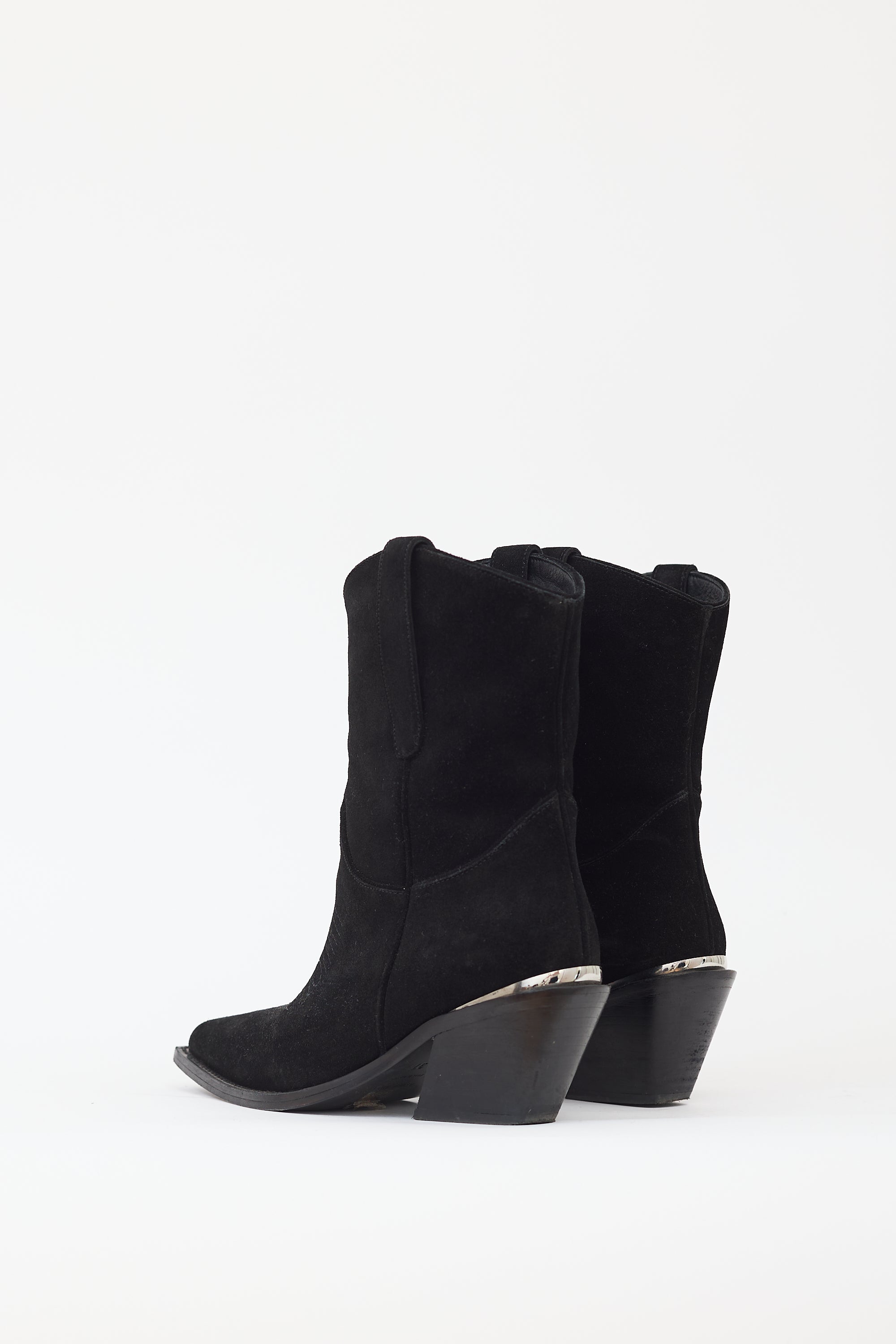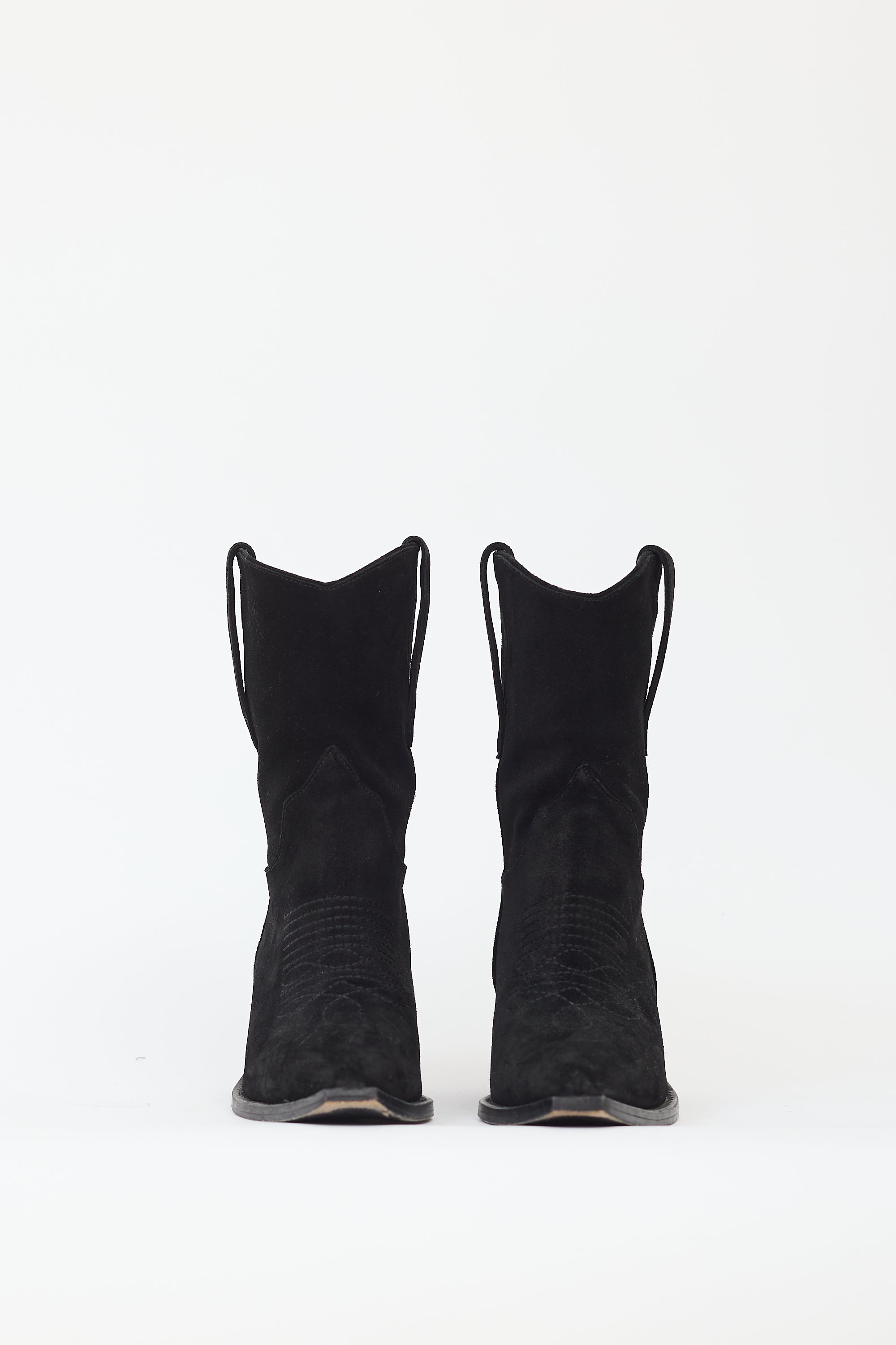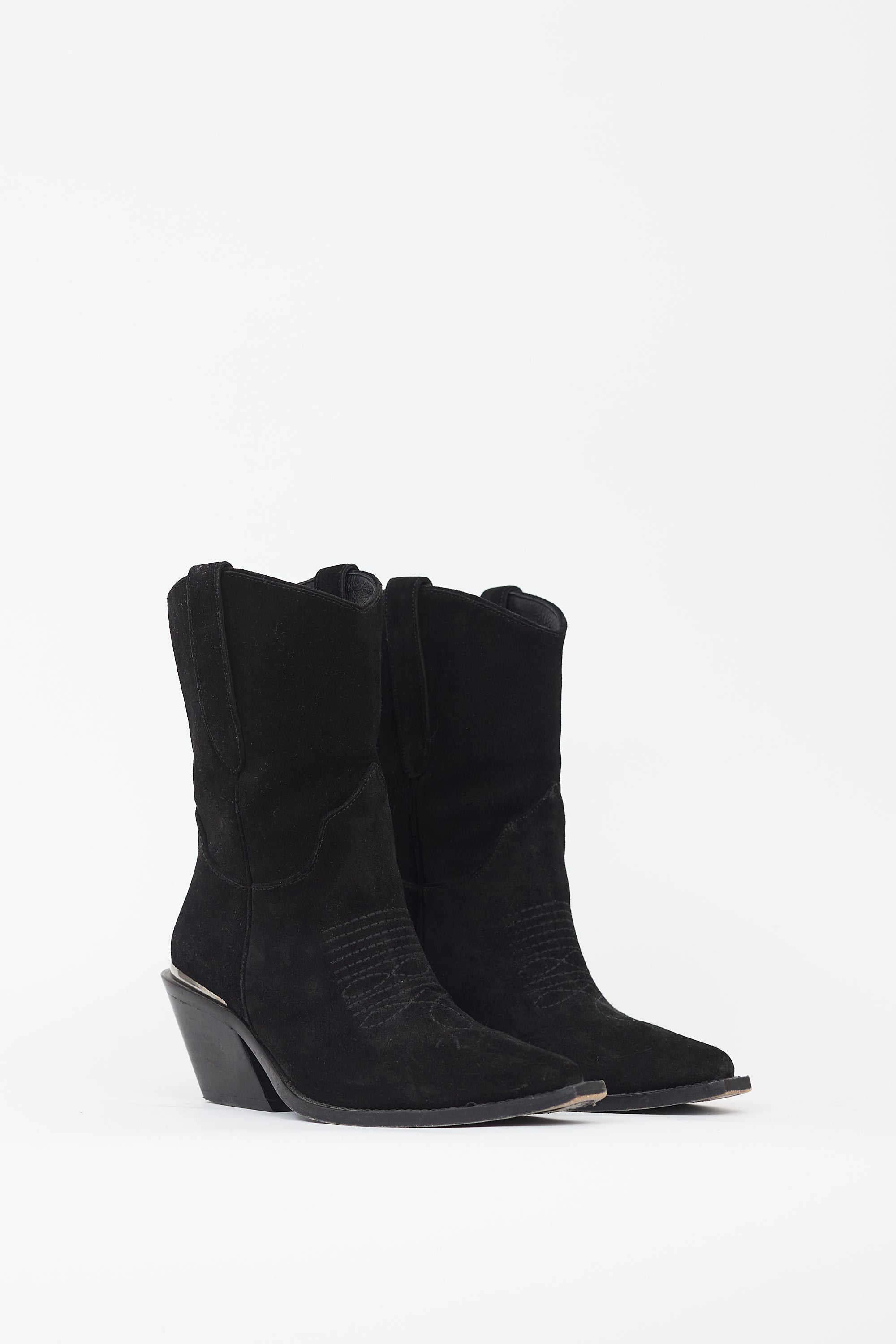 Pre-owned Anine Bing black suede Mid Tania boots featuring pointed toe, western stitch detailing, dual pull tabs at sides, silver tone hardware at counter, and cuban heel.