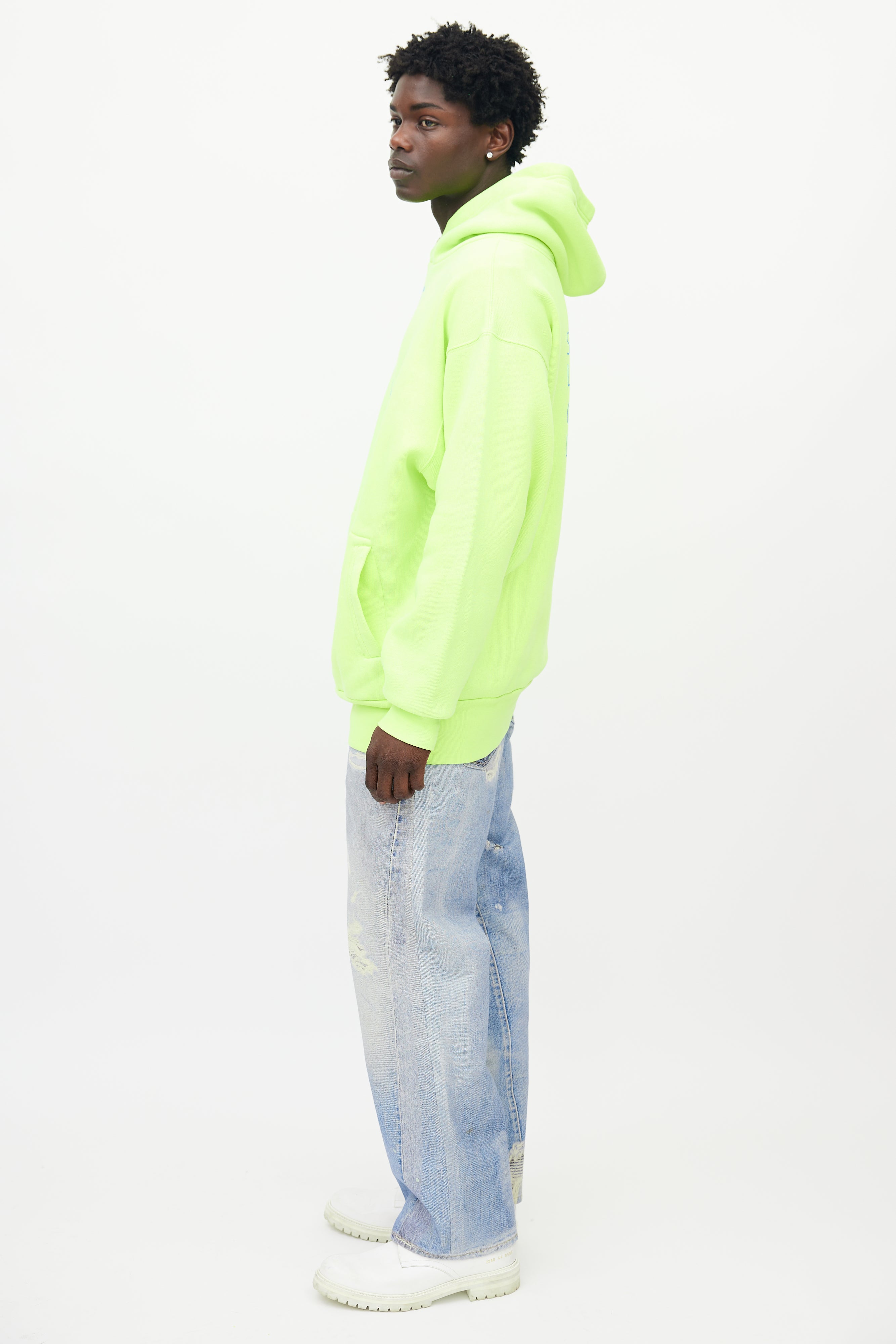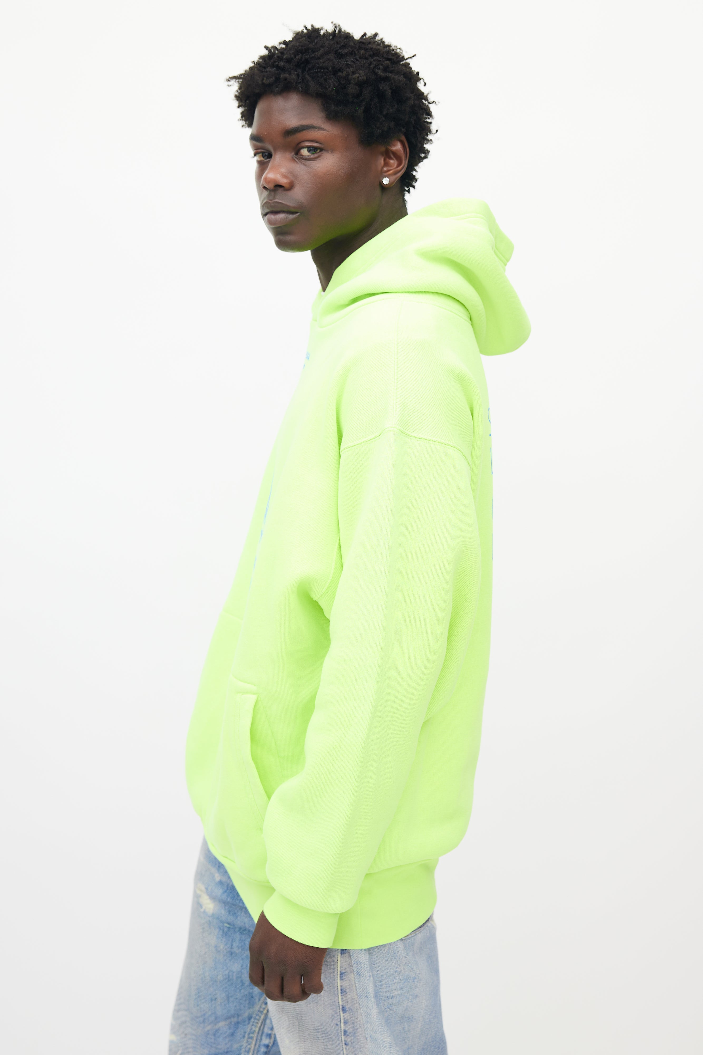 Pre-owned Balenciaga hoodie featuring neon green cotton blend throughout, blue logo at front, text at back, snap closure at neck and kangaroo pocket at front waist.
