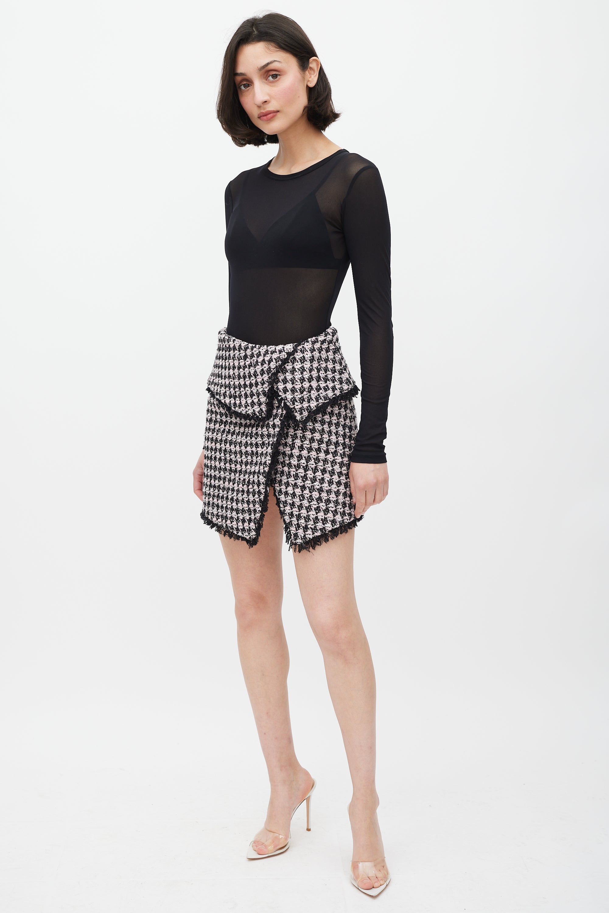Pre-owned Balmain pink wool knit skirt featuring a black houndstooth pattern throughout, reflective sequin detailing, folded detail at waist, fringe trim, and zip closure at back. Lined.
