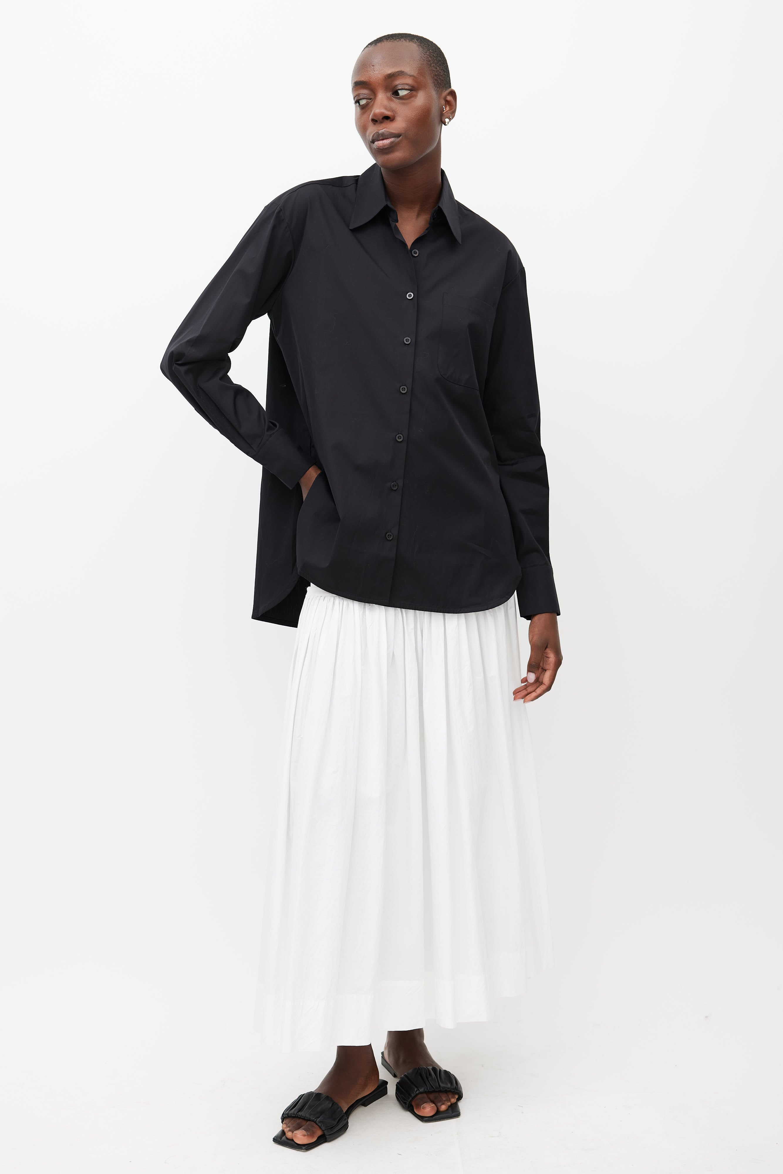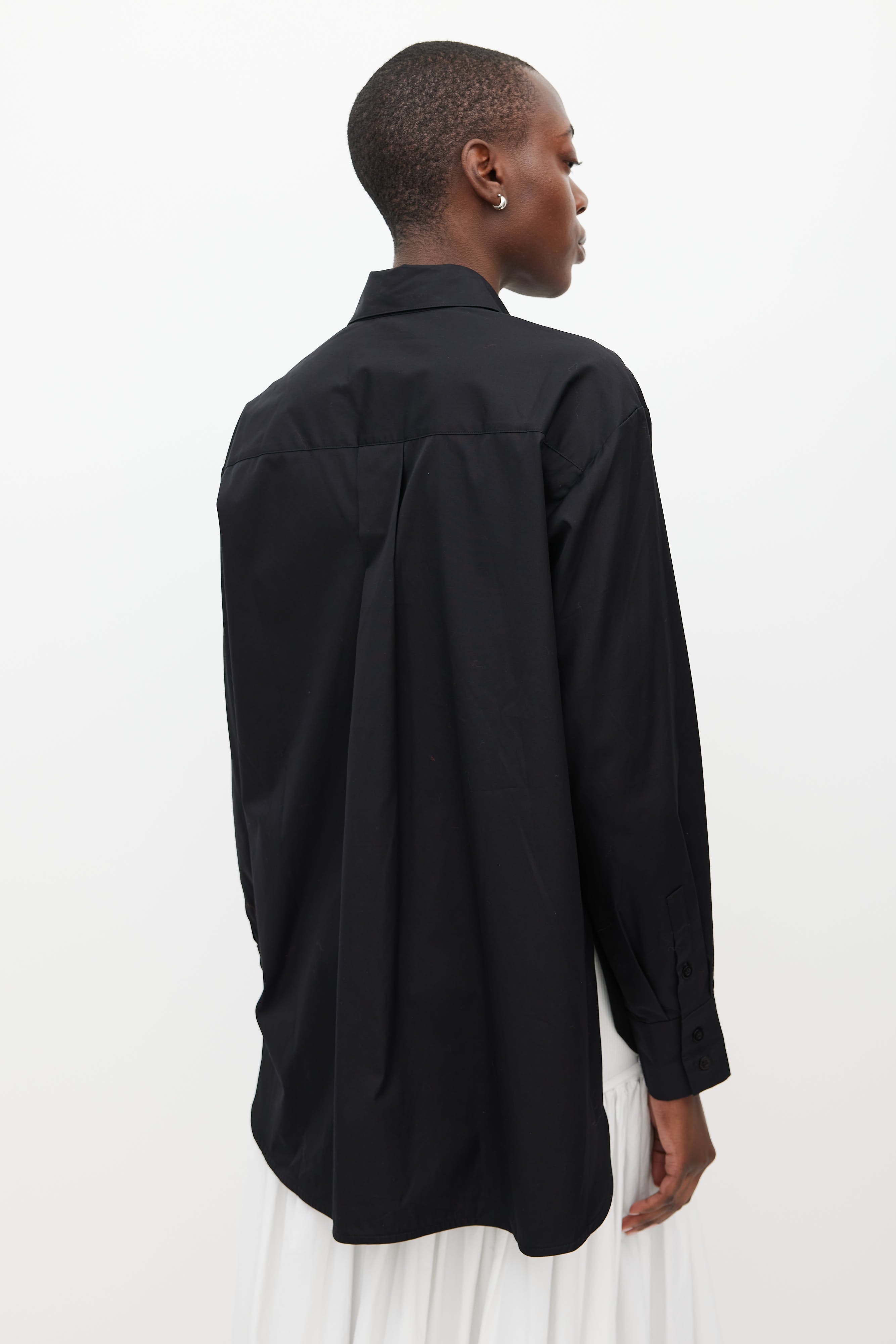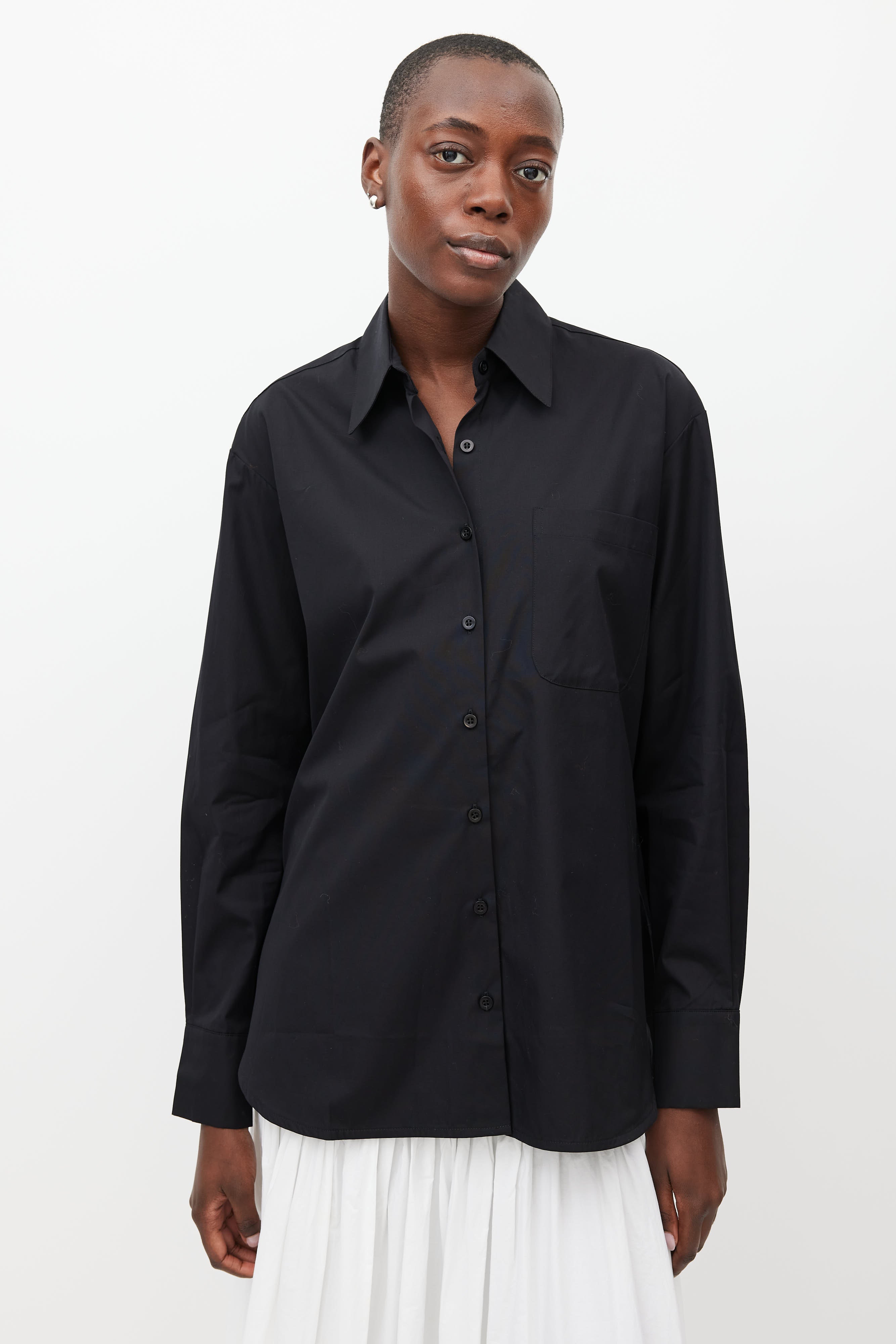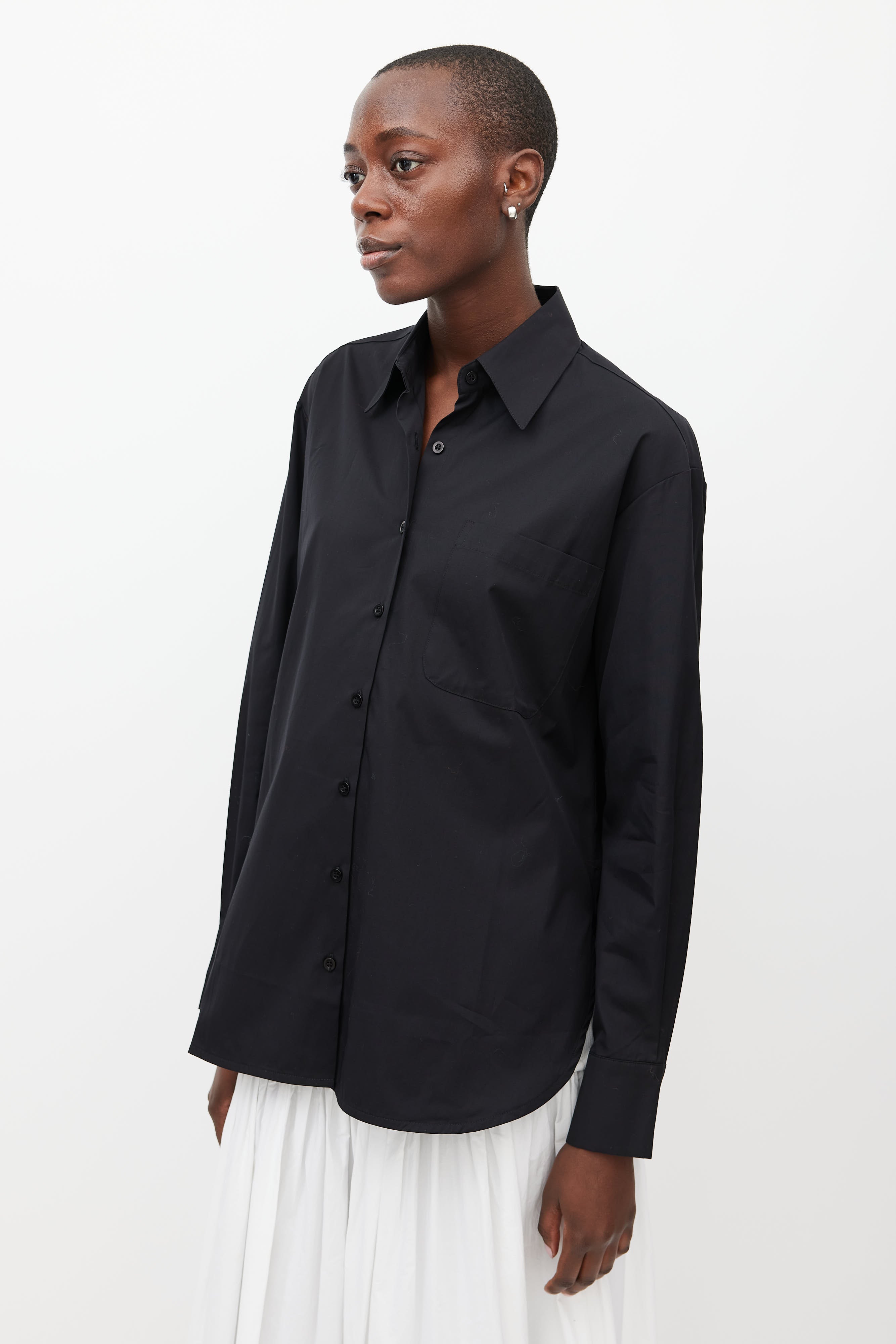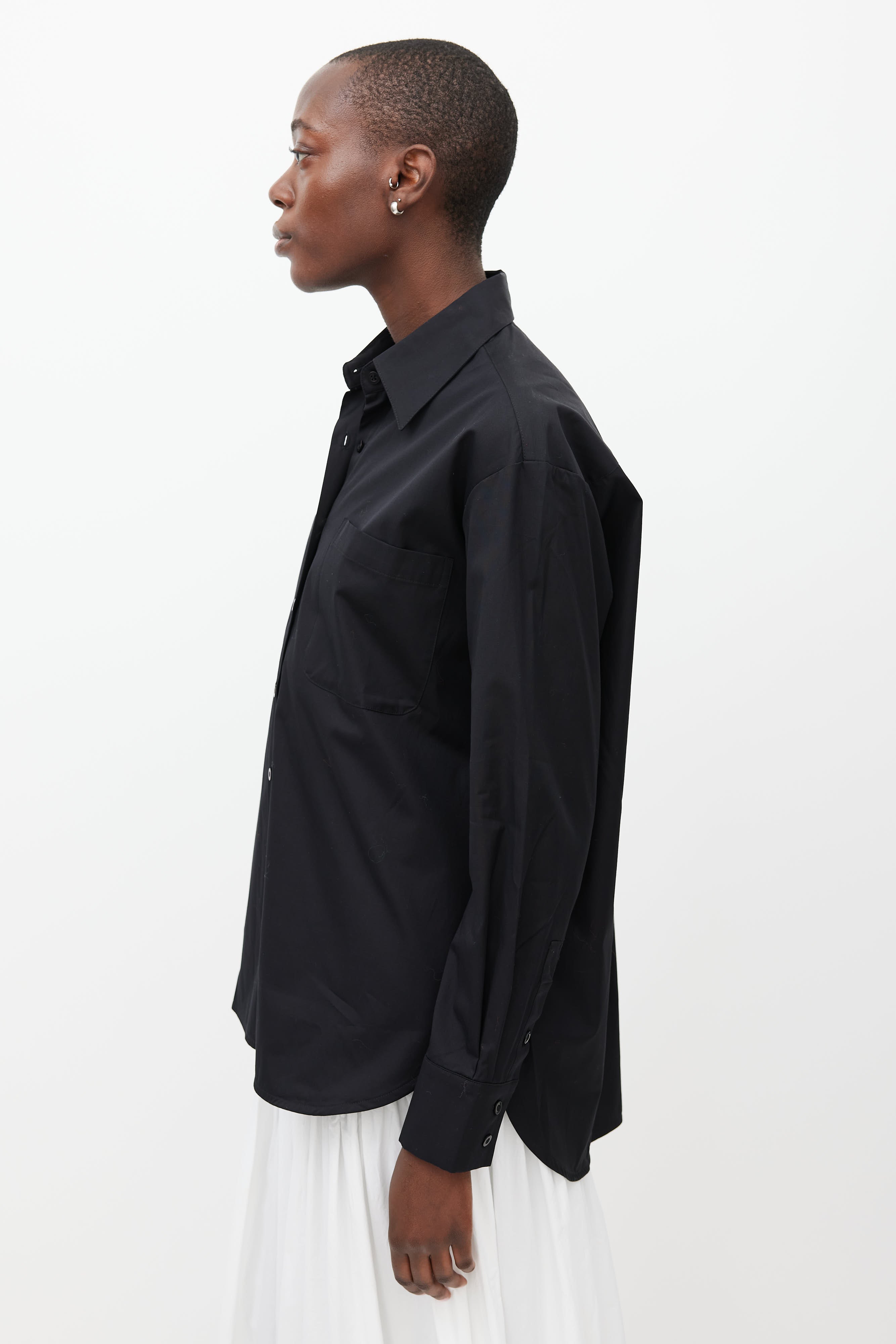Beaufille black Deren shirt featuring a pointed collar, long sleeves with buttoned cuffs, one patch pocket at chest, and button up closure.