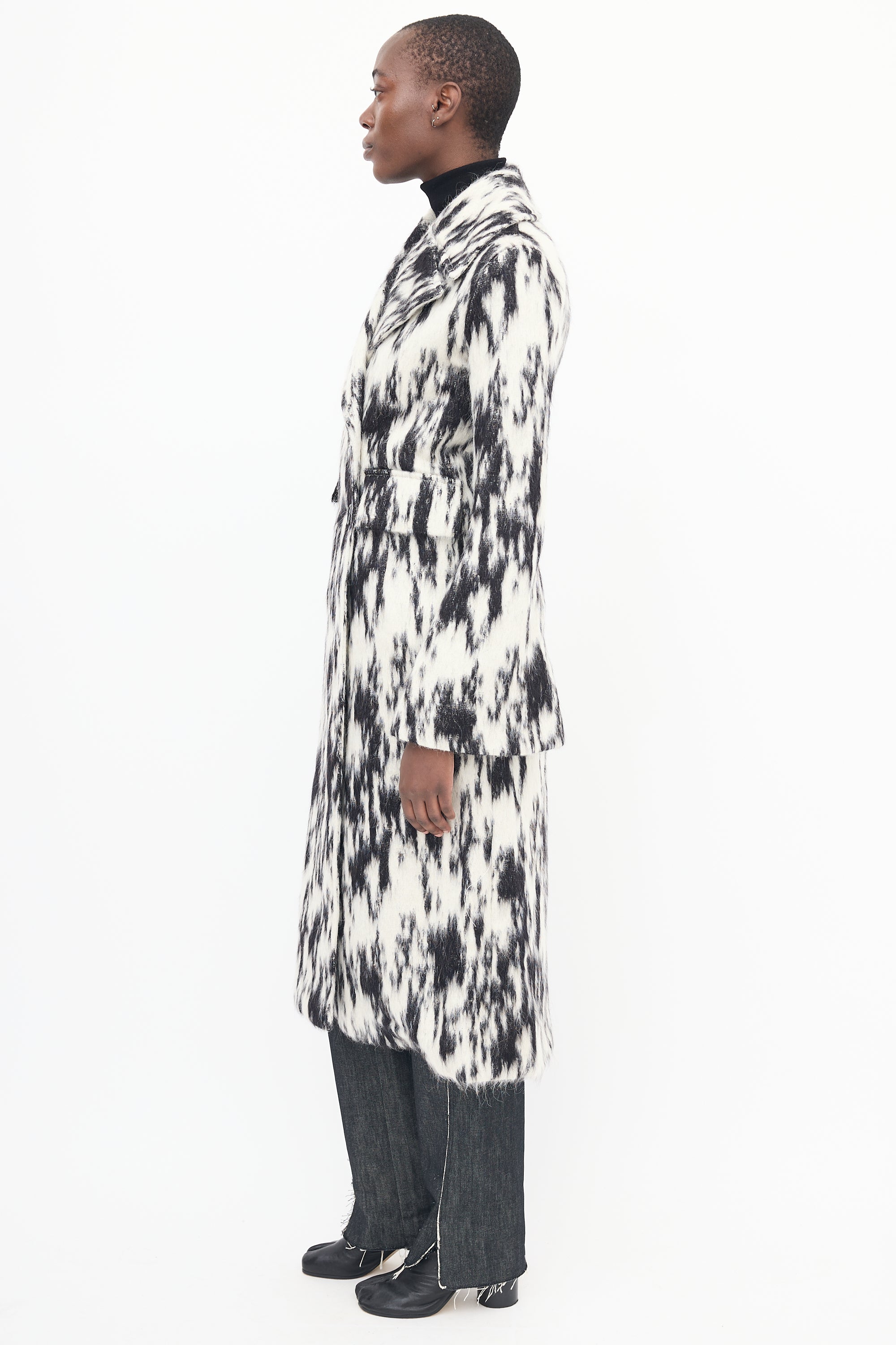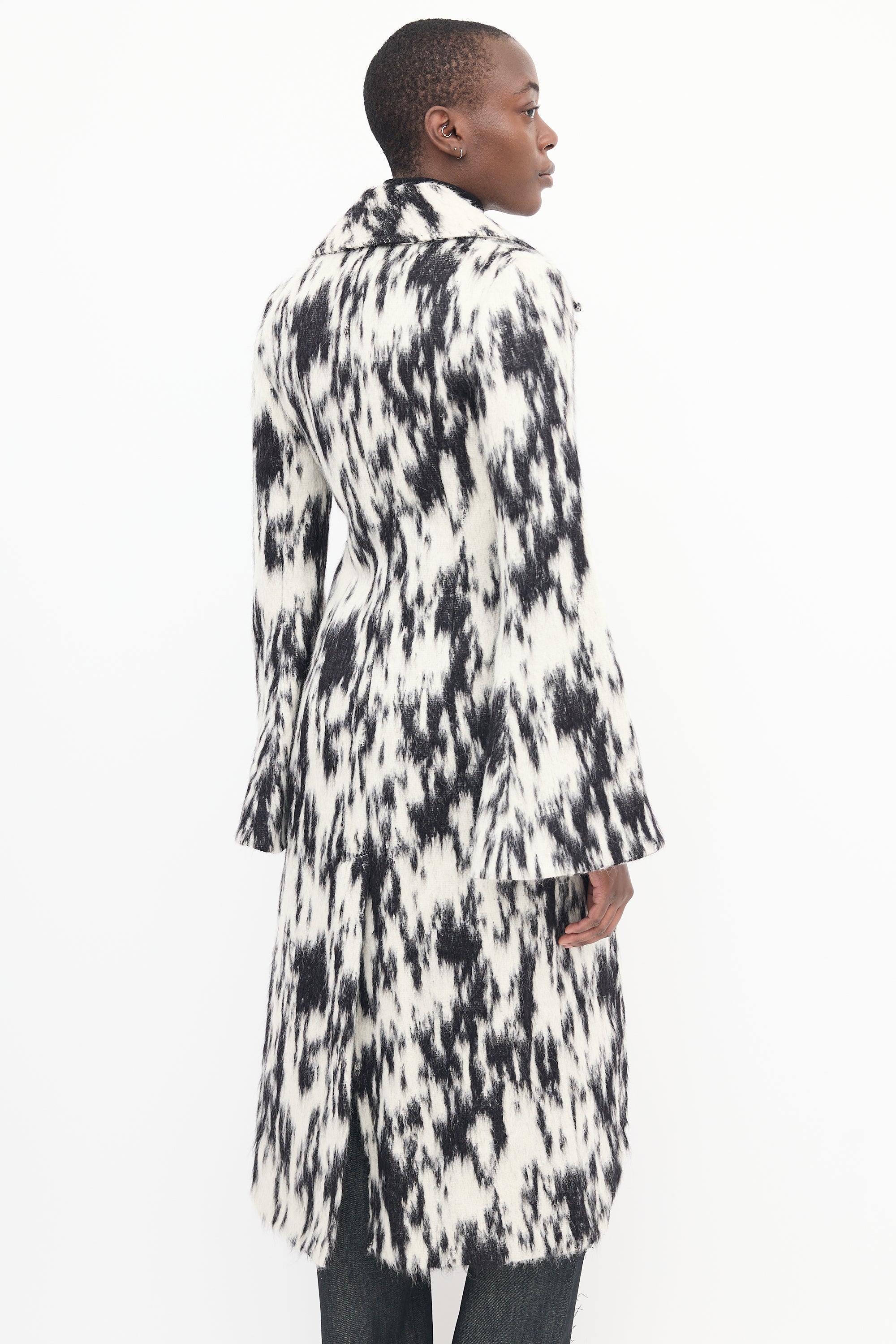 Pre-owned Beaufille black and white coat featuring abstract pattern, notch lapel, double breasted button up front, two flap pockets, back vent, and wide sleeves. Unlined.