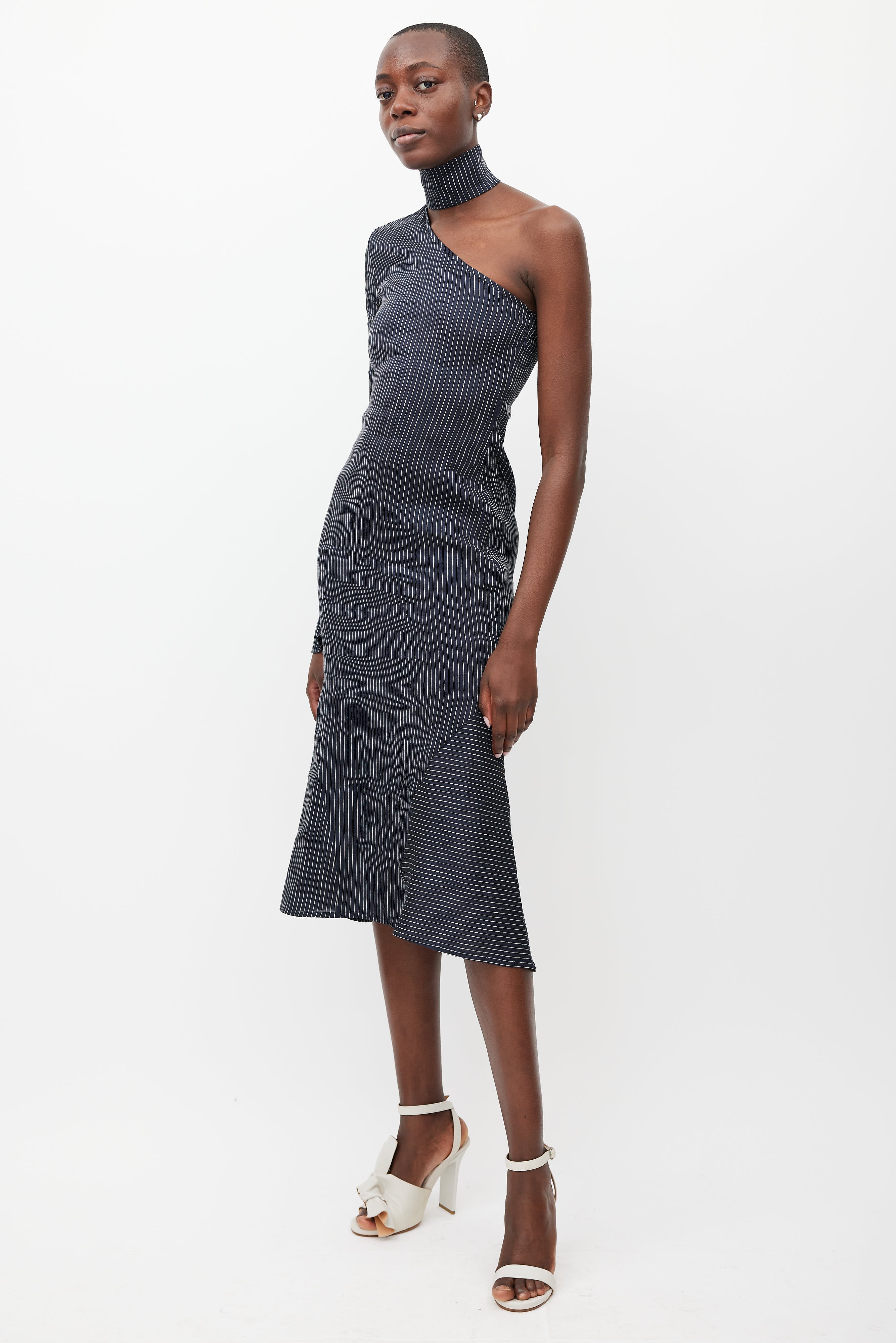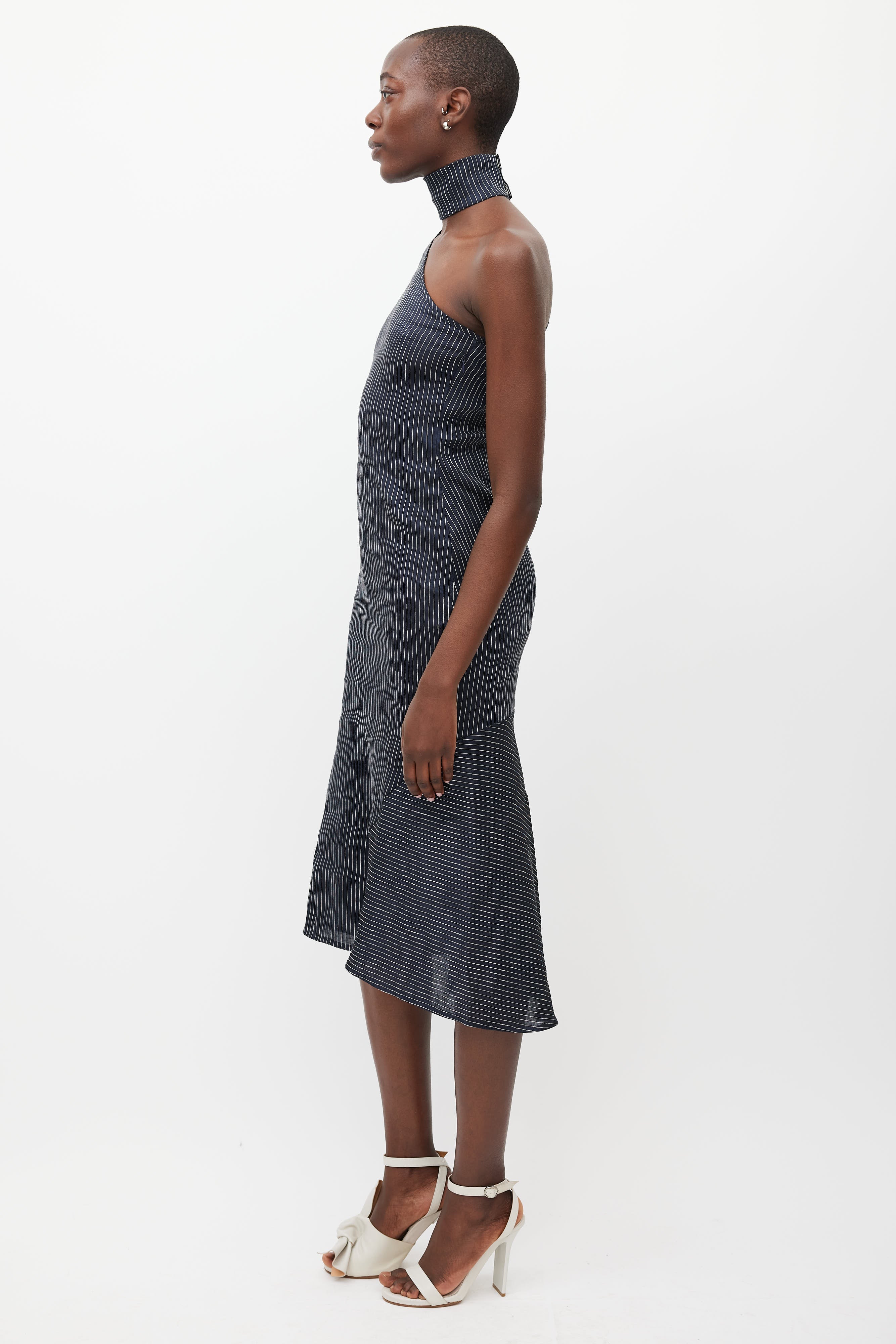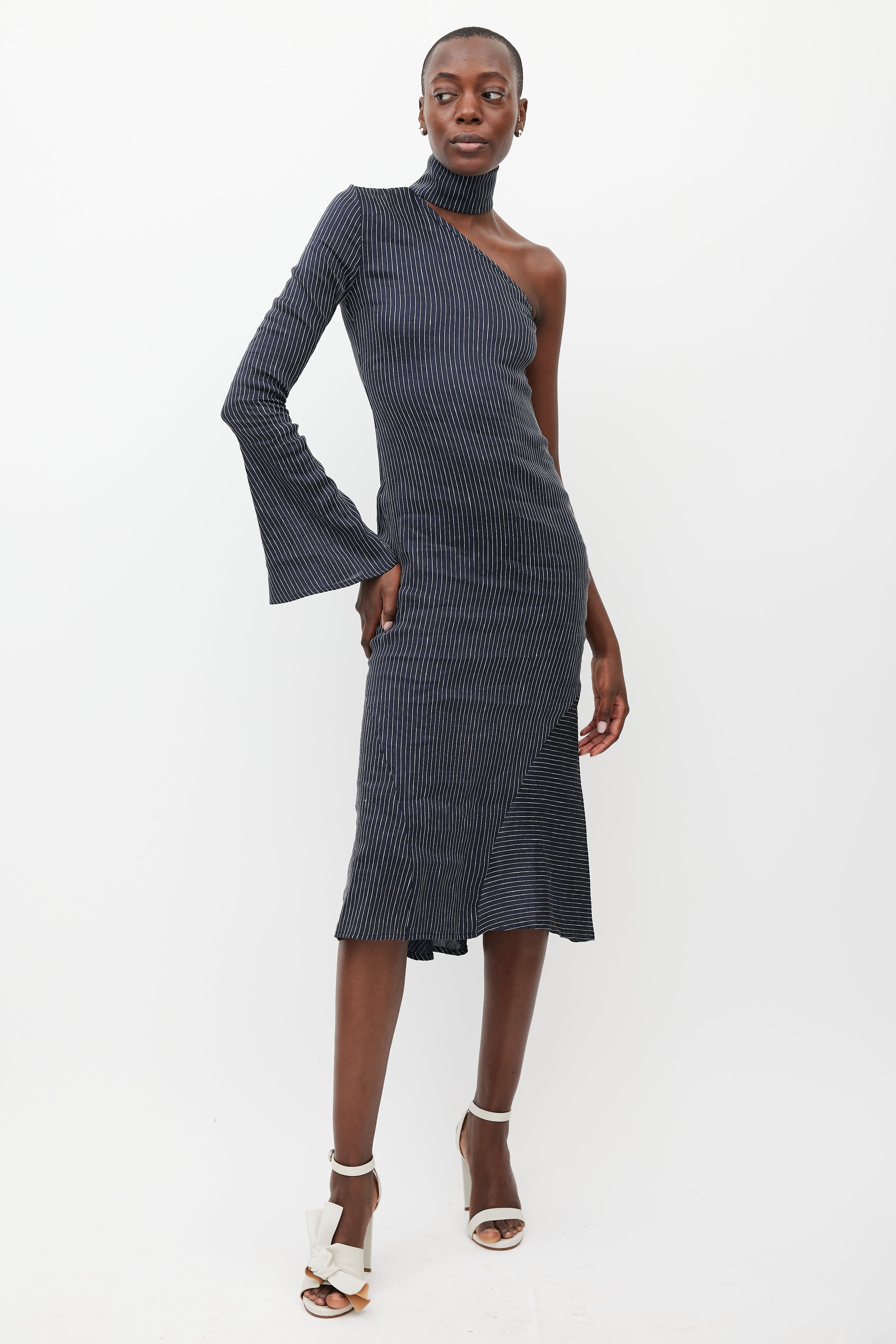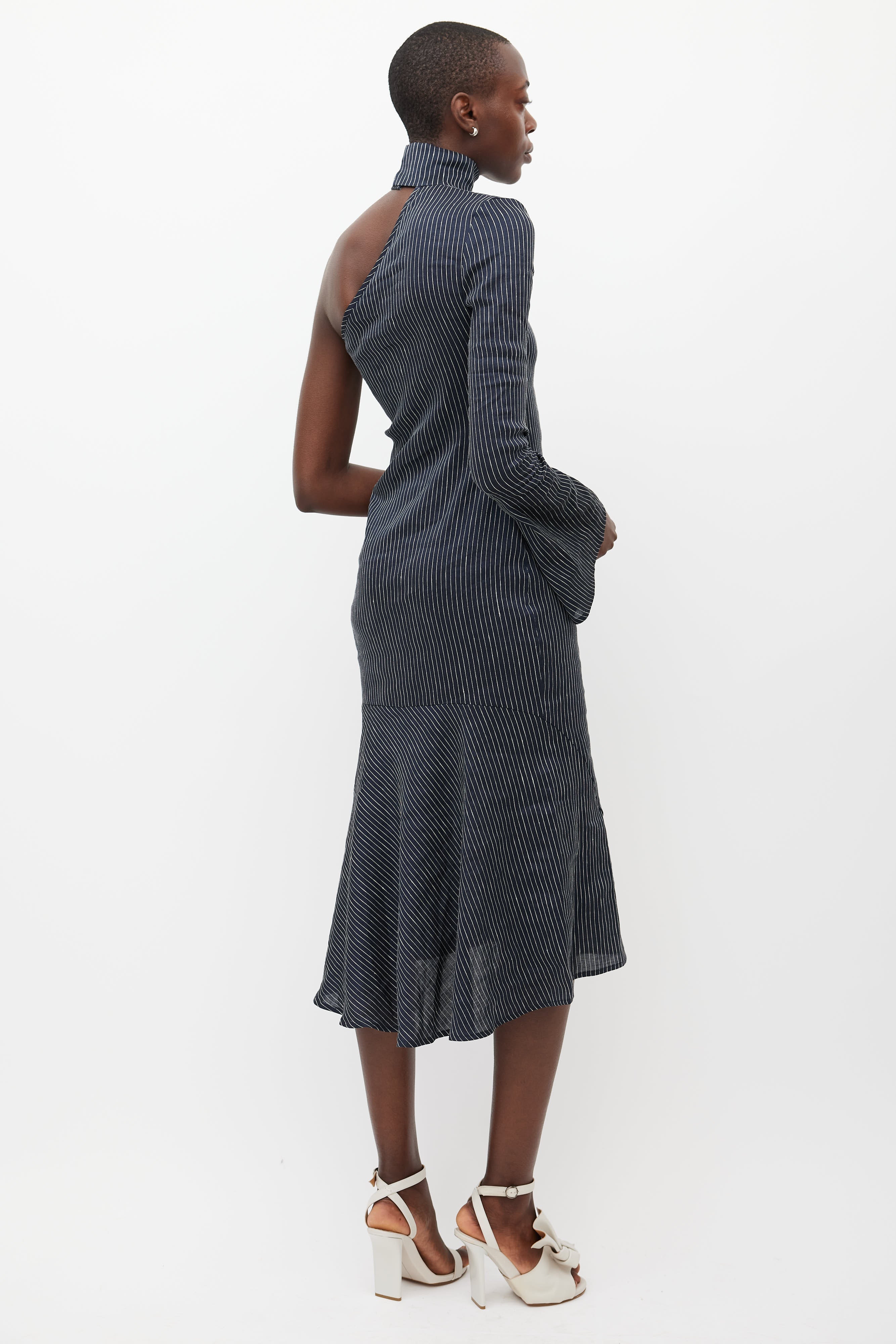 Beaufille navy Hydrus dress featuring a white pinstripe pattern throughout, mock neck collar, one shoulder styling with flared sleeve, ruffled hem, and zip closure at side.