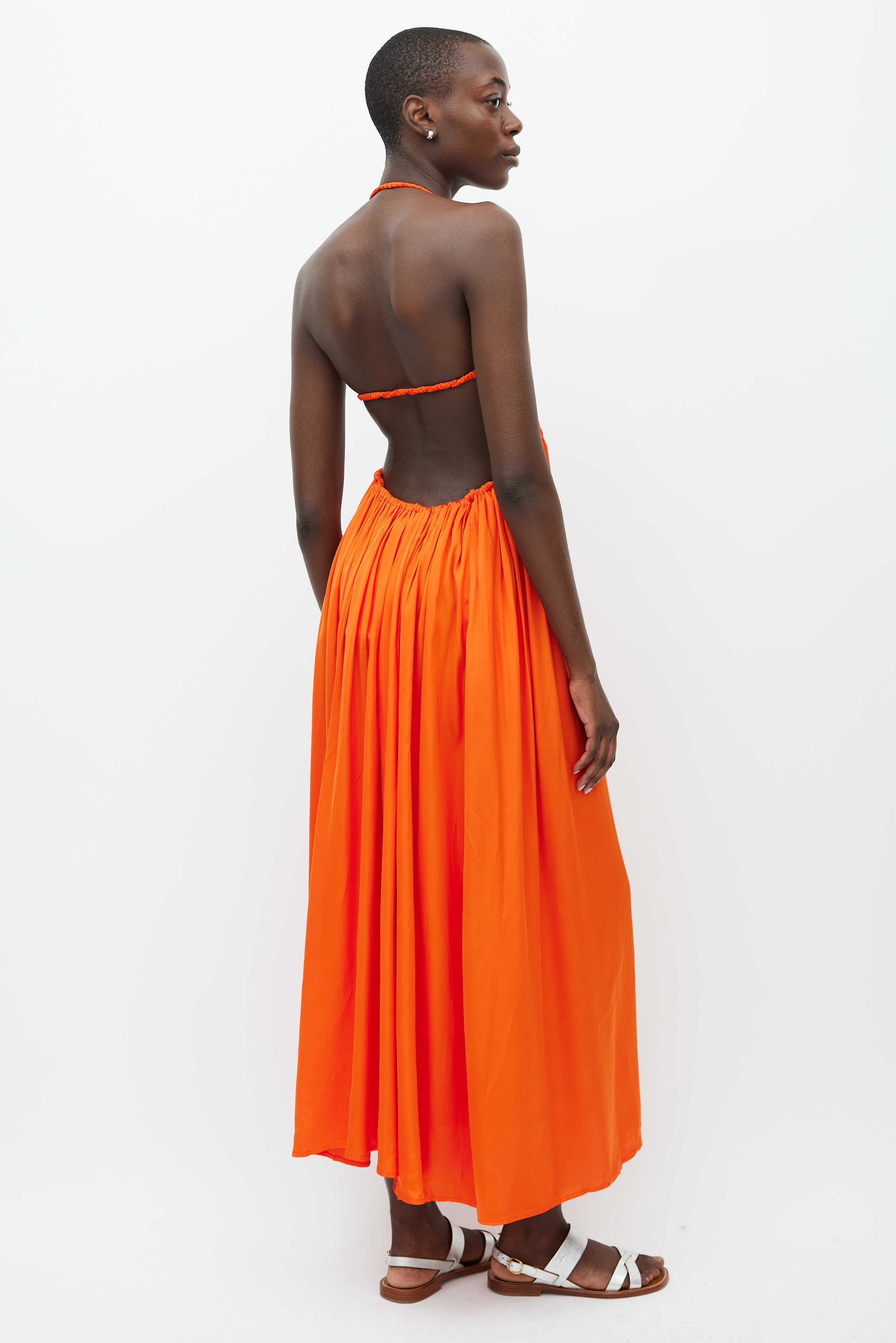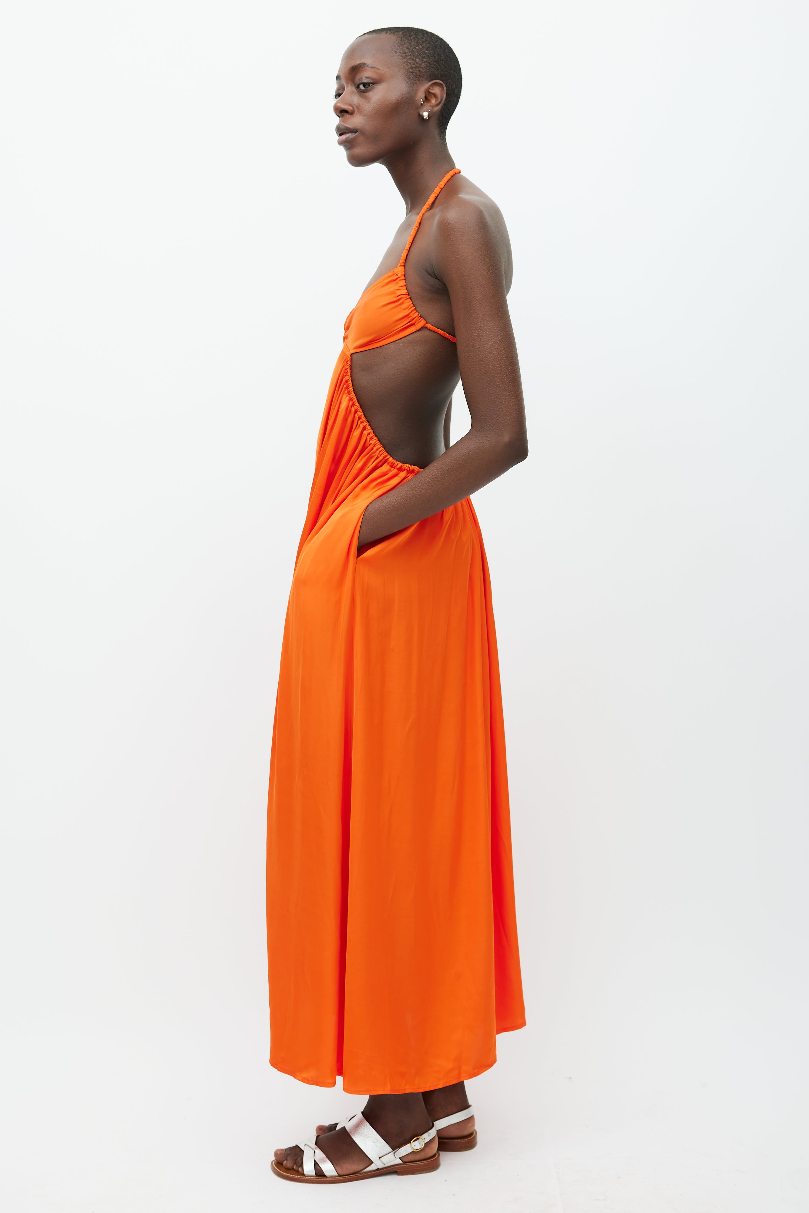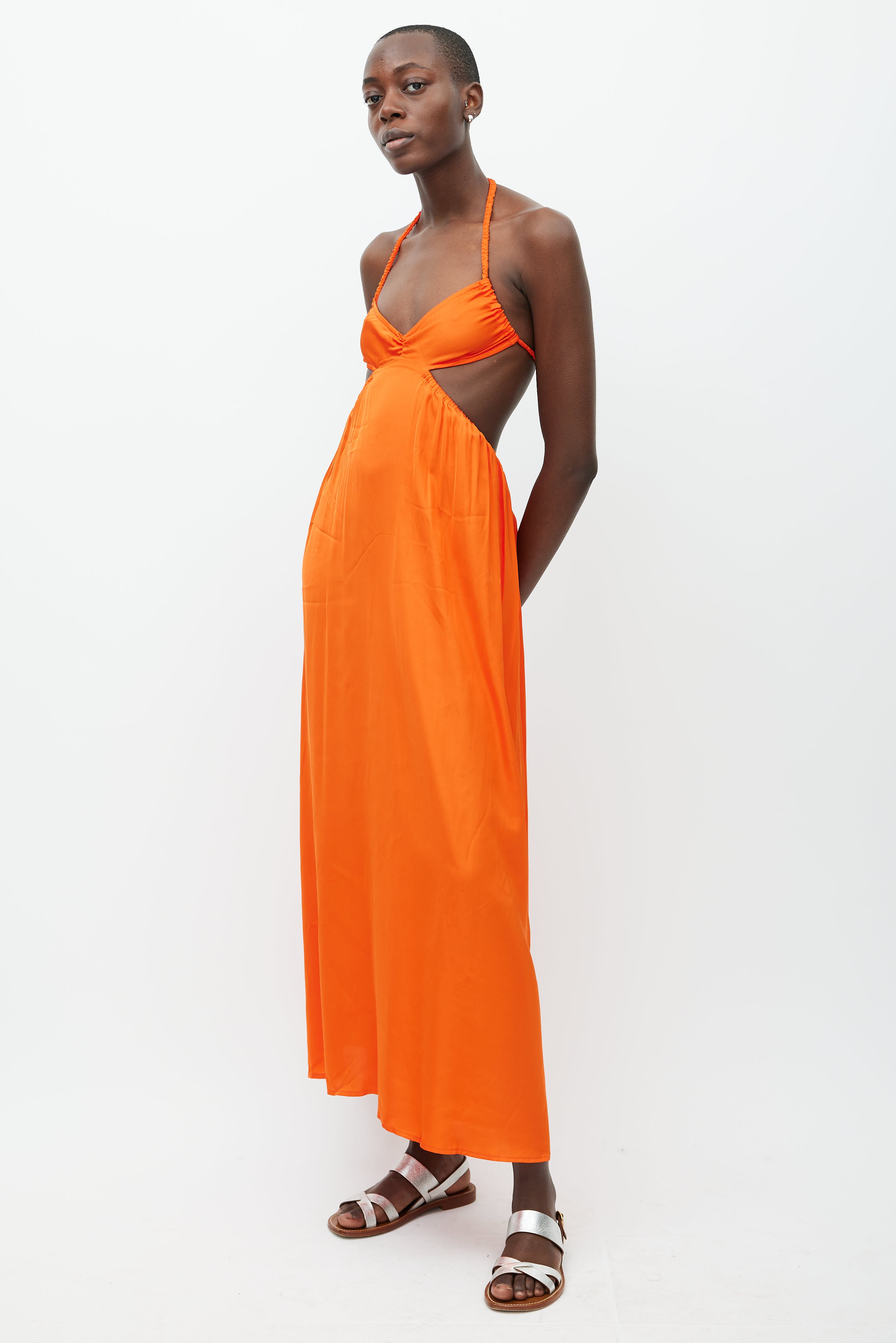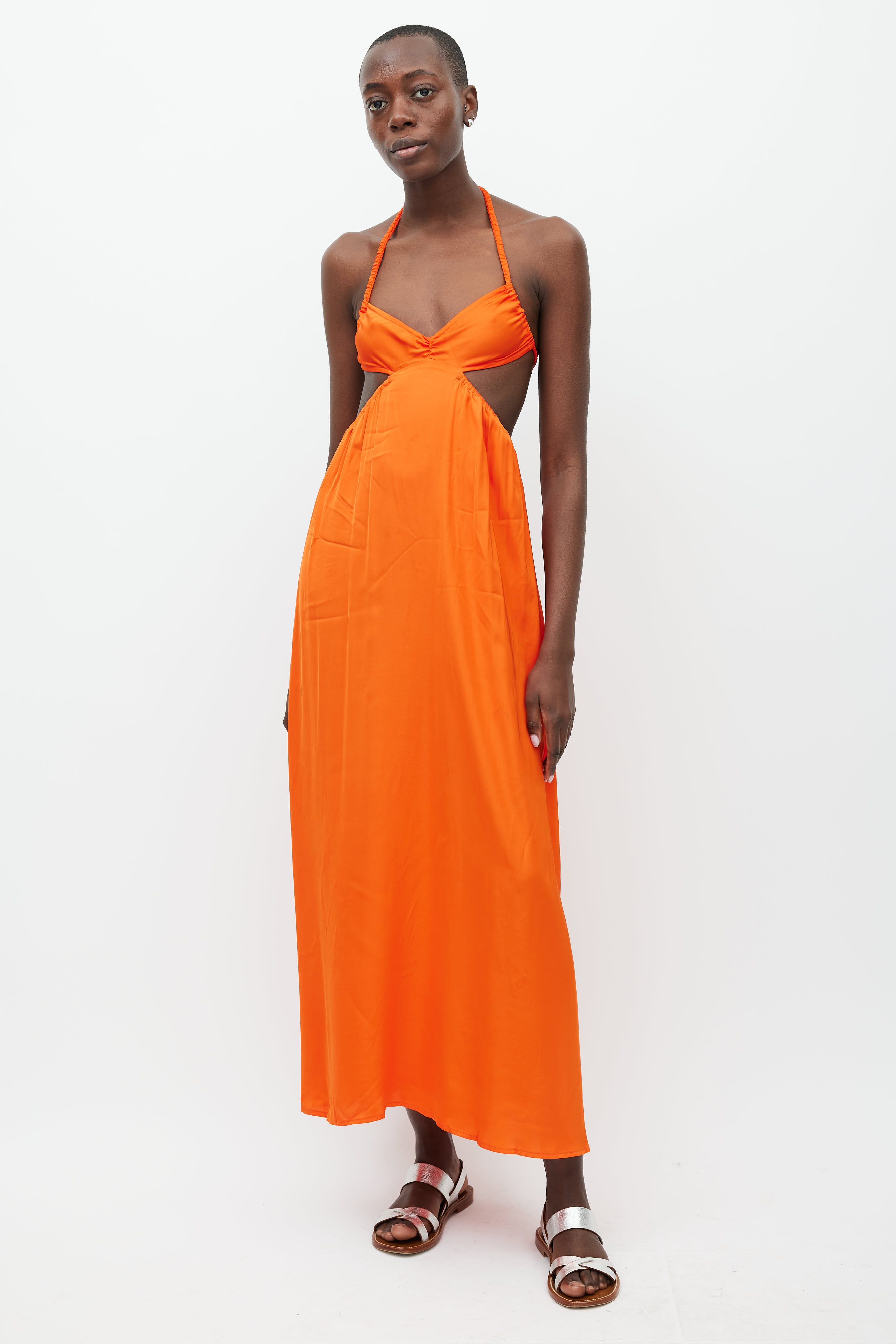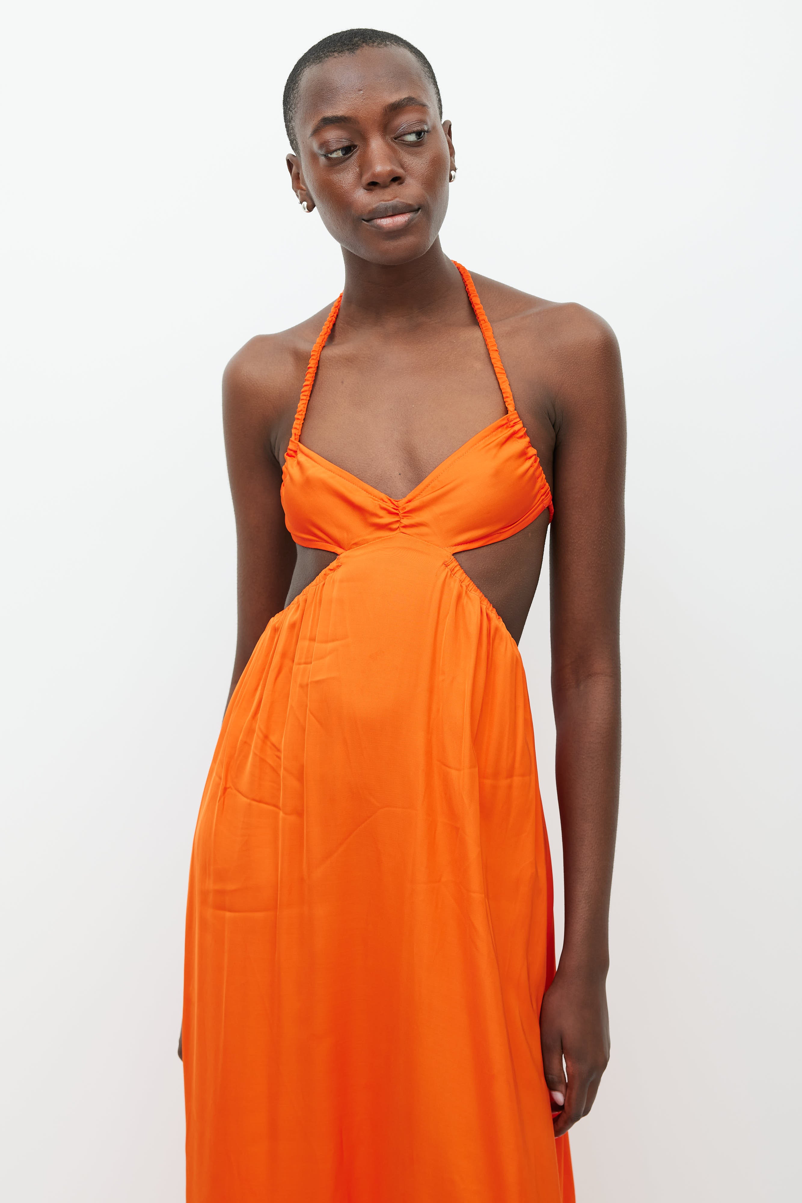 Beaufille orange Alina satin dress featuring a halter neckline, sleeveless styling, and cut out at back.