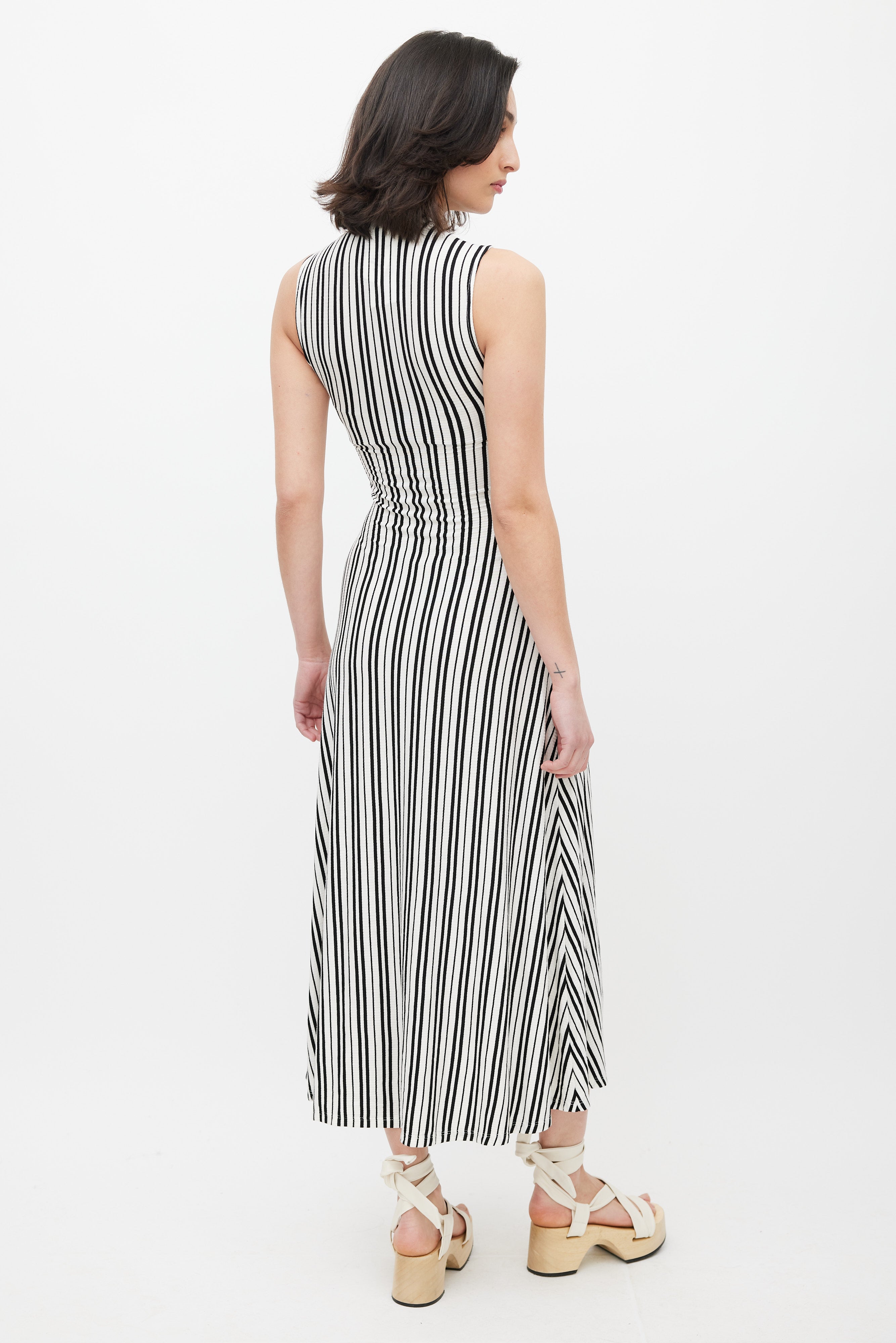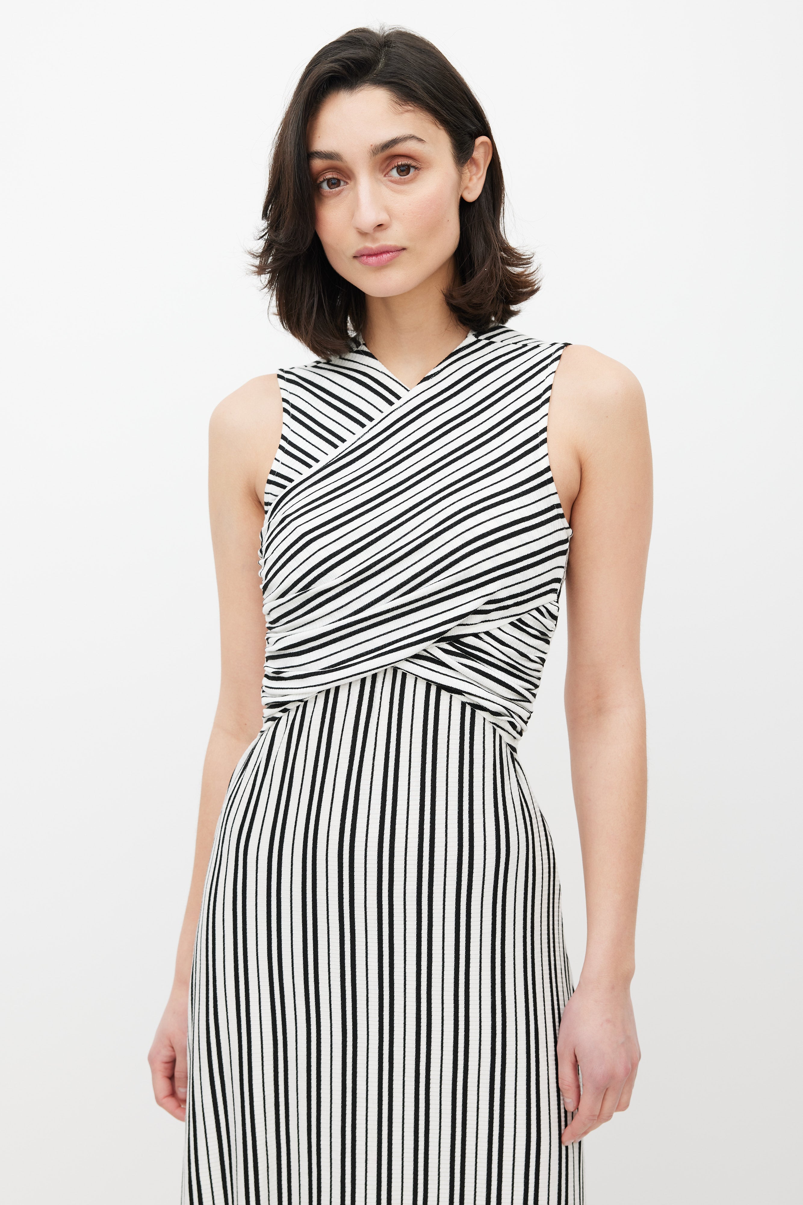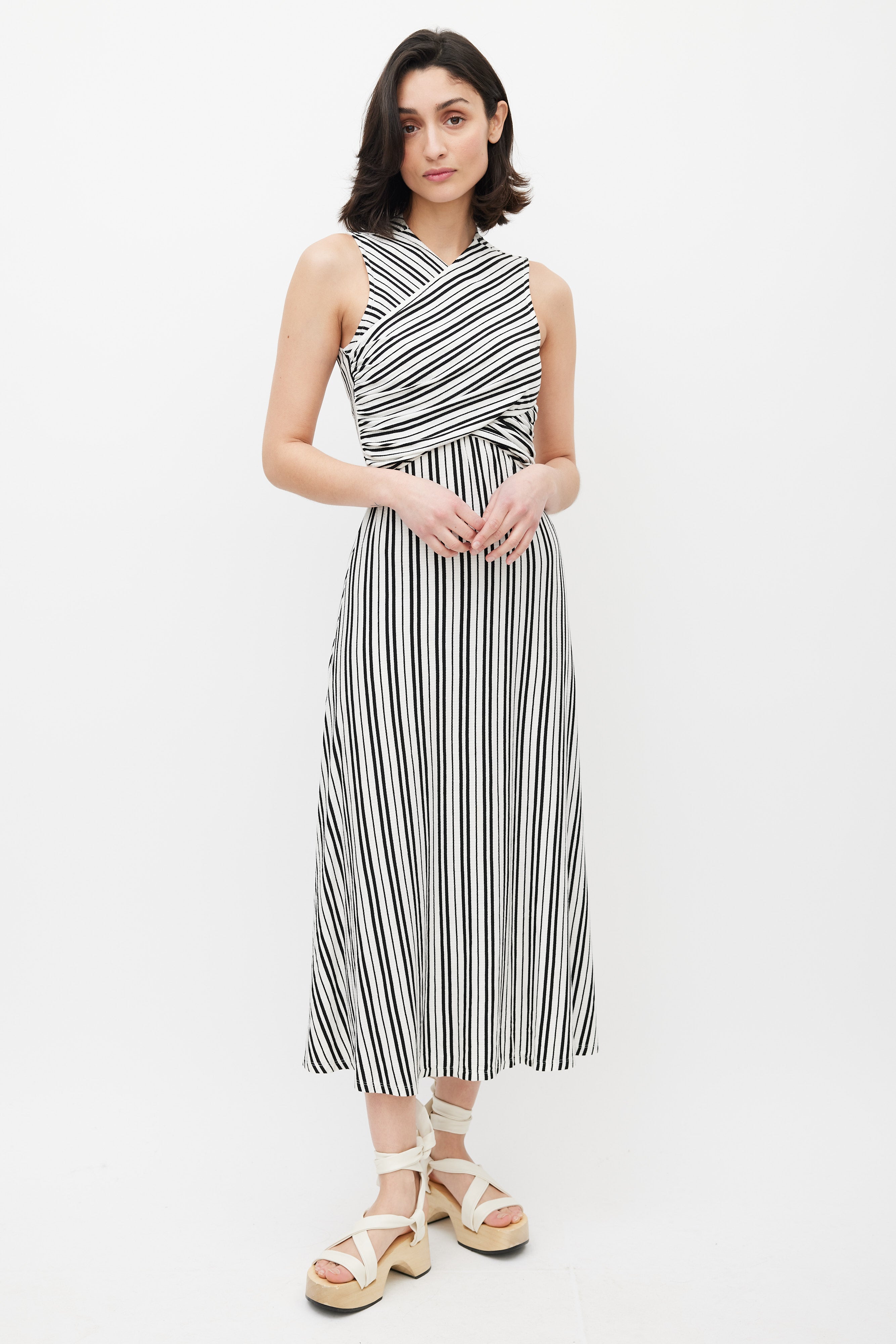 Beaufille white and black Damia dress featuring crew neckline, stripes, A-line skirt, and twist at front.