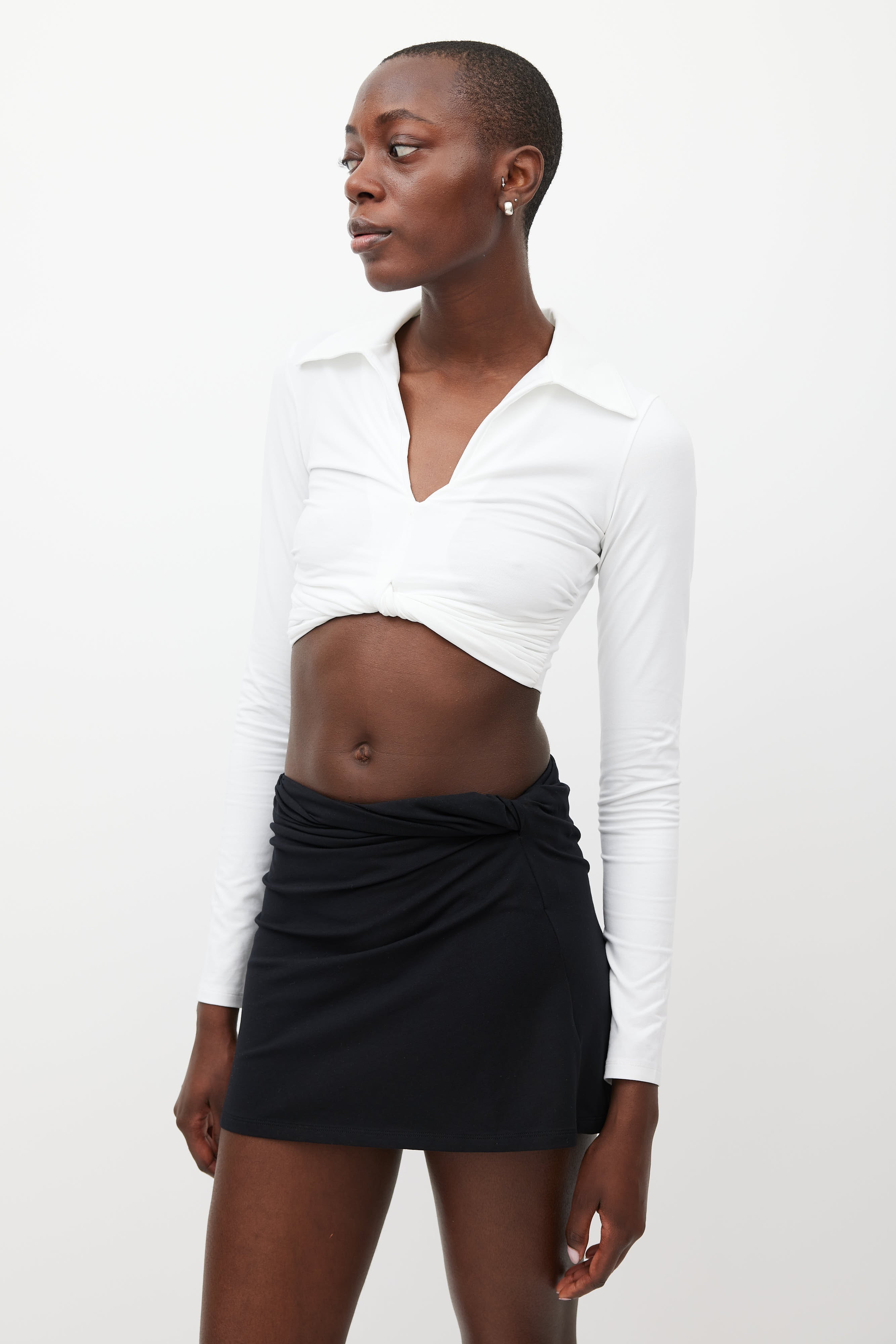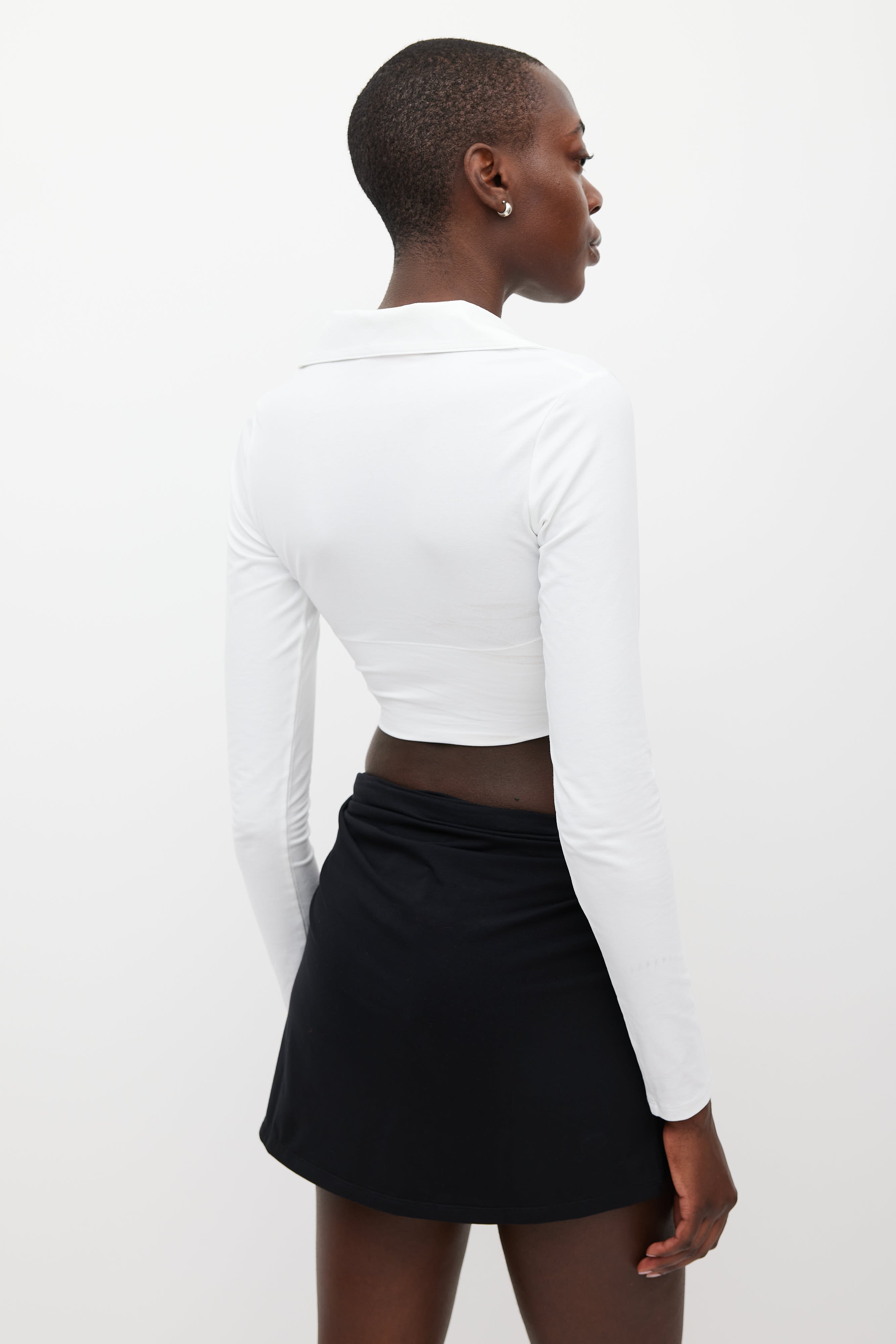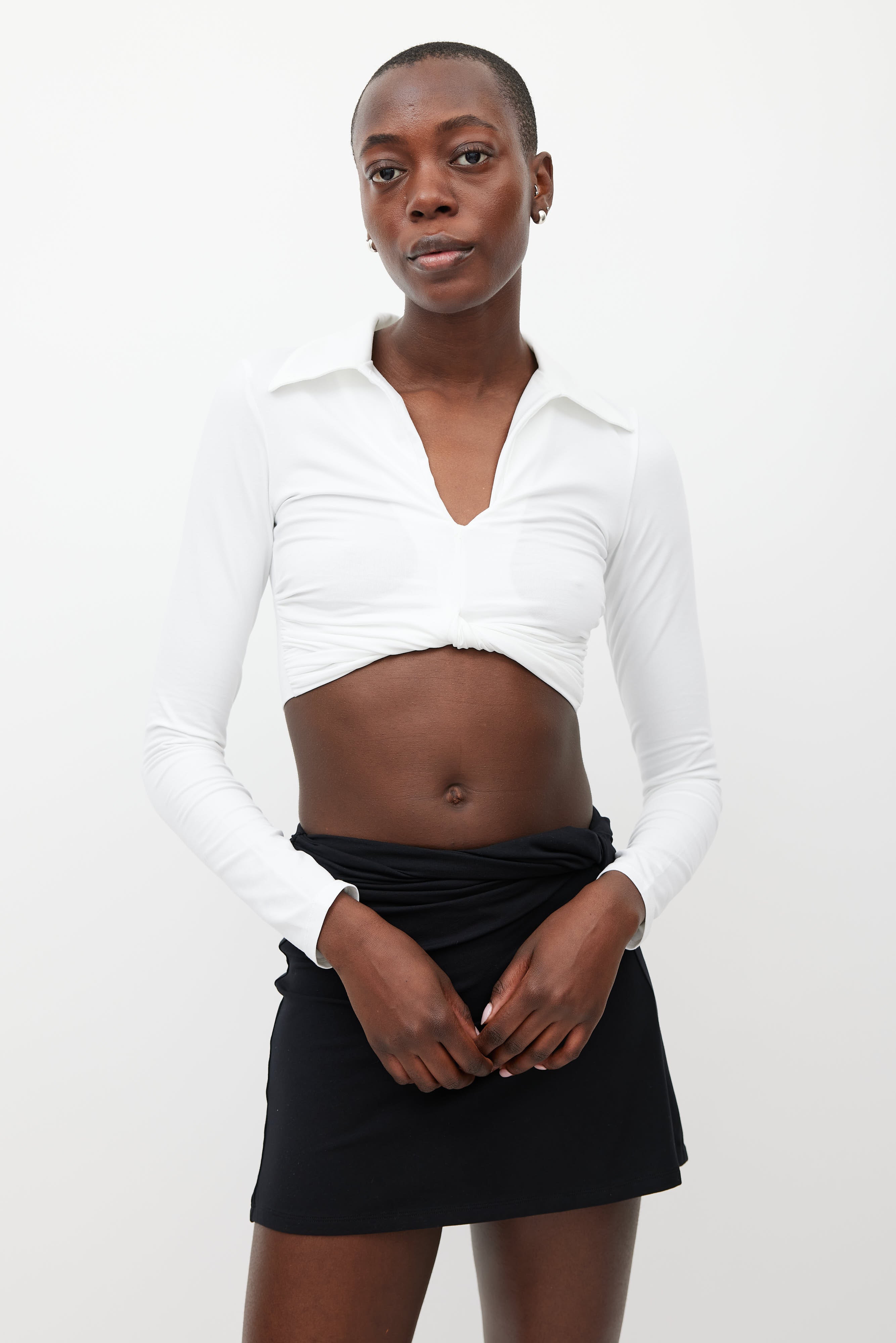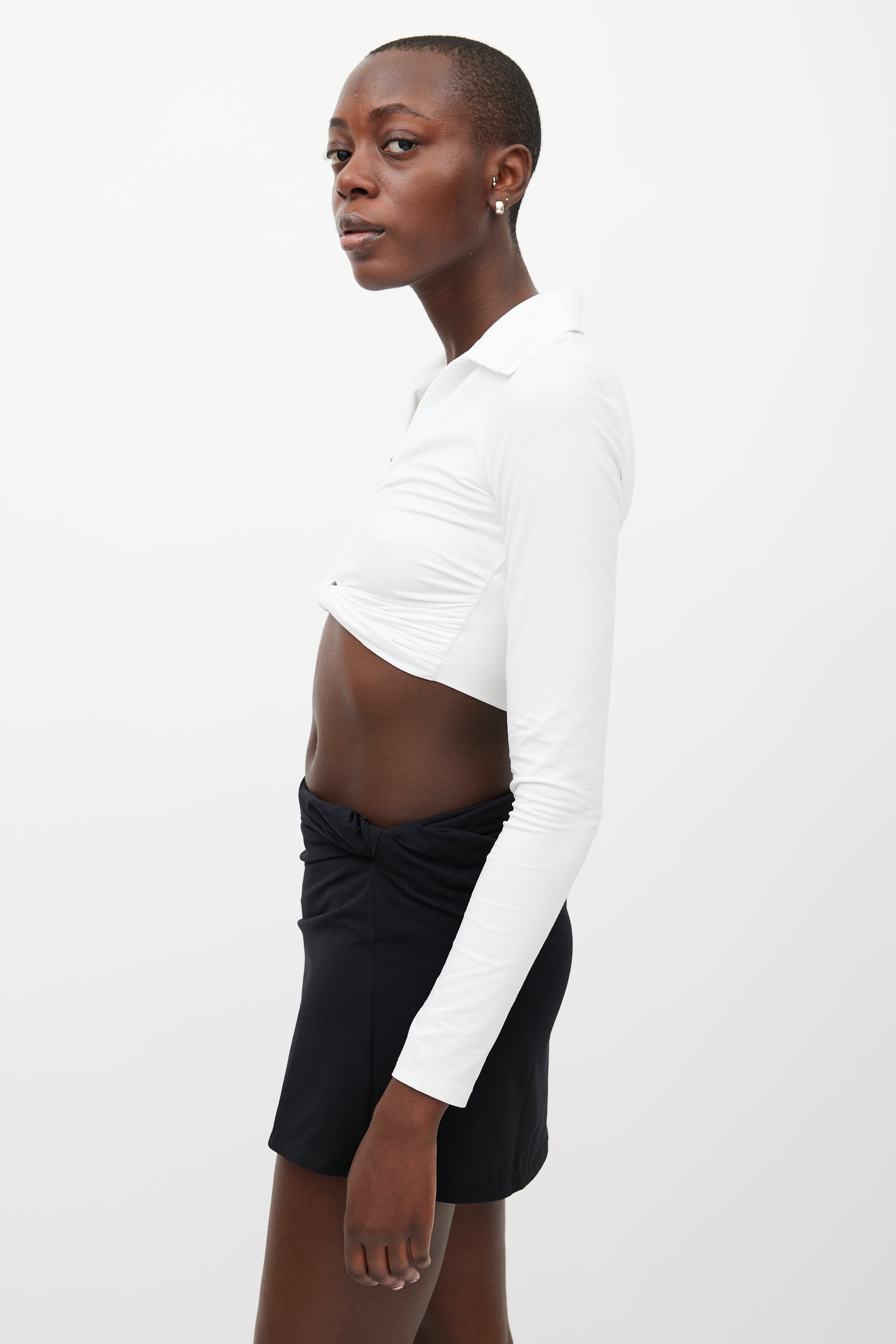 Pre-owned Beaufille white Coma top featuring a pointed collar, long sleeves, gathered front, and cropped fit.