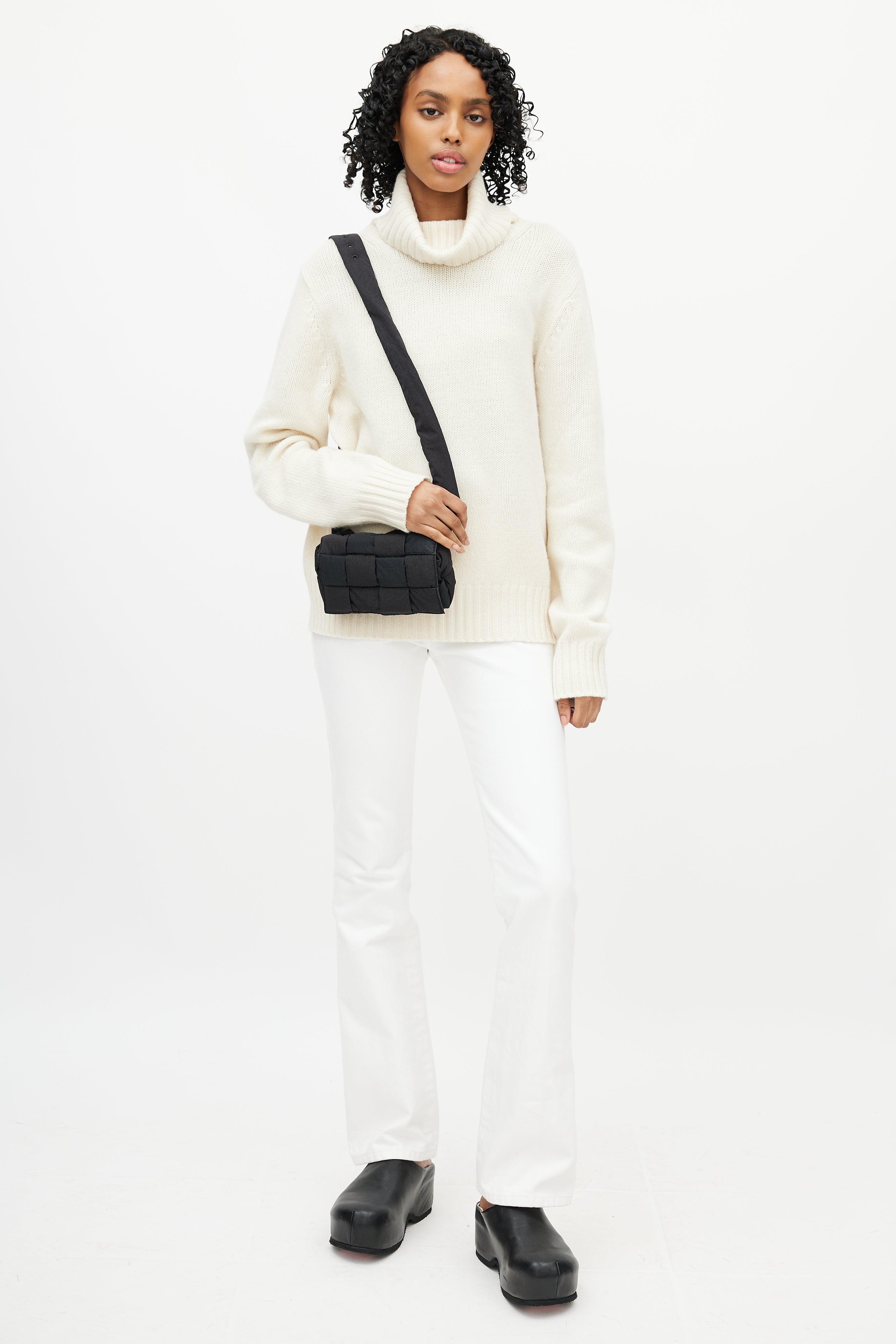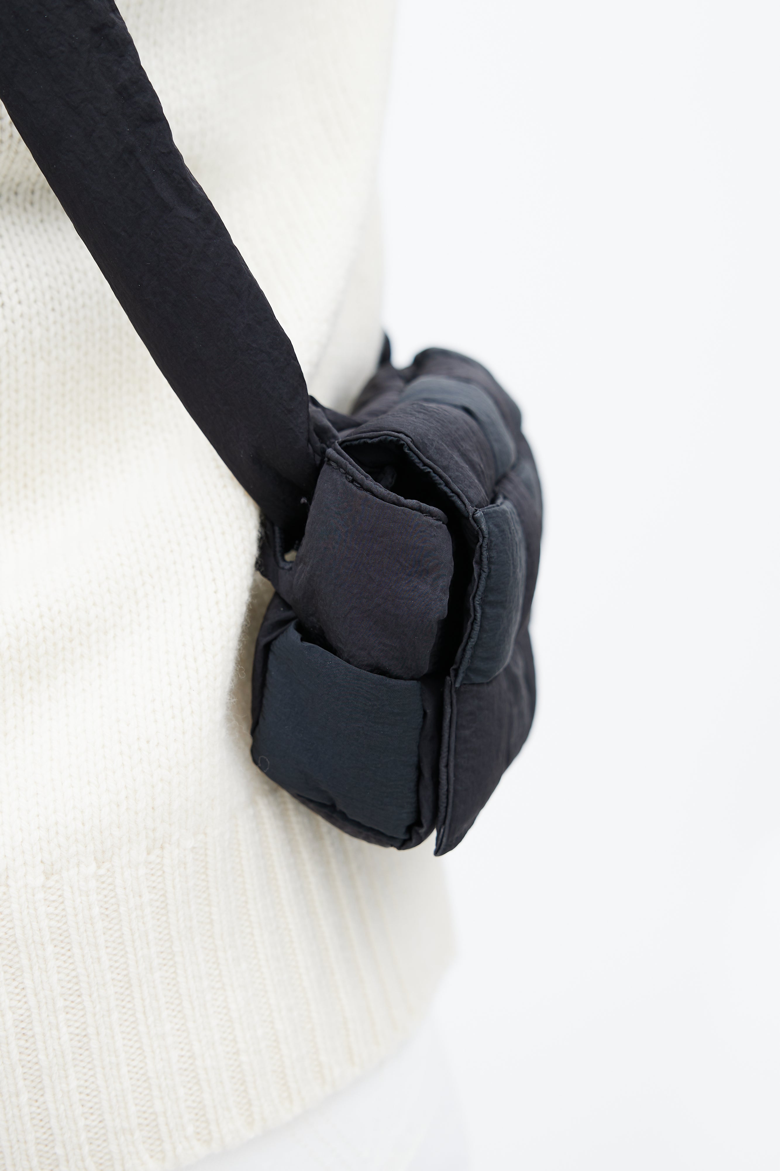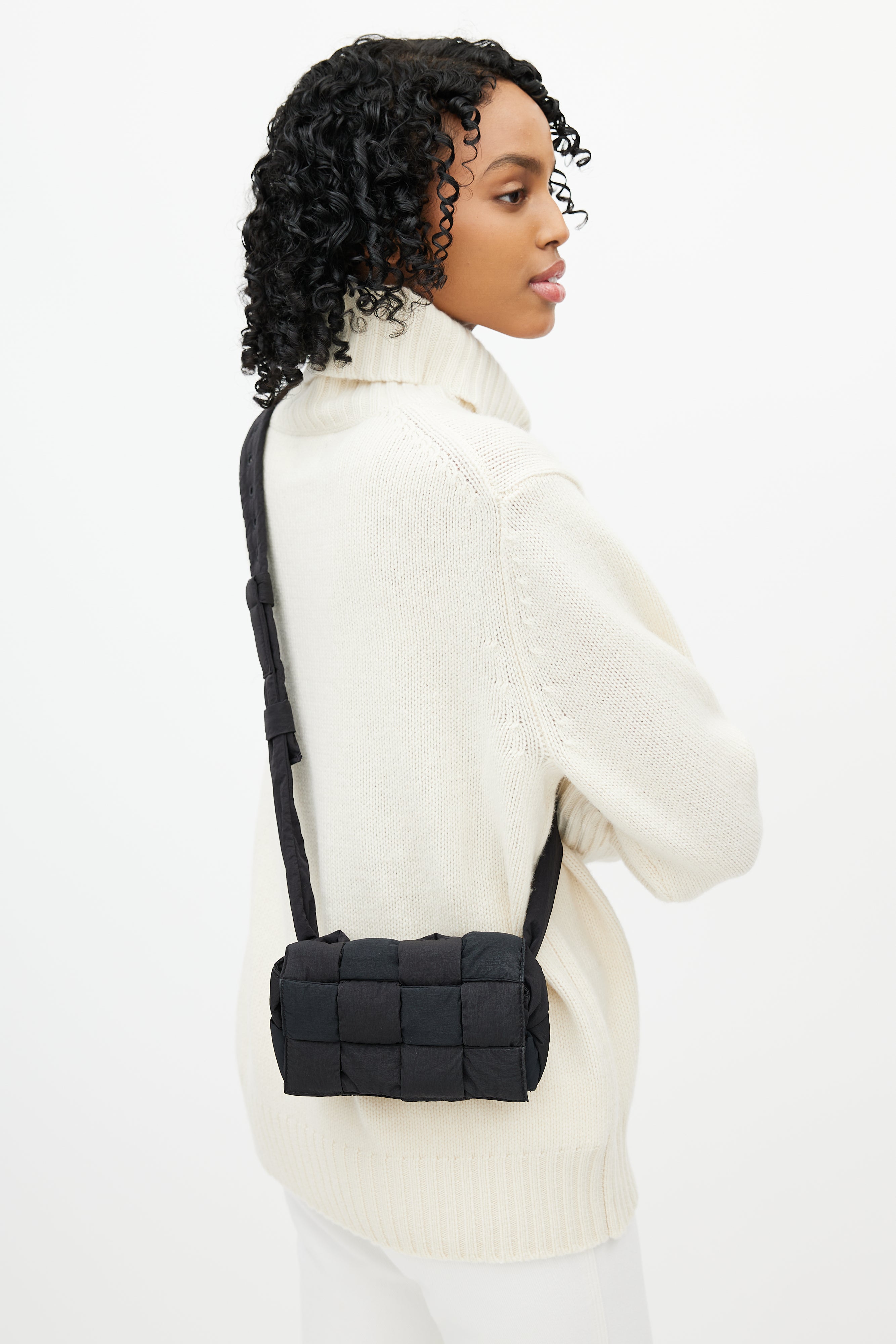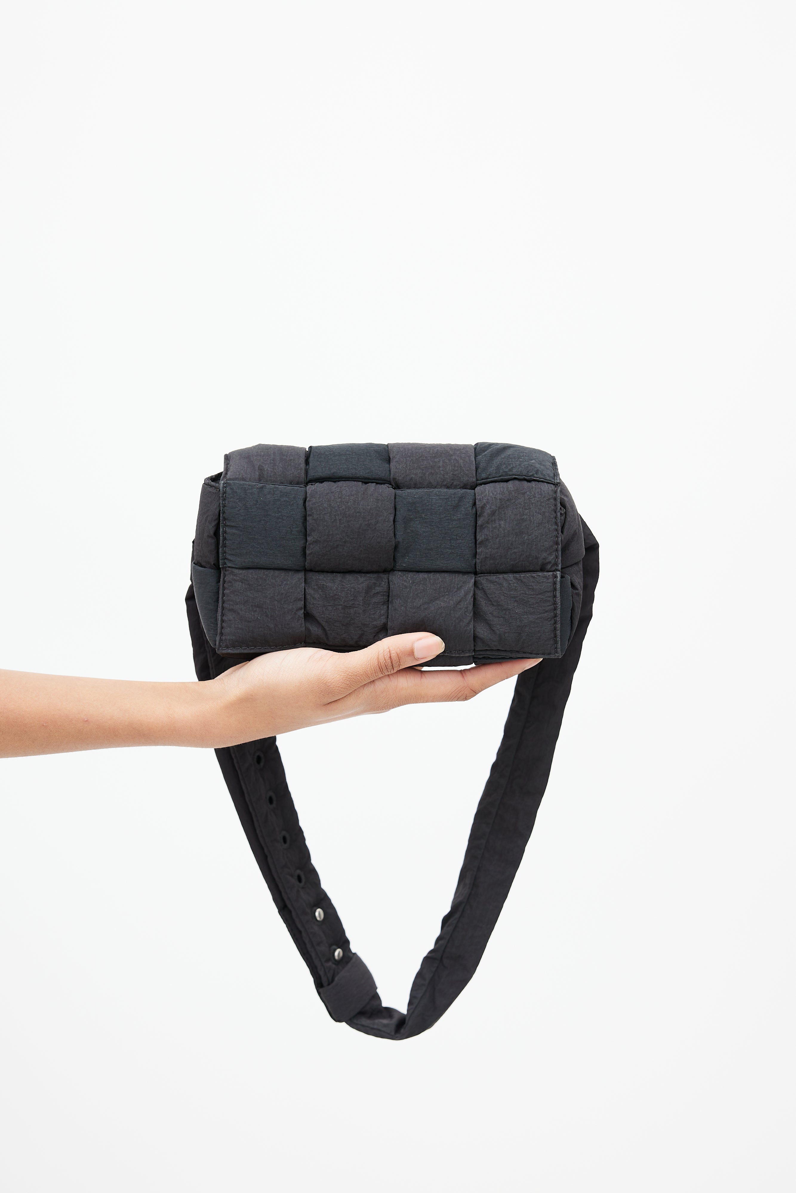 Pre-owned Bottega Veneta black Padded Cassette Belt bag featuring an Intrecciato weave throughout, top flap, one main compartment with two slip pockets, adjustable shoulder strap, and magnetic snap closure.