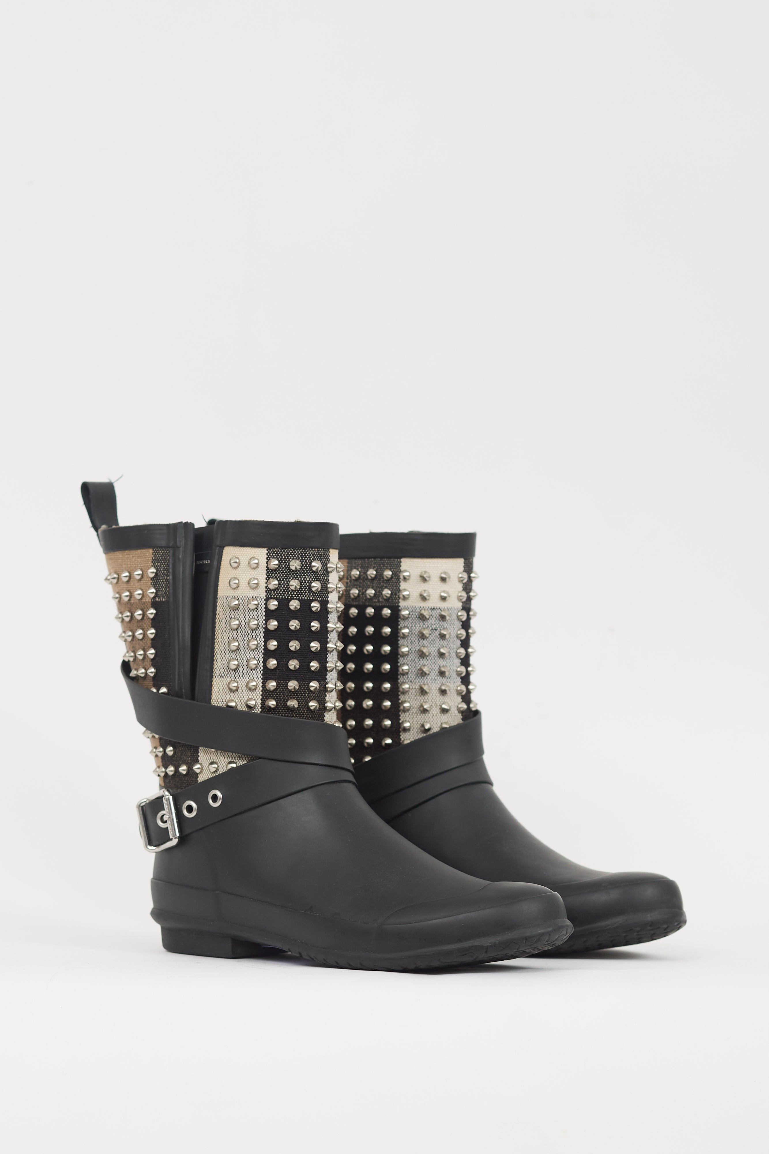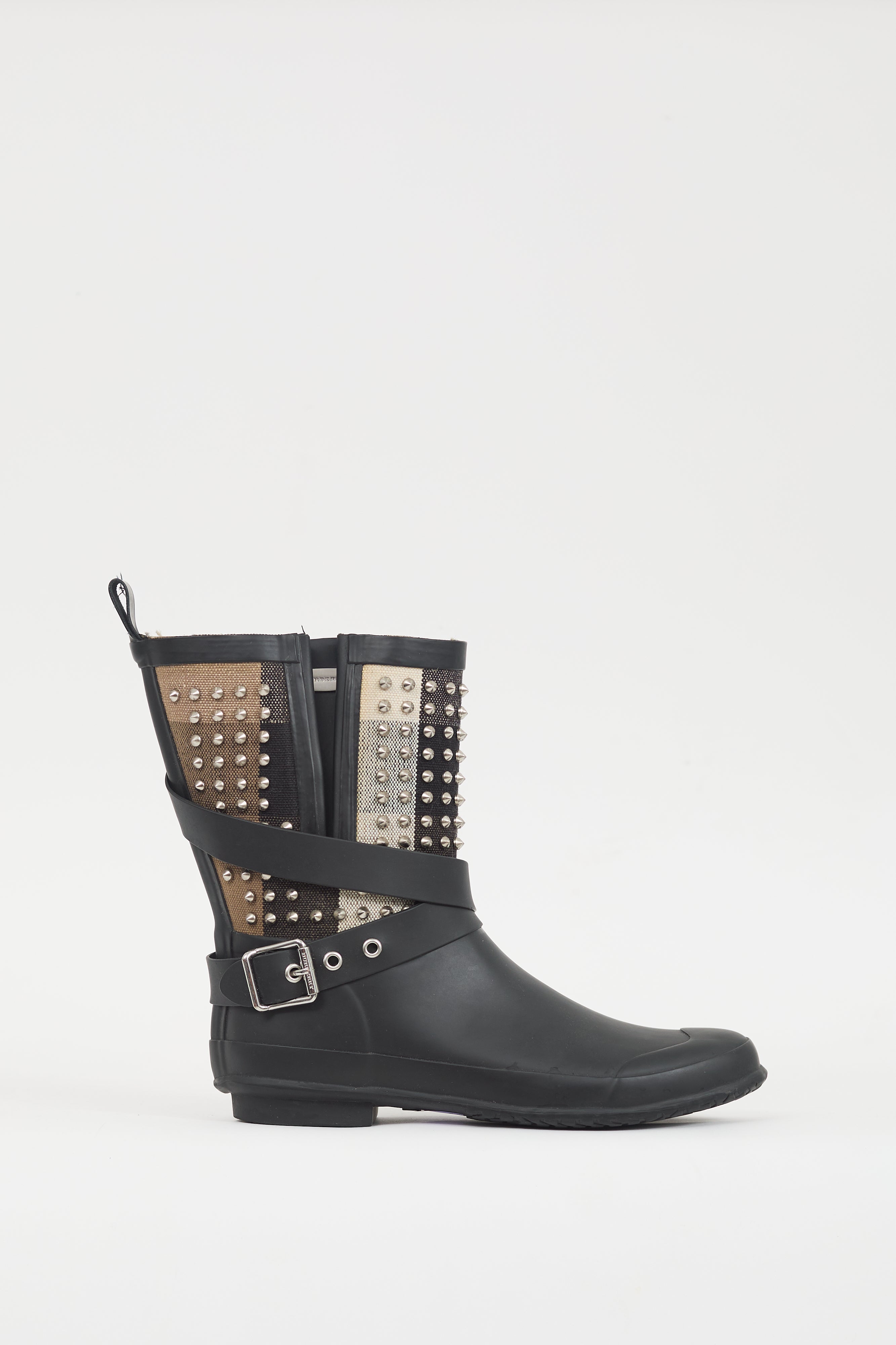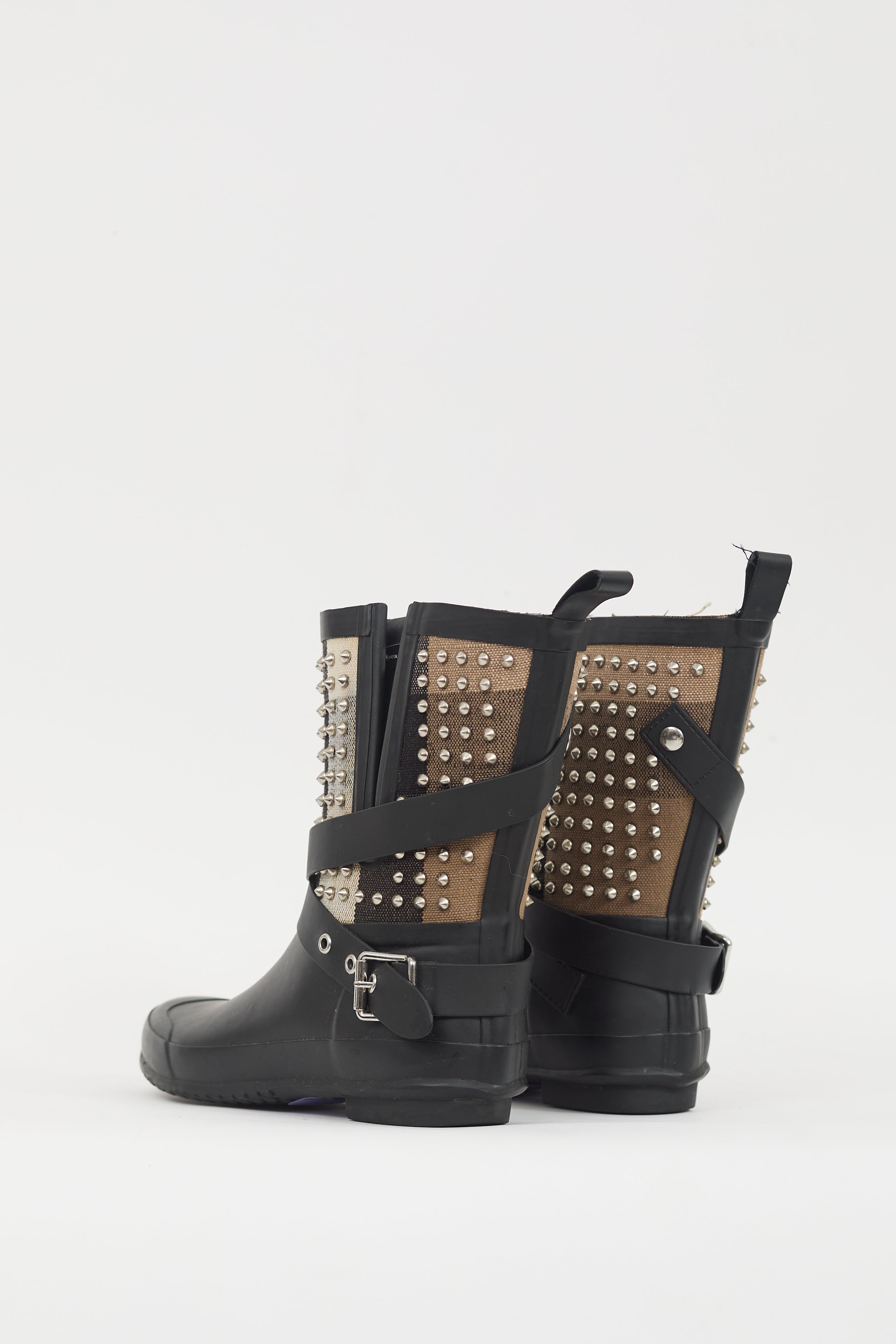 Pre-owned Burberry black rubber boots featuring a round toe, multicolour nova check at sides, silver tone studded hardware at shaft, and wrap strap at ankle with buckle closure. Comes with original dust bag.