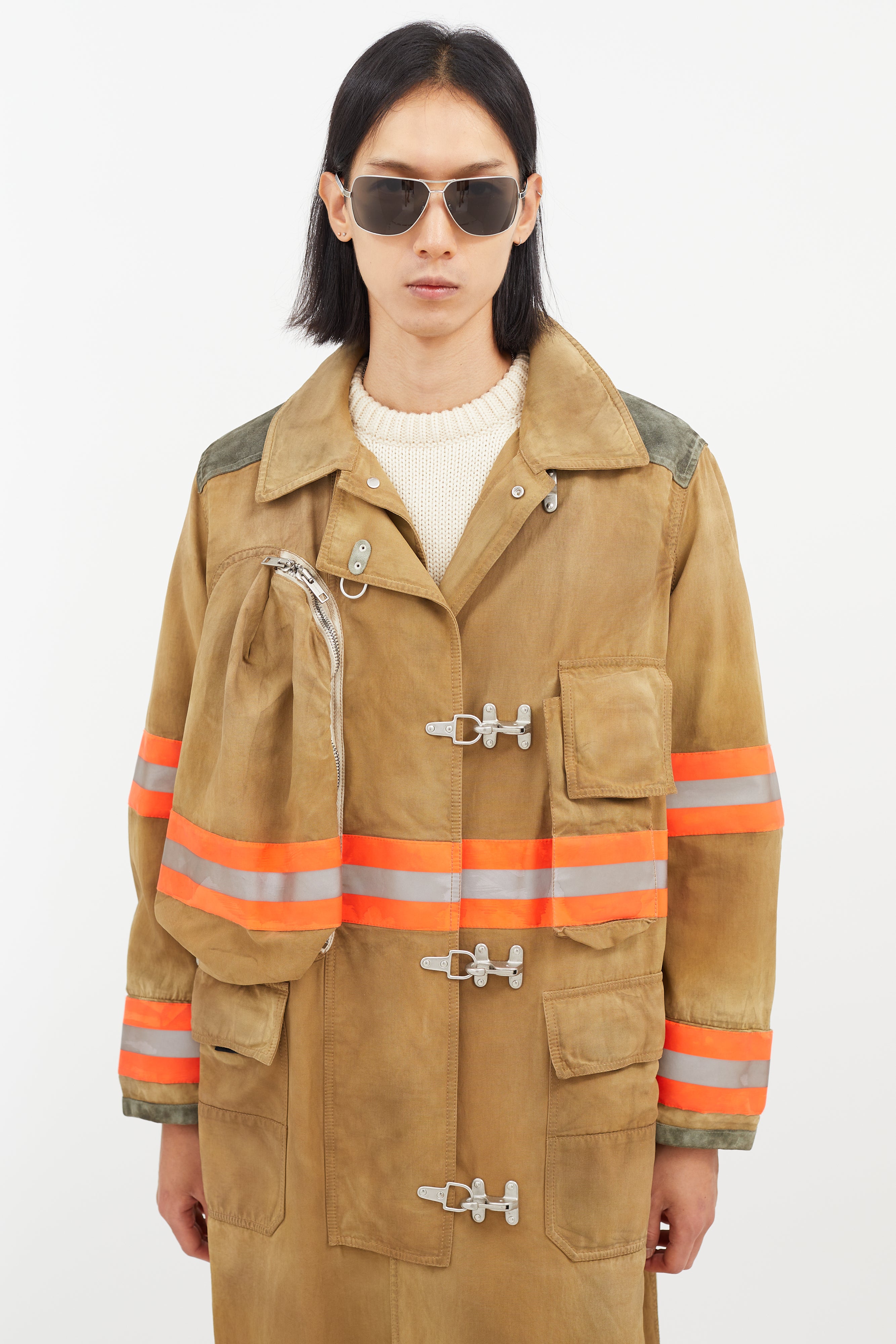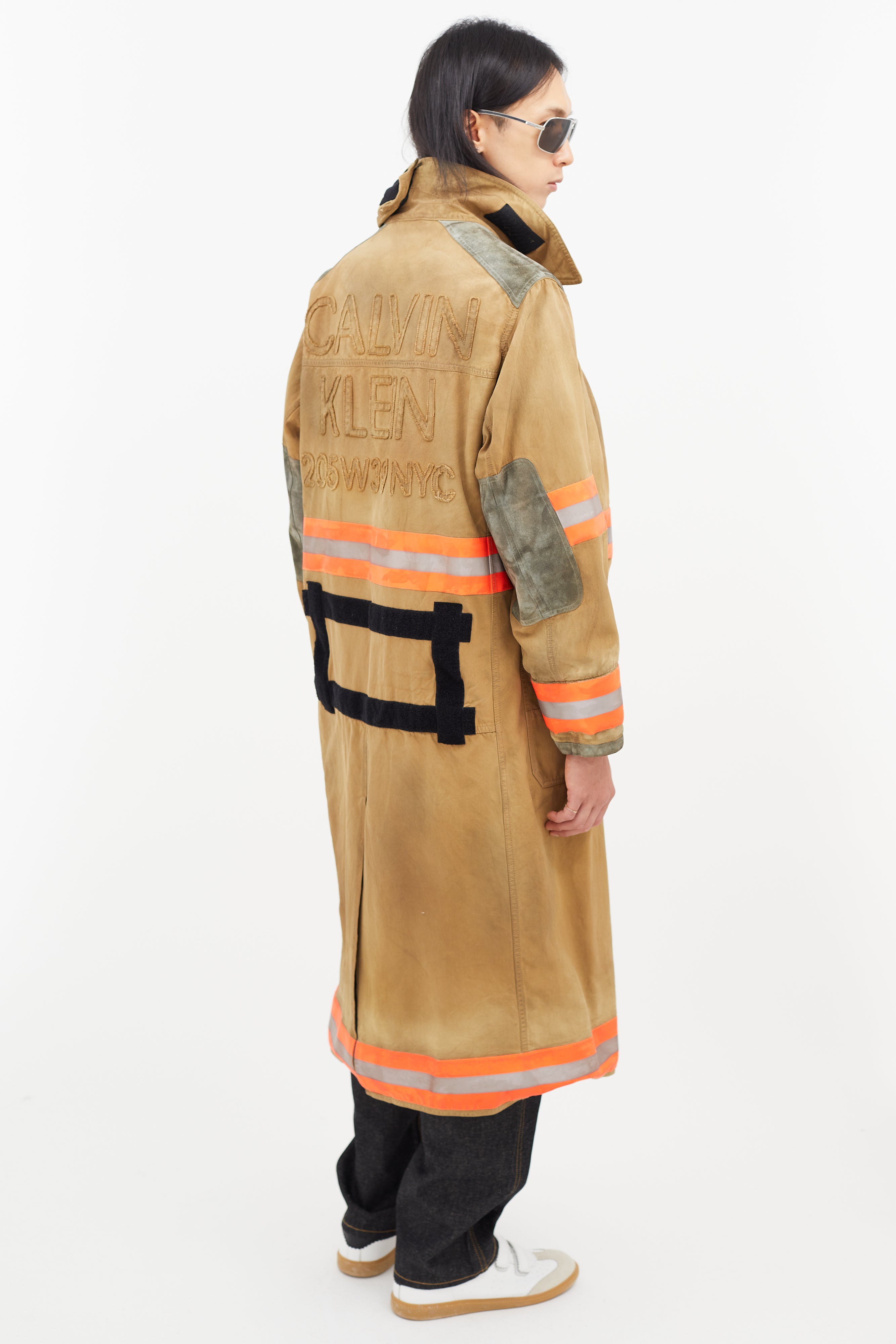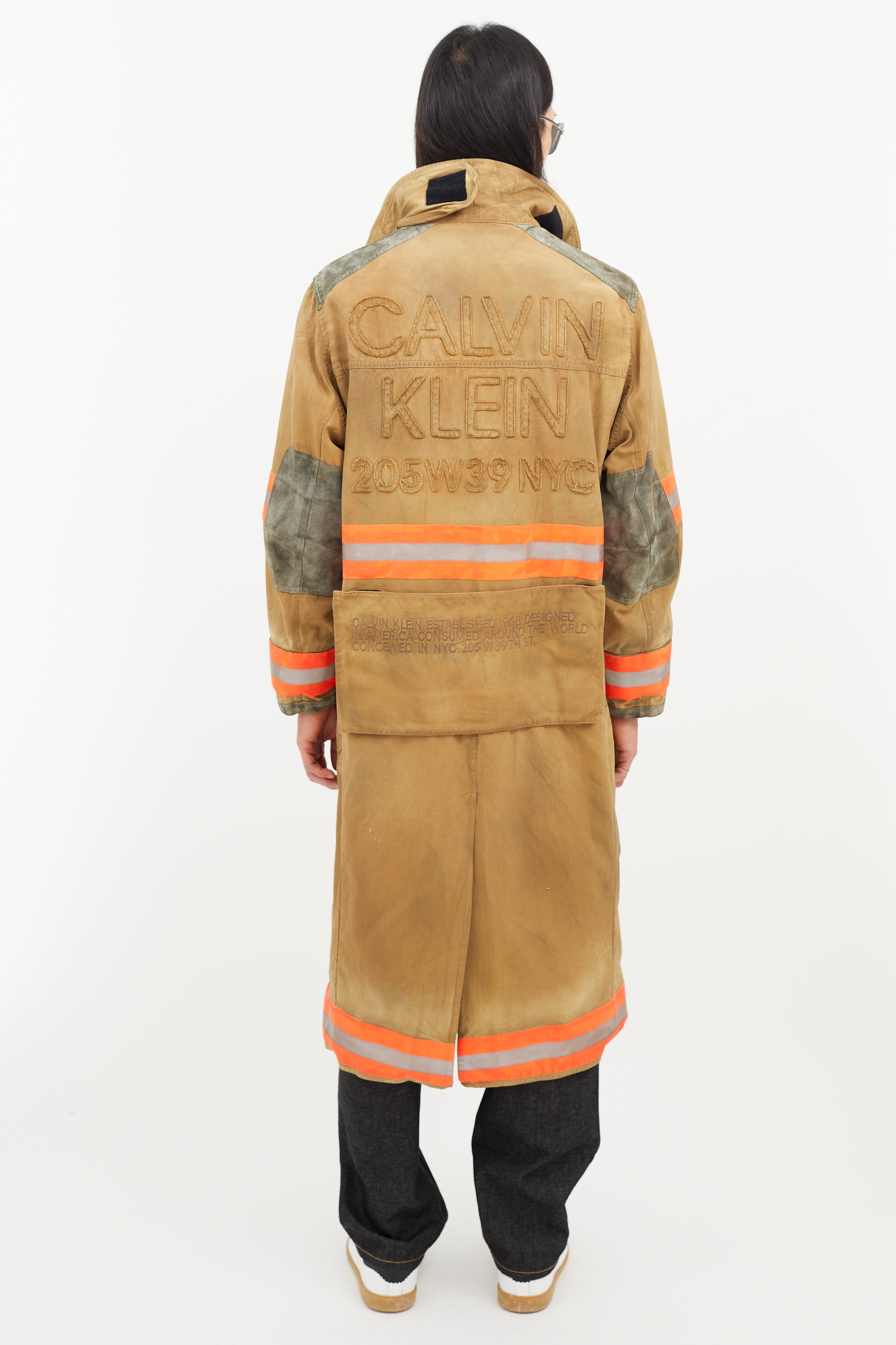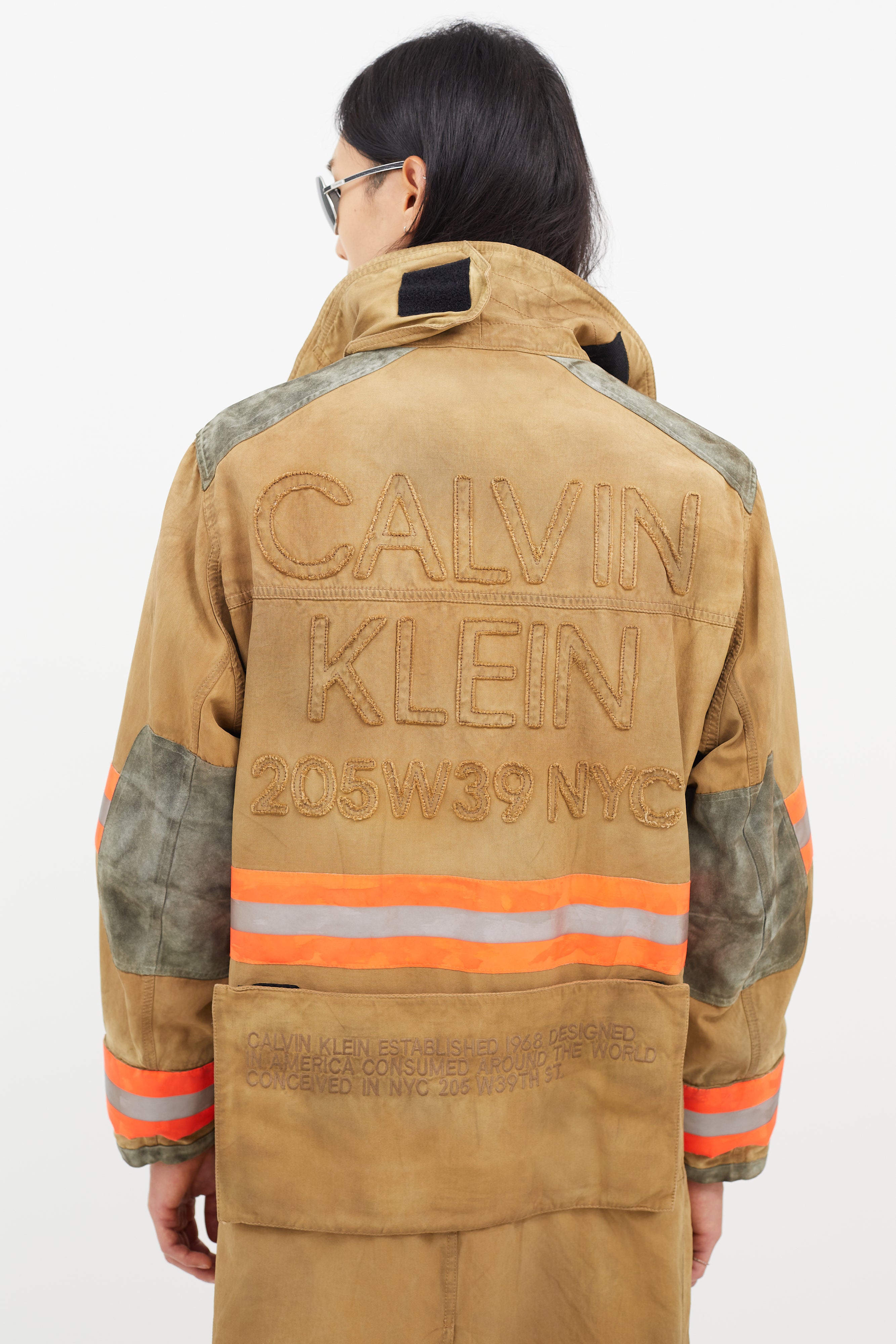 Pre-owned Calvin Klein 205W39NYC beige Firefighter jacket featuring a pointed collar, two cargo pockets at chest, two flap pockets at hip, suede patches at elbow and shoulder, multicolour reflective striping throughout, tonal embroidered logo at back, and zip at front with clasp closure.
