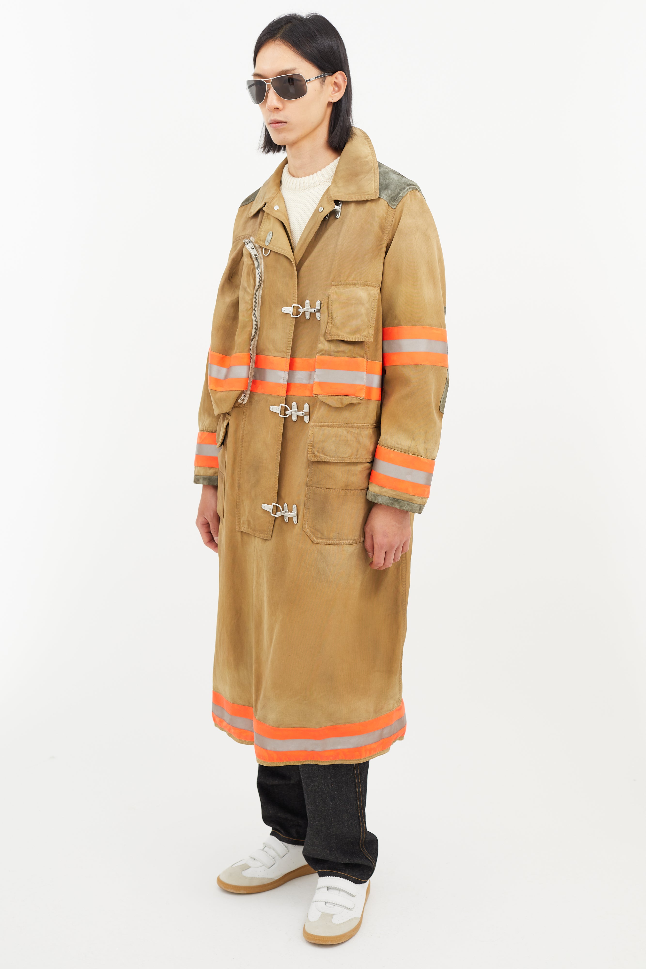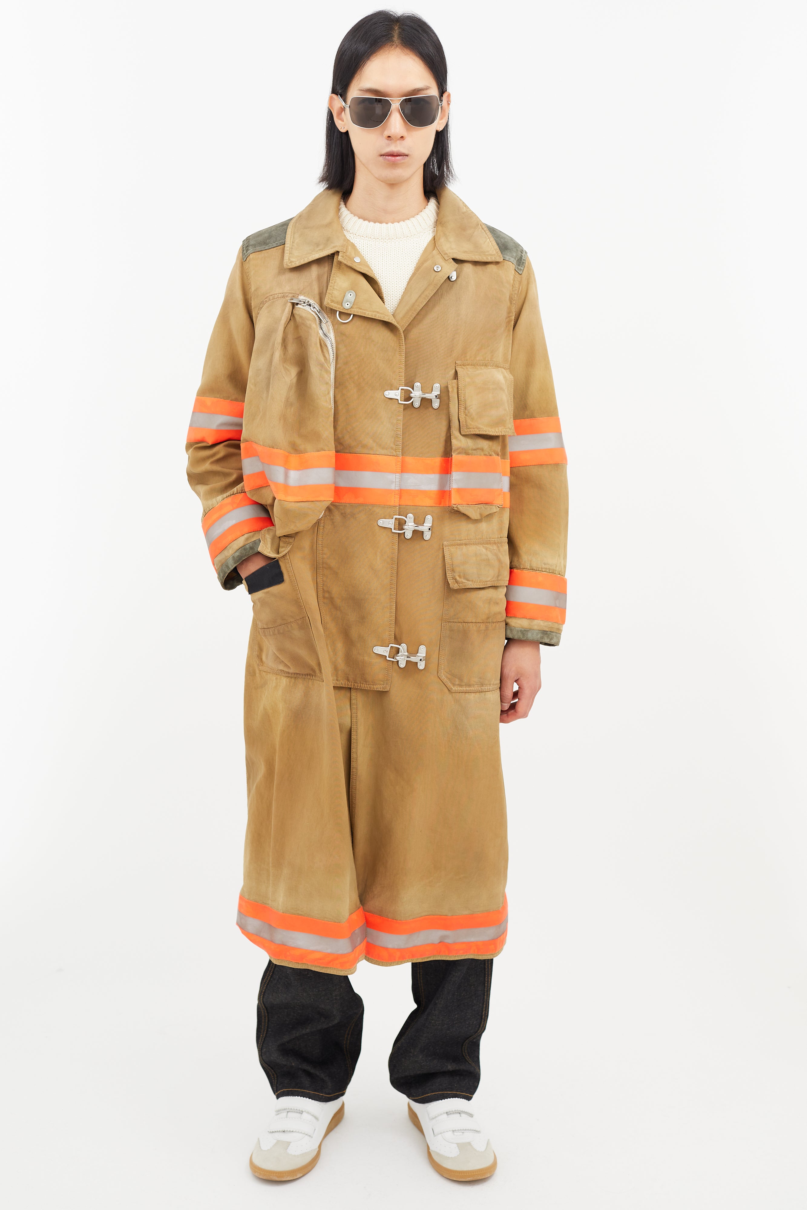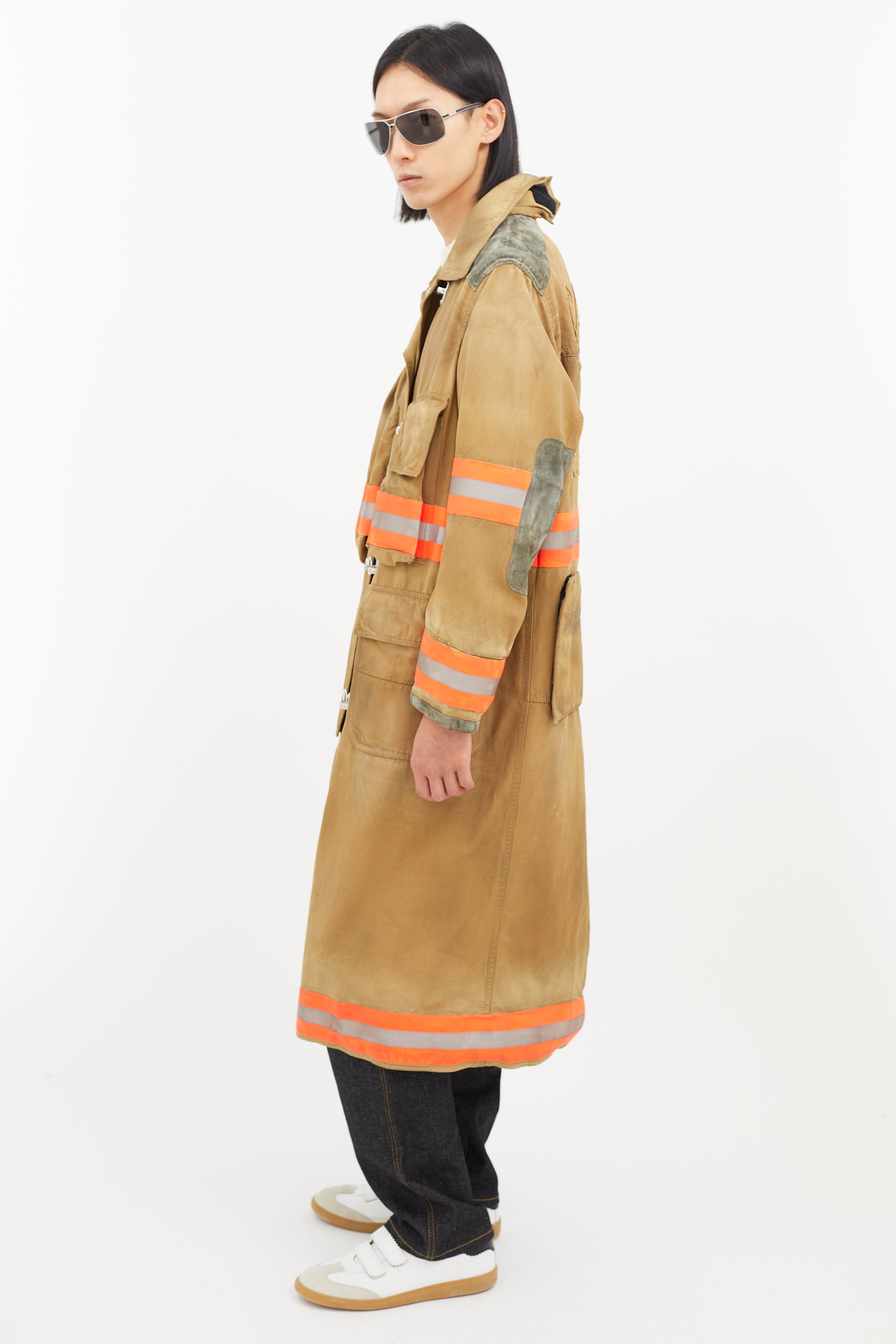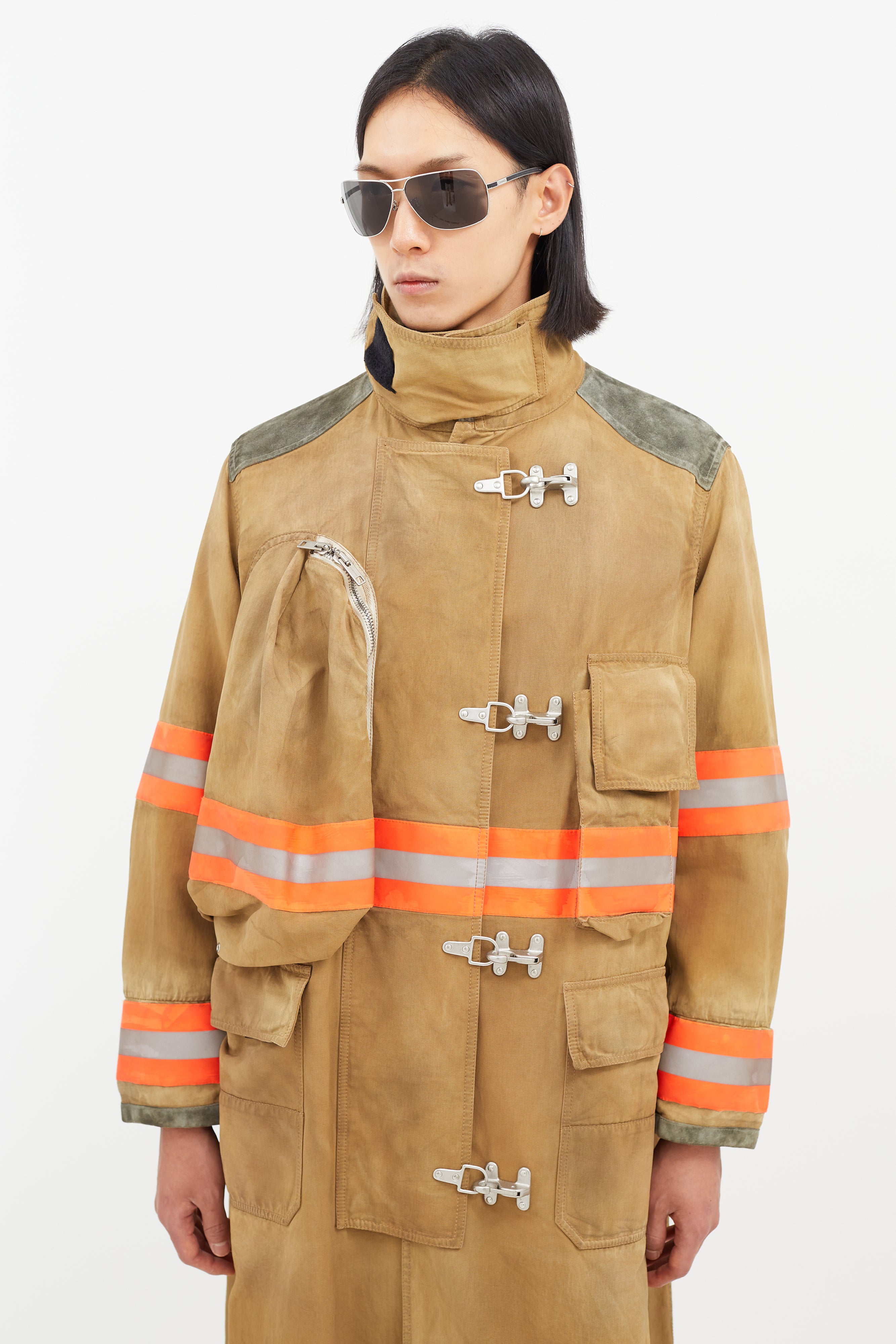 Pre-owned Calvin Klein 205W39NYC beige Firefighter jacket featuring a pointed collar, two cargo pockets at chest, two flap pockets at hip, suede patches at elbow and shoulder, multicolour reflective striping throughout, tonal embroidered logo at back, and zip at front with clasp closure.