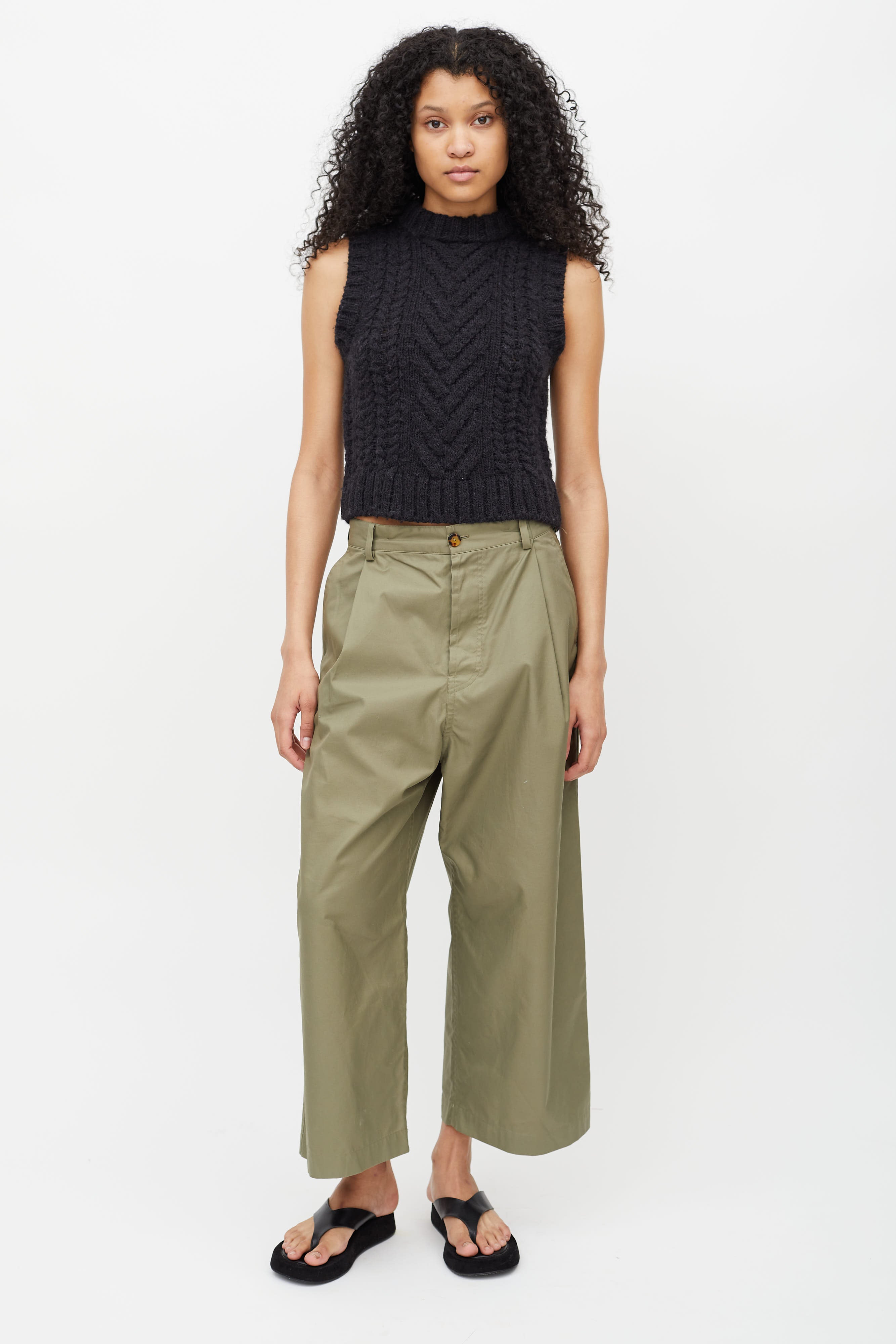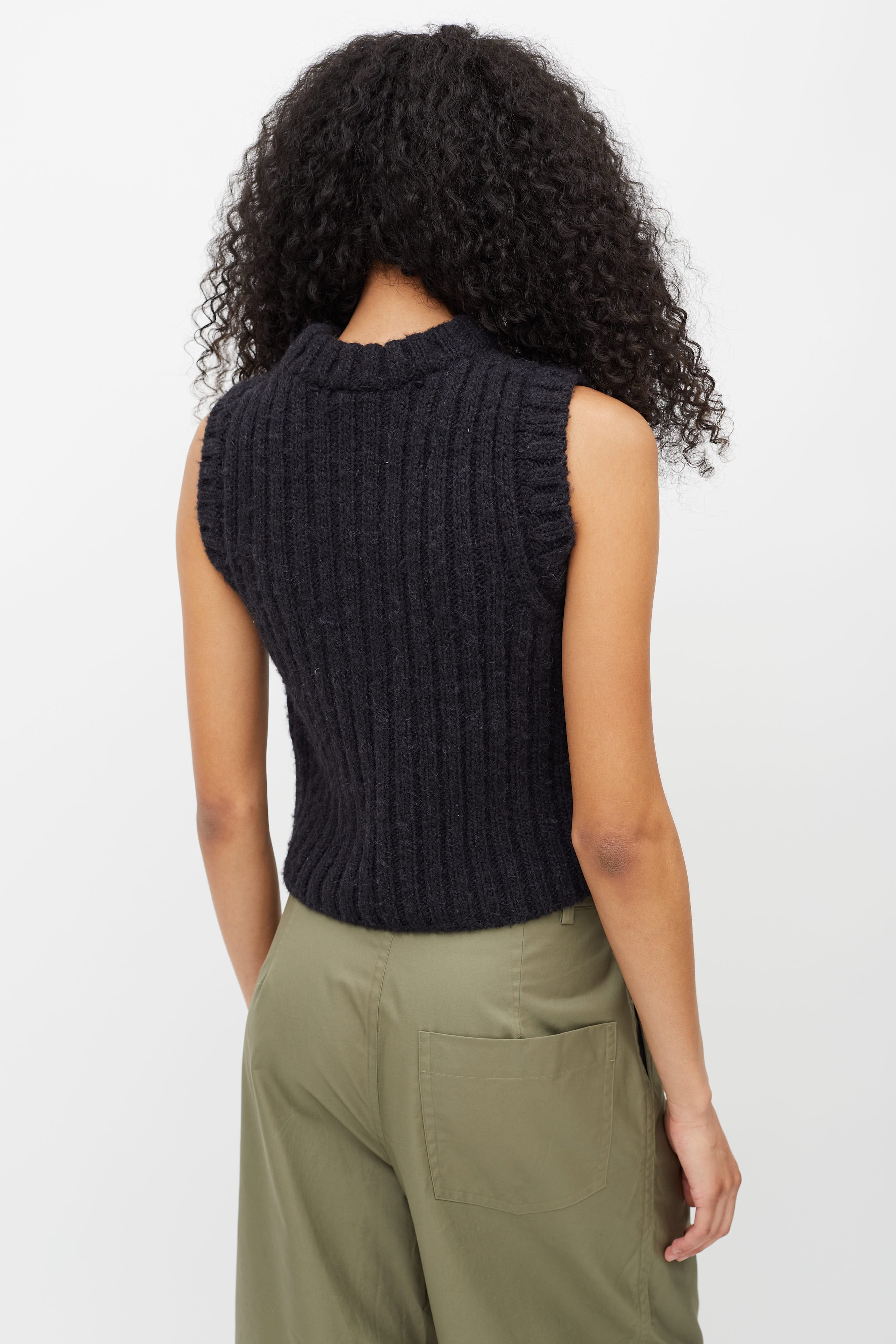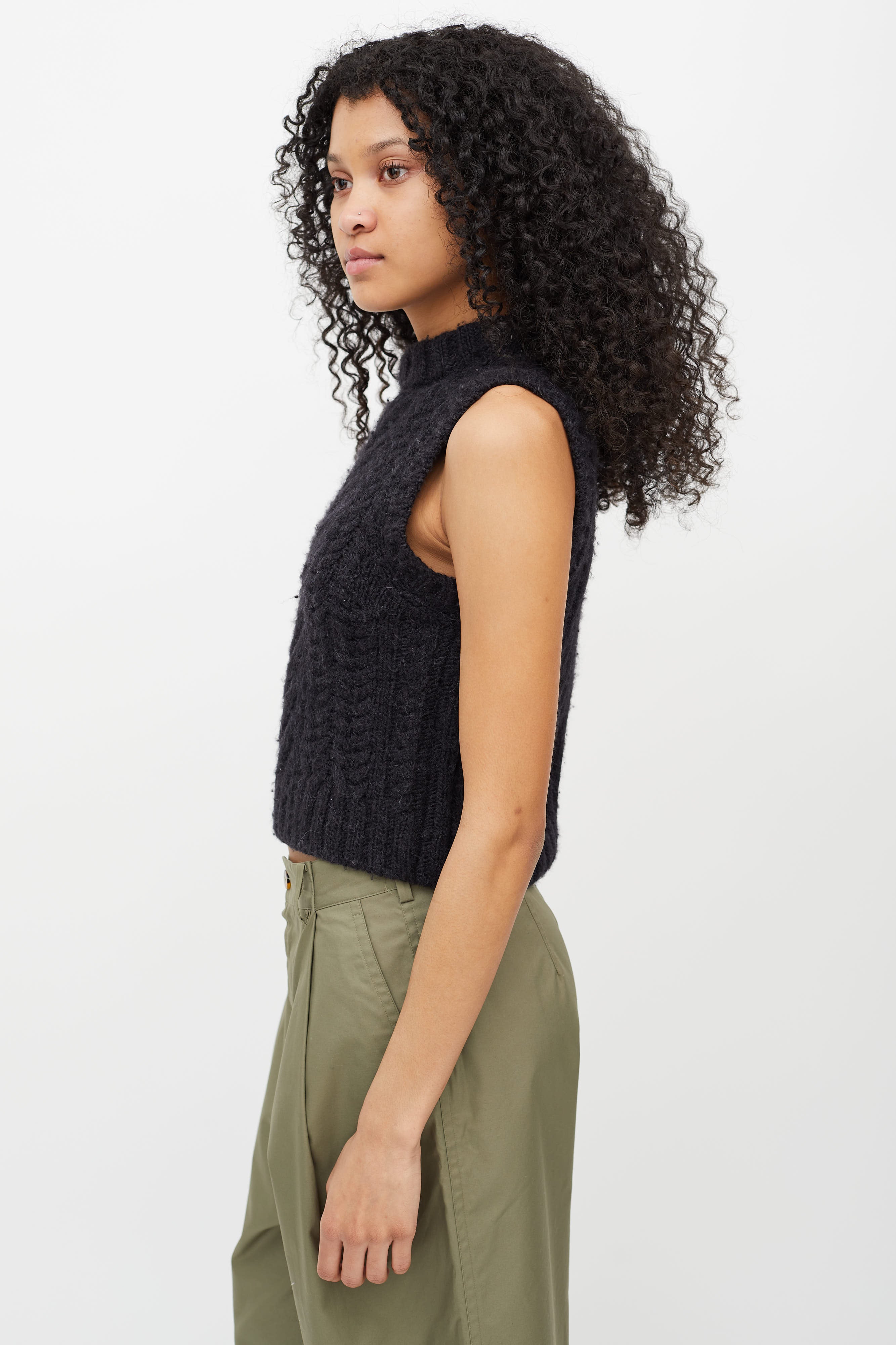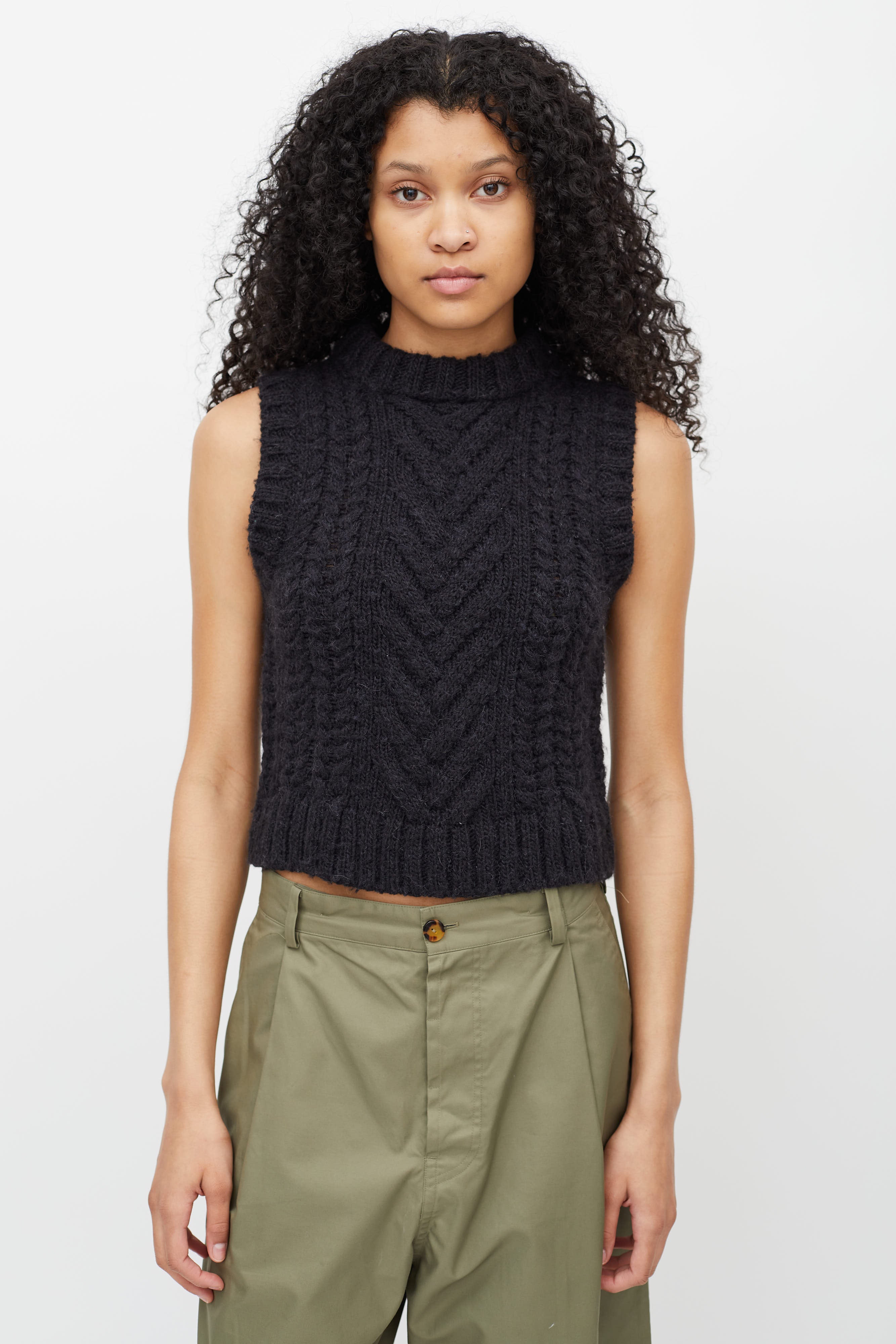 Pre-owned Cecilie Bahnsen black sleeveless wool knit sweater featuring a crew neckline, cable knit pattern throughout, and ribbed knit neckline, cuffs and hem.