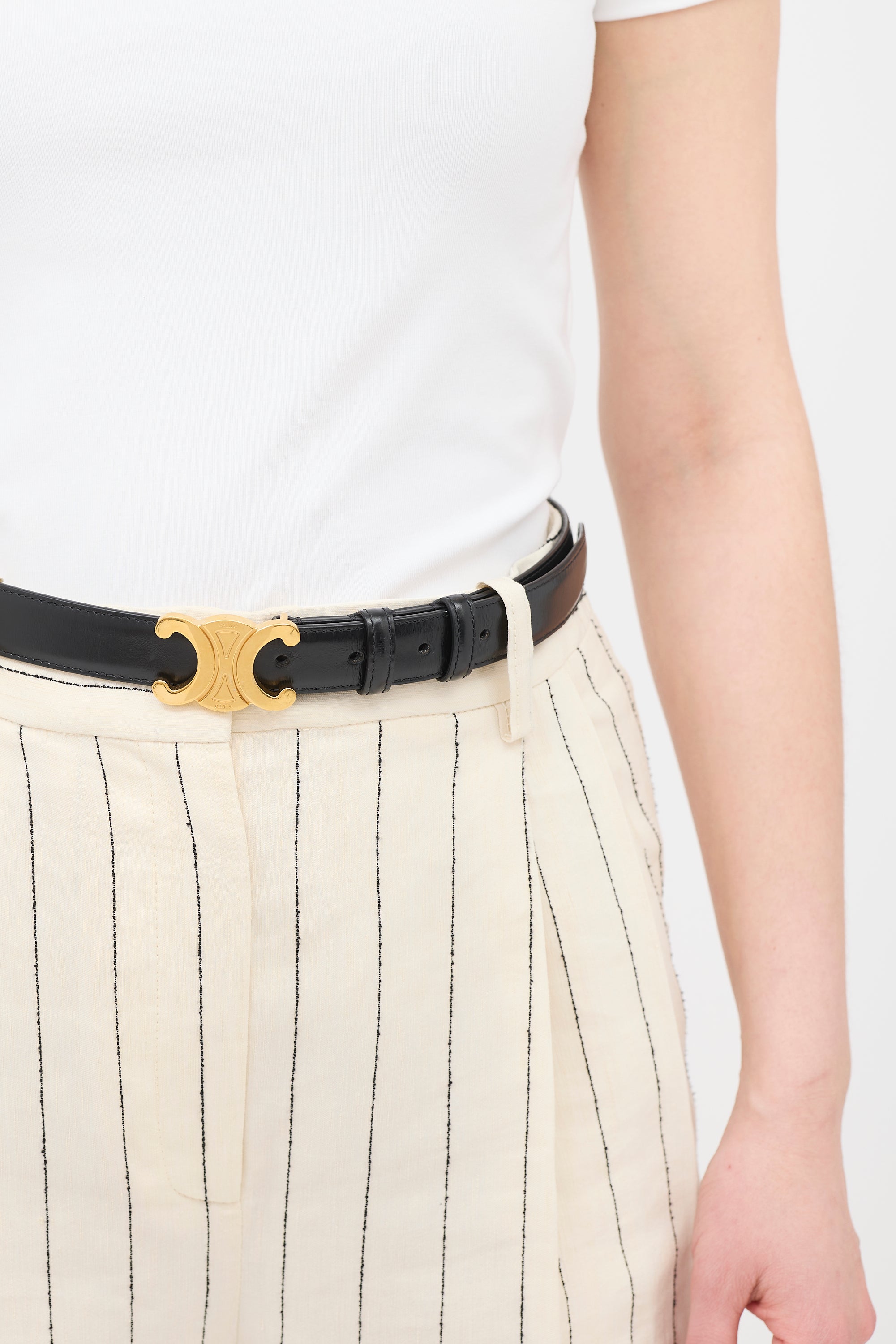 Pre-owned Celine 2022 black leather medium Triomphe belt featuring gold tone signature Triomphe buckle, push pin closure, and stamped logo at reverse. Comes with original dust bag.