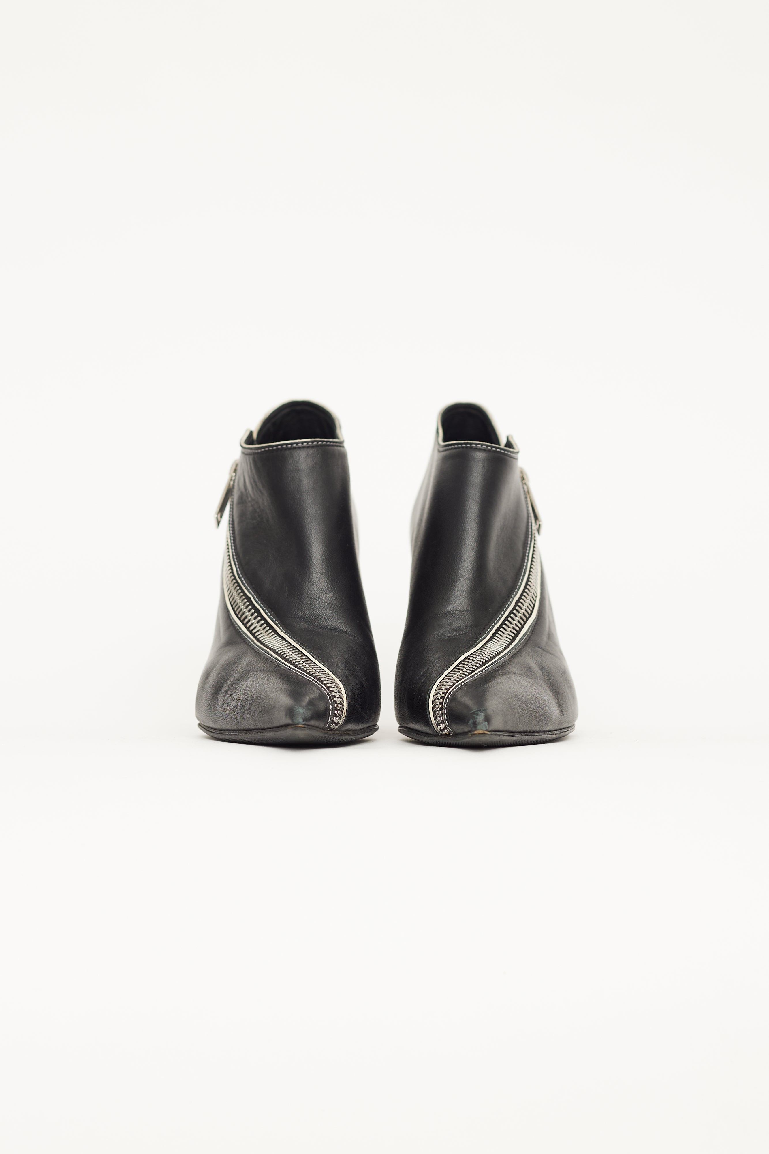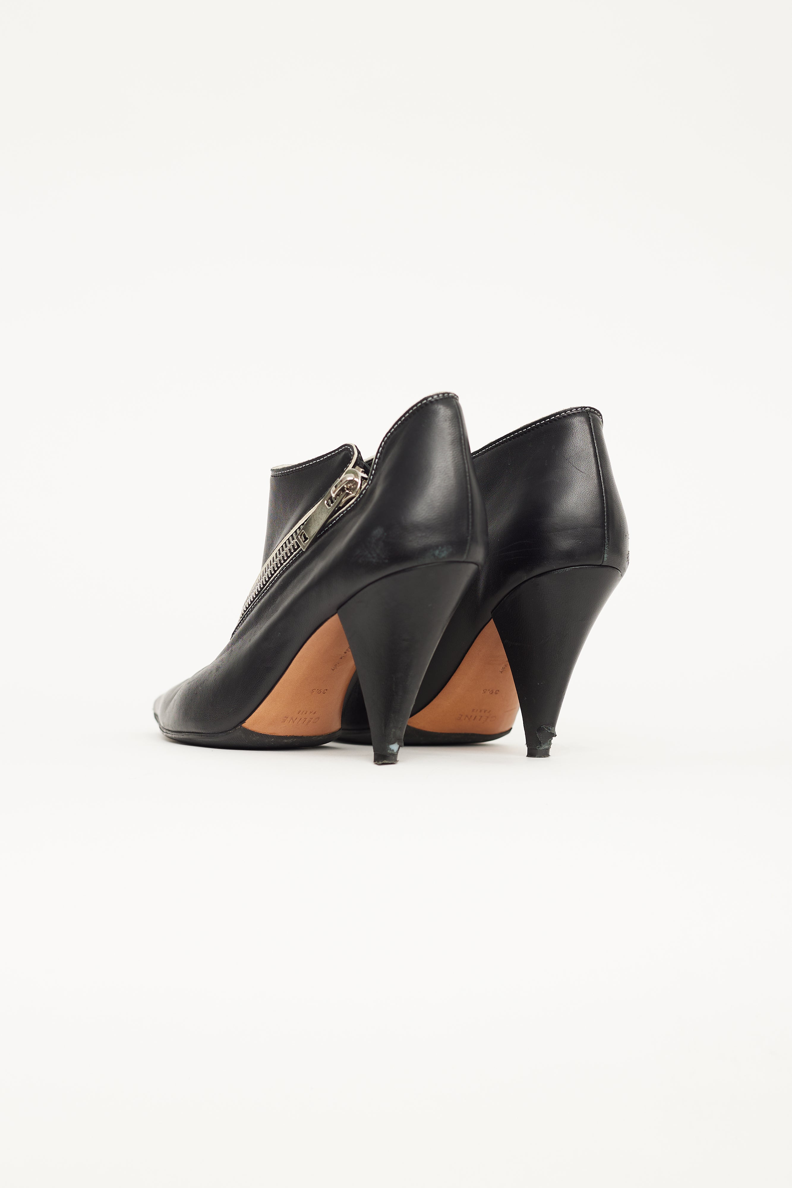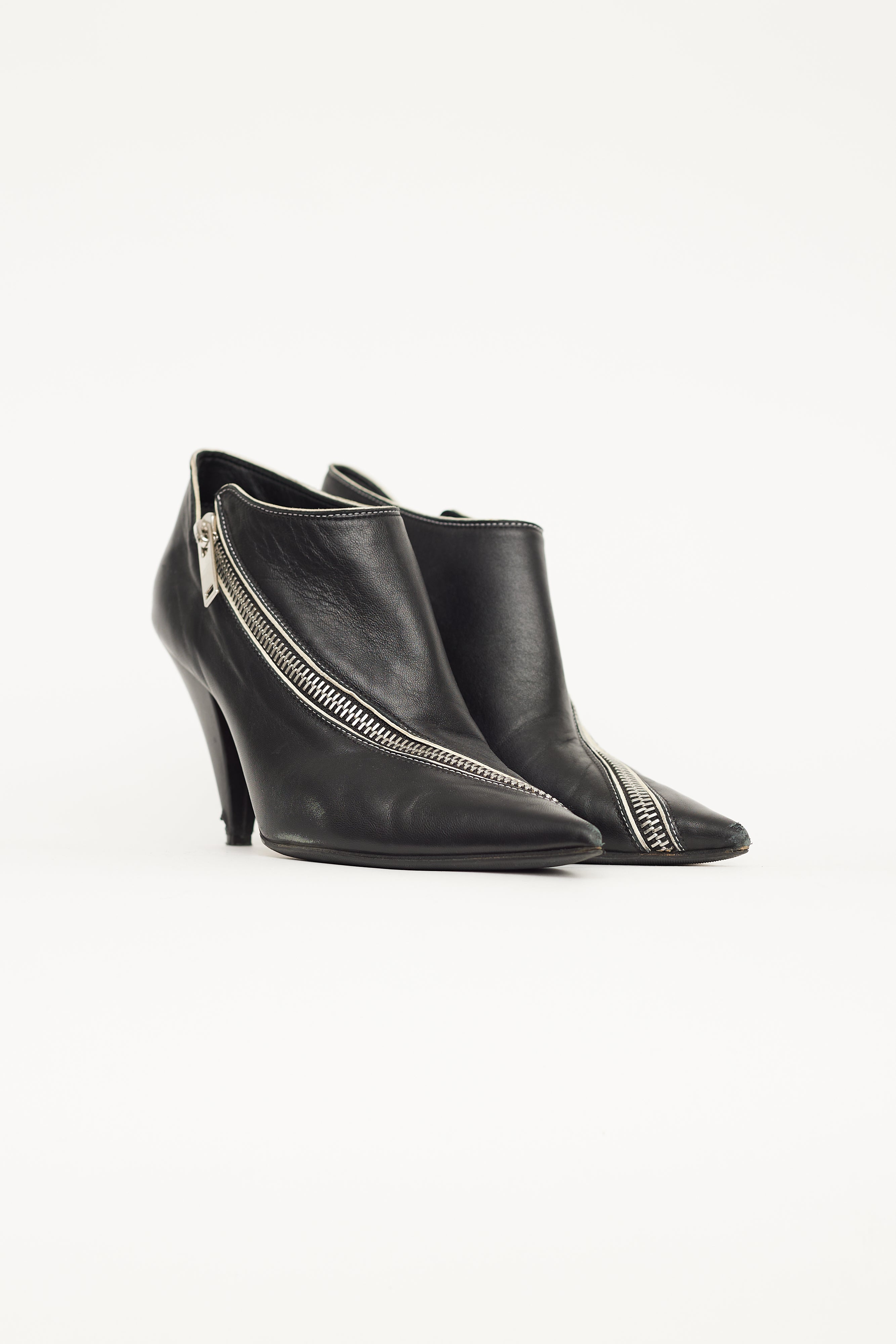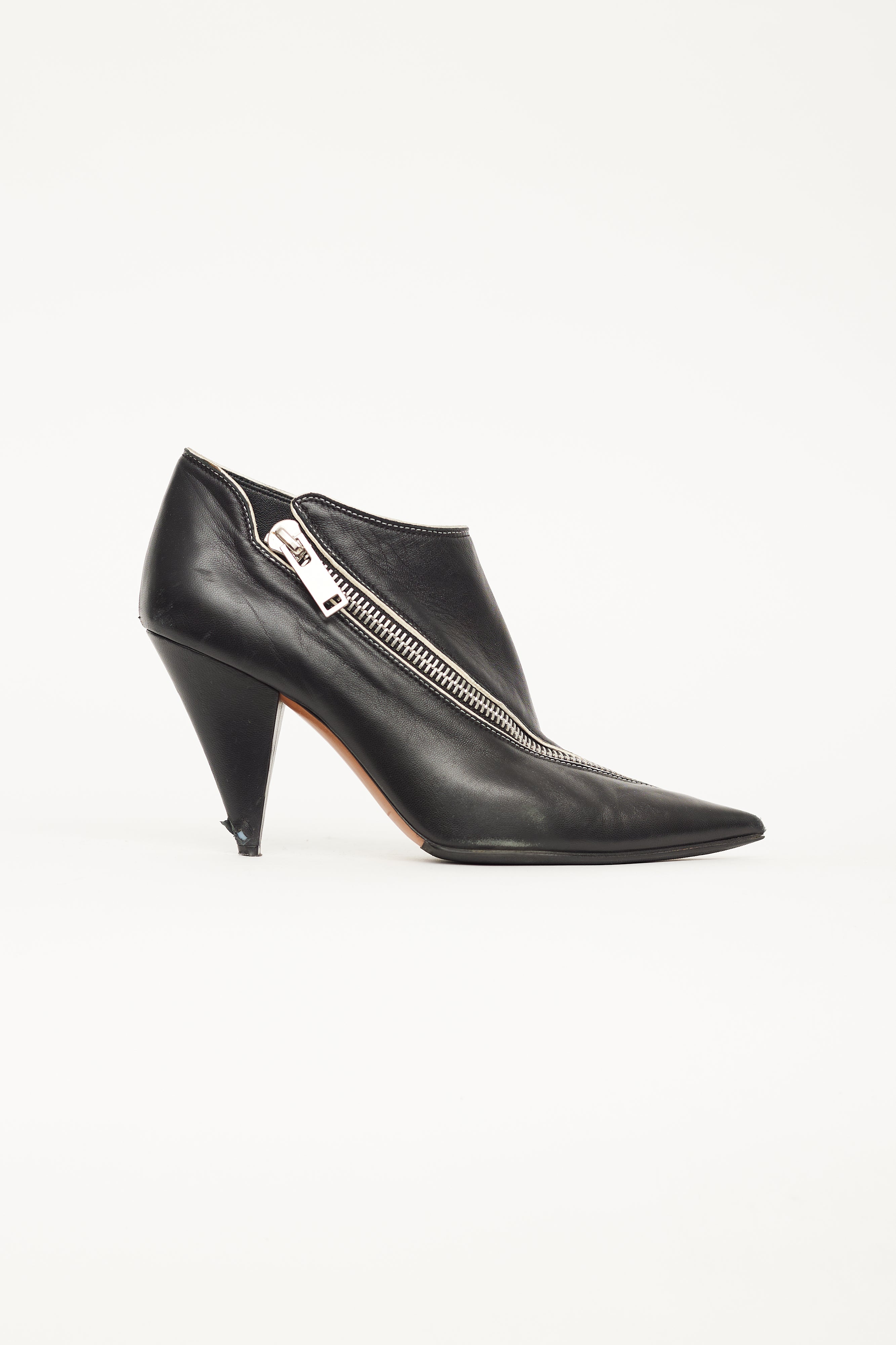 Pre-owned Celine black leather asymmetric zip ankle boot featuring a pointed toe, silver tone zip across toe and vamp, low cut ankle shaft, covered cone heel and leather insole. Phoebe Philo era design.