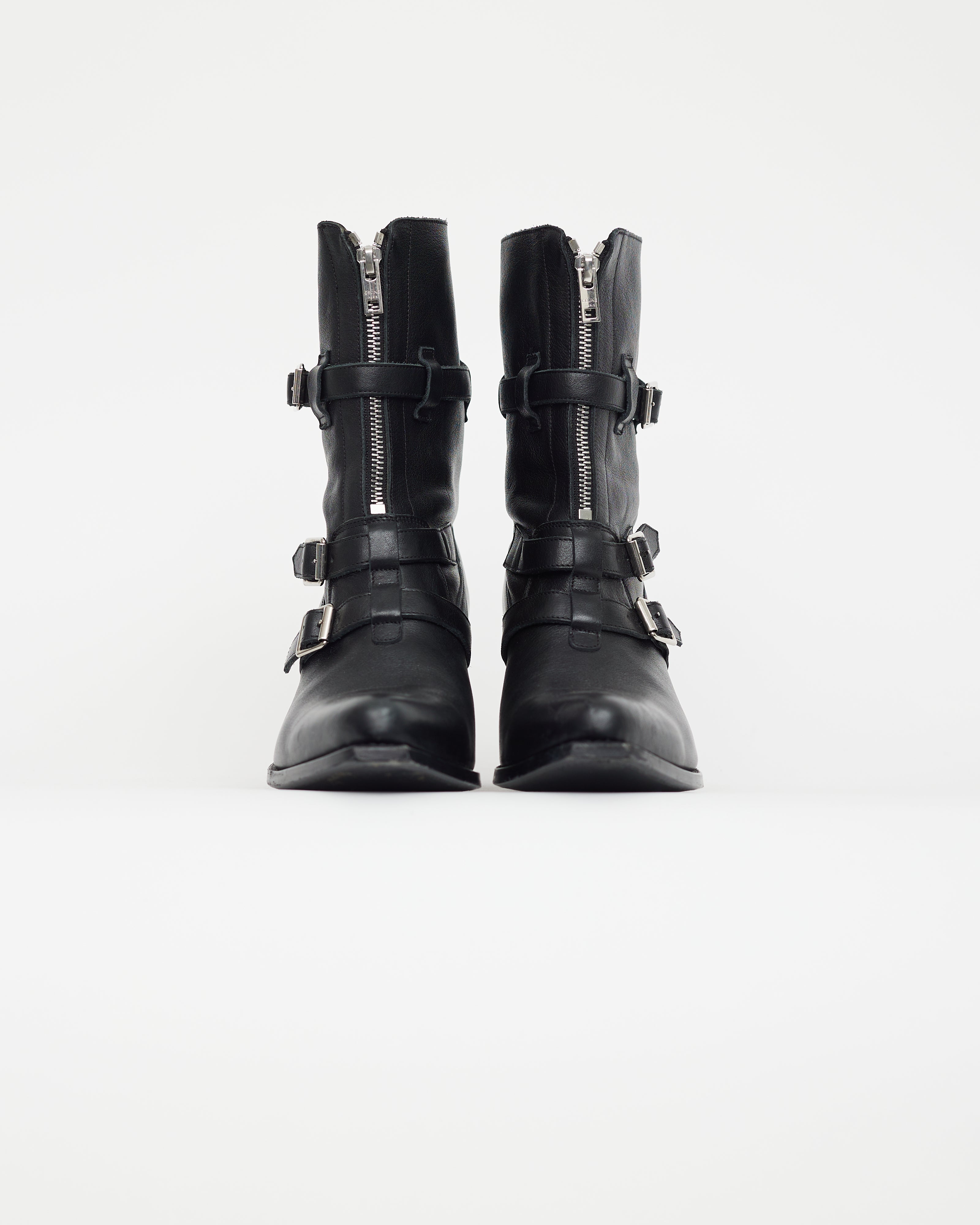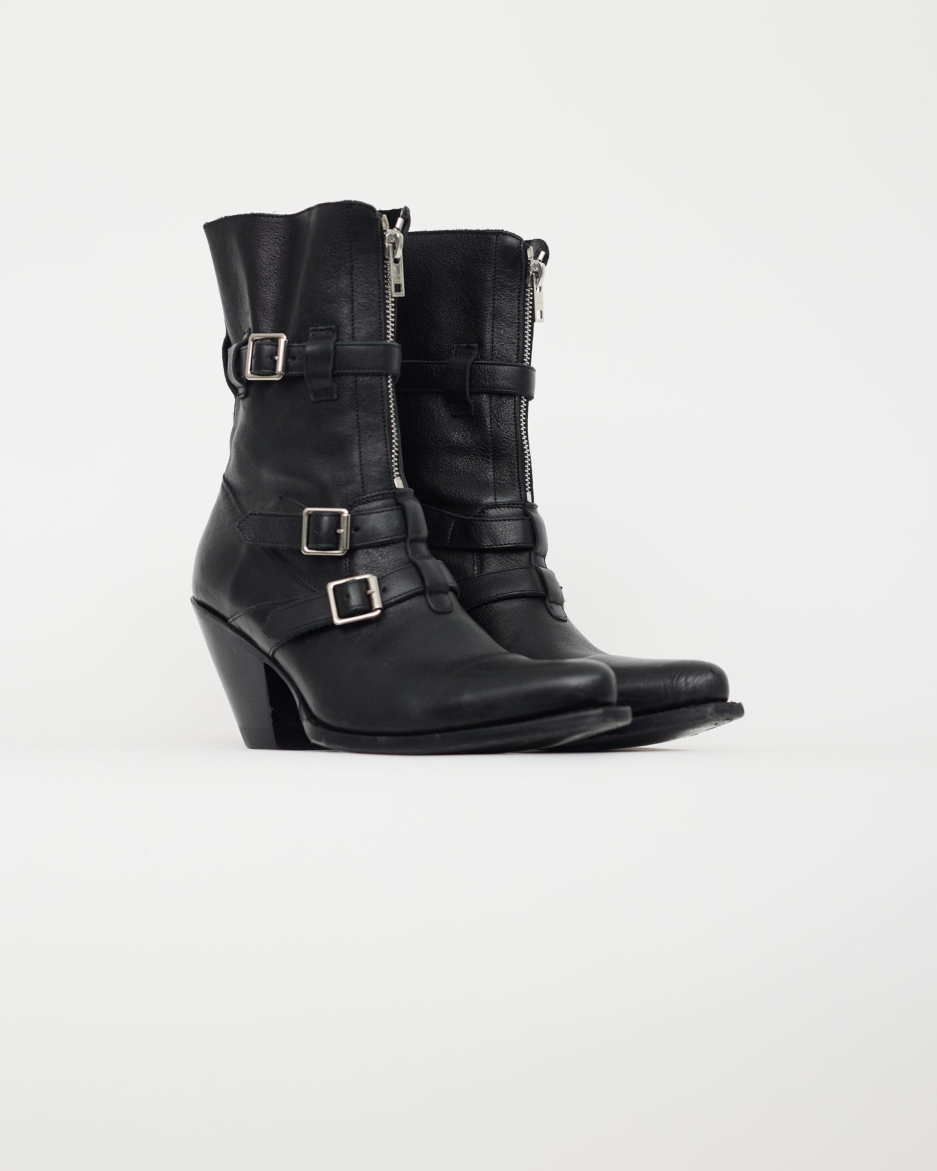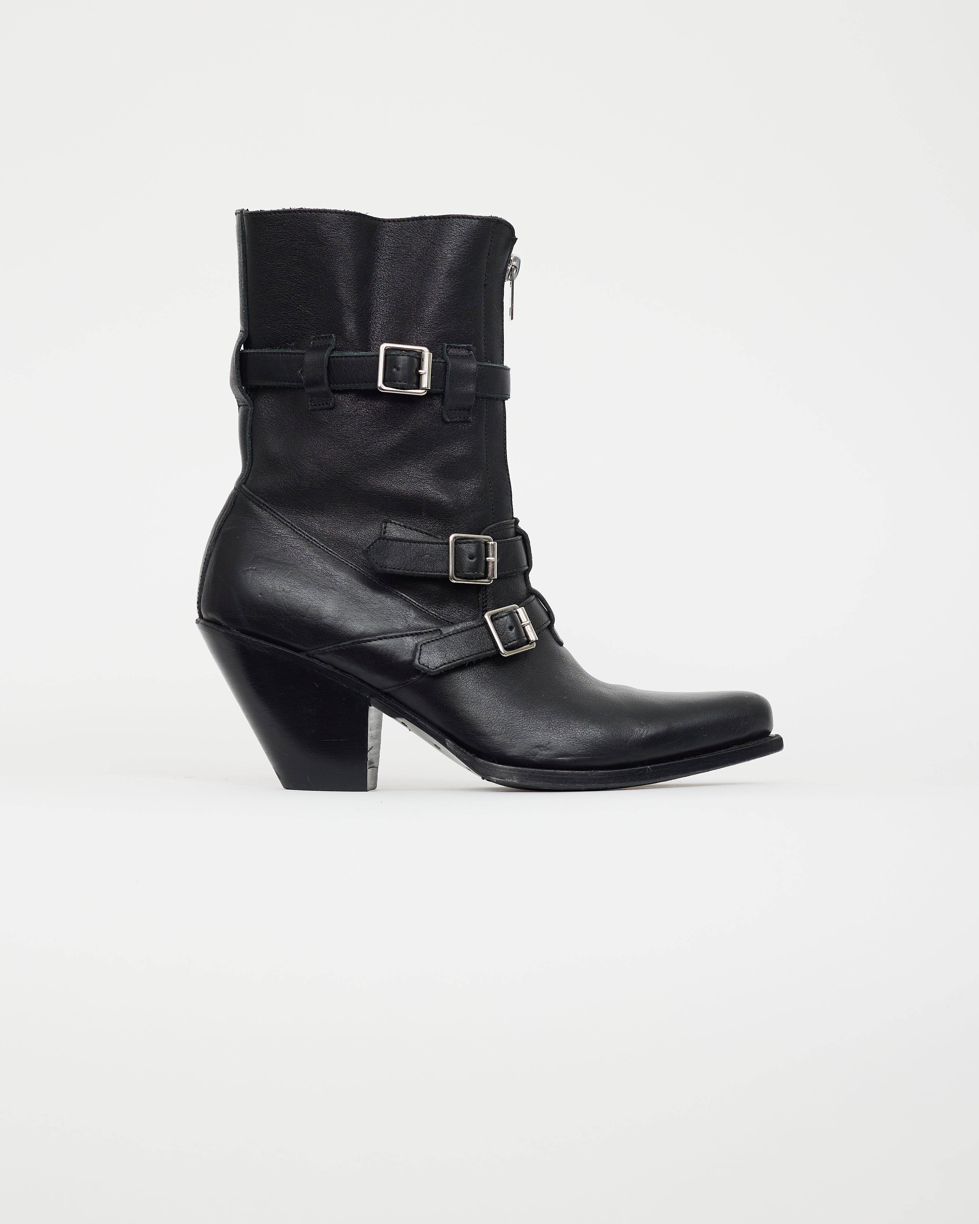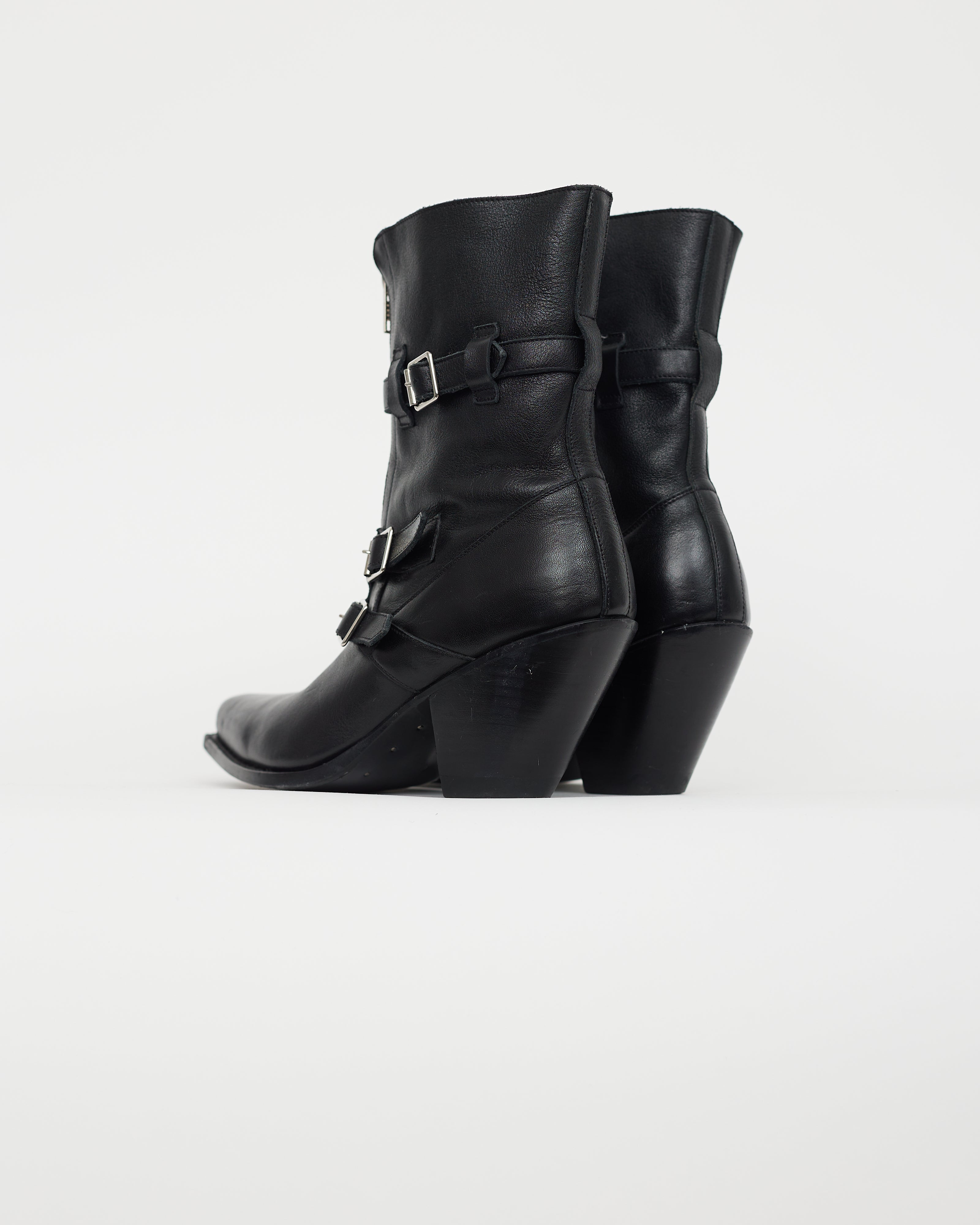 Pre-owned Celine black leather ankle boots featuring three leather straps across shaft with silver tone buckles, silver tone zip closure at front, pointed square toe, western style block heel, and leather insole.