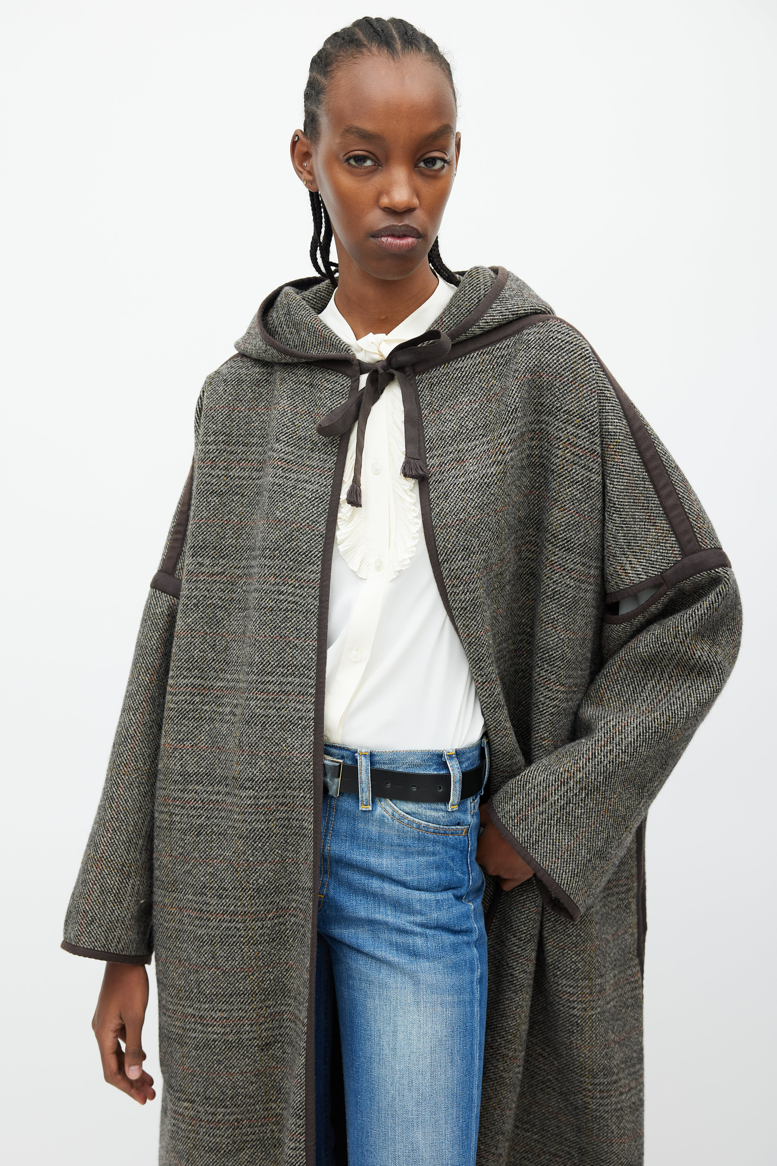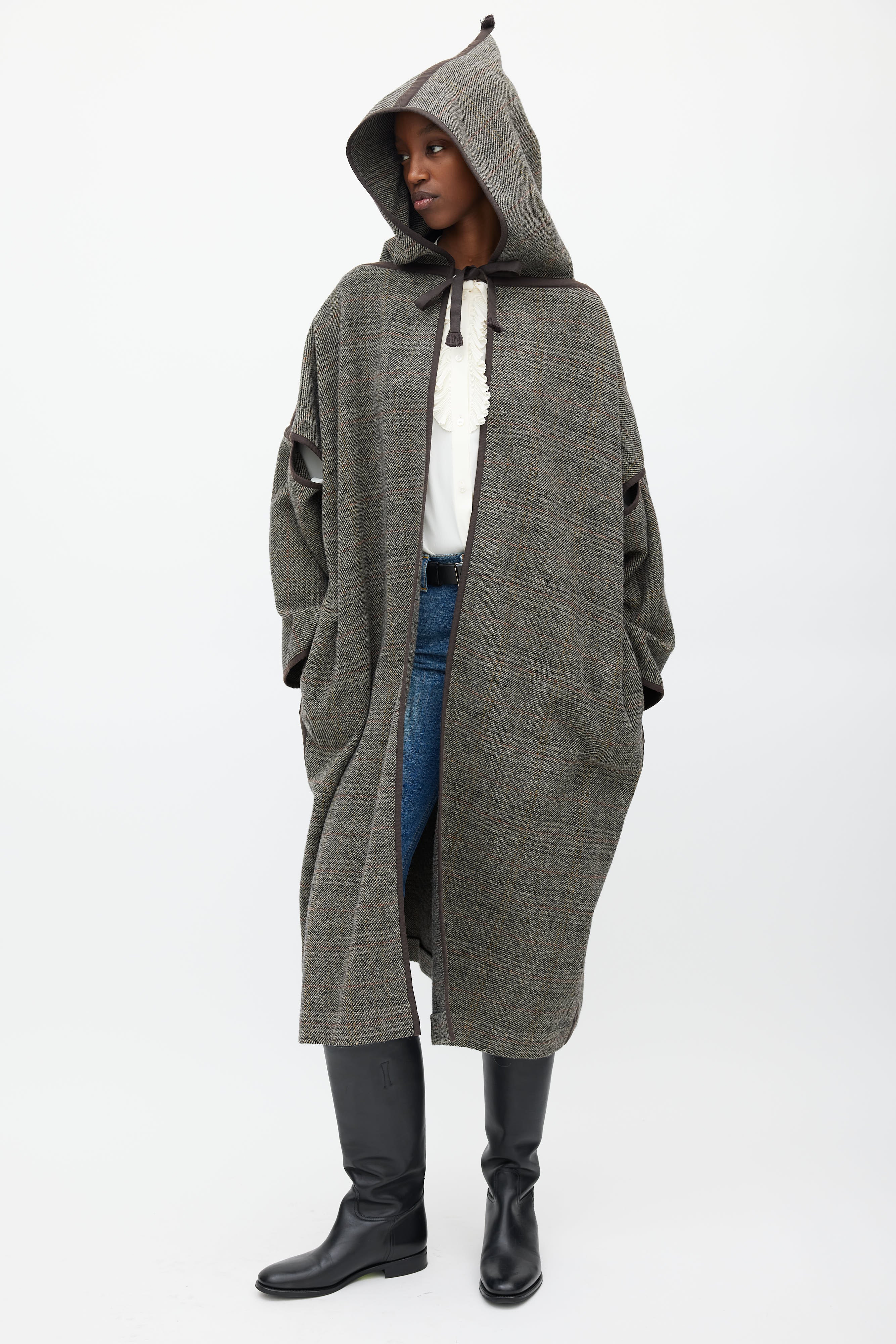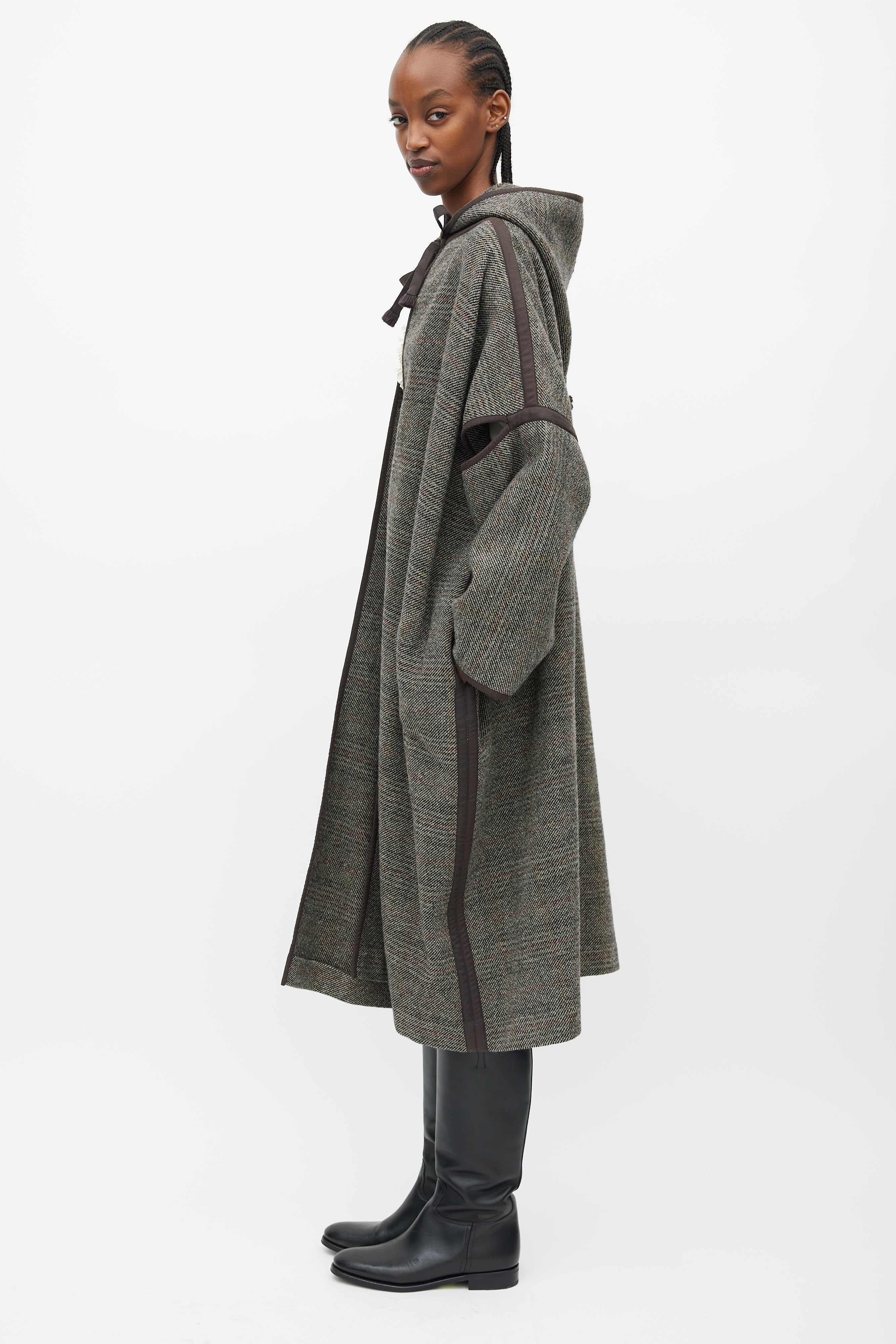 Pre-owned Celine brown and grey wool coat featuring attached pointed hood, brown grosgrain trim, wide sleeves with cut out at underarms, two hip pockets, and open front with tie fastening at top. Hedi Slimane era design.