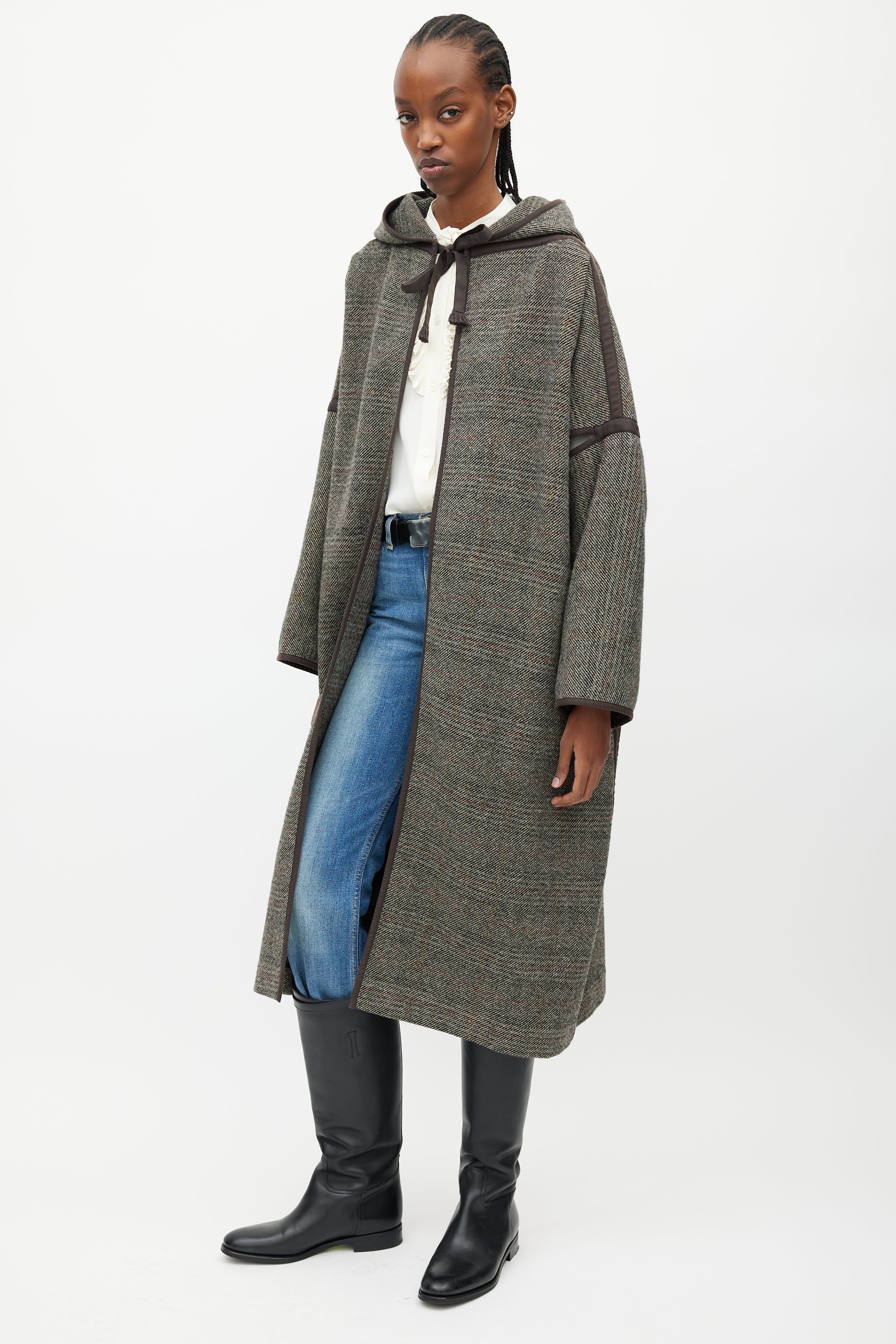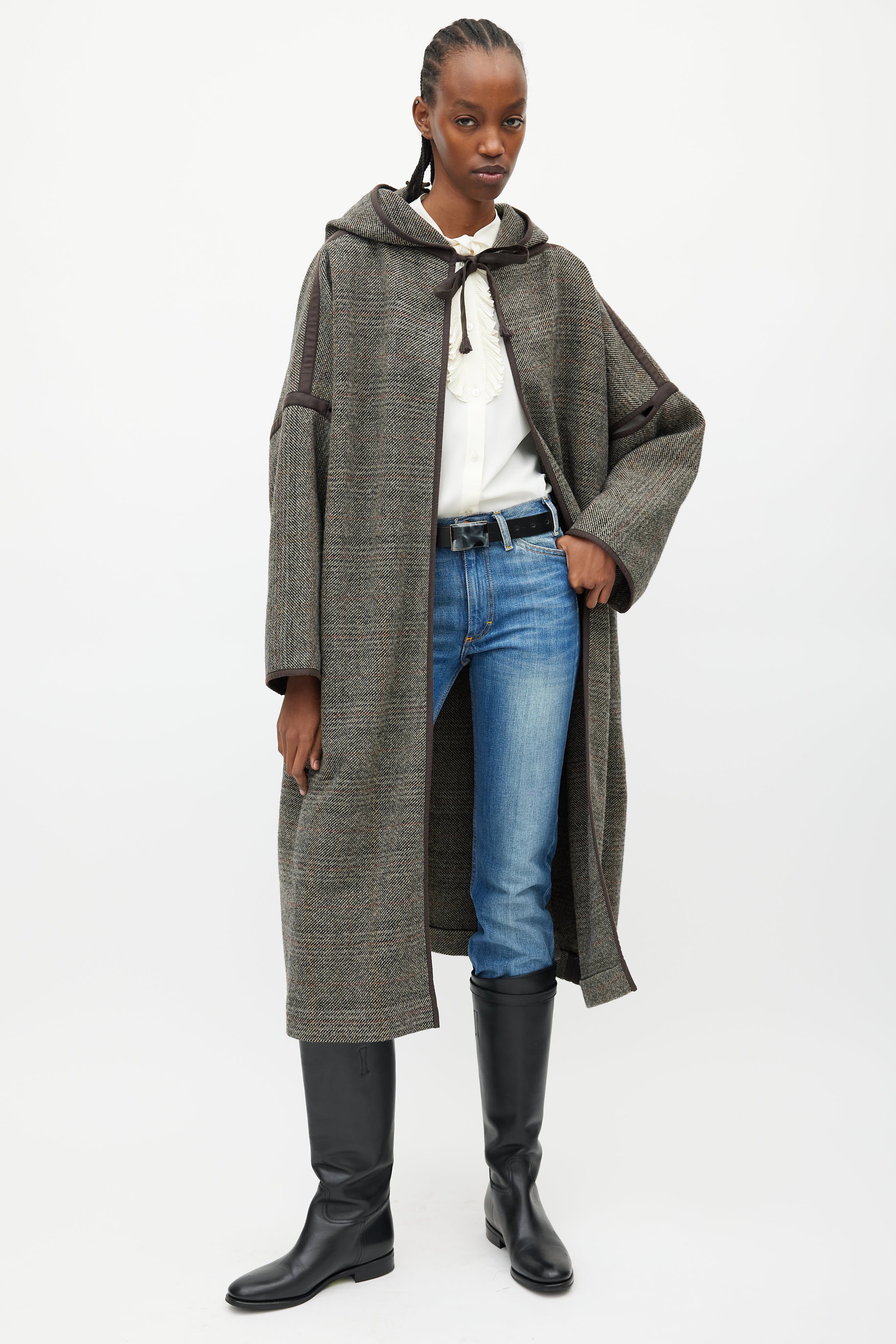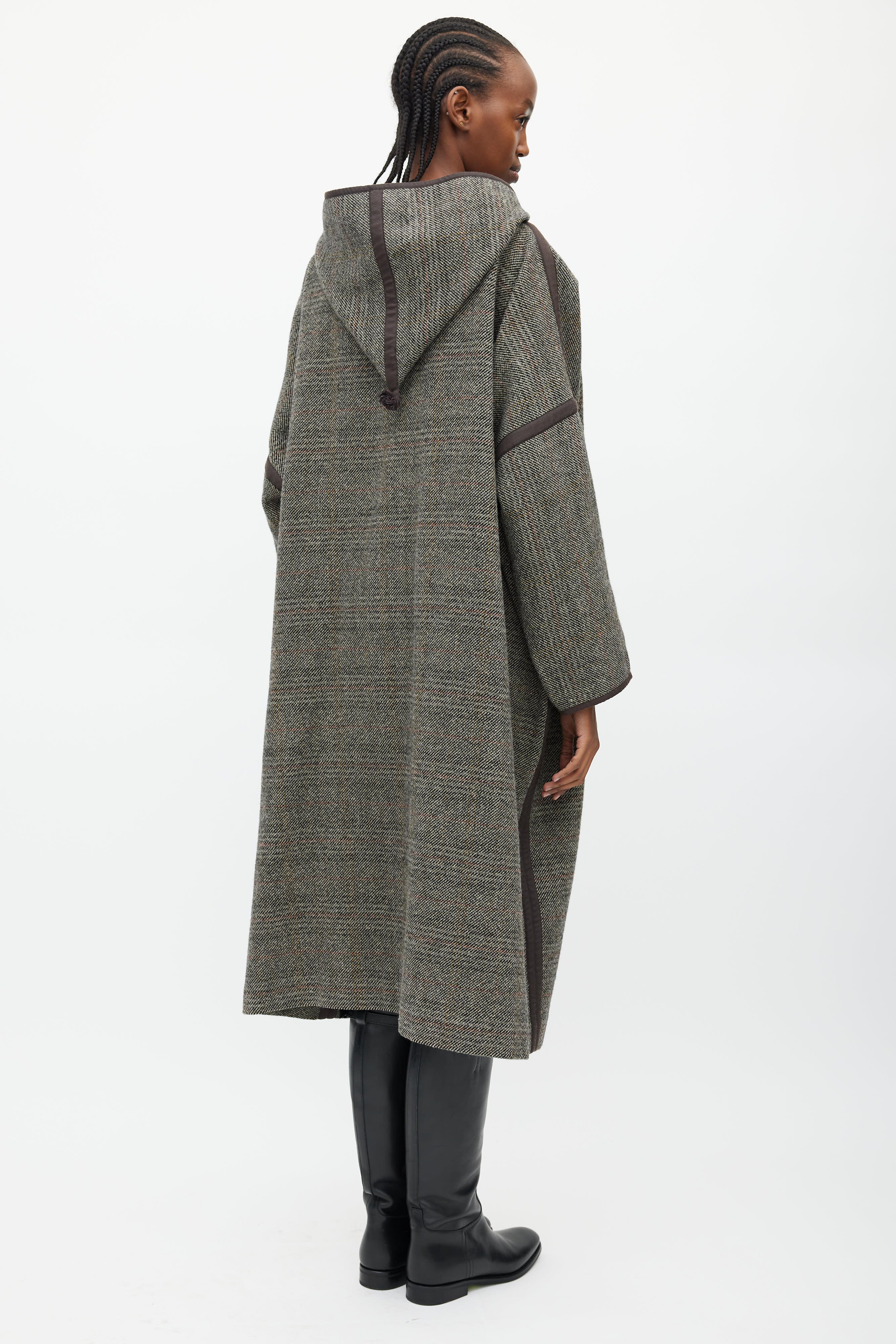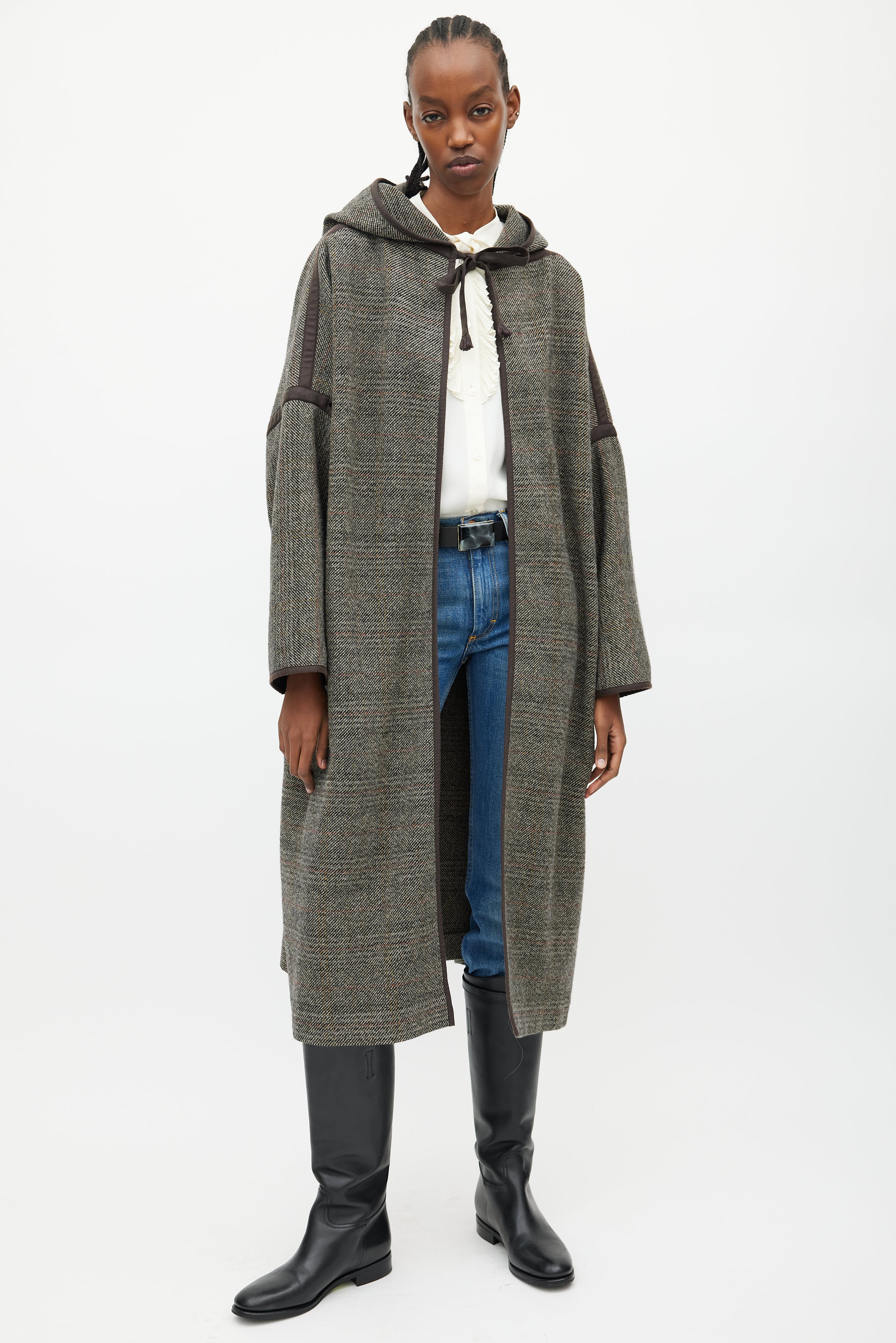 Pre-owned Celine brown and grey wool coat featuring attached pointed hood, brown grosgrain trim, wide sleeves with cut out at underarms, two hip pockets, and open front with tie fastening at top. Hedi Slimane era design.