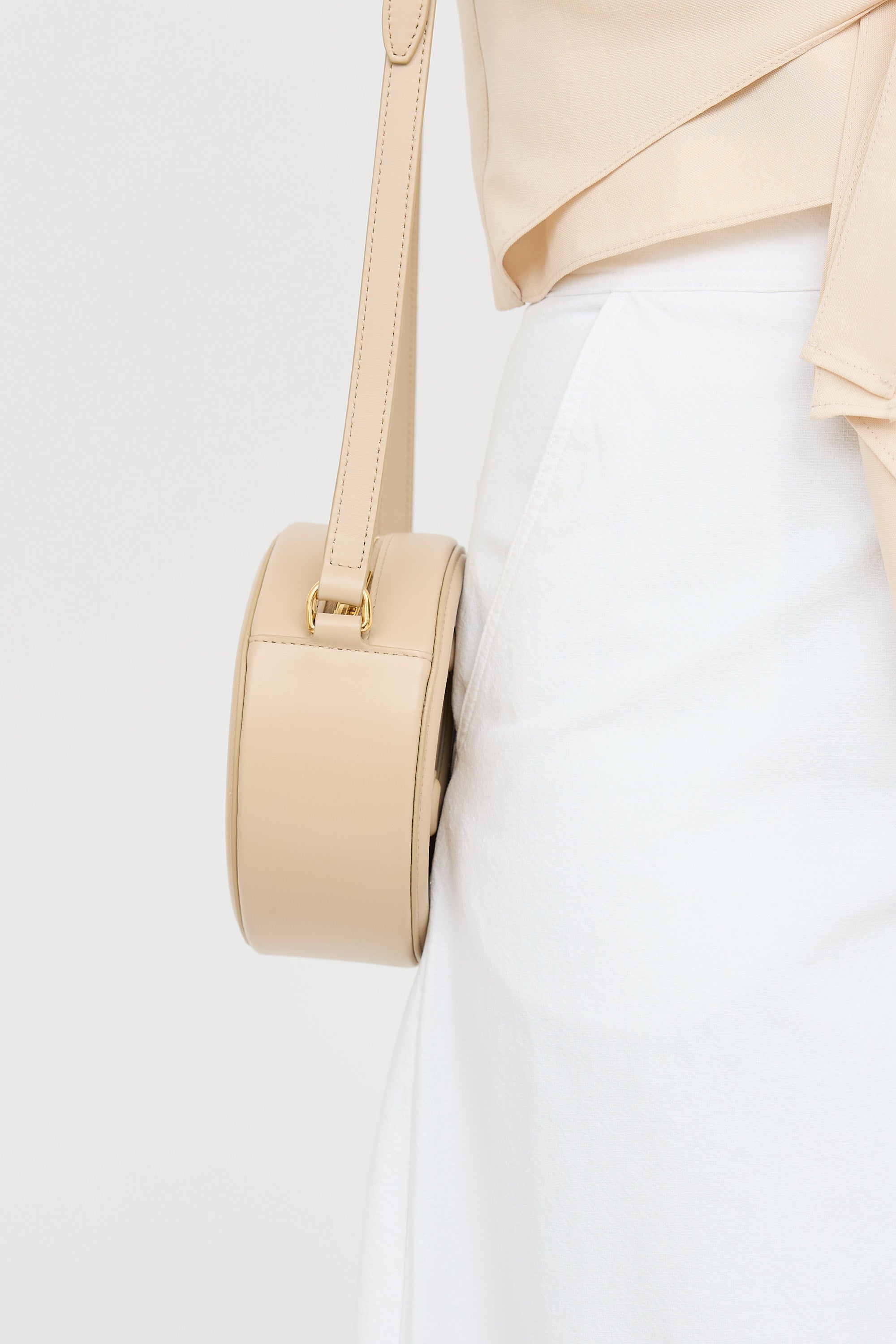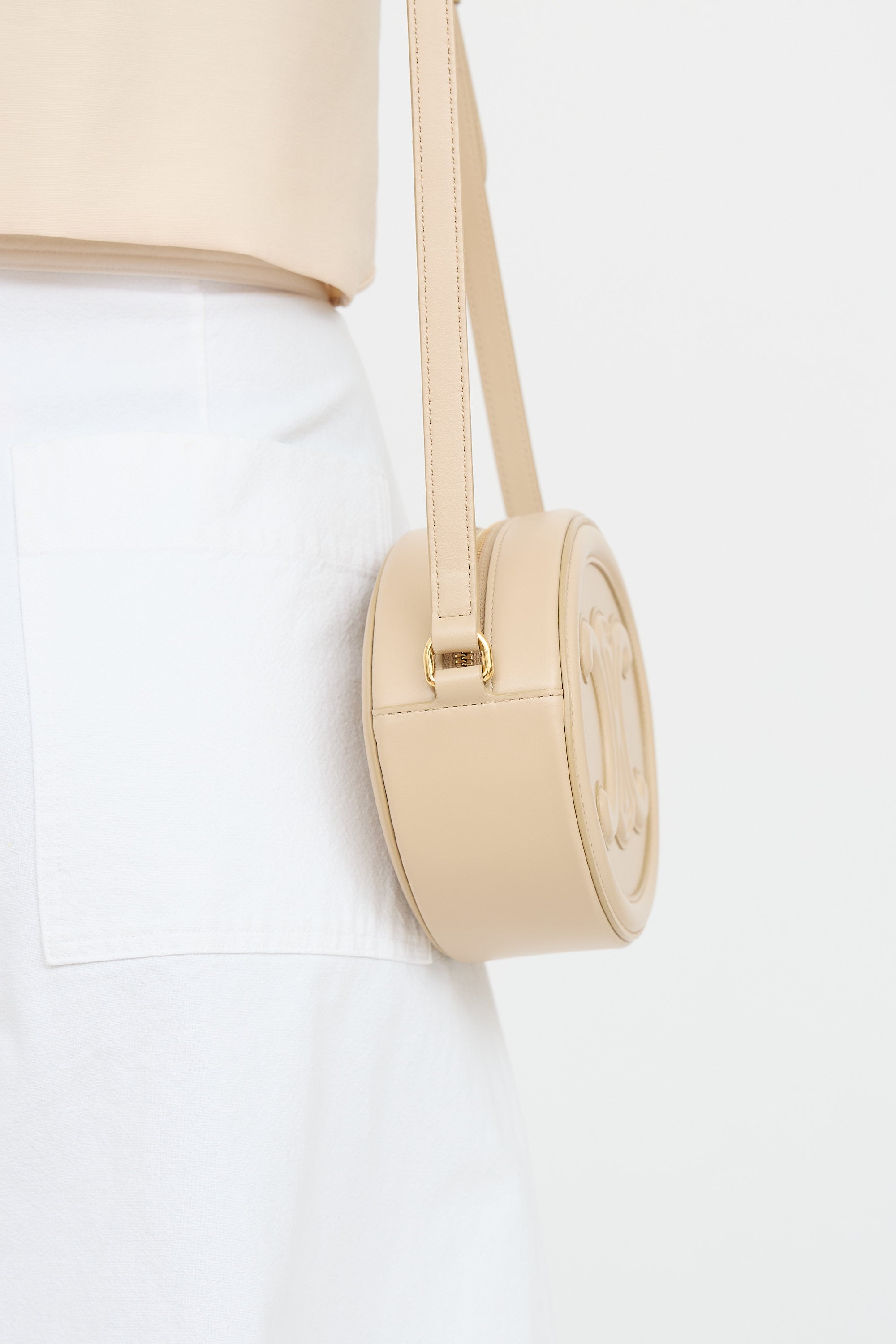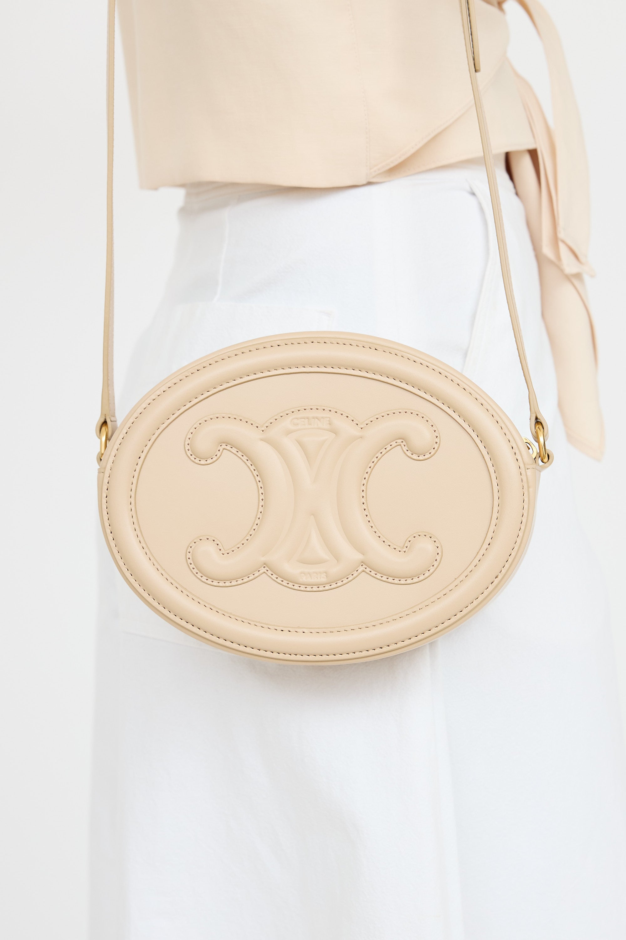 Pre-owned Celine beige Cuir Triomphe Oval bag featuring singular flat leather crossbody strap, embossed Triomphe logo at front and at back, top zip closure with gold tone hardware, and one main compartment with one slip pocket.