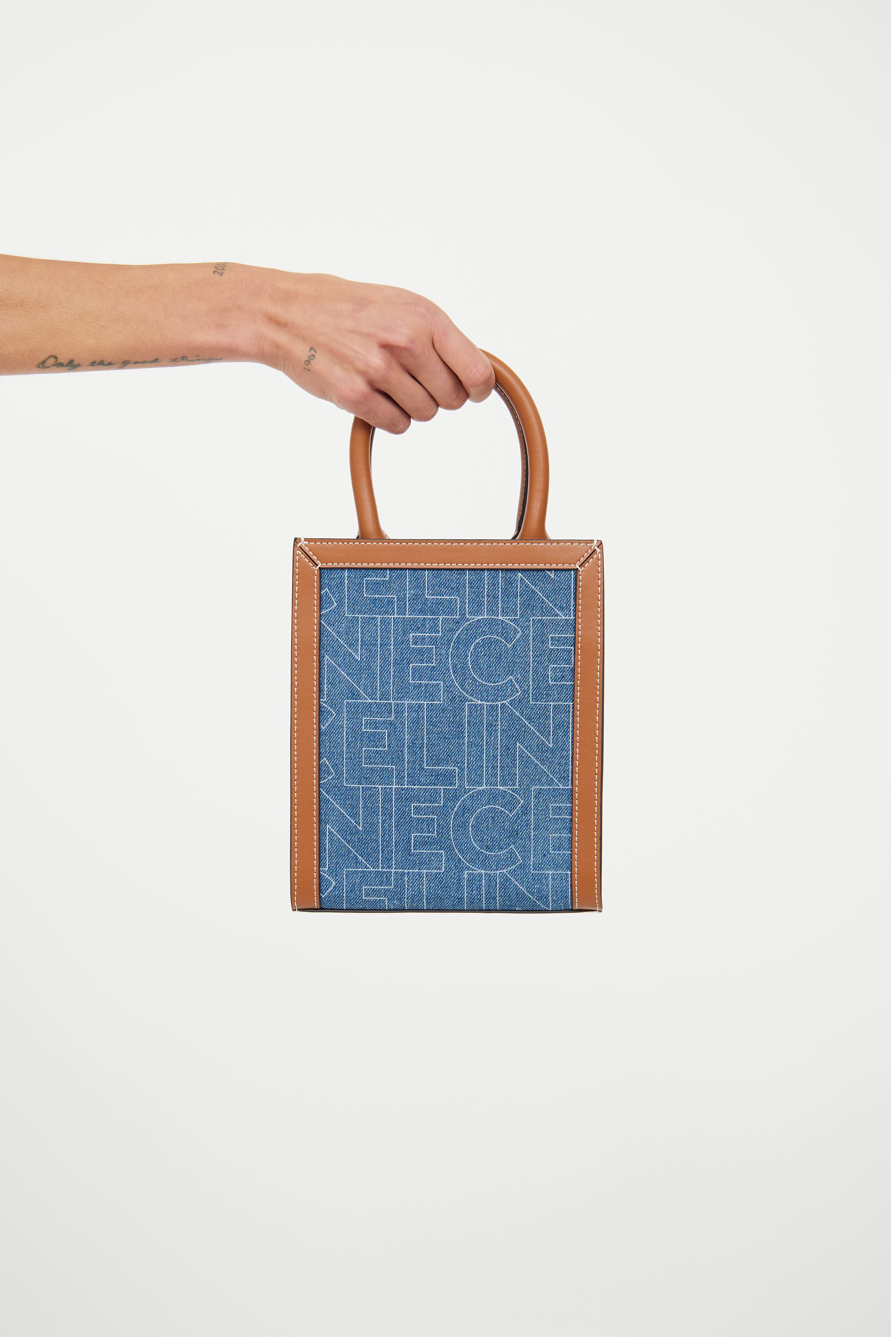 Pre-owned Celine Mini Vertical Cabas bag in denim featuring two rolled top handles, removable leather crossbody strap, gold tone hardware, contrast stitching, multiple printed logos at front and back, open entry, and a denim lined interior.