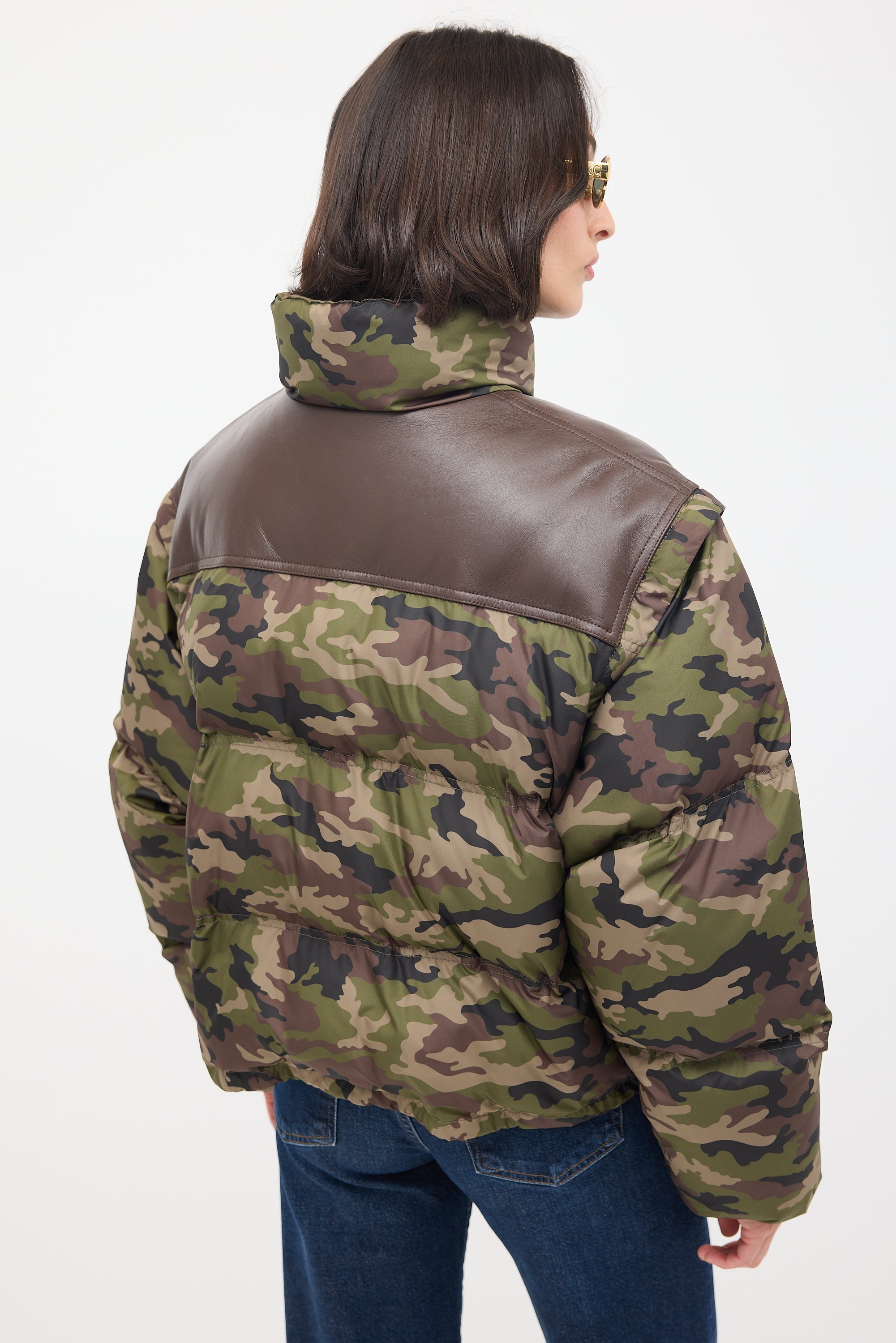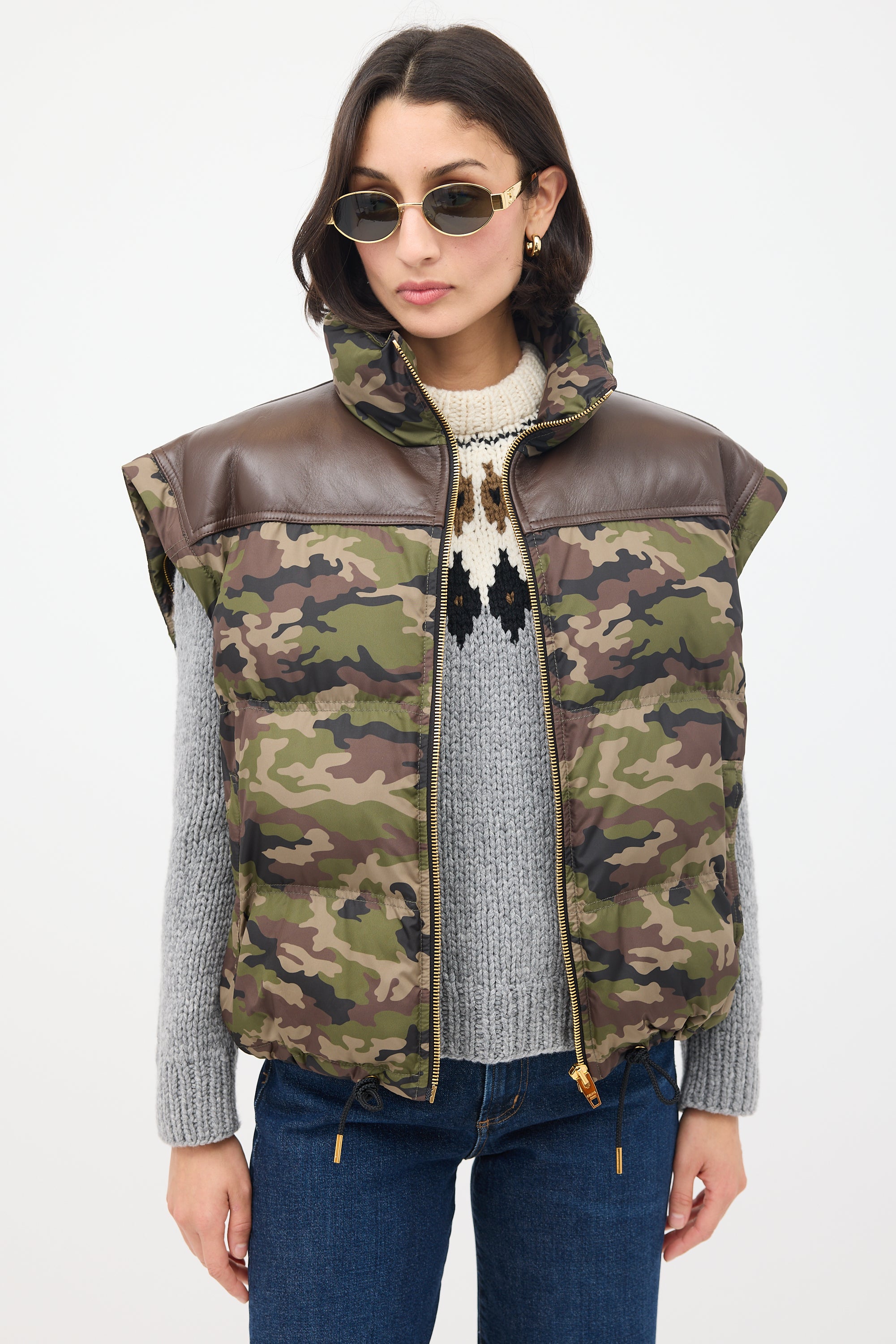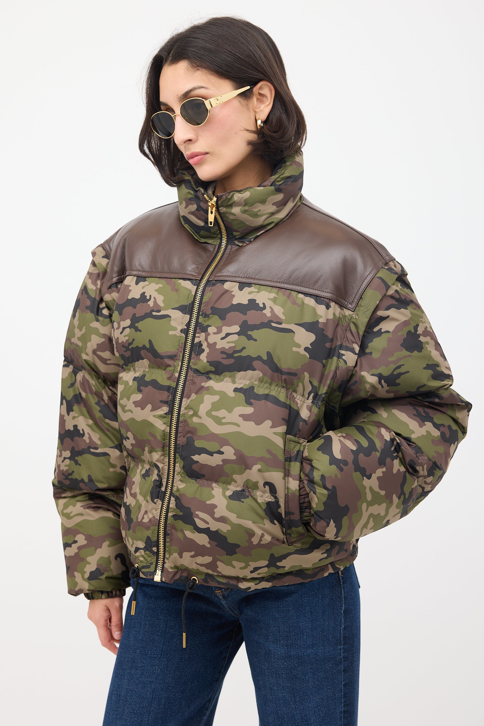 Pre-owned Celine green & brown puffer jacket featuring funnel collar, gold tone zip up front, camouflage print throughout, brown leather yoke panelling, zip pockets at front waist, drawcord hemline, and detachable long sleeves with zip armhole fastenings and elasticized cuffs. Lined and padded.