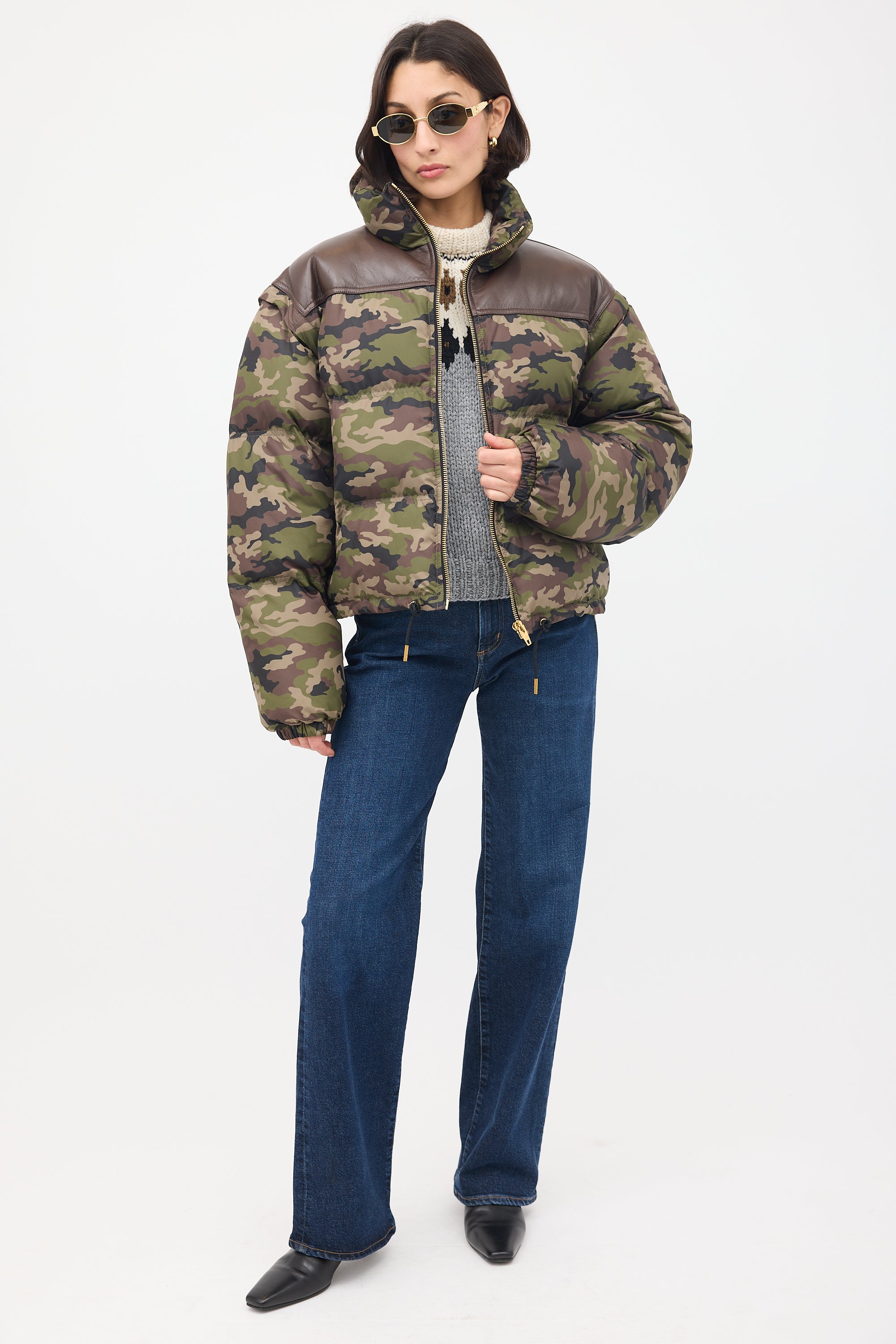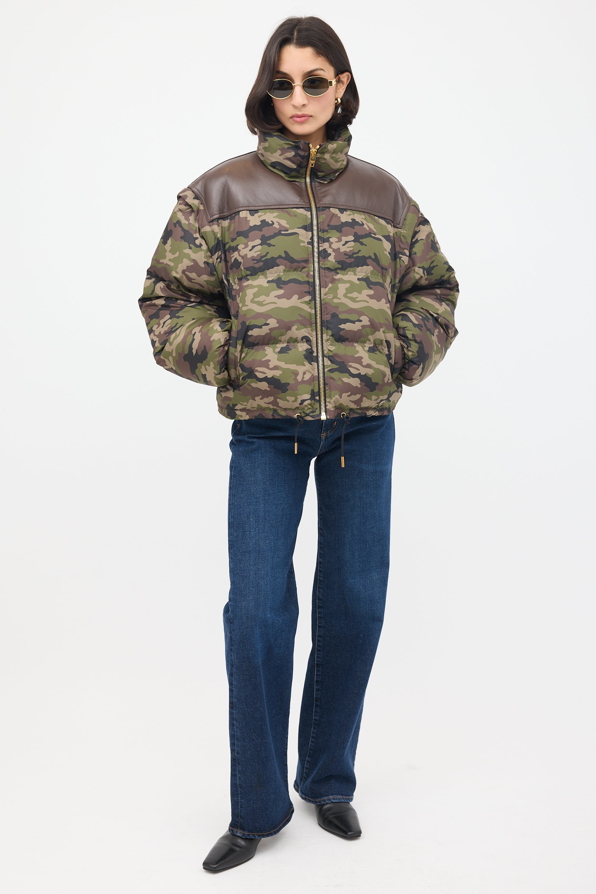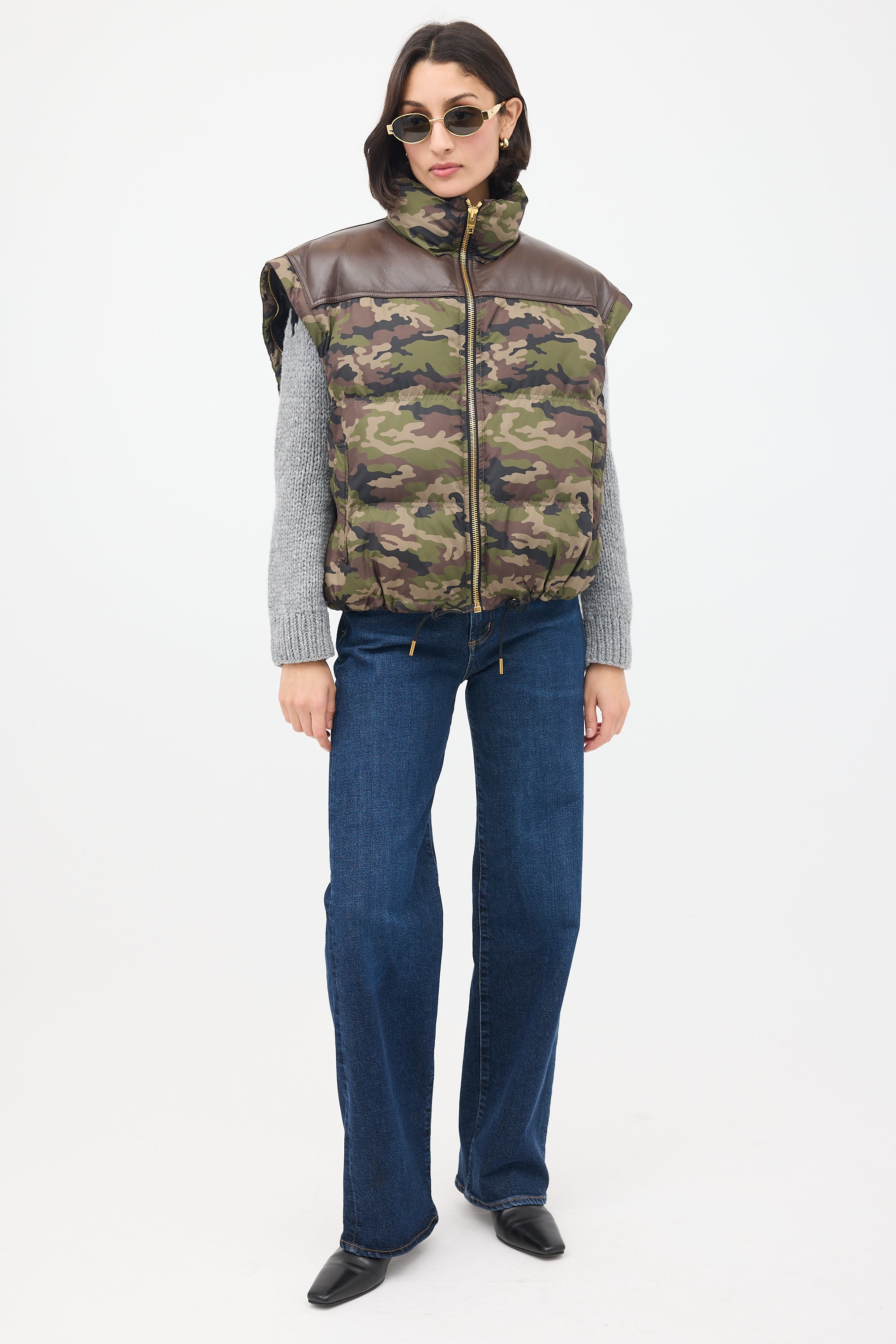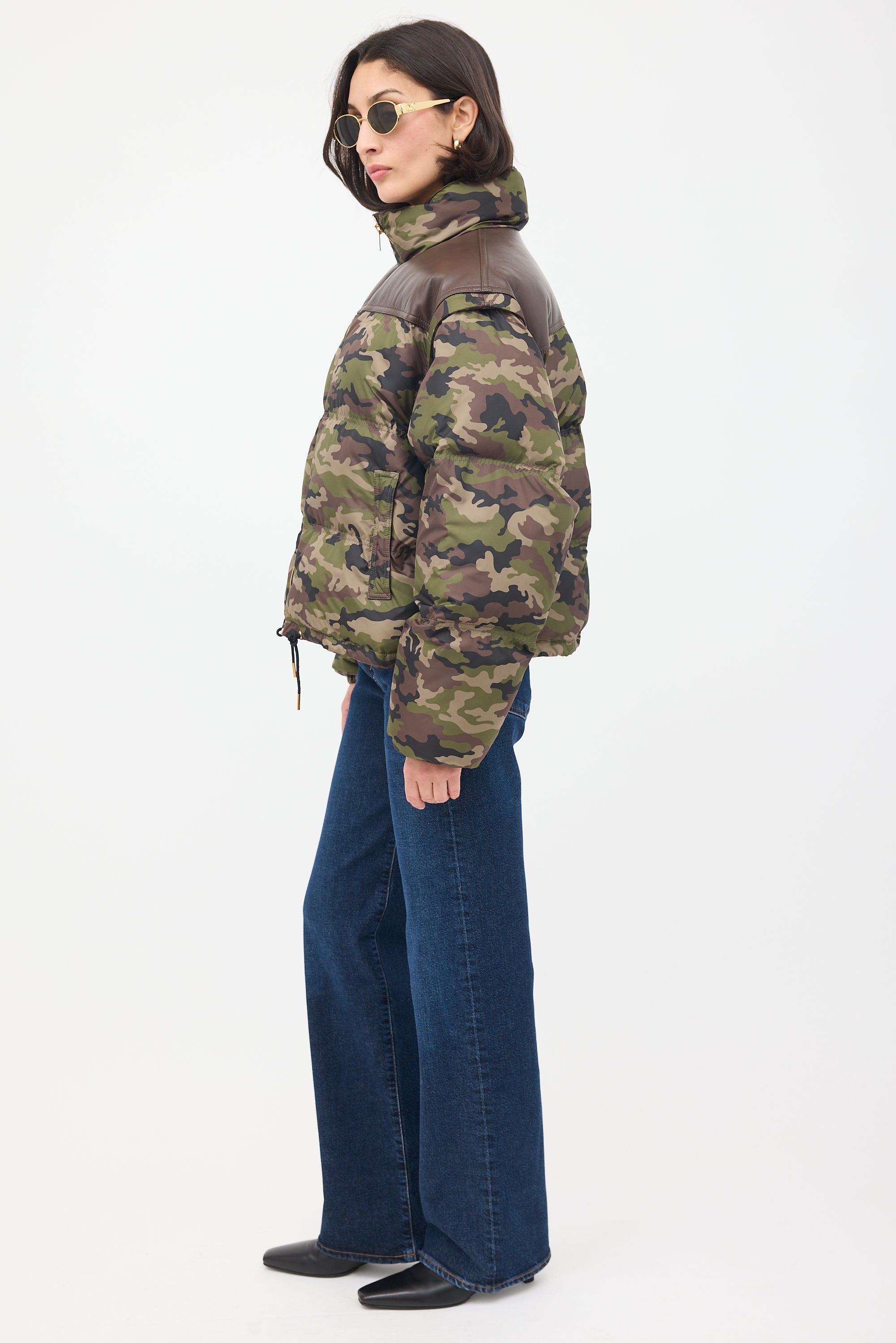 Pre-owned Celine green & brown puffer jacket featuring funnel collar, gold tone zip up front, camouflage print throughout, brown leather yoke panelling, zip pockets at front waist, drawcord hemline, and detachable long sleeves with zip armhole fastenings and elasticized cuffs. Lined and padded.