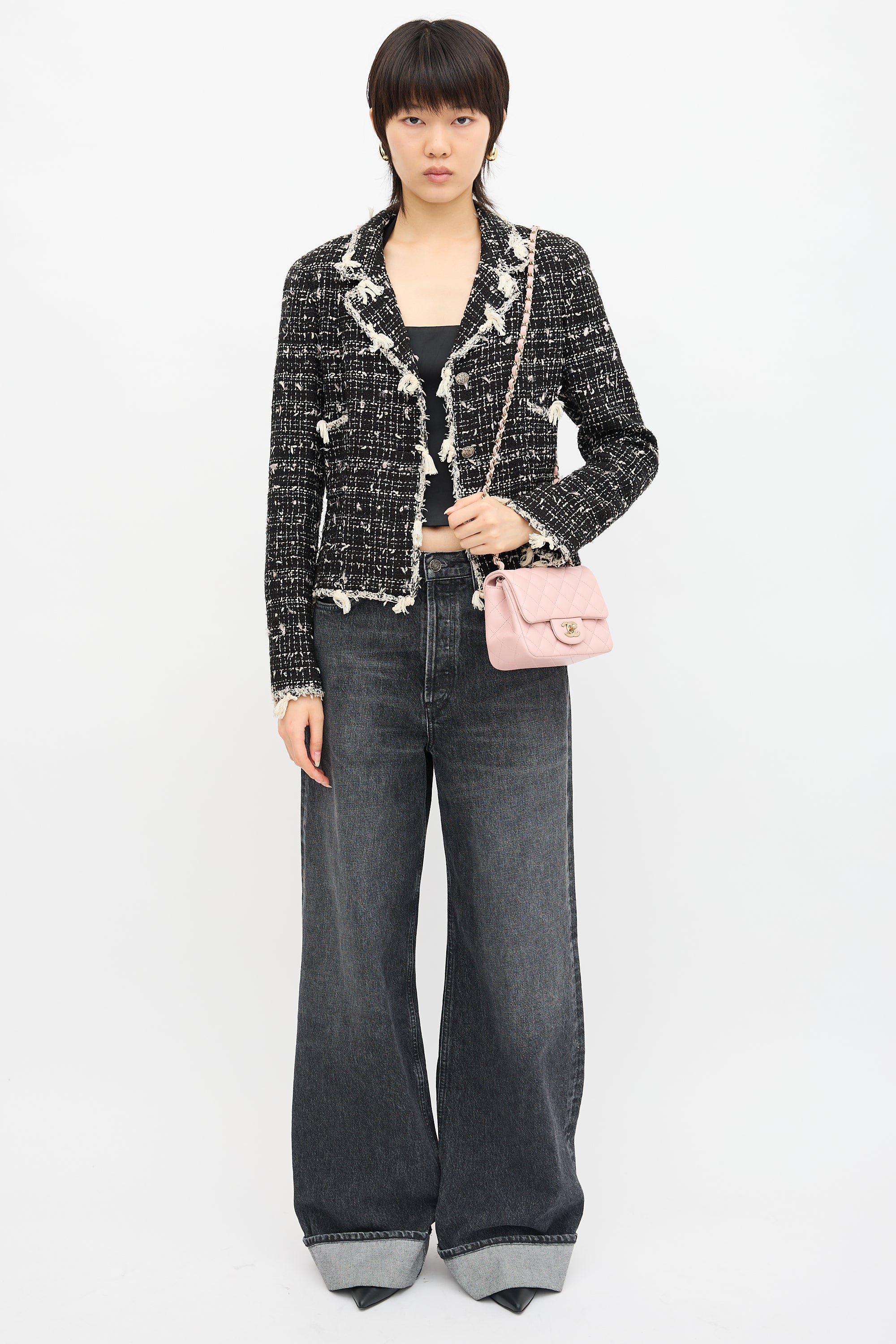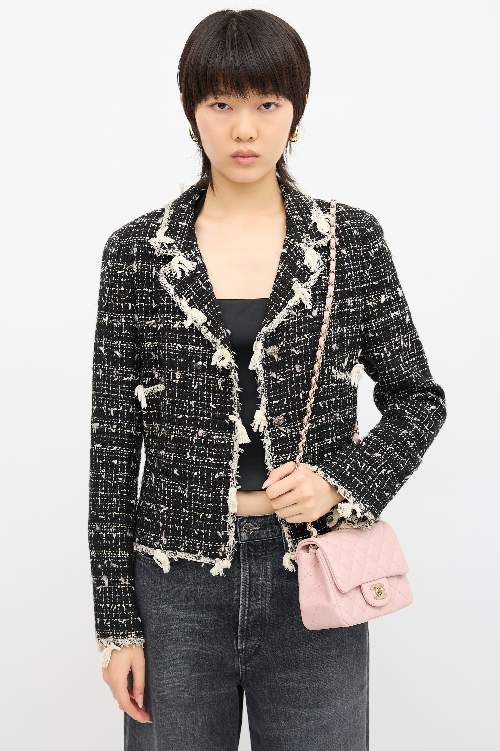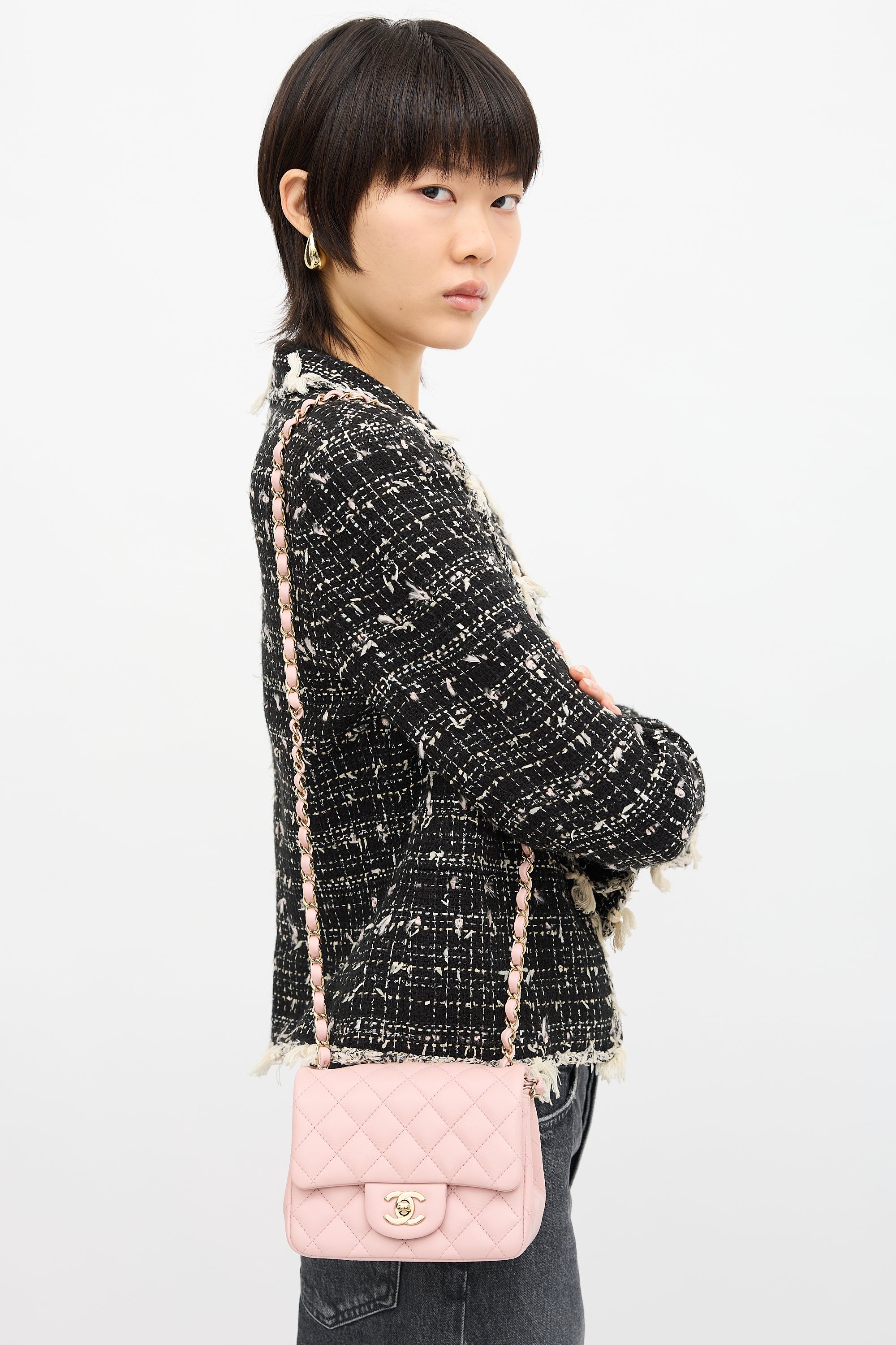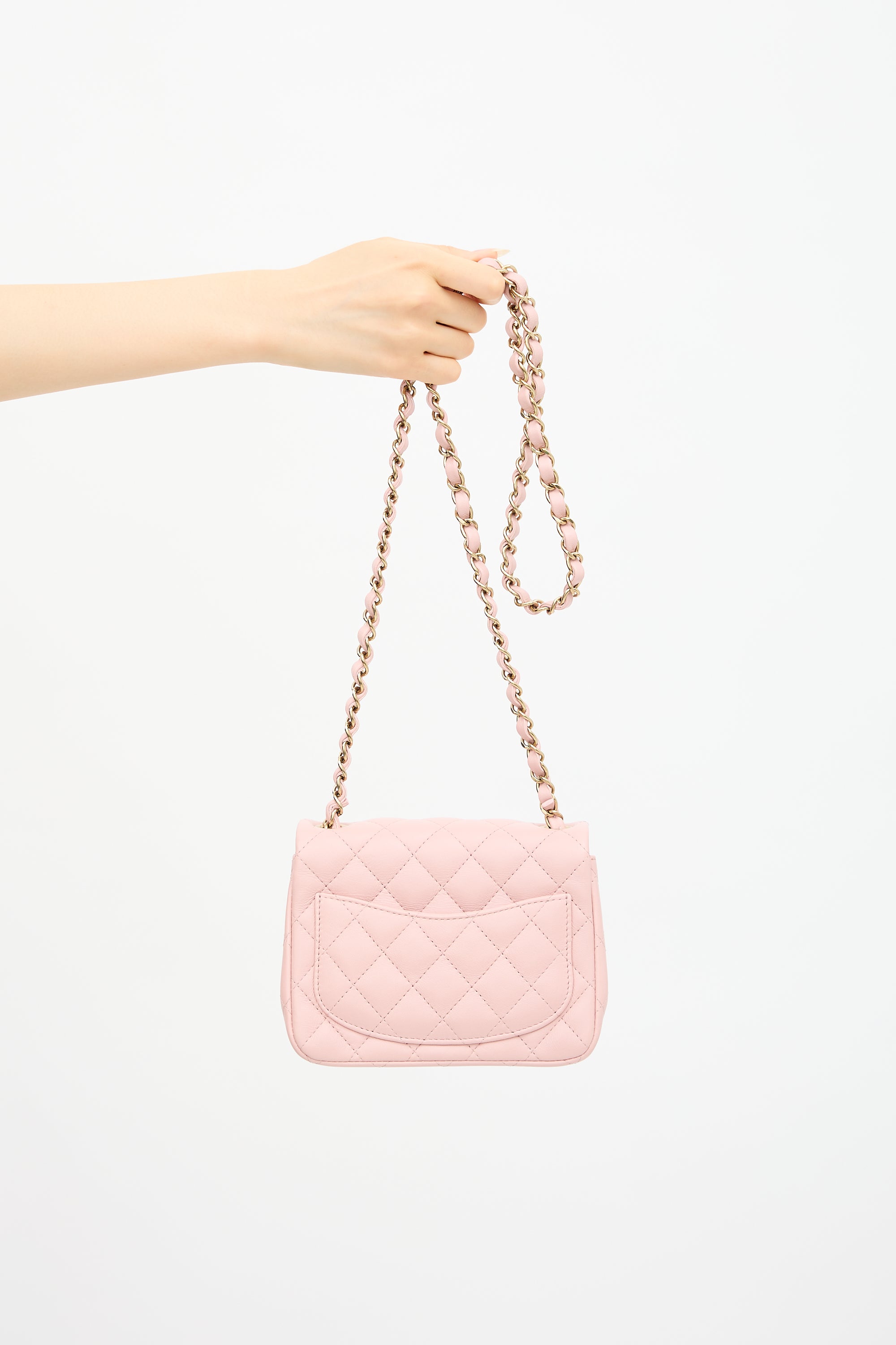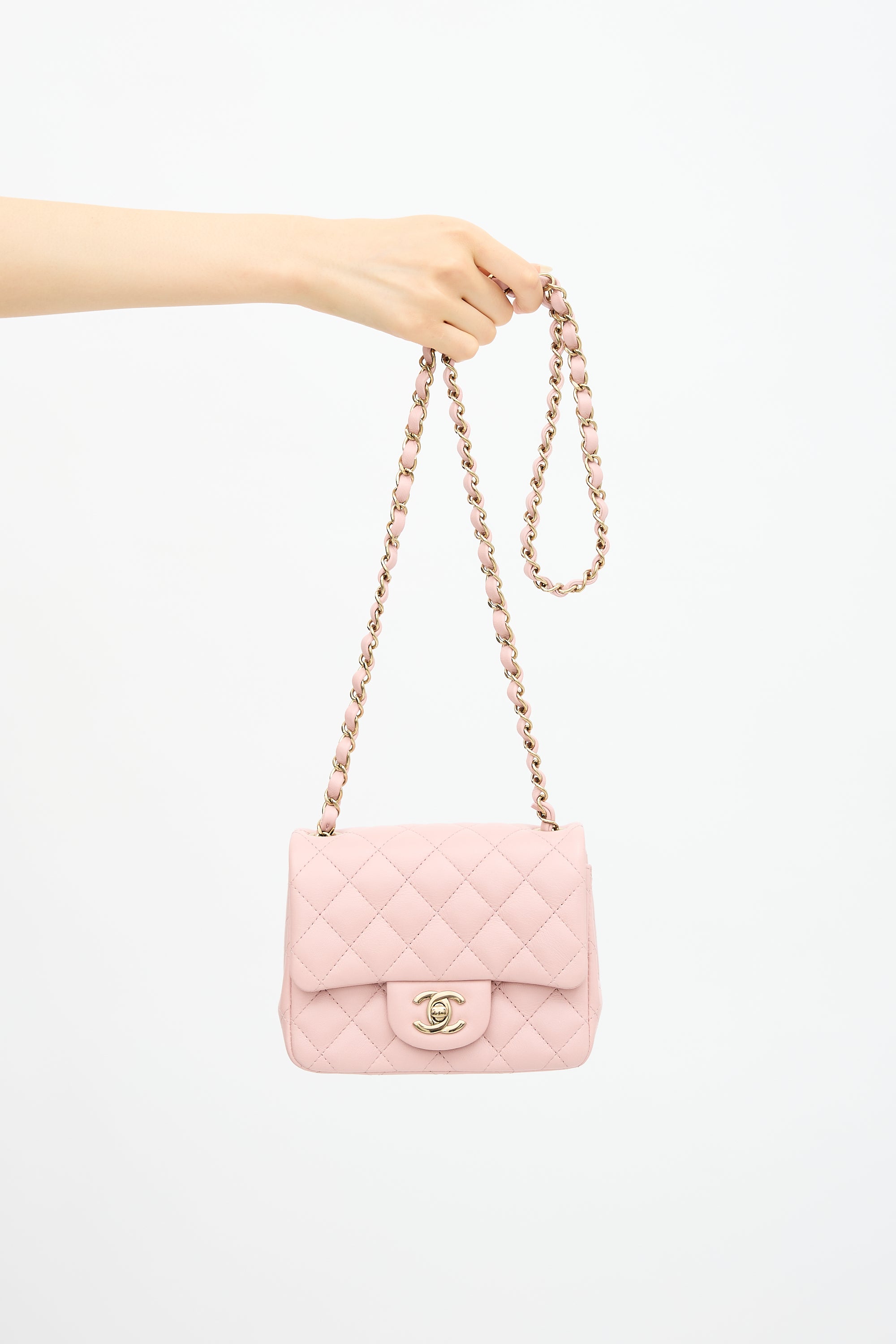 Pre-owned Chanel 2024 pink quilted leather Mini Square Classic Flap bag featuring gold tone hardware, back slip pocket, braided leather and chain shoulder strap, front flap with interlocking CC turn lock closure, and one main compartment with one slip pocket and one zip pocket. Comes with original box and dust bag.