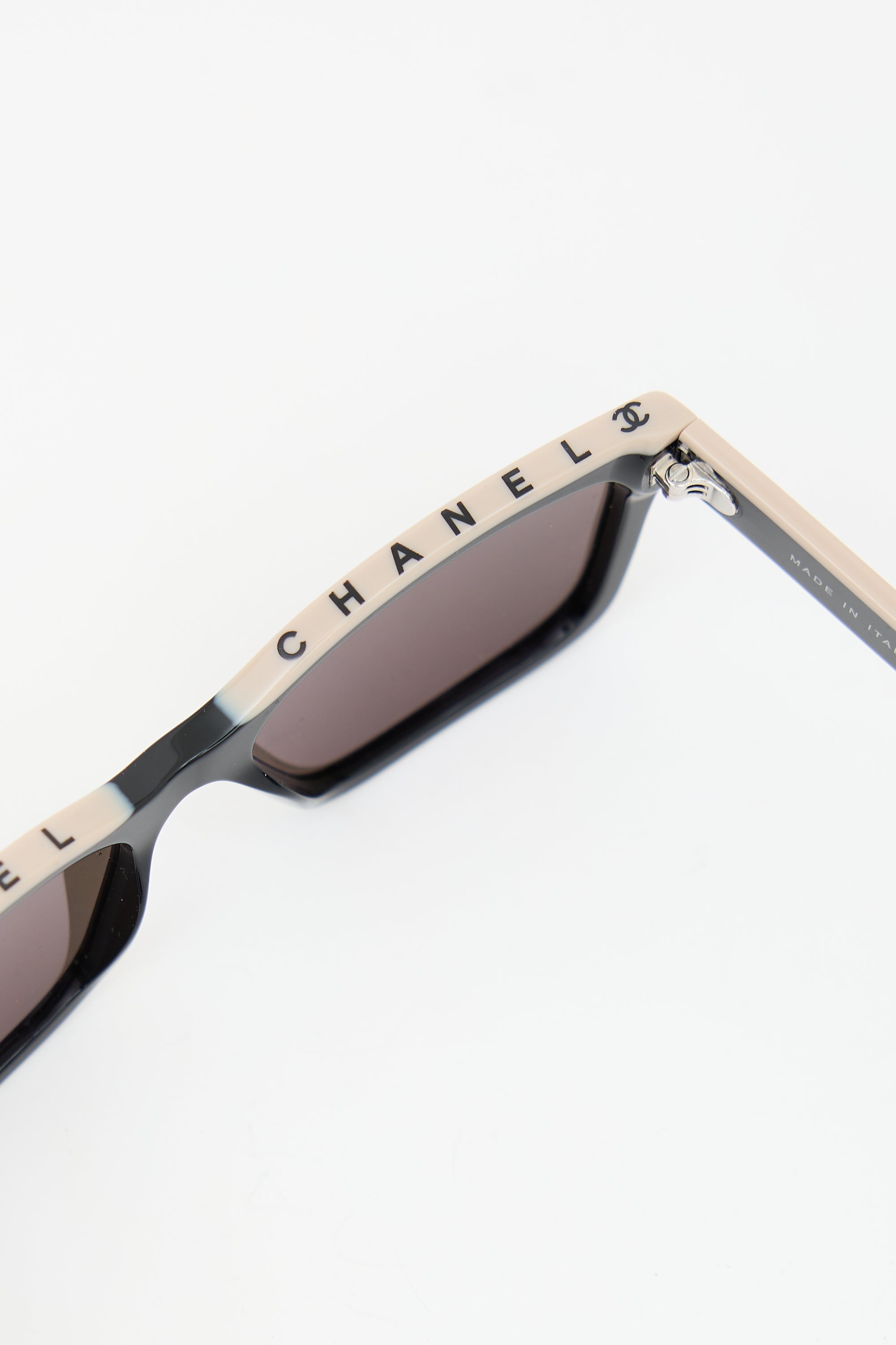 Pre-owned Chanel 5417 sunglasses featuring black and beige square frame, grey tinted lenses, and inset silver tone CC logo at temples. Comes with original case.