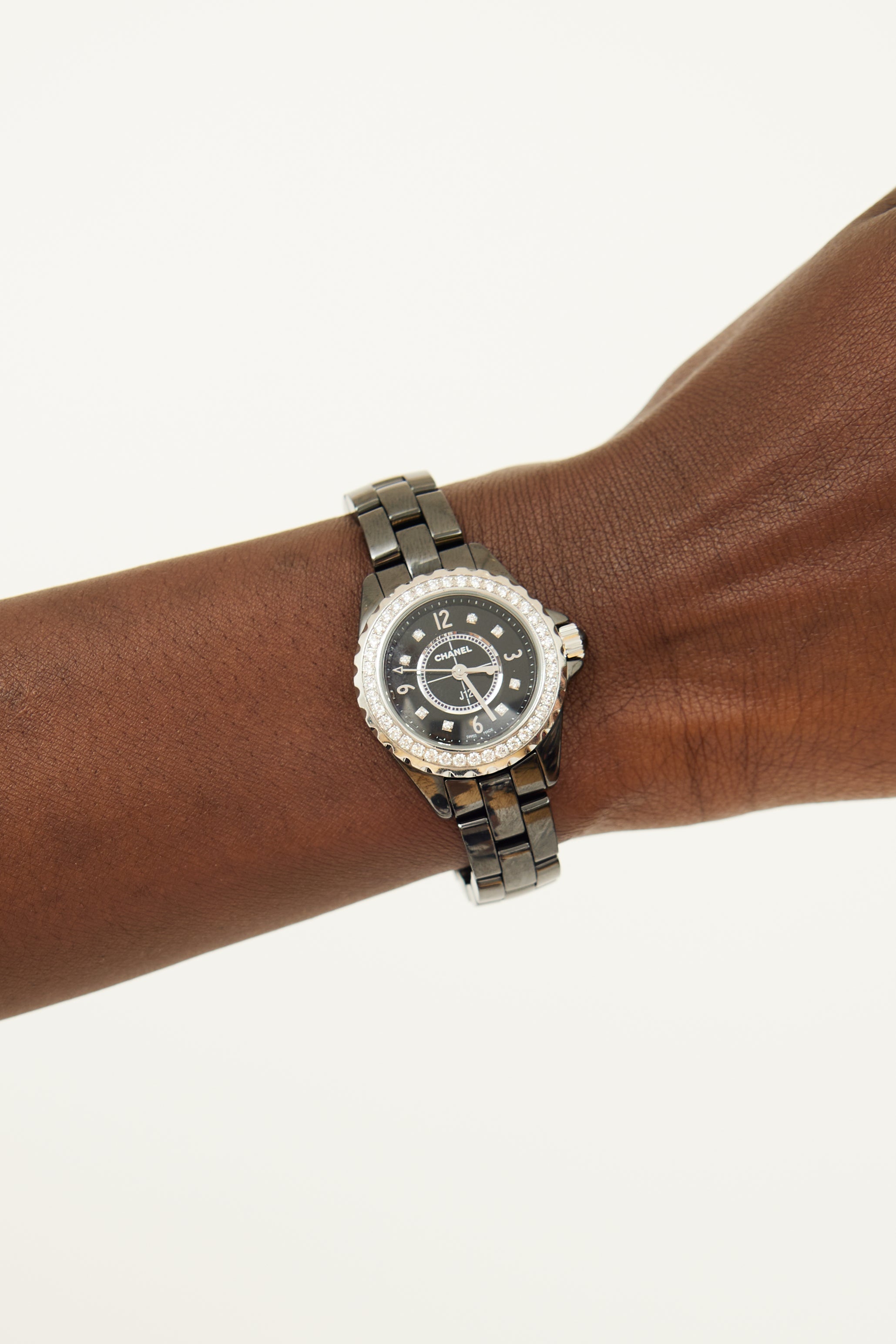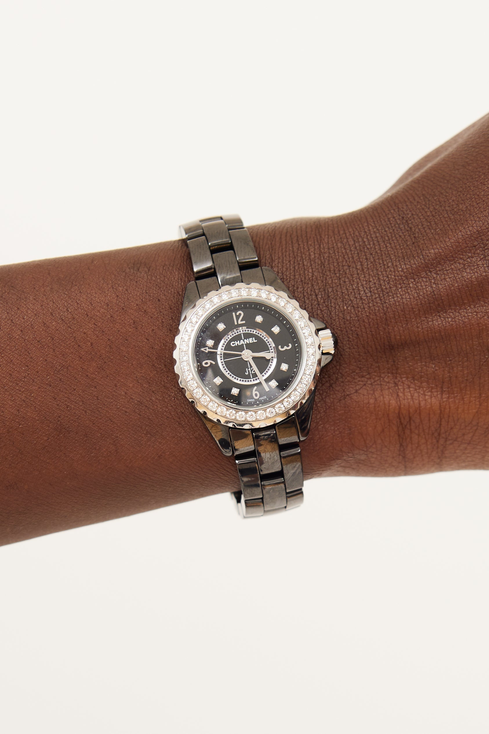 Pre-owned Chanel black J12 Quartz watch featuring a black ceramic case with stainless steel back and diamond set bezel, black dial with diamond set markers, silver tone hands, sapphire crystal face, and a black ceramic bracelet with stainless steel folding clasp.