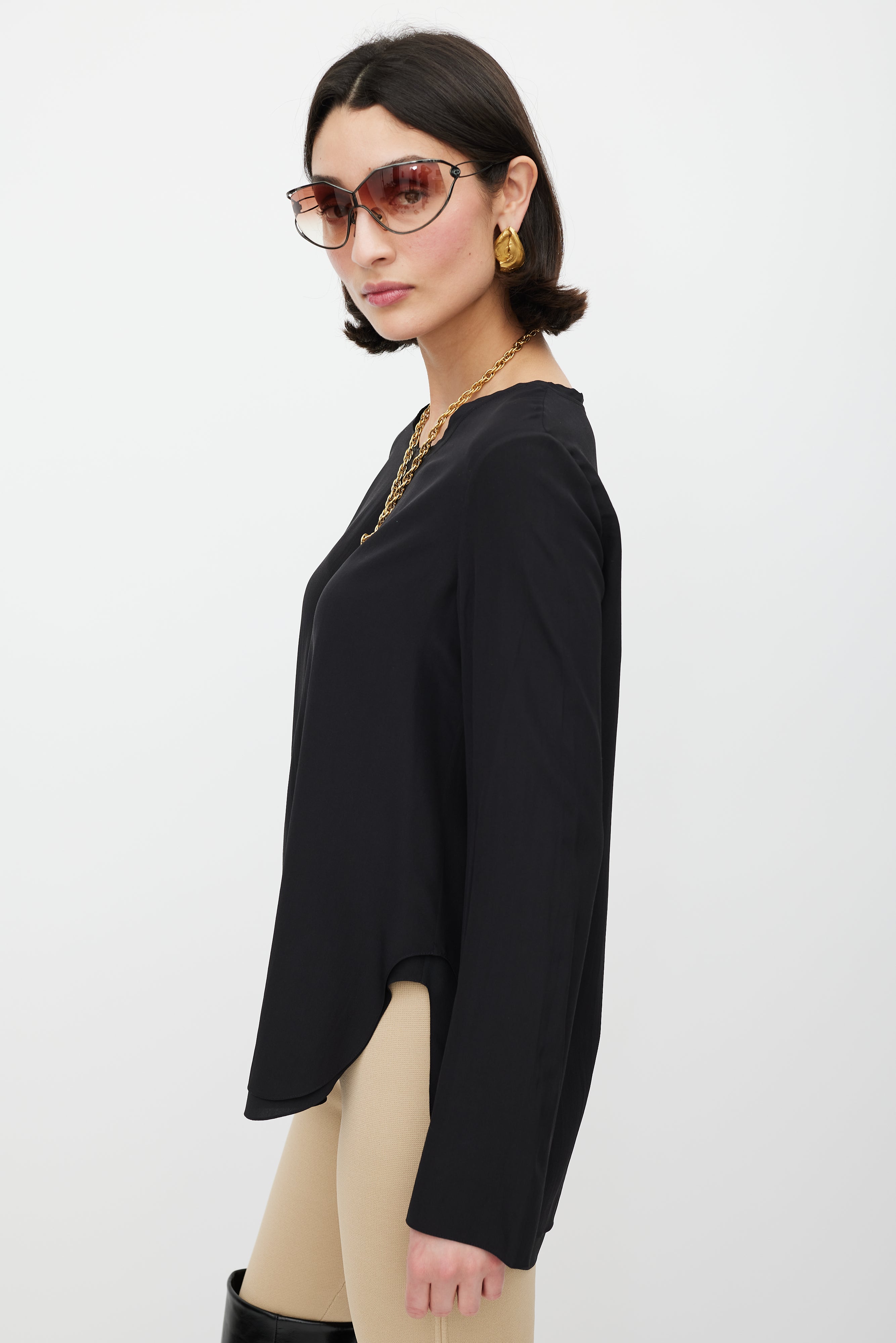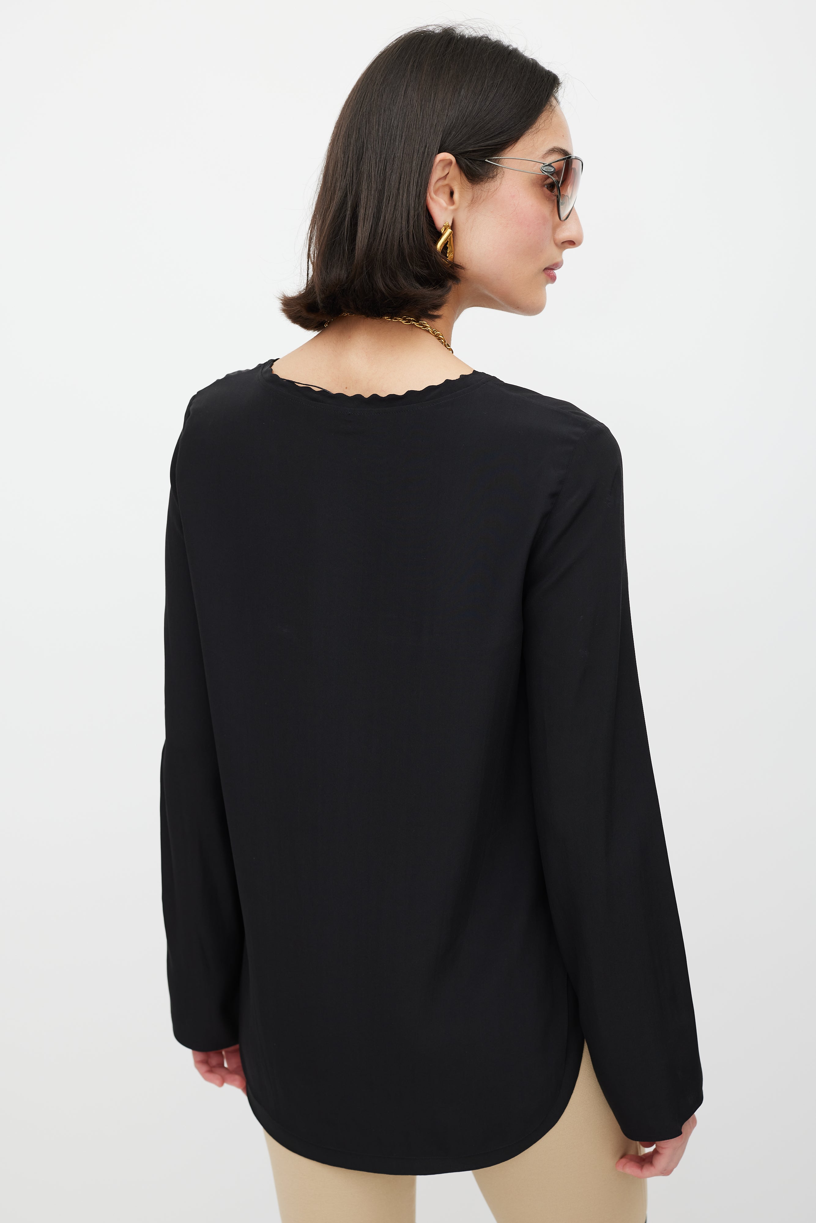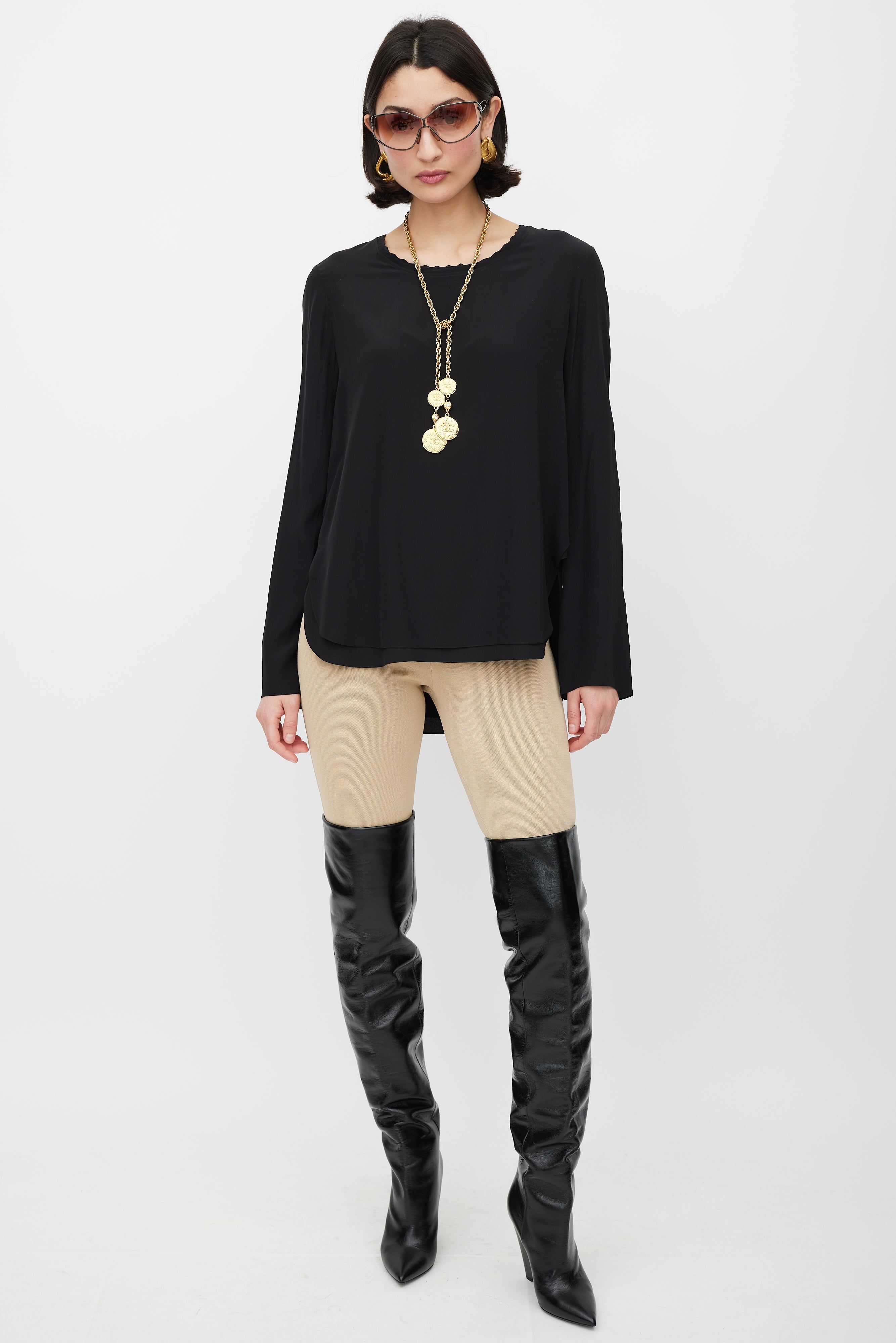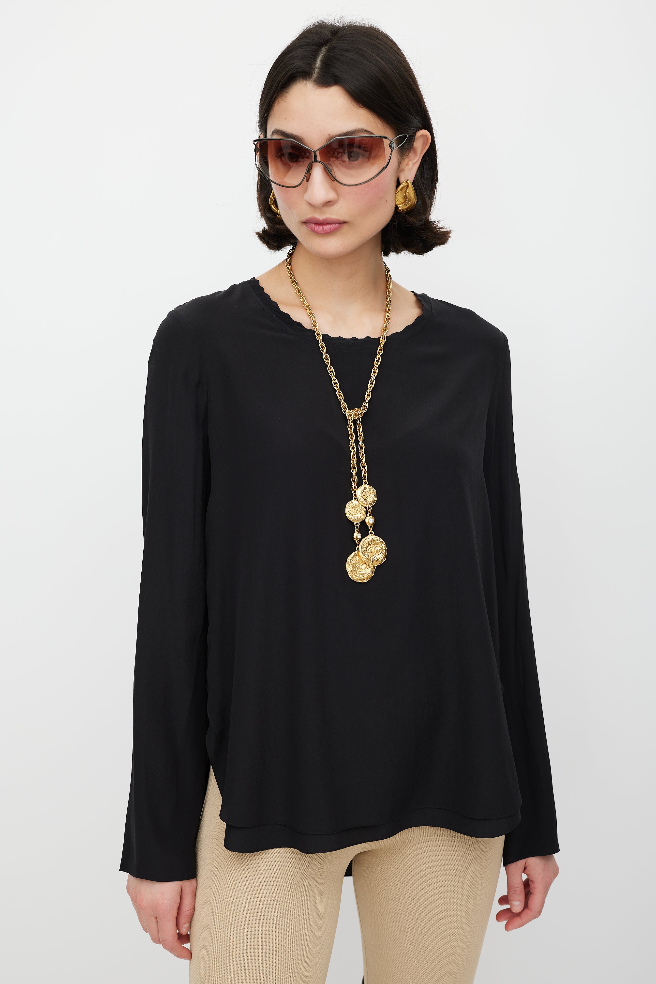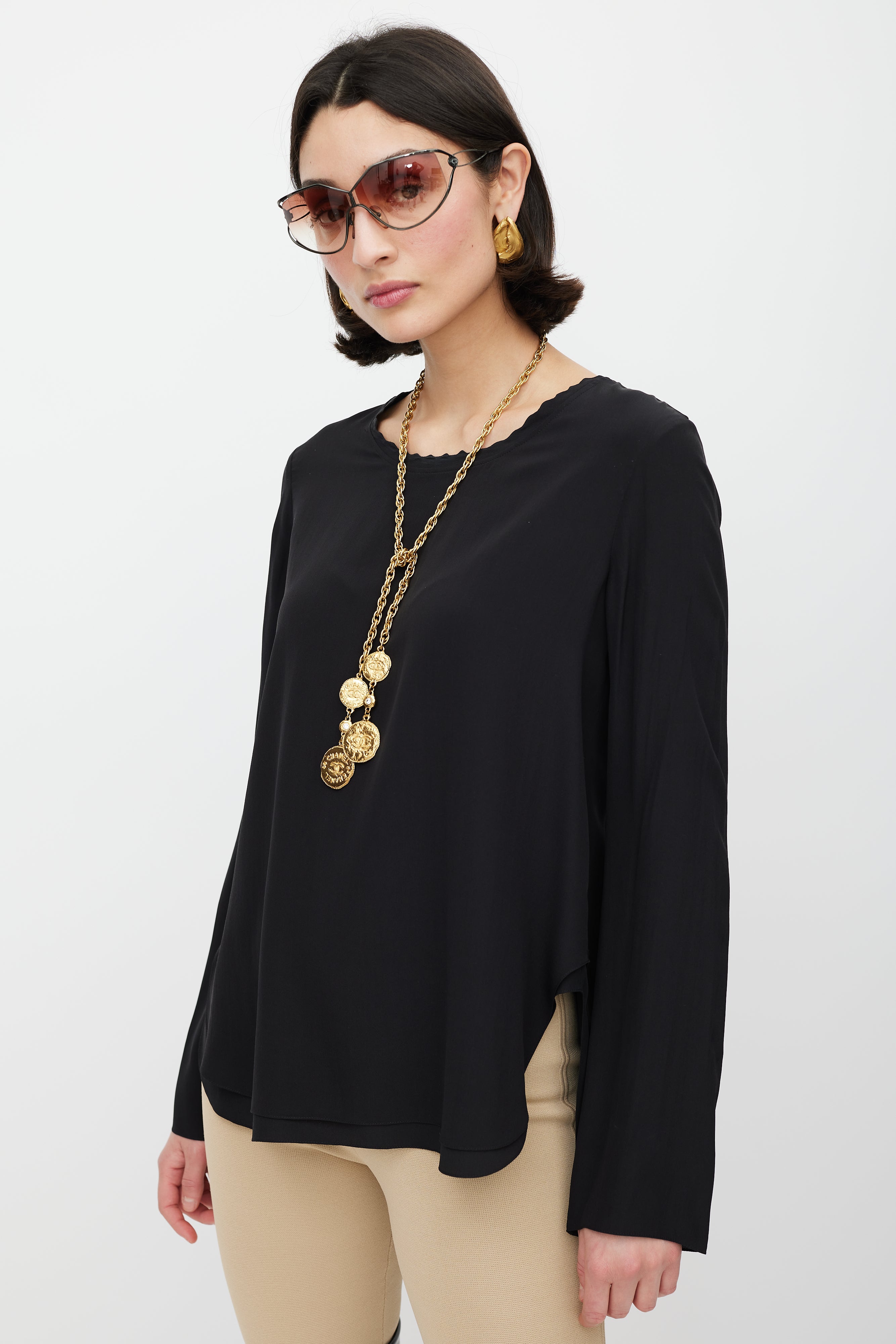 Pre-owned Chloé black silk top featuring a round scalloped neckline, long sleeves, and rounded hem.