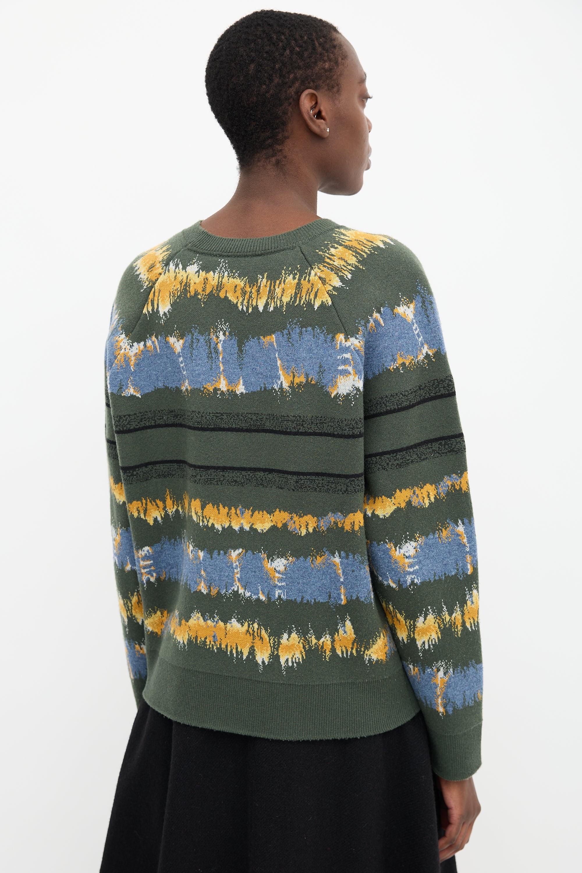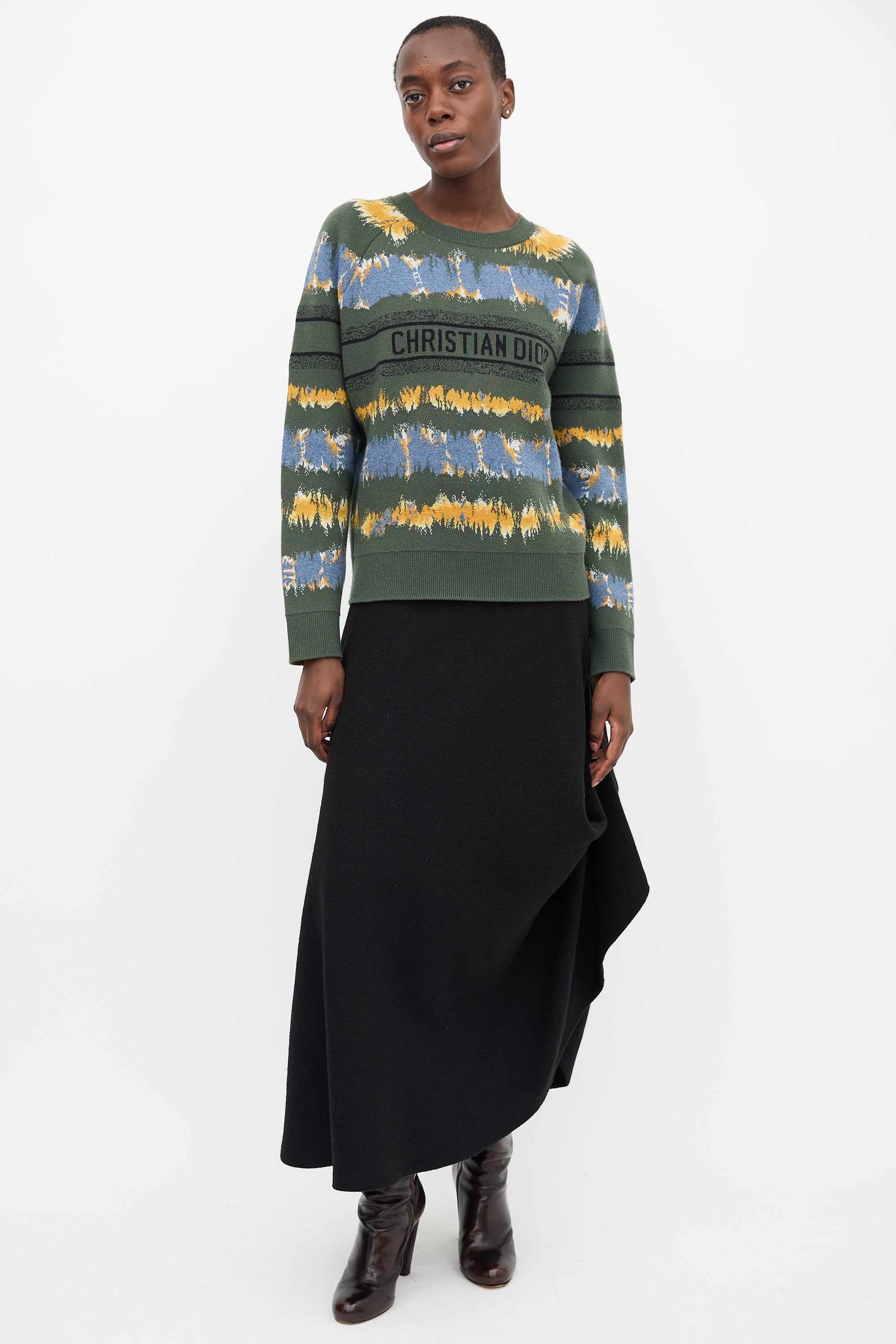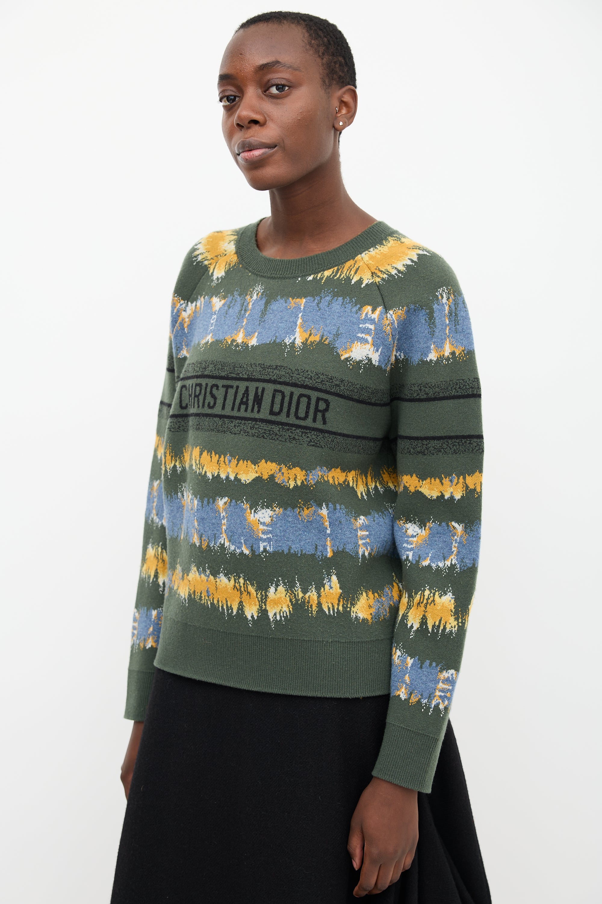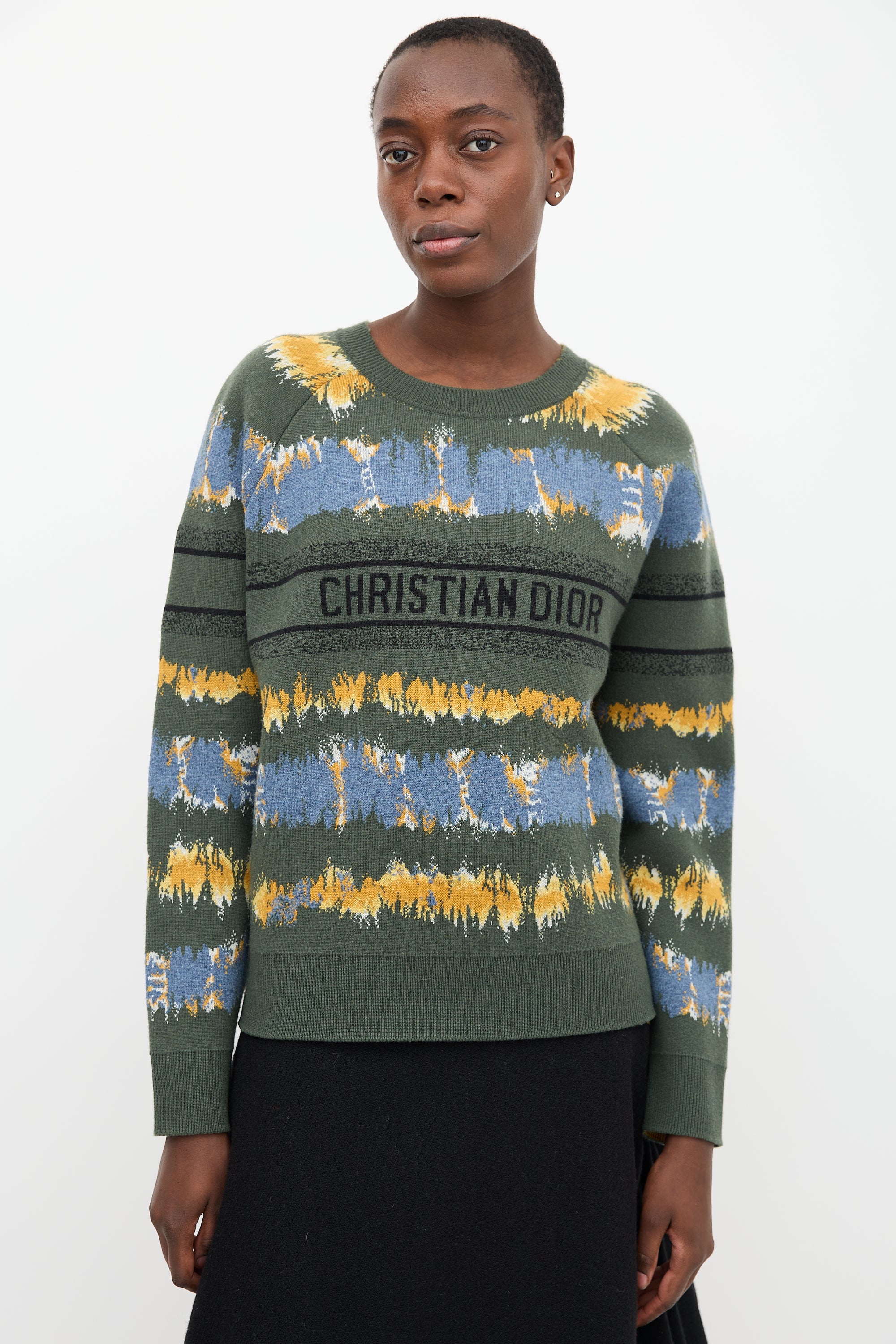 Pre-owned Christian Dior green and multicolour sweater featuring crew neckline, tie dye print intarsia, and ribbed neckline, cuffs, and hem.