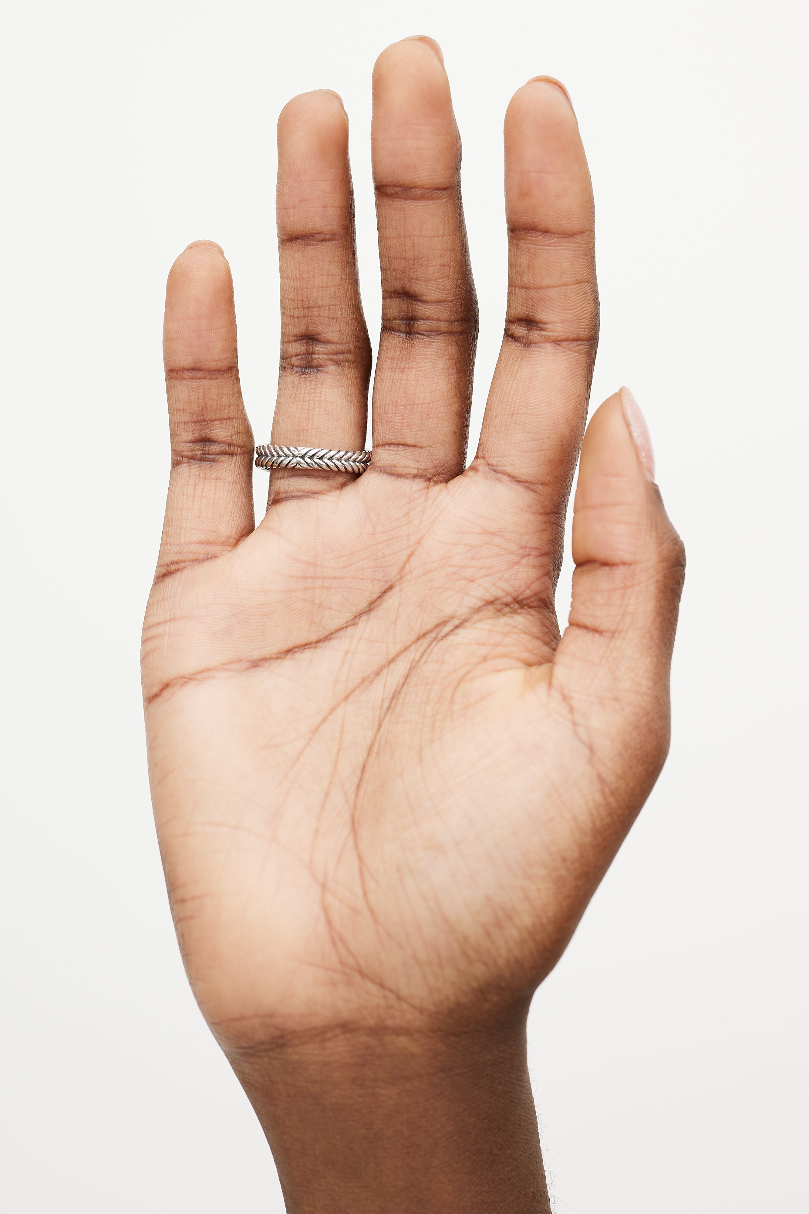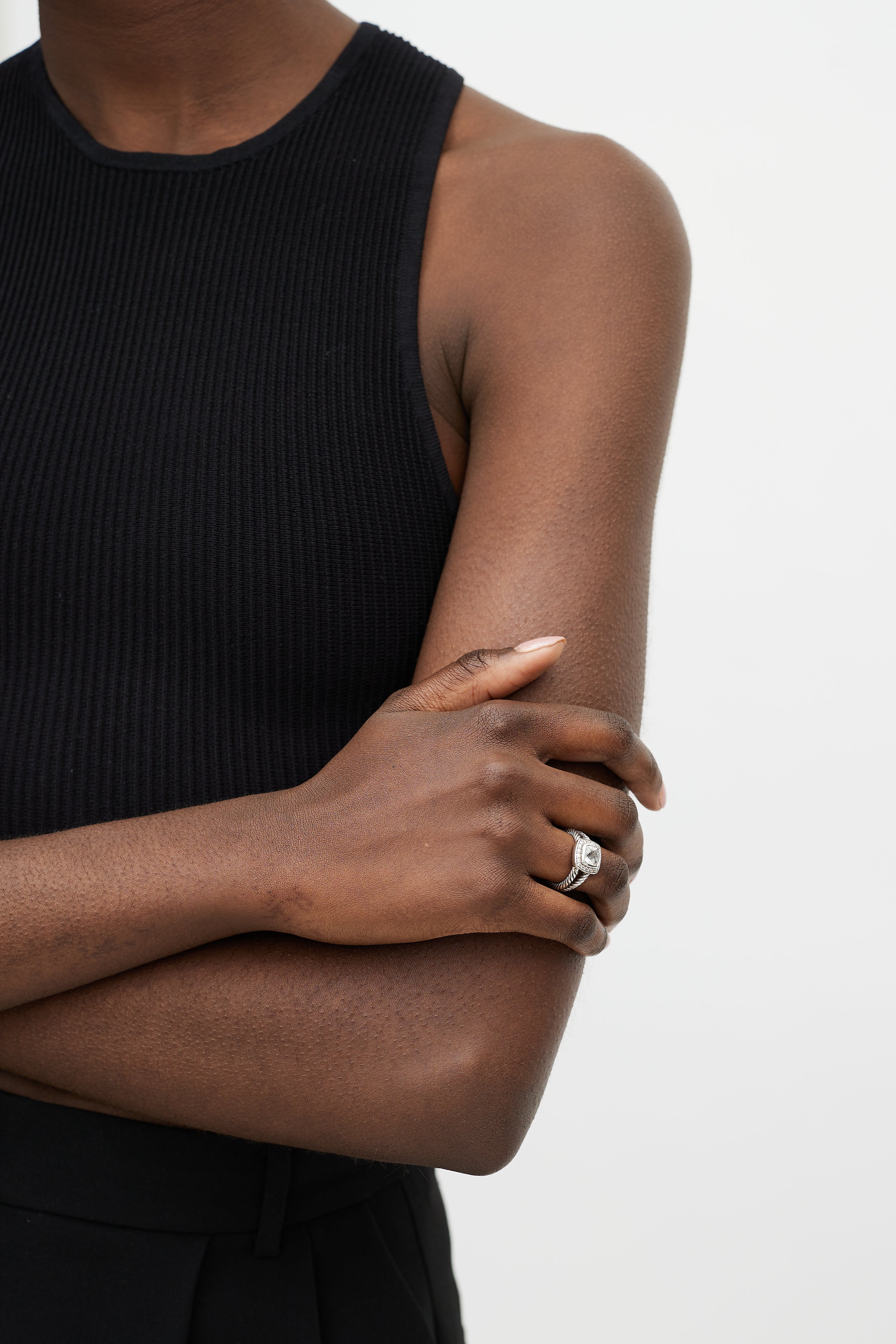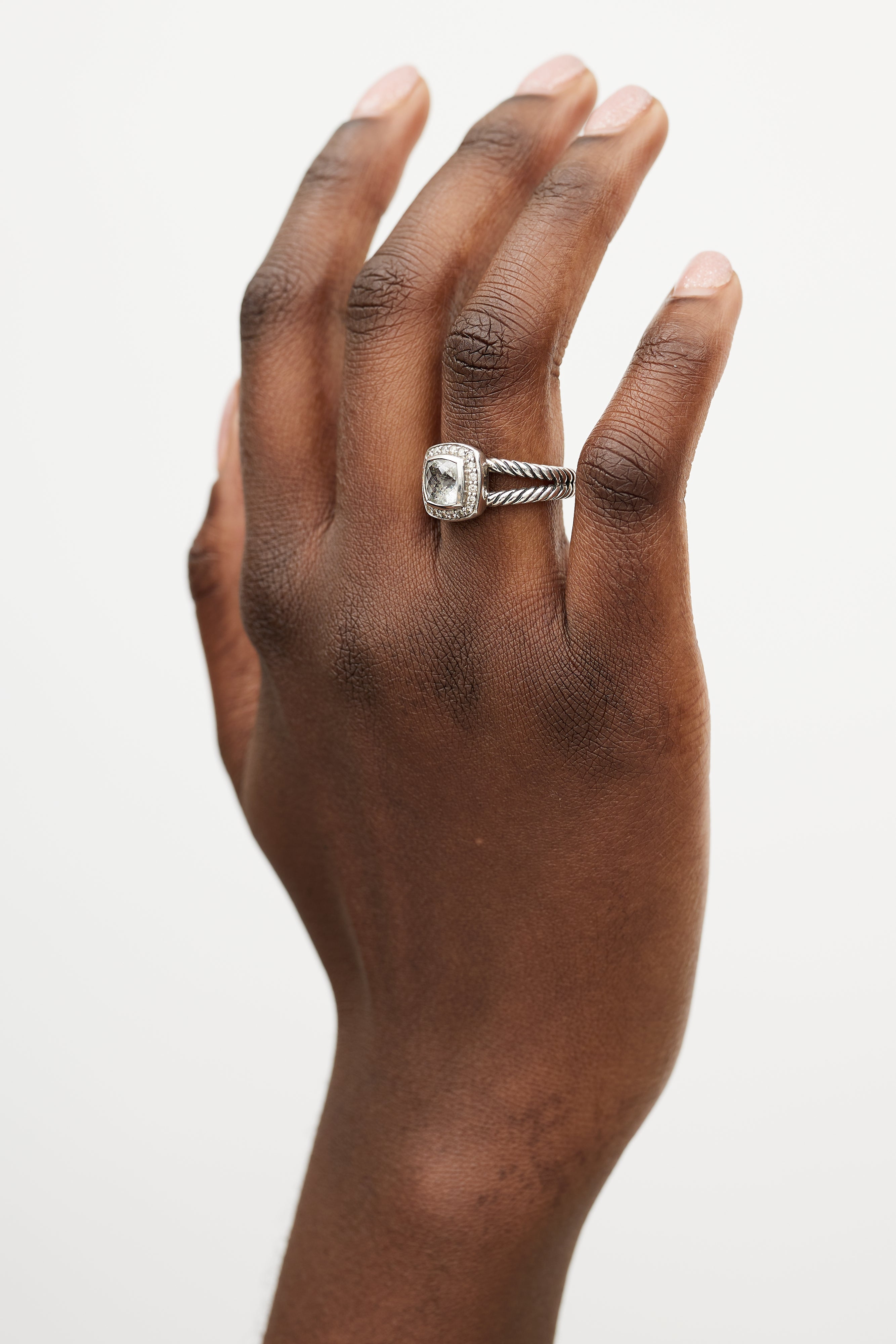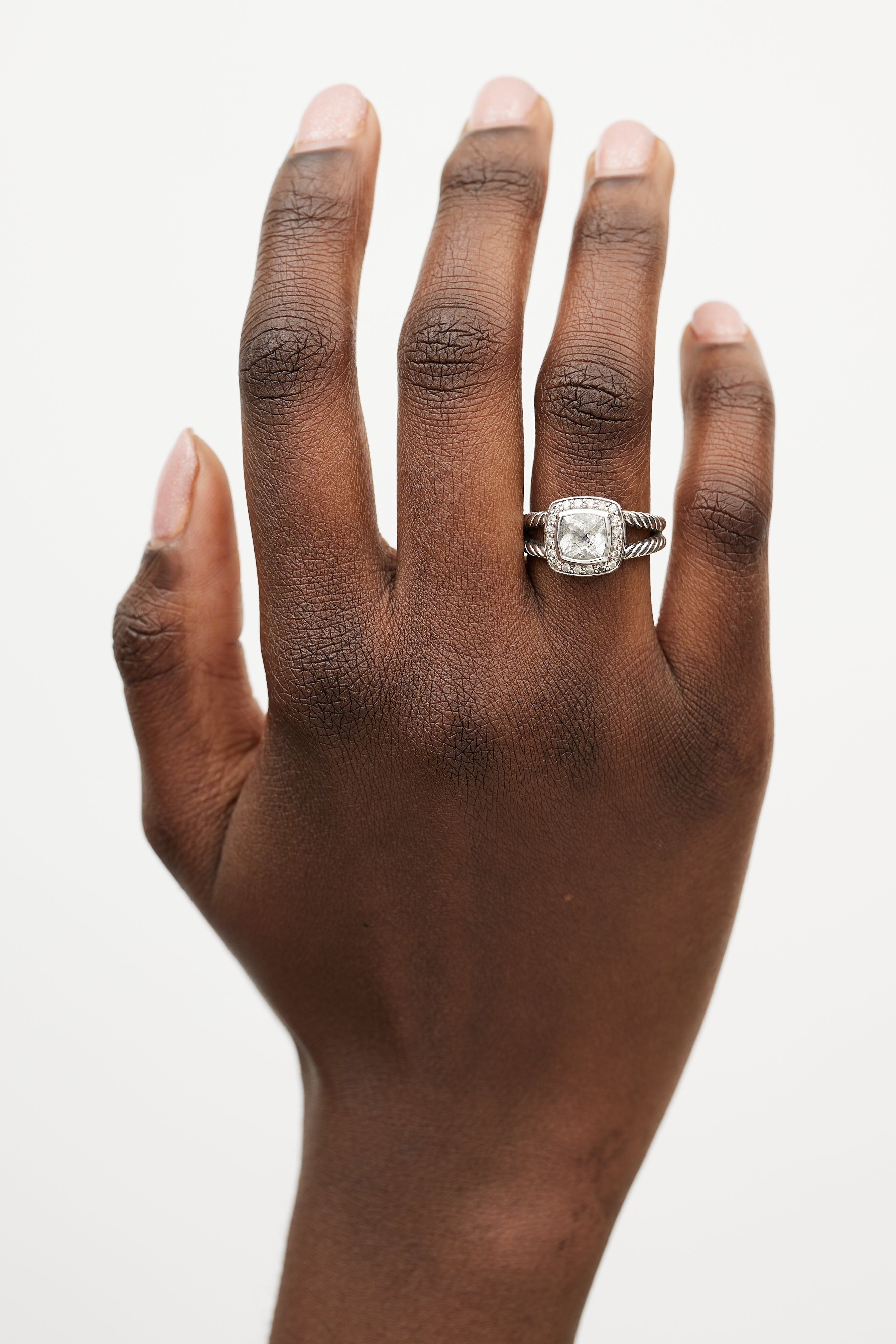 Pre-owned David Yurman sterling silver Petite Albion ring featuring cushion cut faux crystal at centre, pavé diamonds surrounding and two silver rope bands. Comes with original box, polishing cloth and original certificate of authentication.