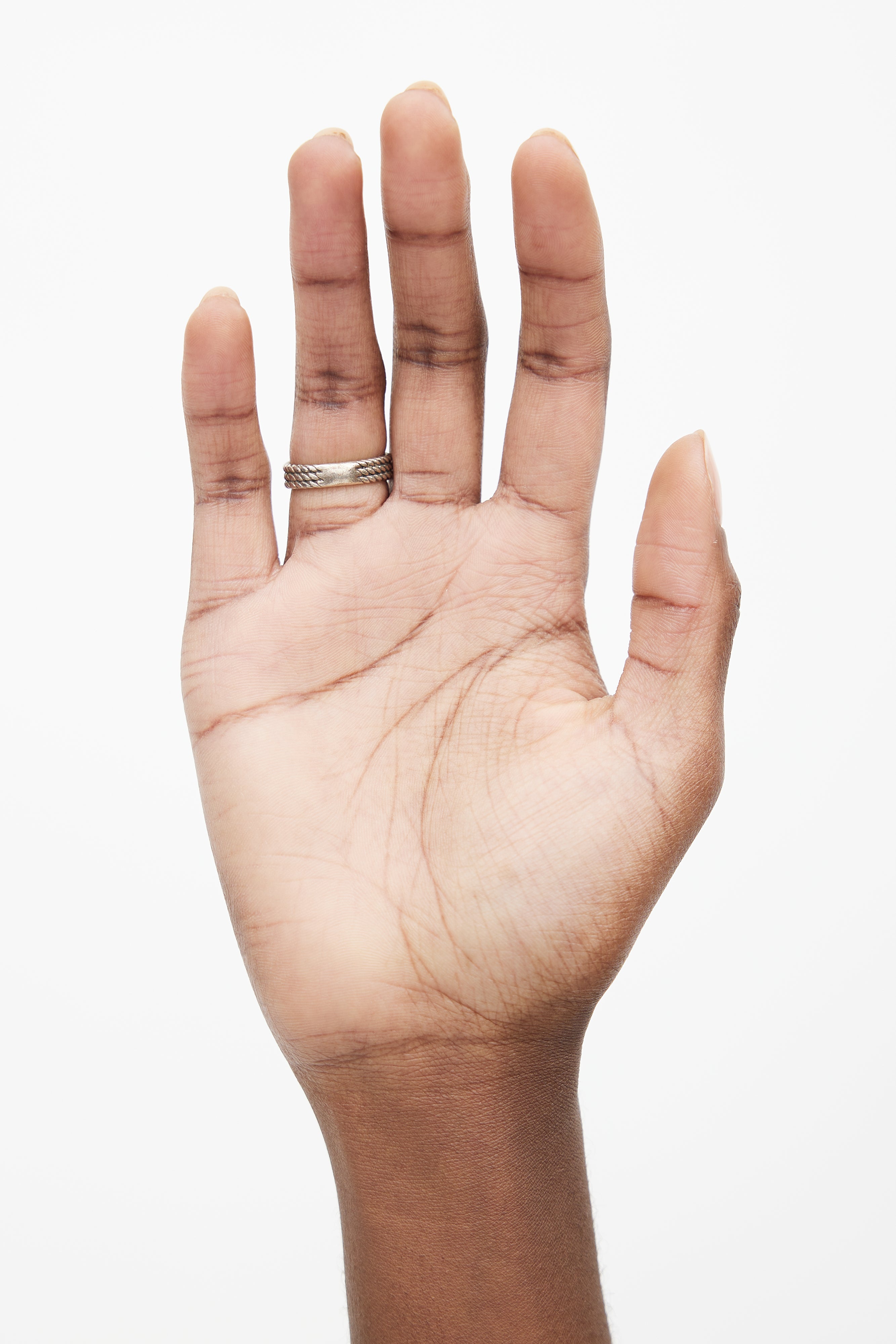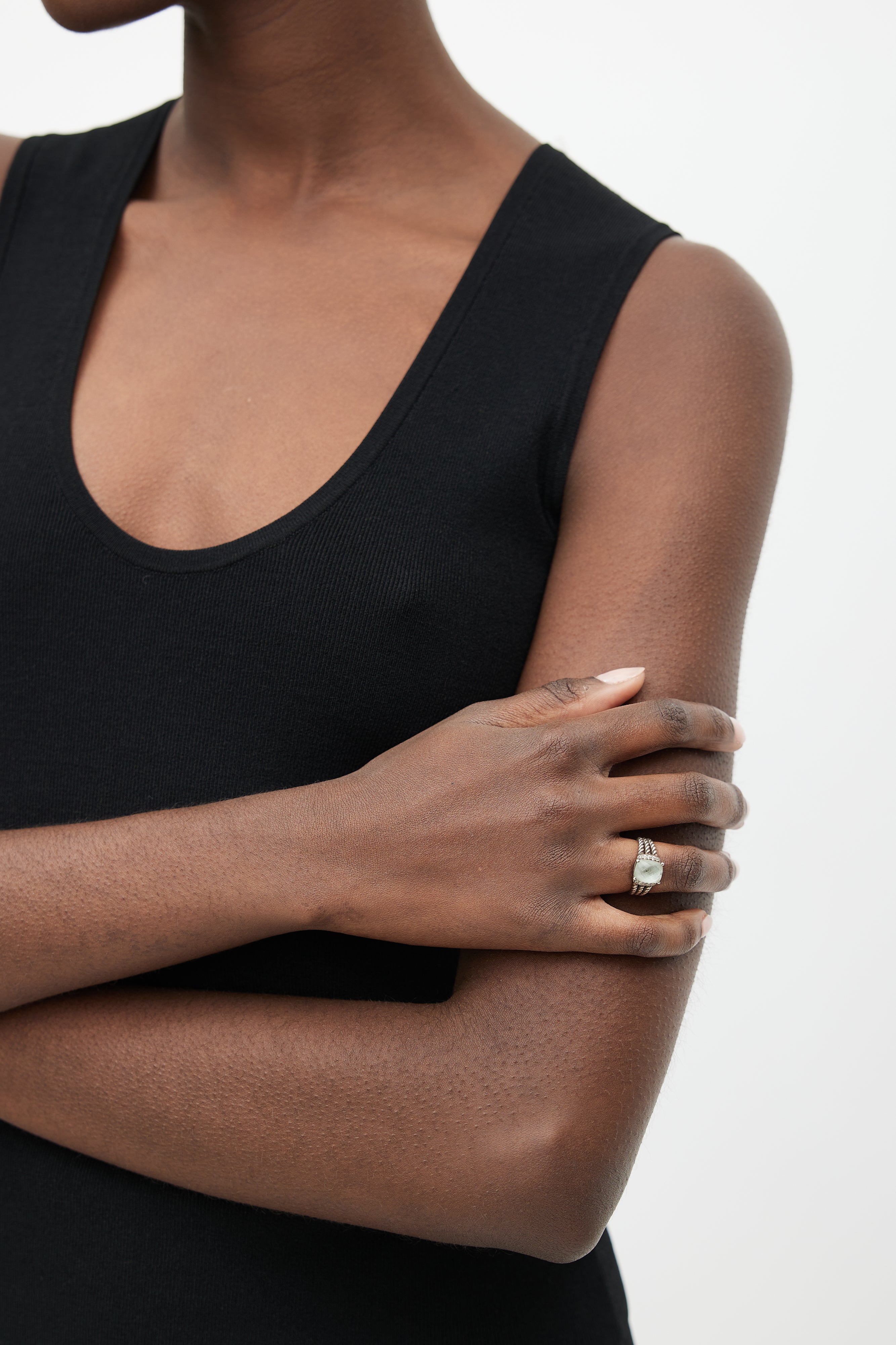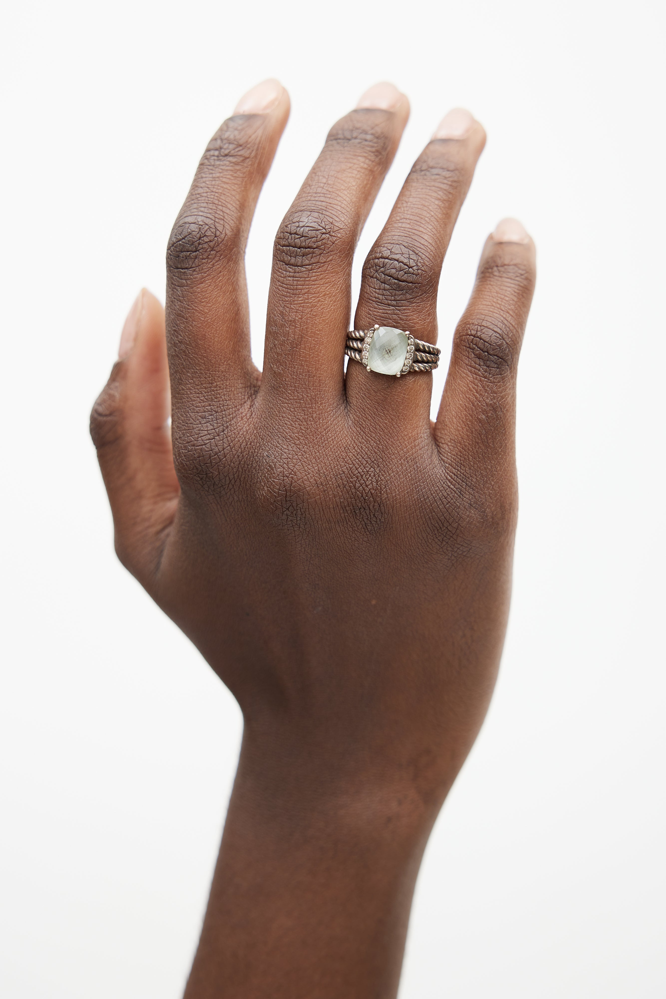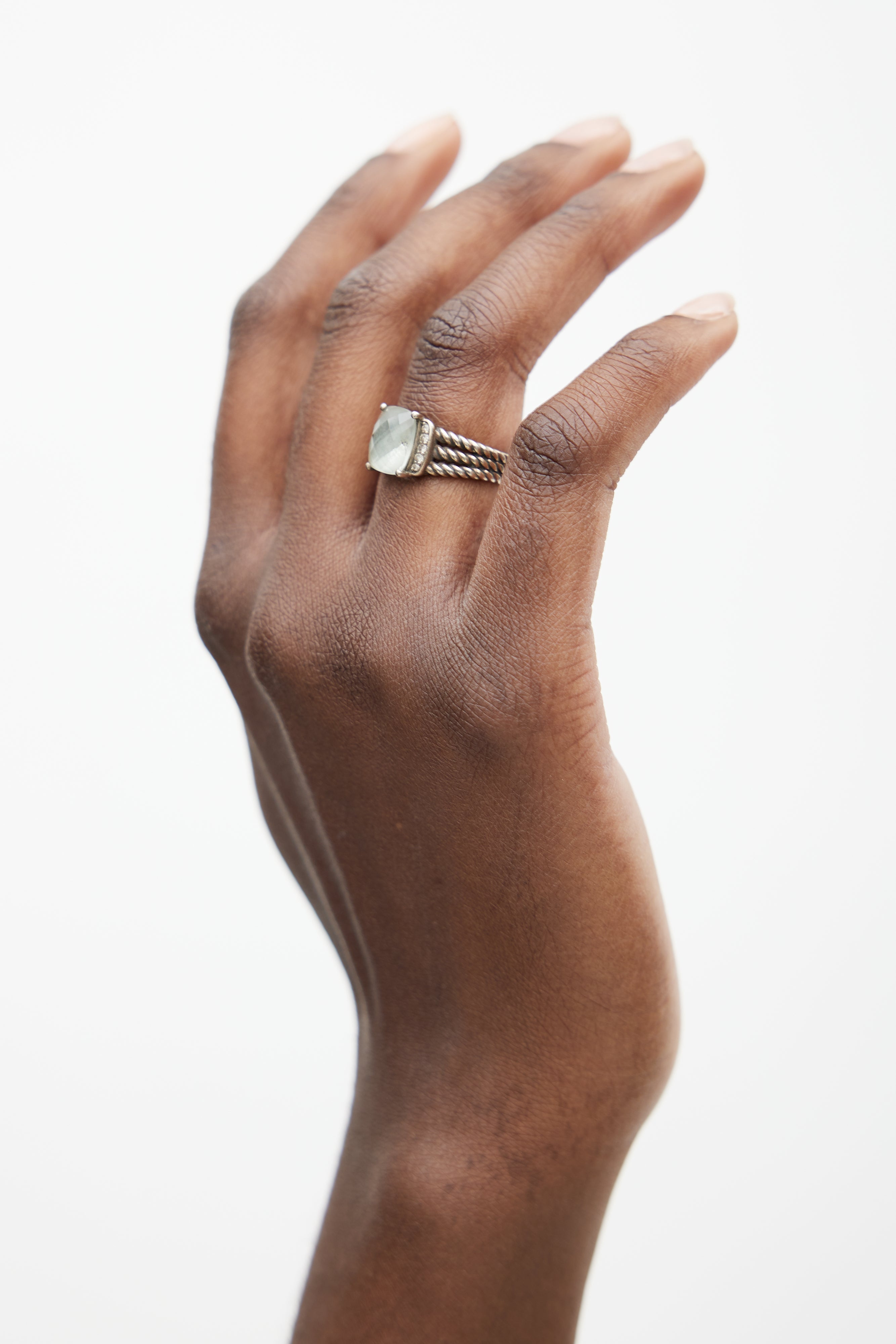 Pre-owned David Yurman silver Petite Wheaton ring featuring gem charm, braided ring, and crystal embellishment at face. Comes with original pouch.