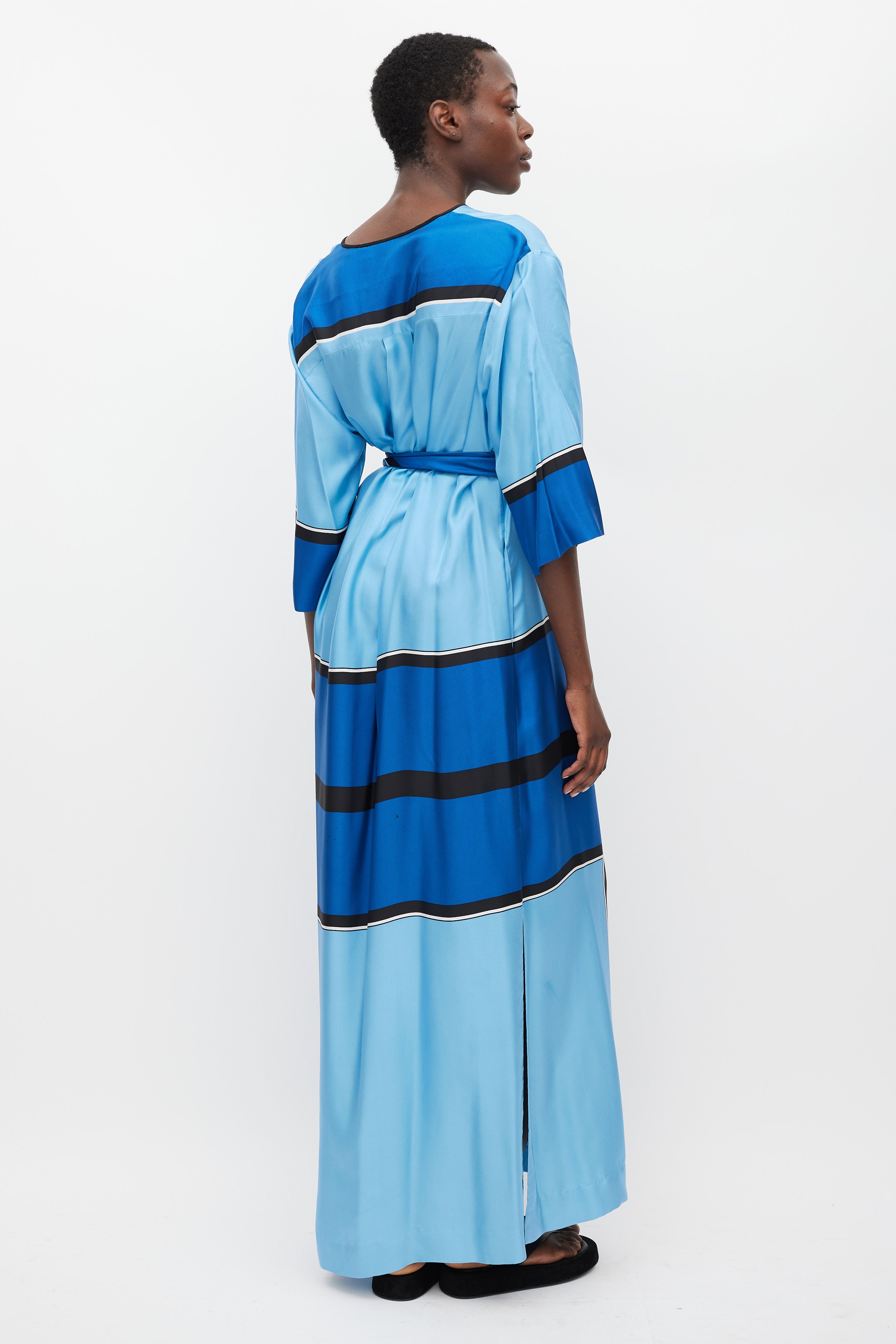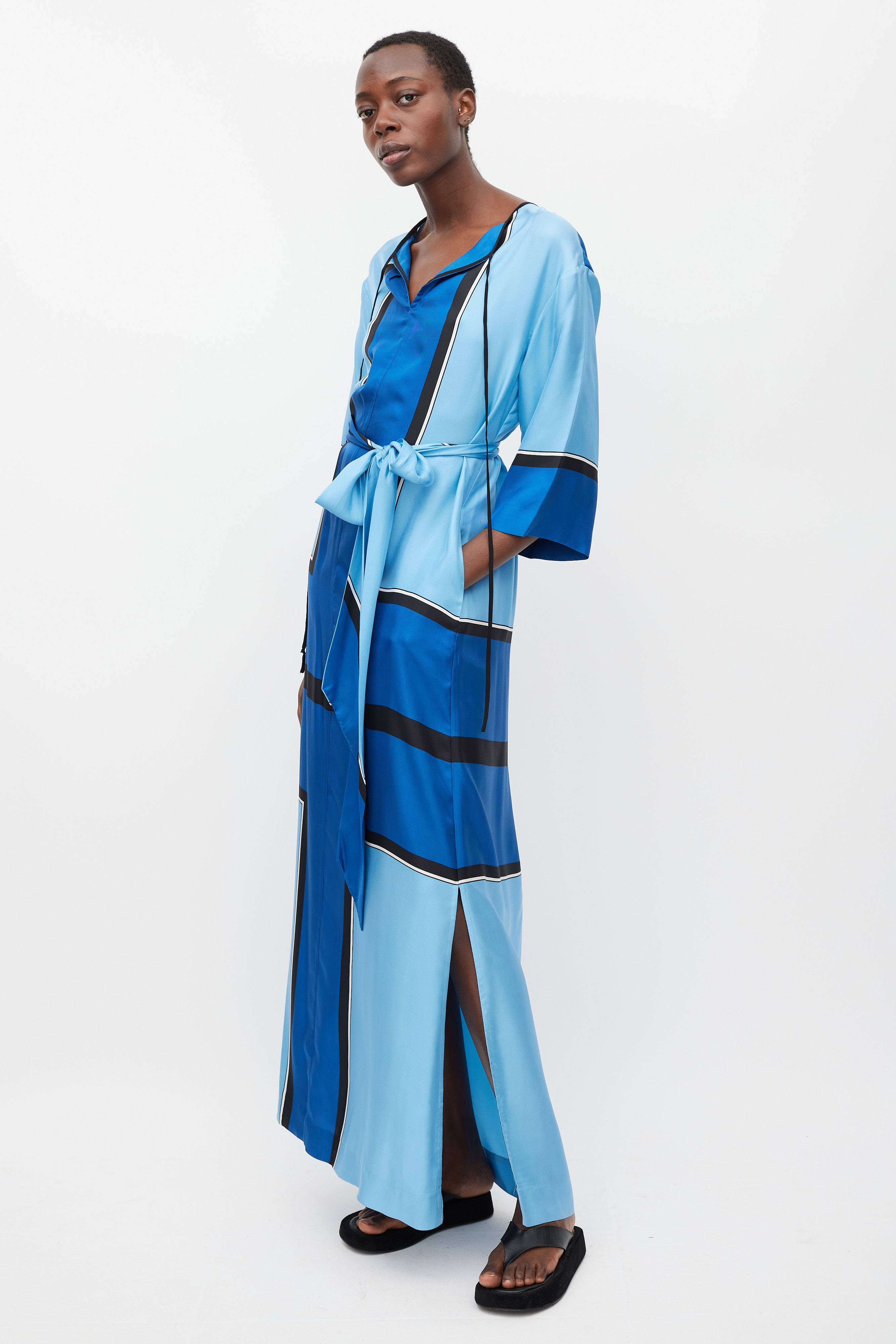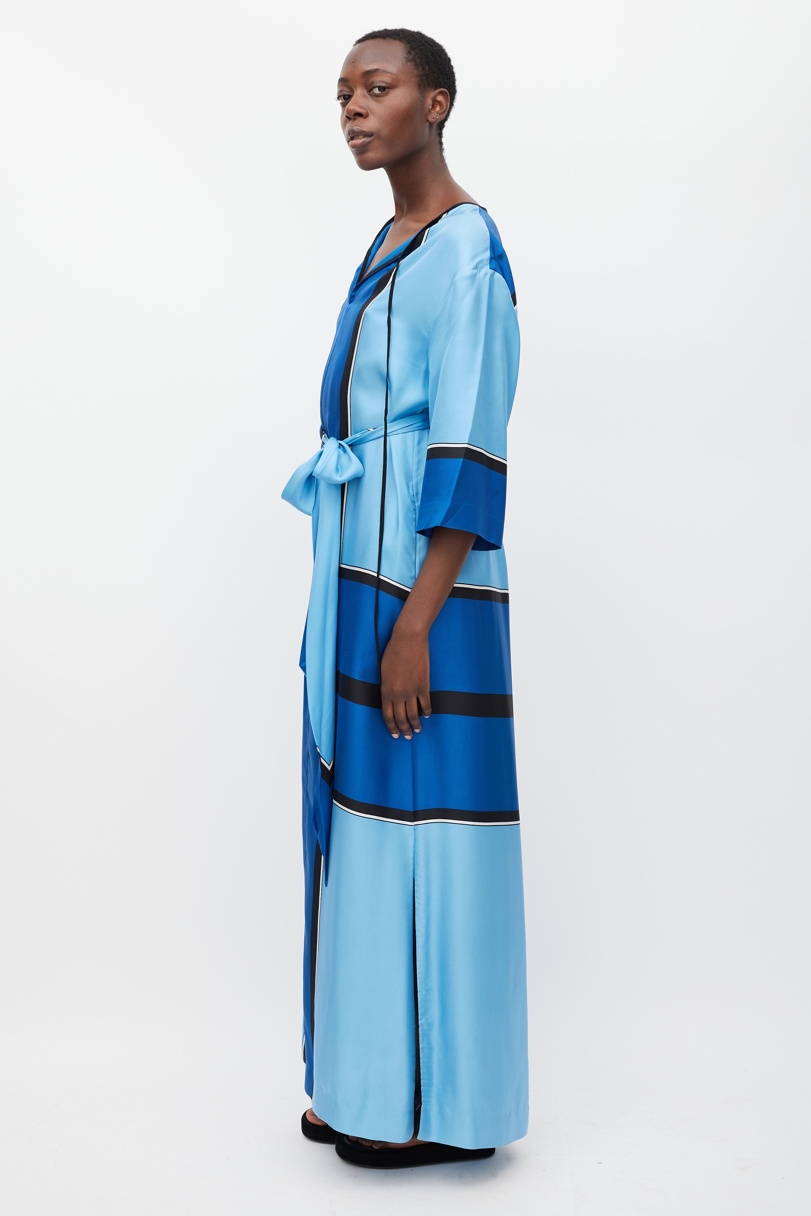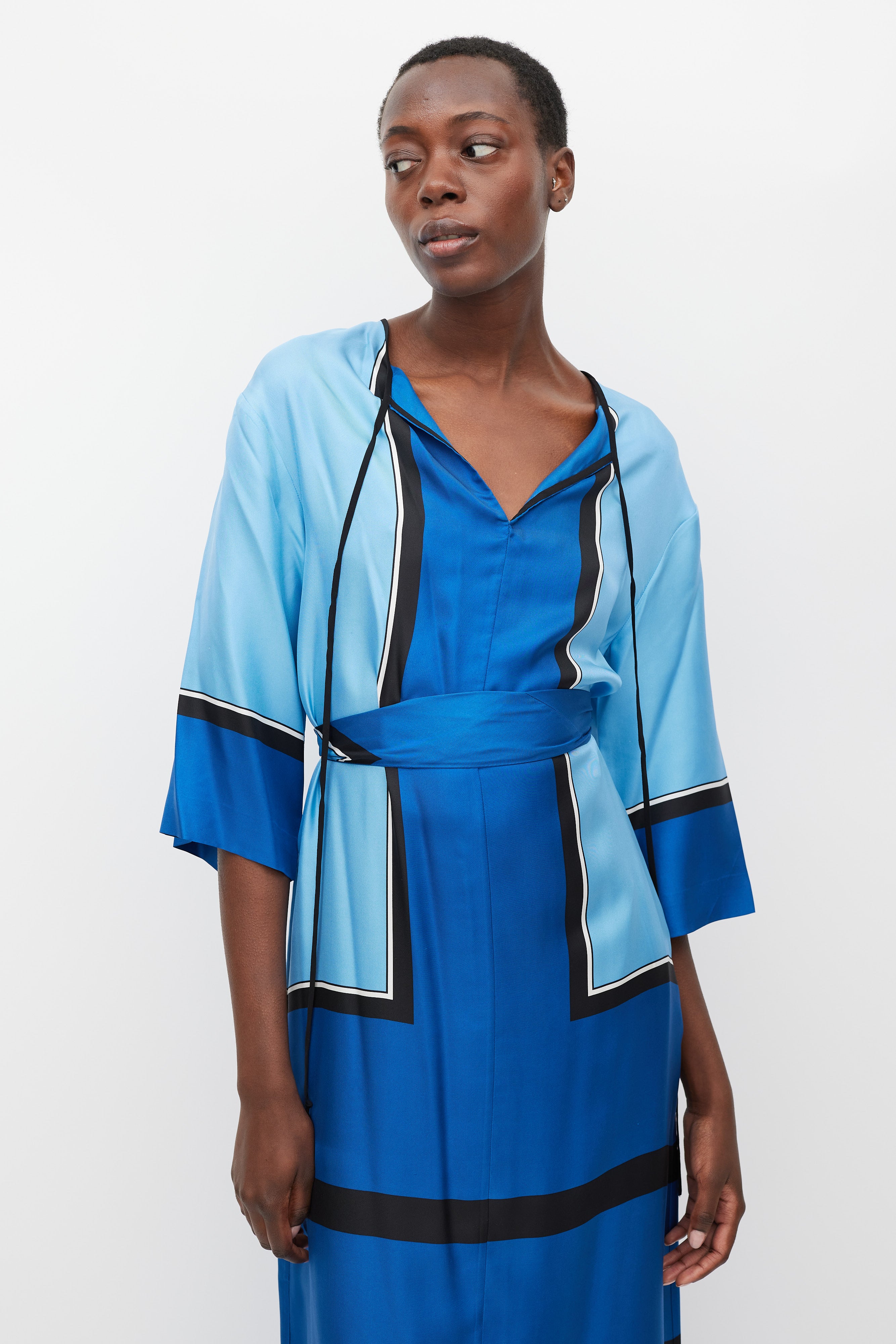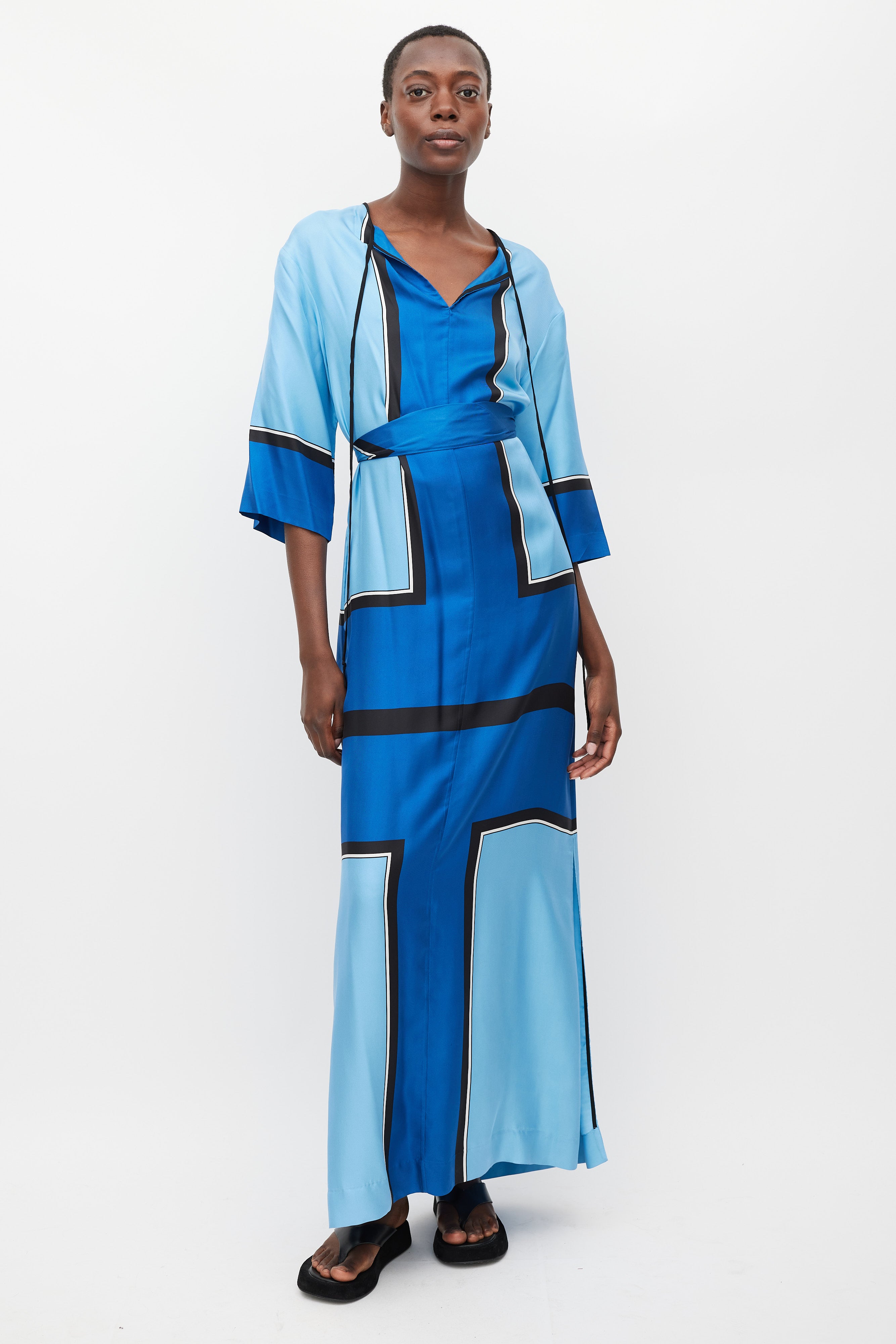 Pre-owned Diane von Furstenberg blue and multicolour silk maxi dress featuring a round tie neck, panel print throughout, tie waist, in seam pockets, side slits, and three quarter sleeves.