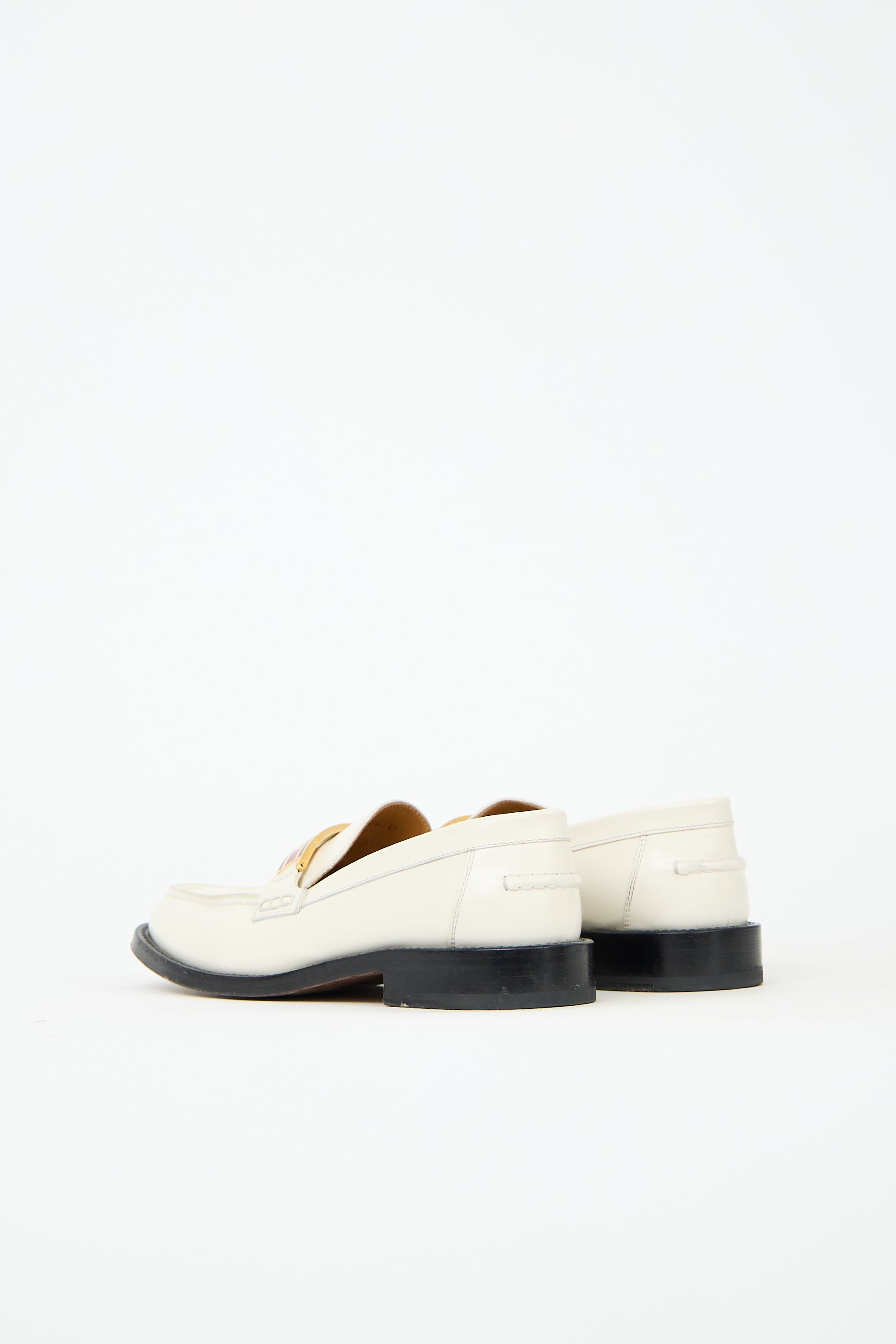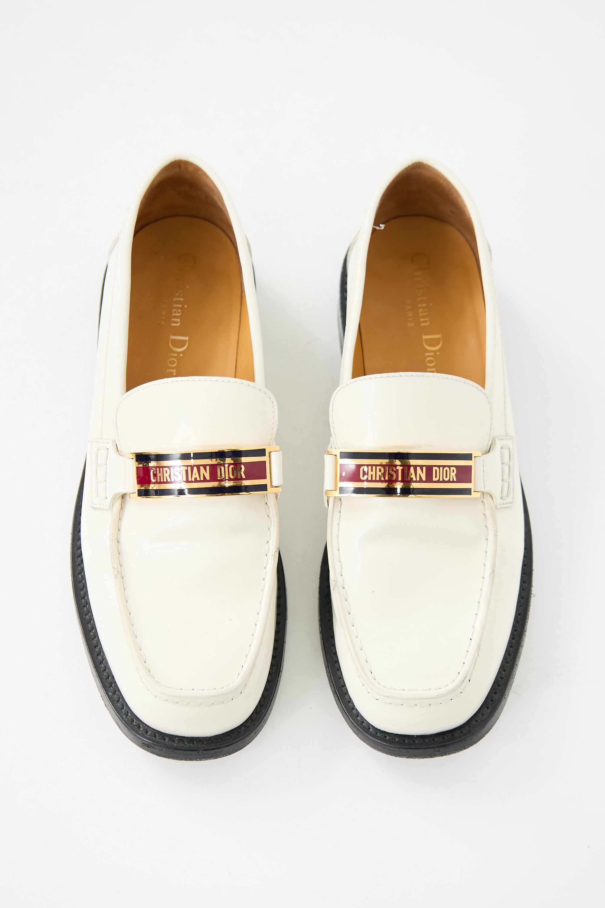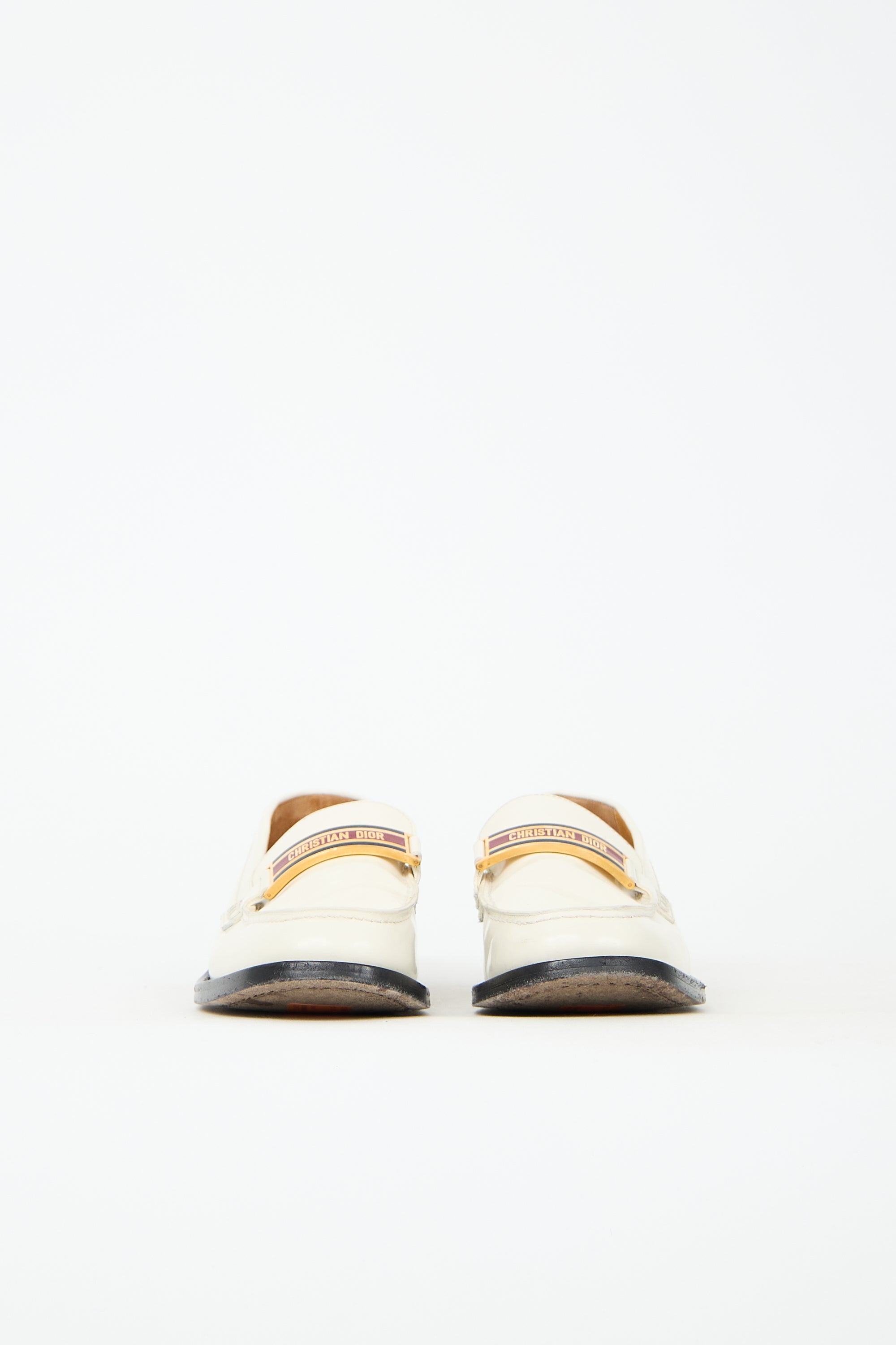 Pre-owned Dior white patent leather loafers featuring square toe, rolled edges, inlaid logo plaque at vamp, and black leather outsole.