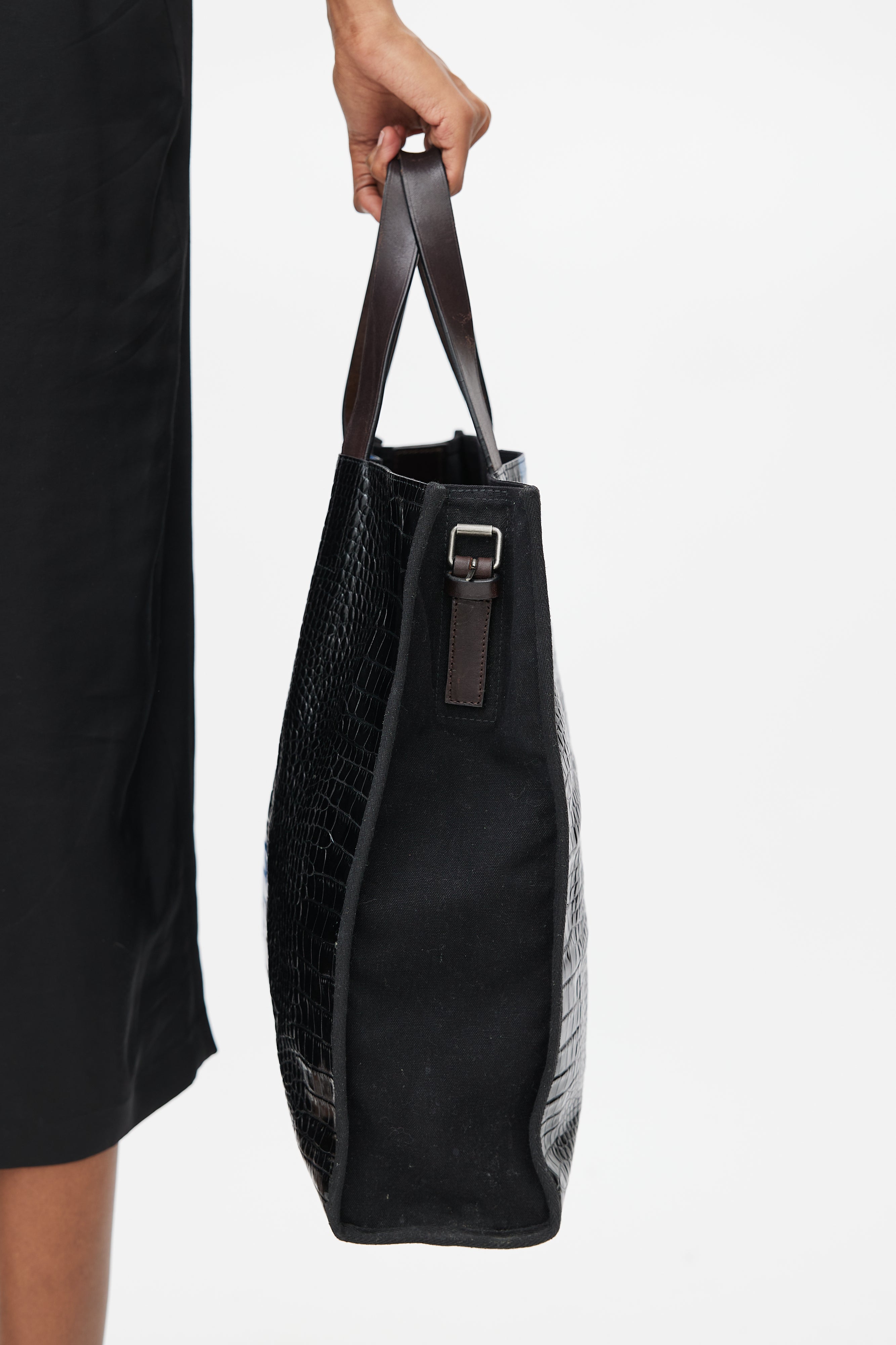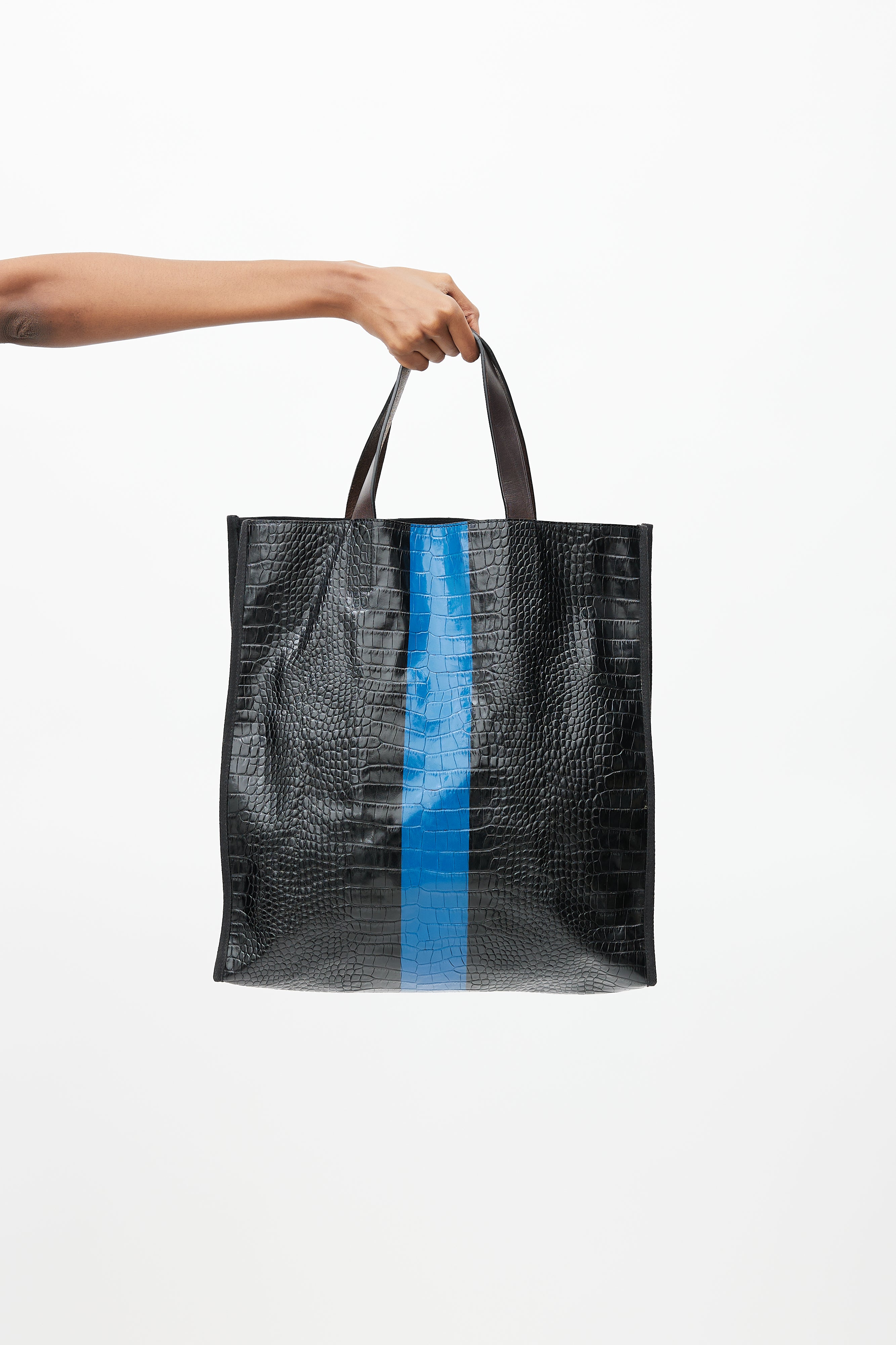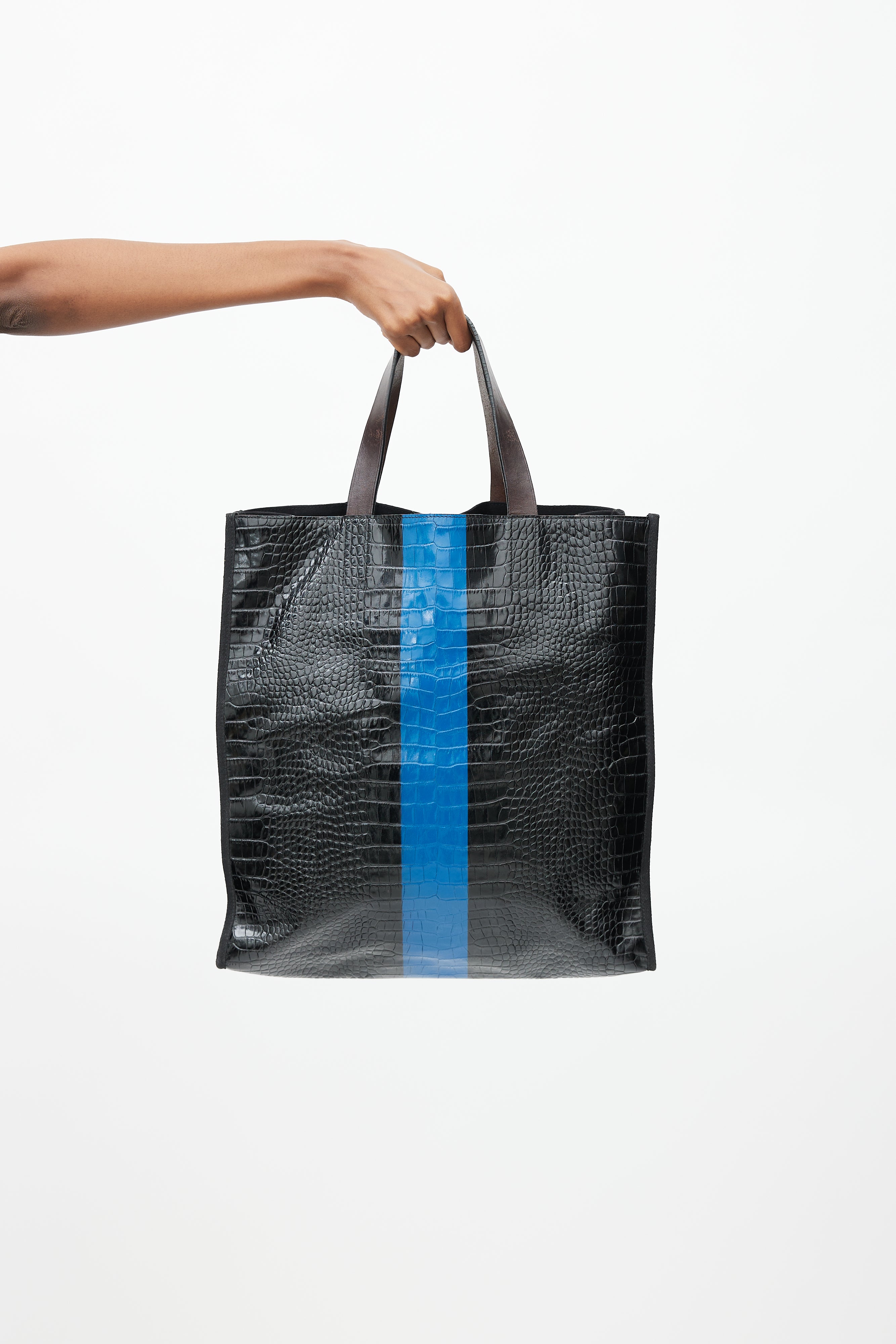 Pre-owned Dries Van Noten black tote bag featuring croc effect leather, blue stripe at centre, flat top handles, canvas side and lining, open compartment, and one zip pocket inside.