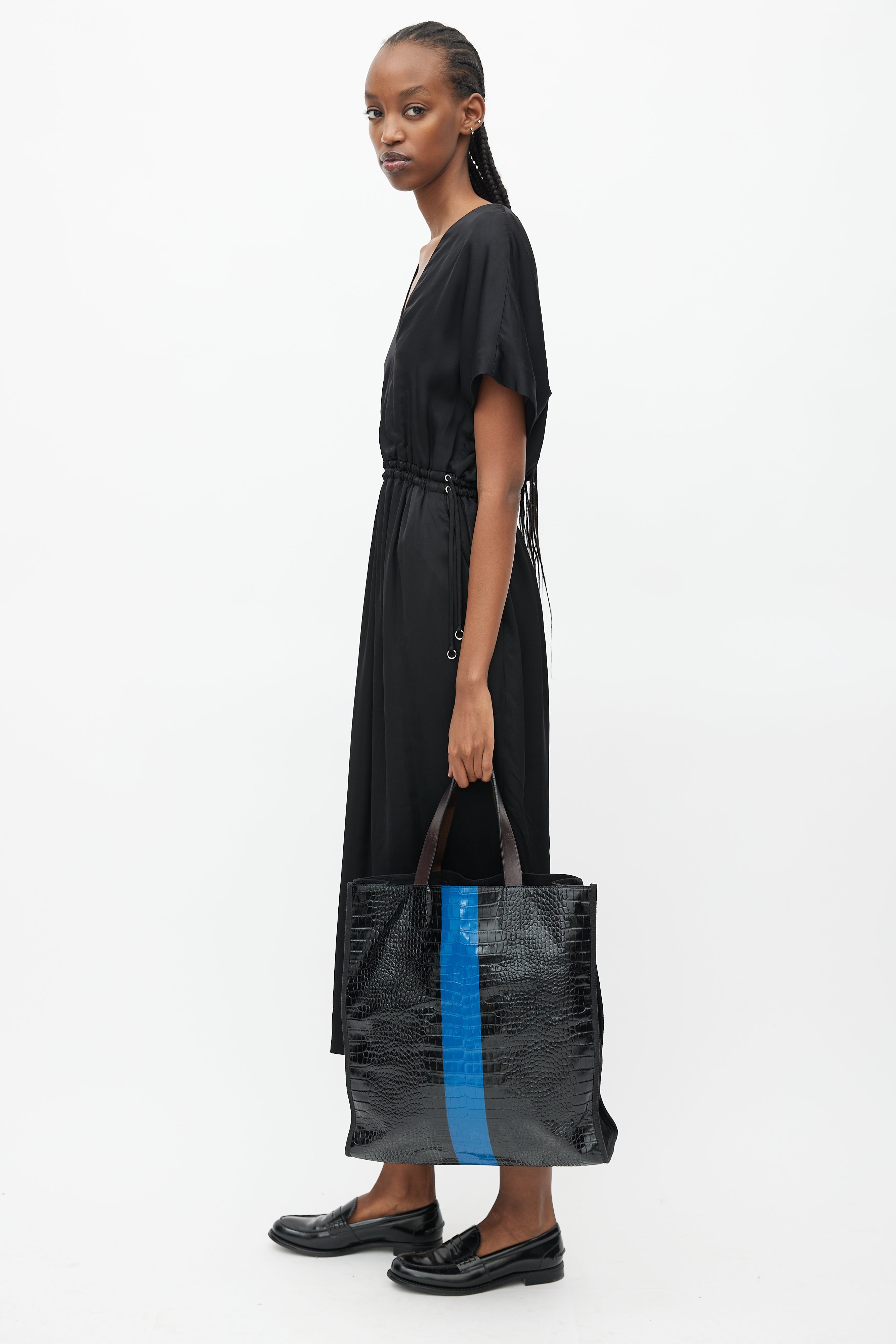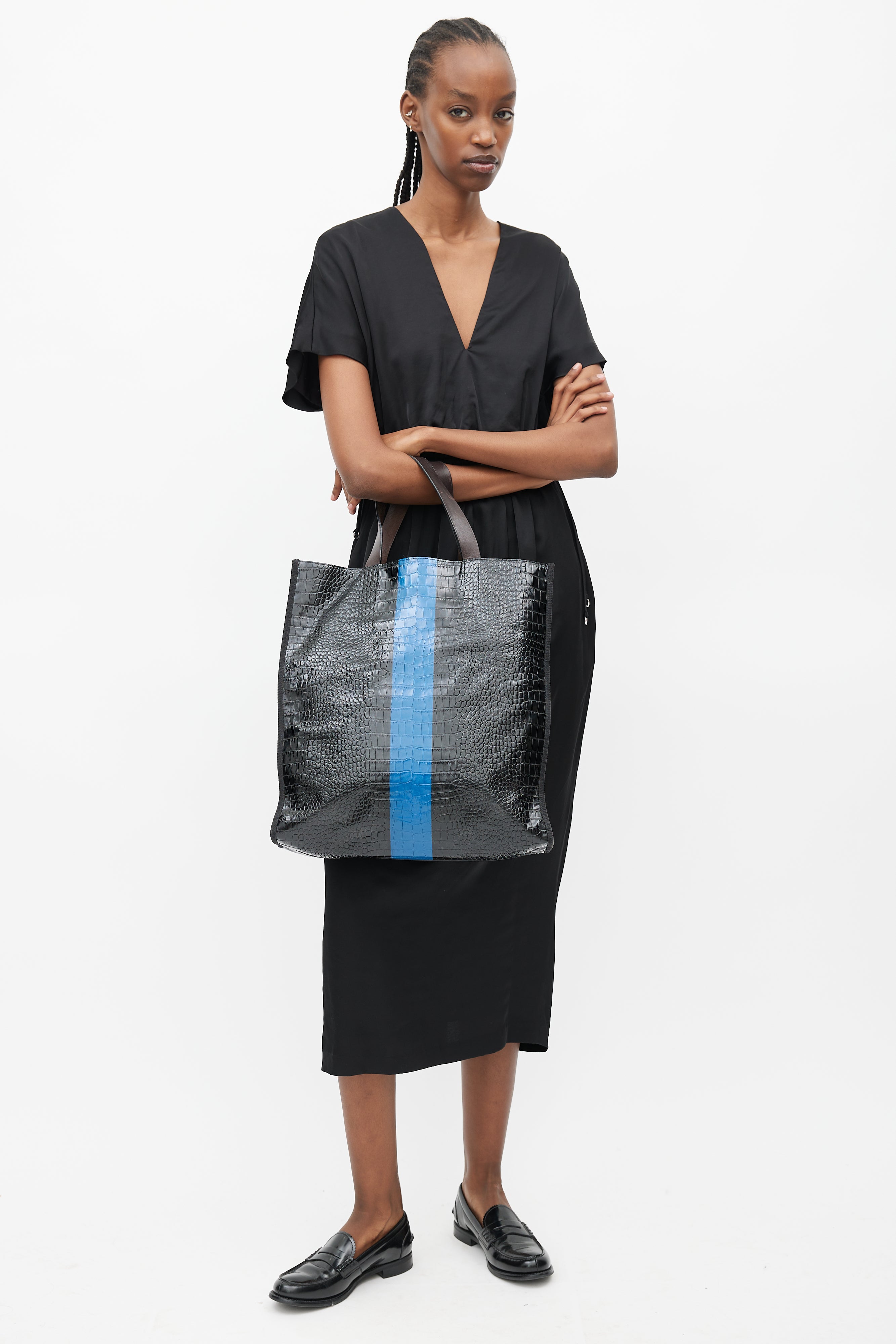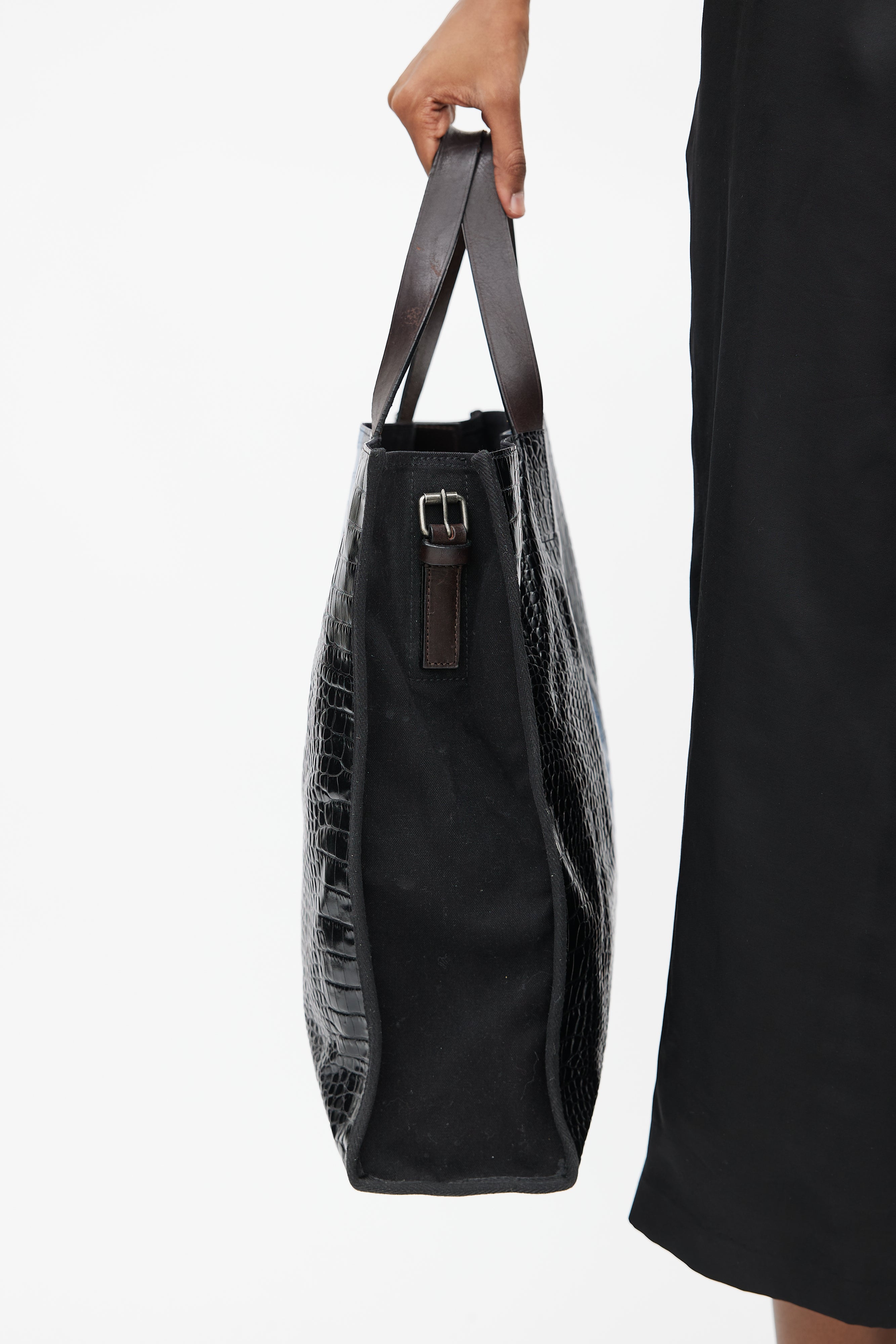 Pre-owned Dries Van Noten black tote bag featuring croc effect leather, blue stripe at centre, flat top handles, canvas side and lining, open compartment, and one zip pocket inside.