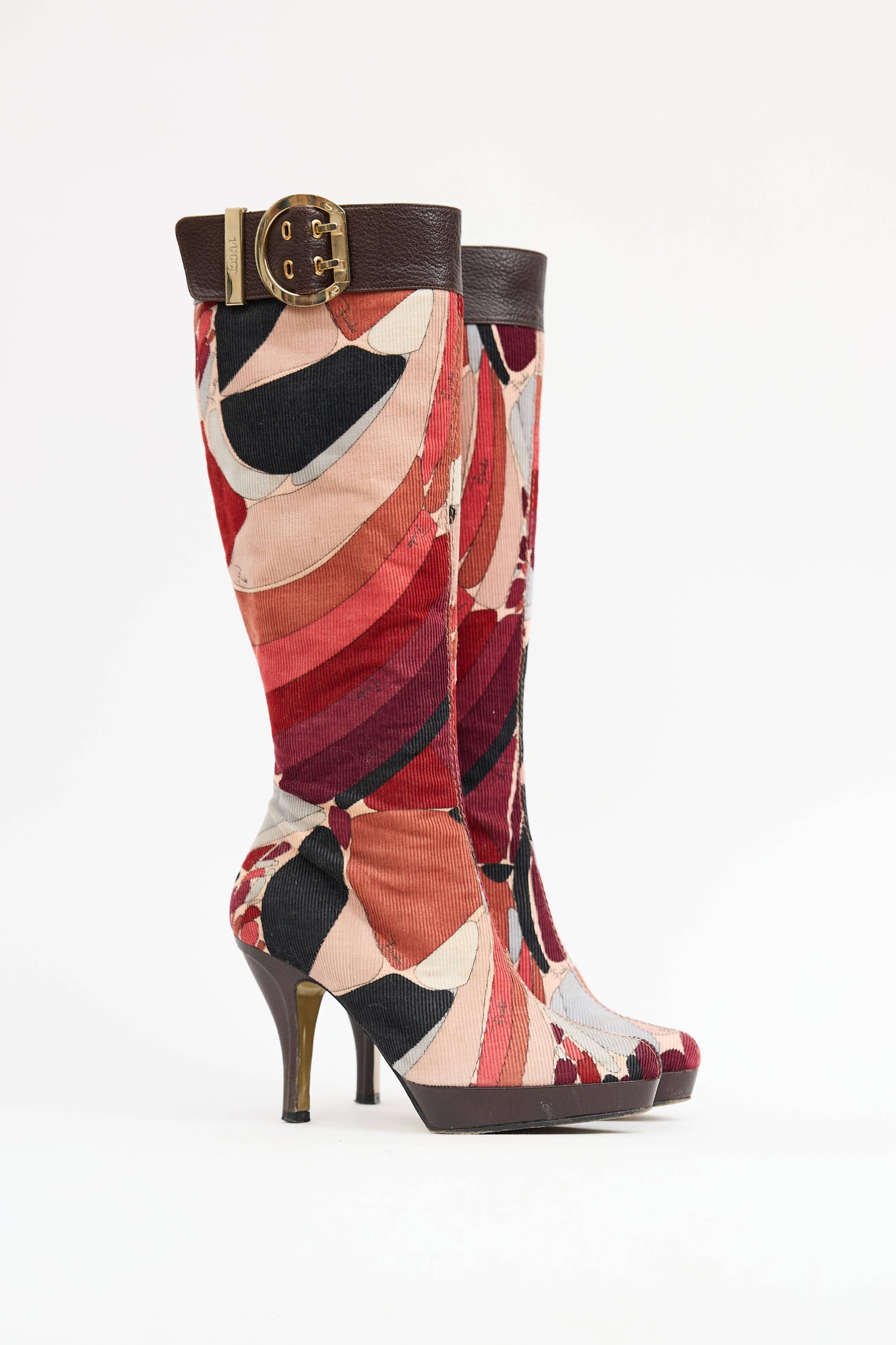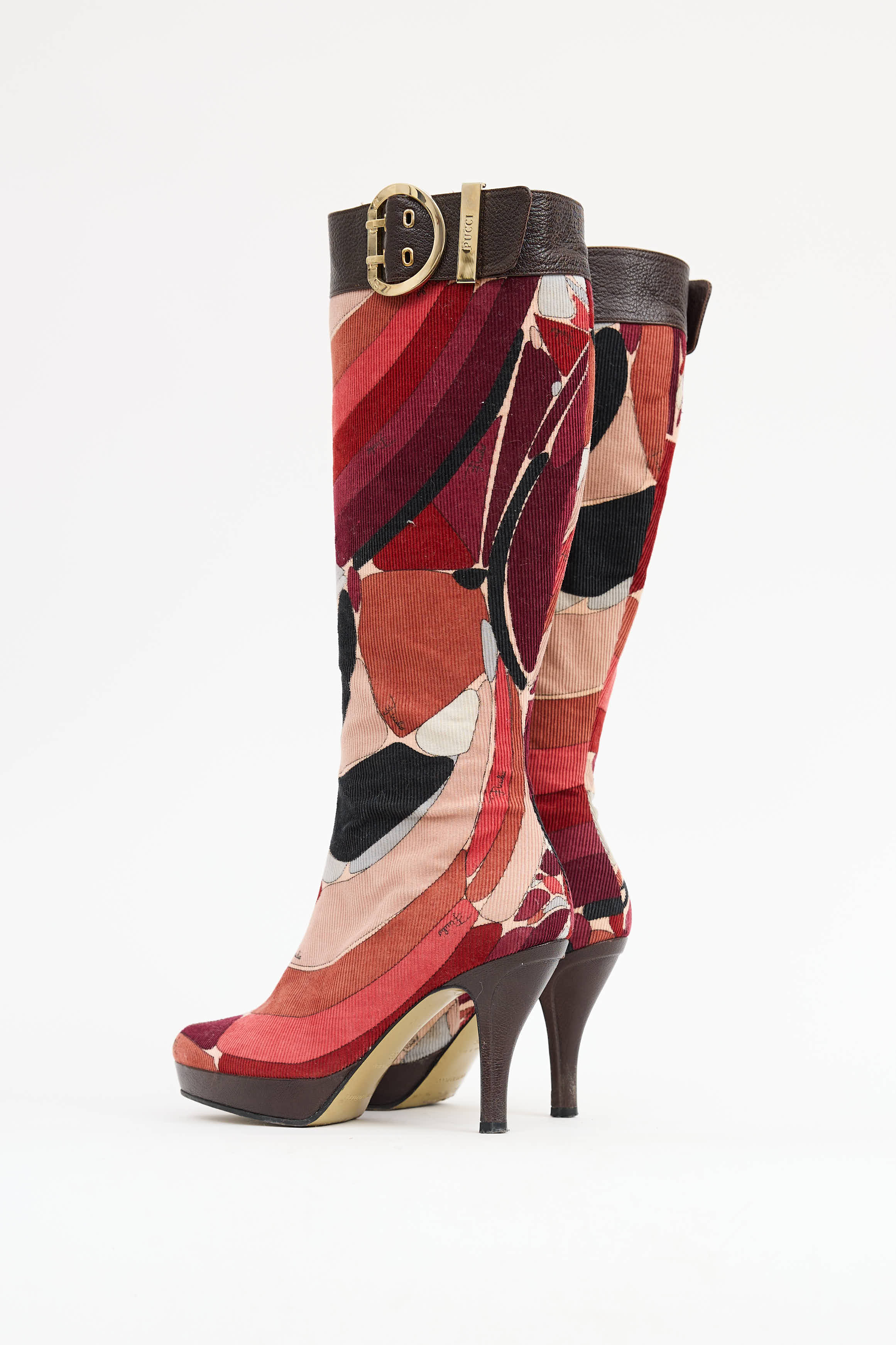 Pre-owned Emilio Pucci burgundy corduroy boots featuring a multicolour pattern throughout, pointed toe, gold tone buckle hardware at collar, platform midsole, leather wrapped stiletto heel, and zip closure at side.