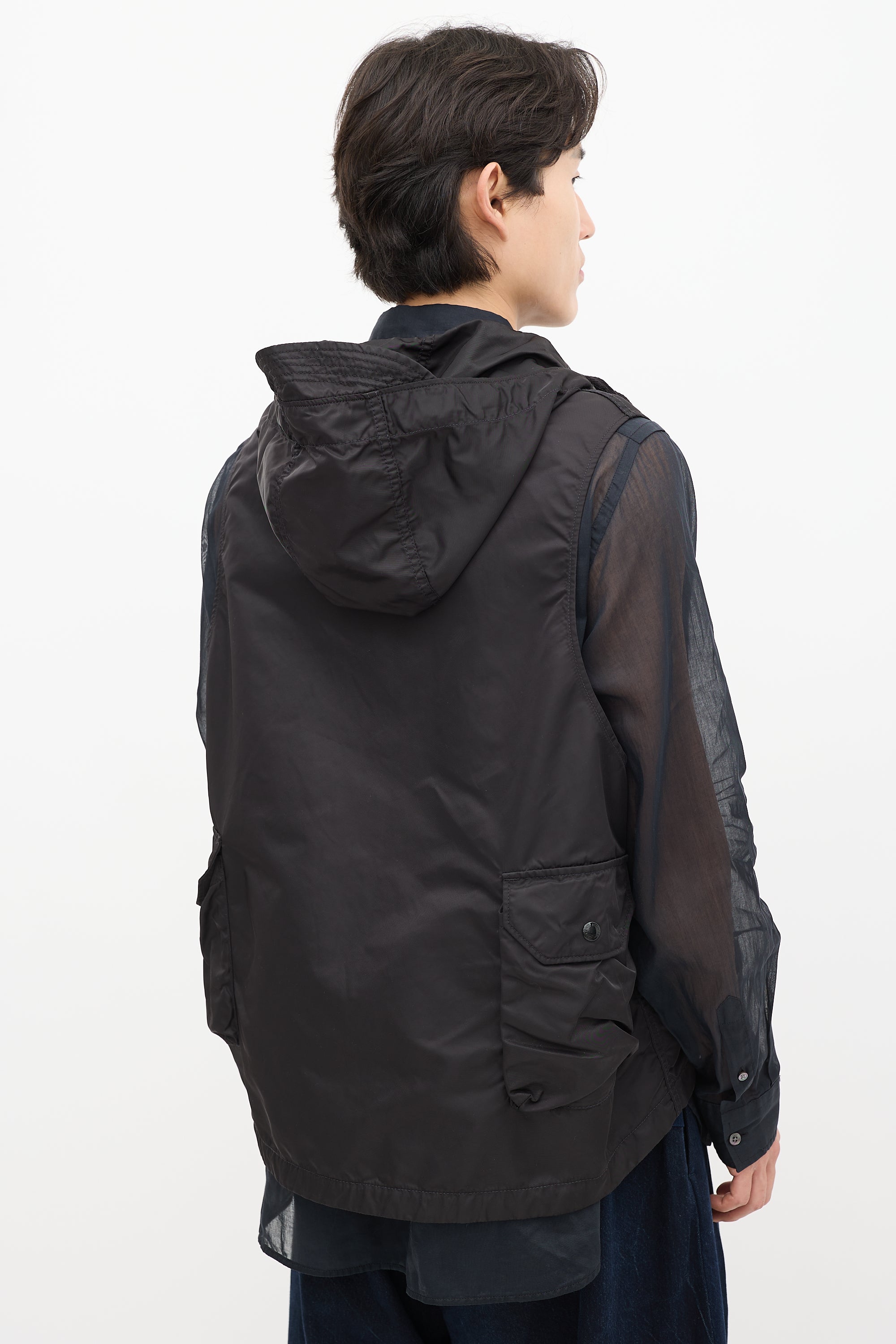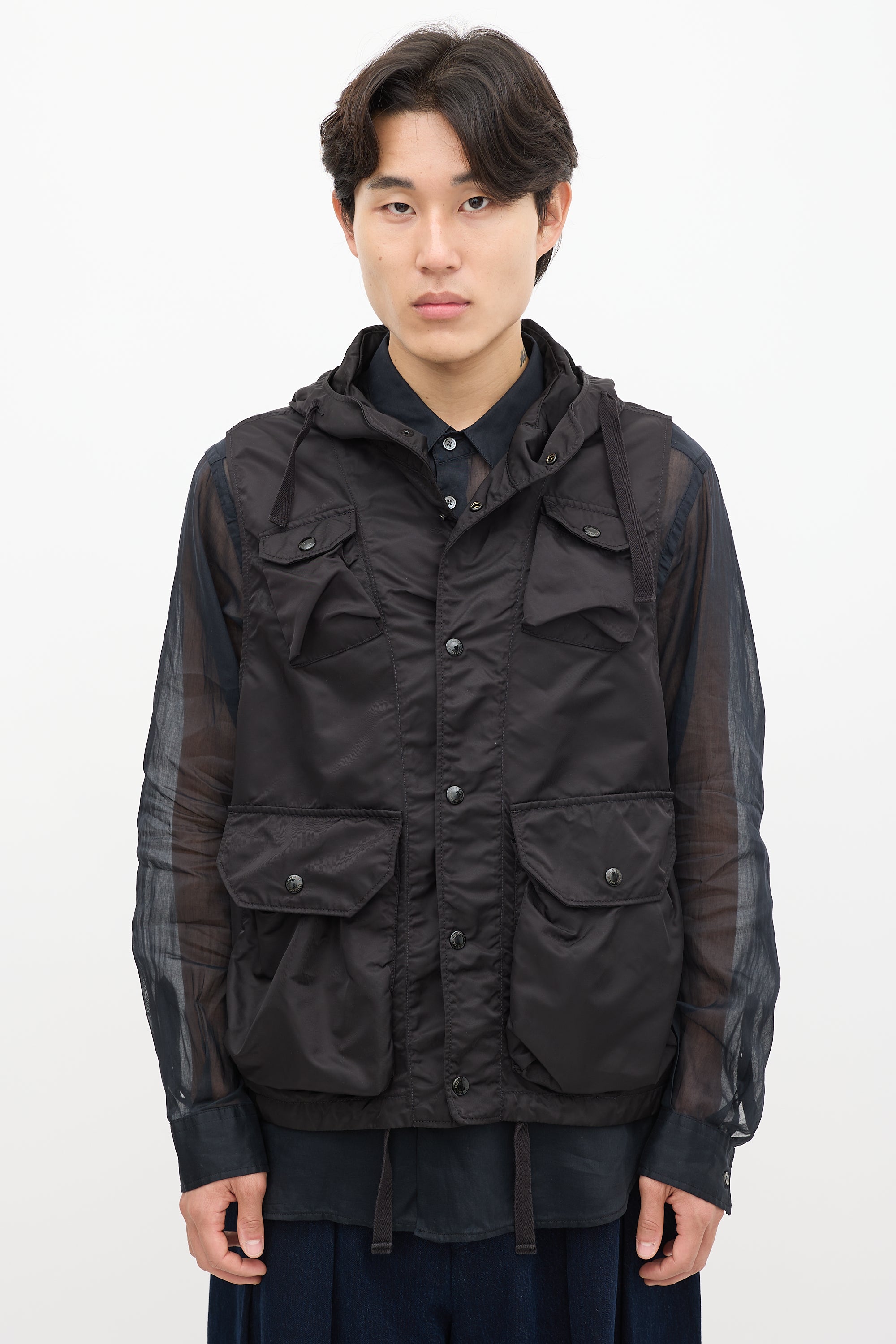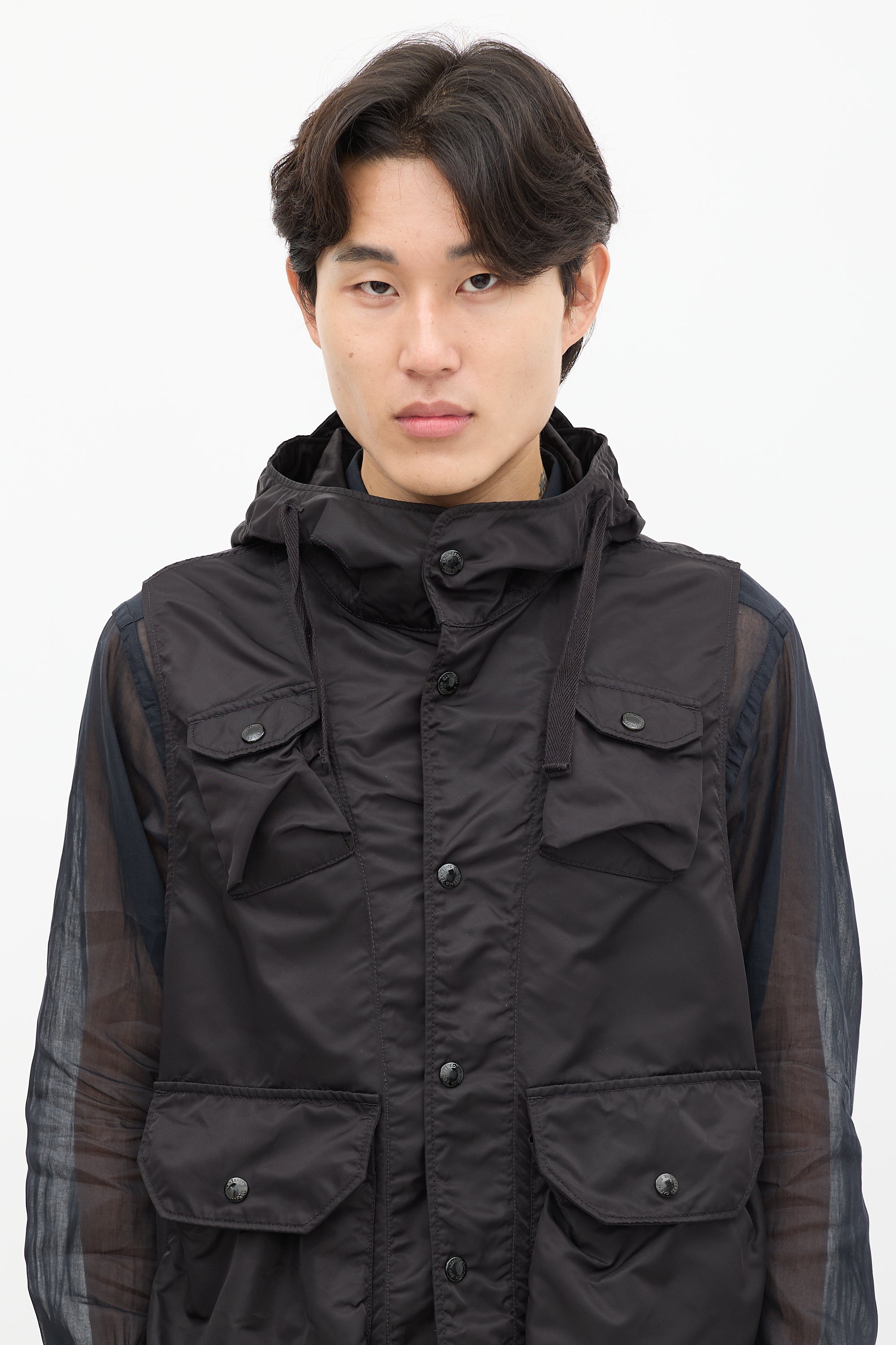 Pre-owned Engineered Garments black nylon vest featuring a drawstring hood, sleeveless styling, four cargo pockets at front, drawstring hem, two cargo pockets at back, and snap button up closure.