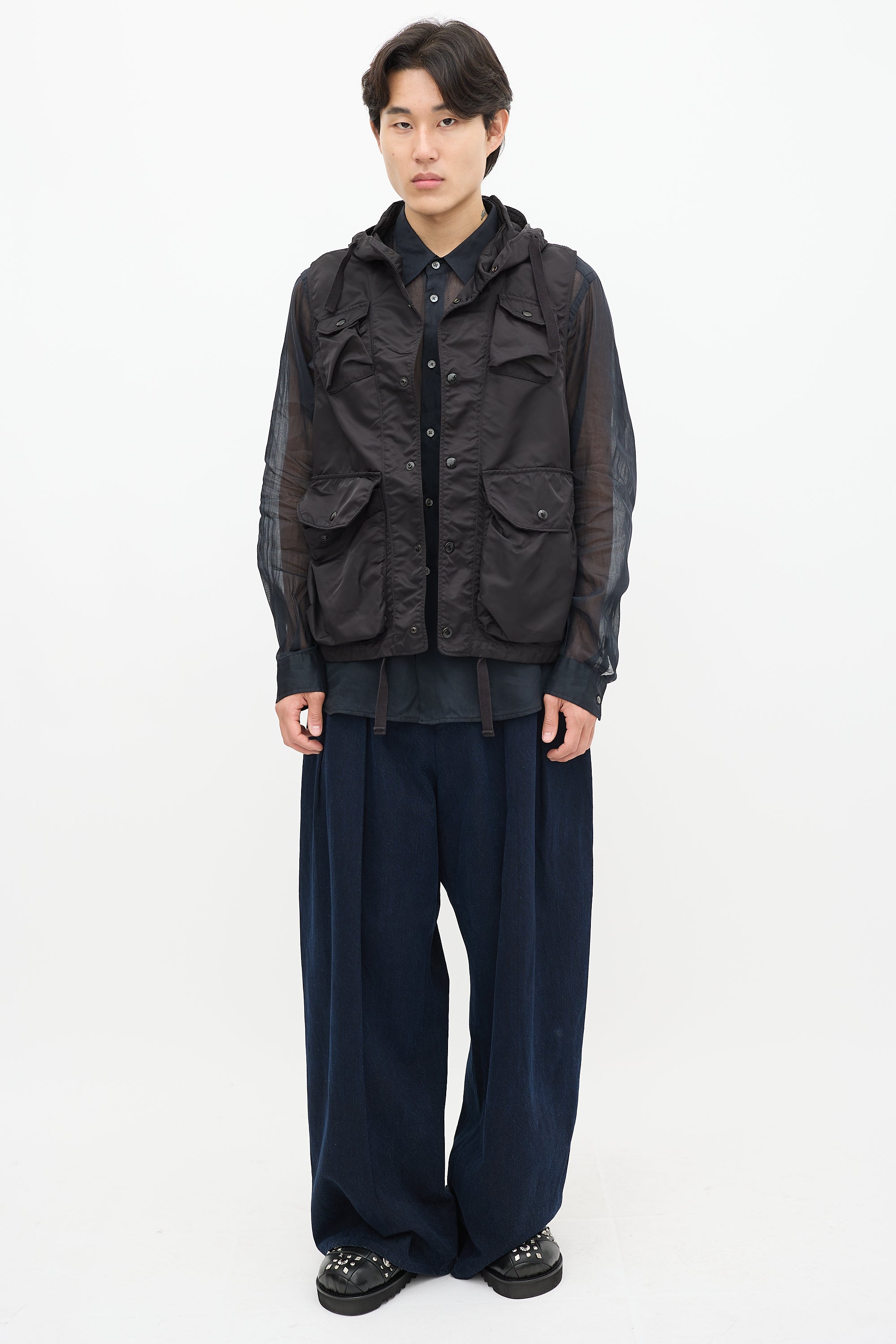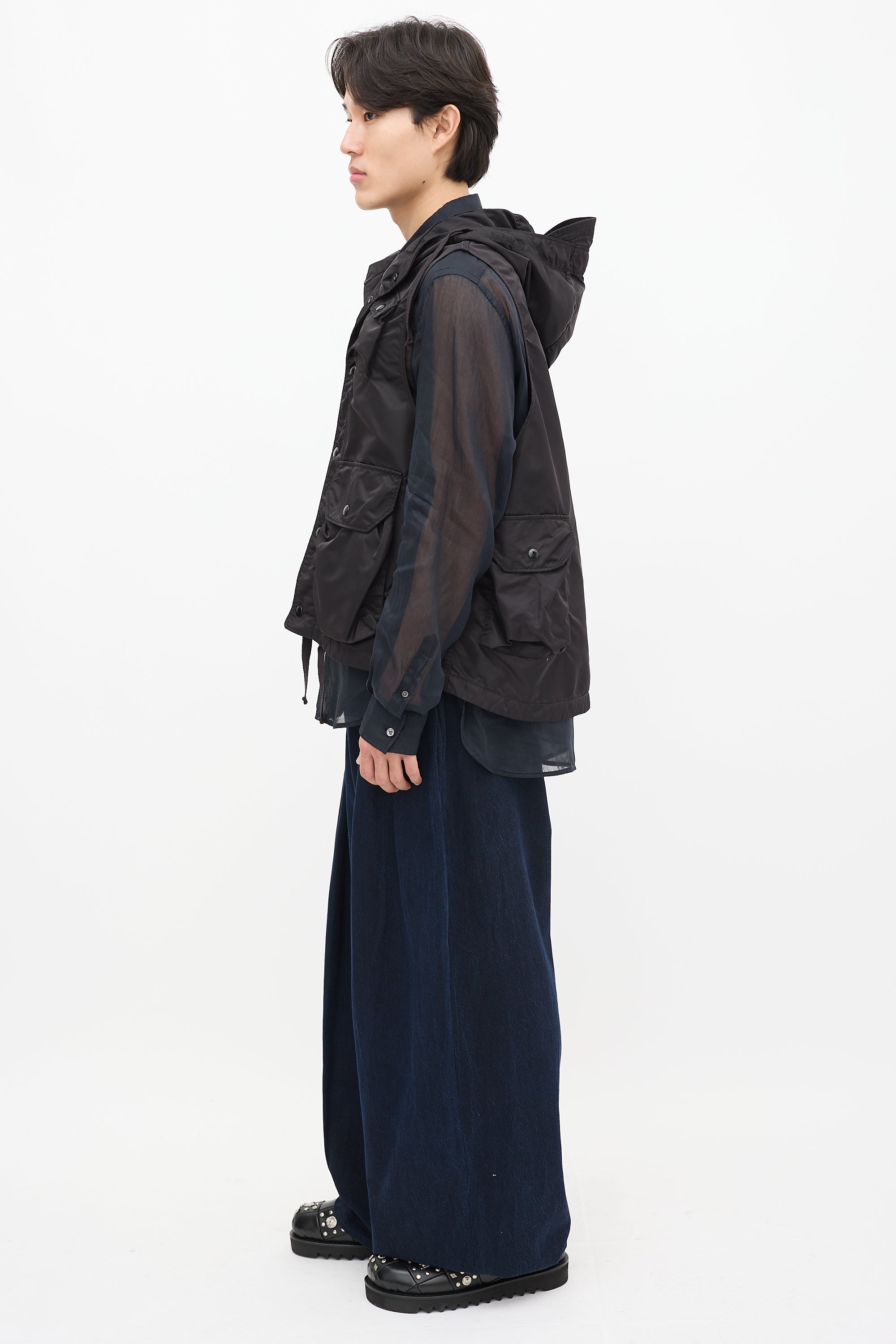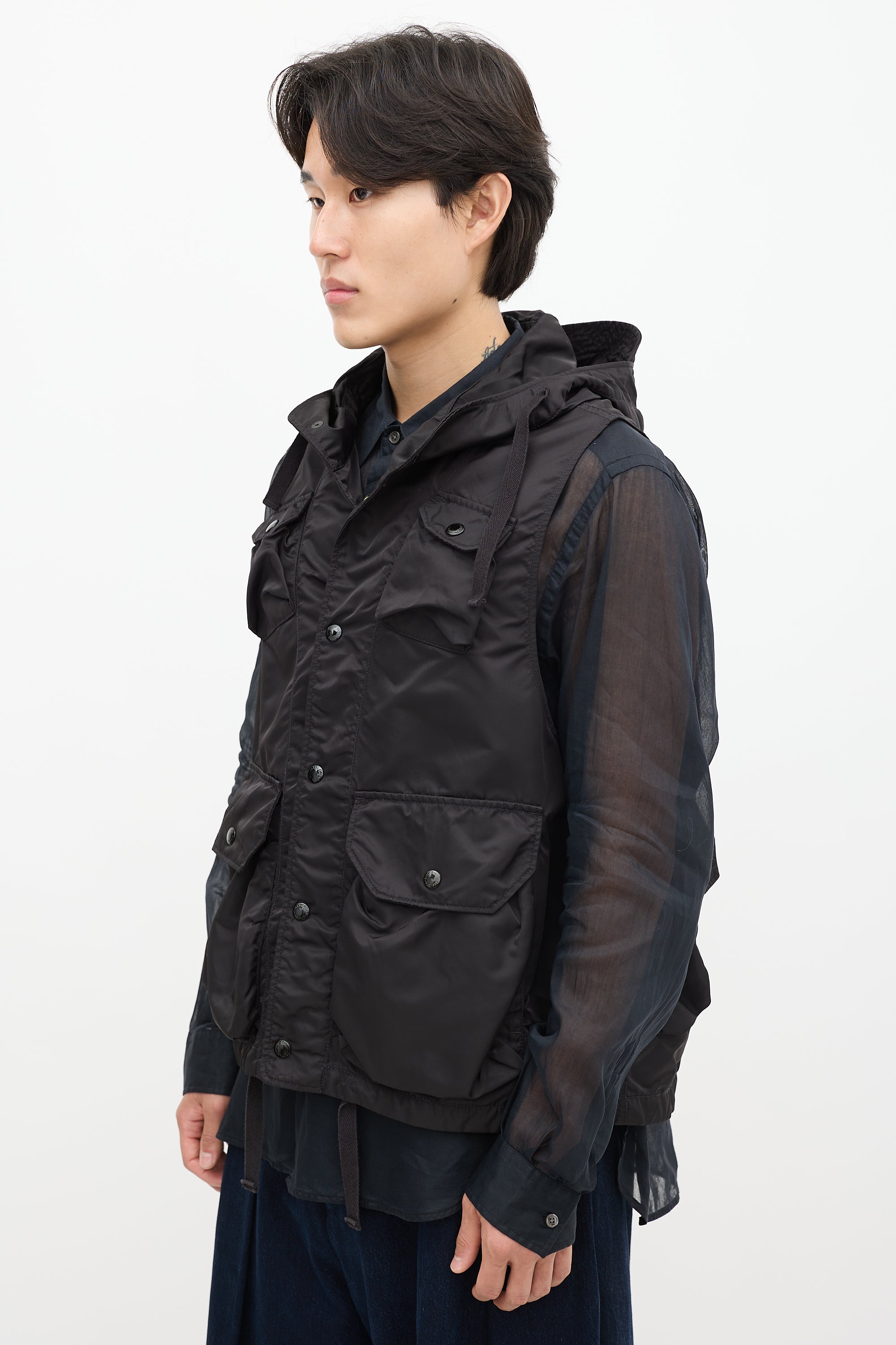 Pre-owned Engineered Garments black nylon vest featuring a drawstring hood, sleeveless styling, four cargo pockets at front, drawstring hem, two cargo pockets at back, and snap button up closure.