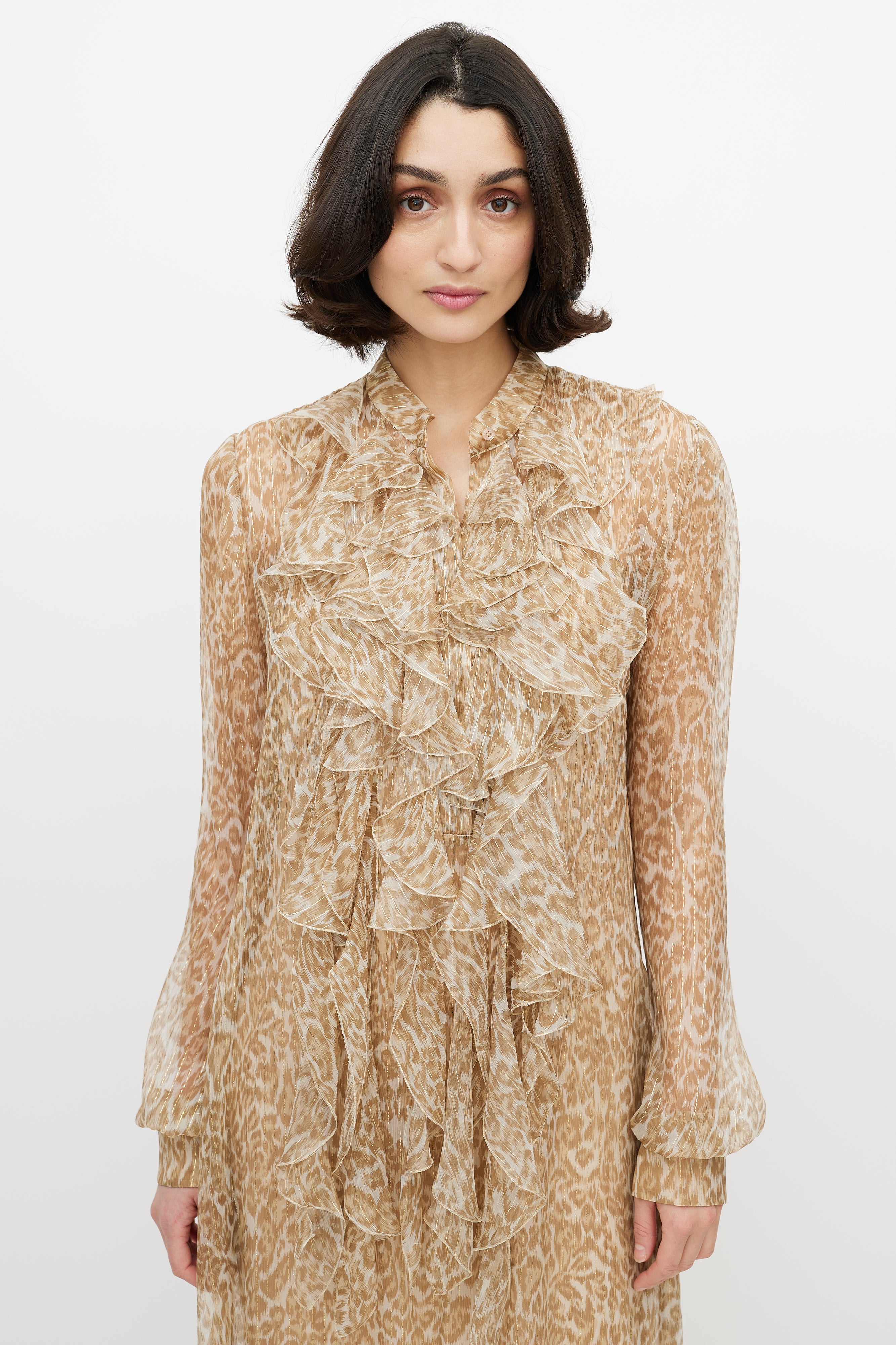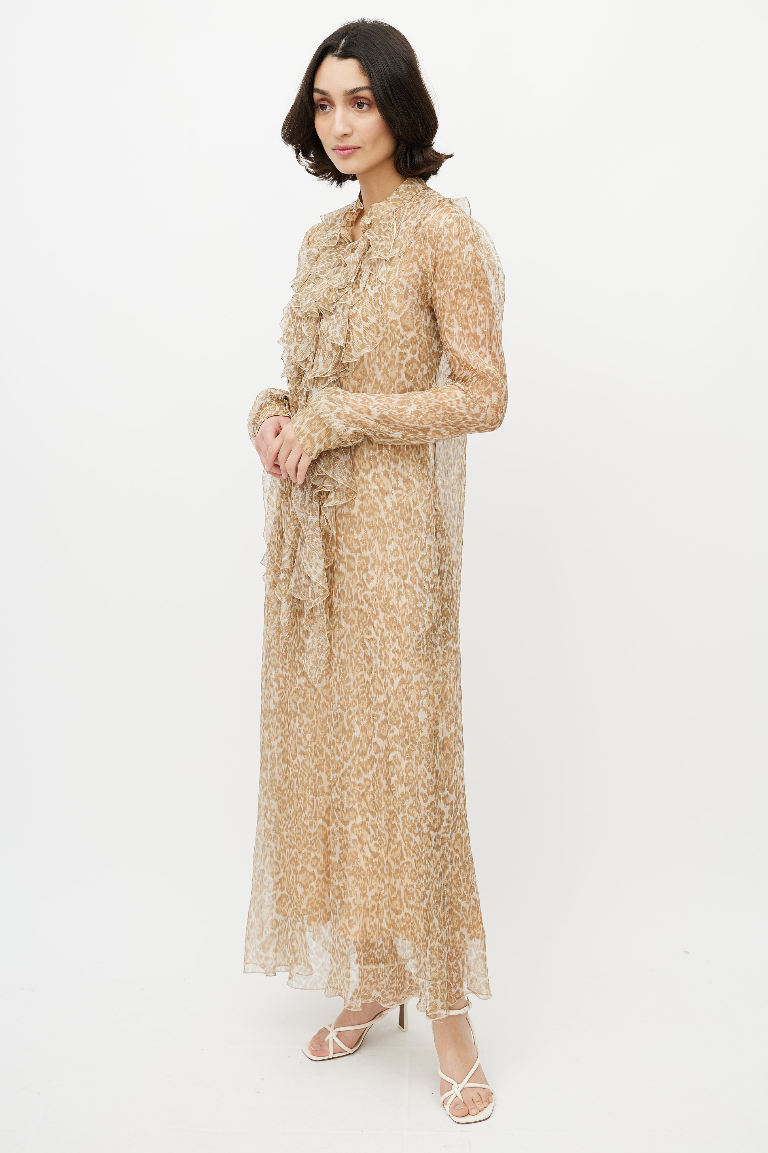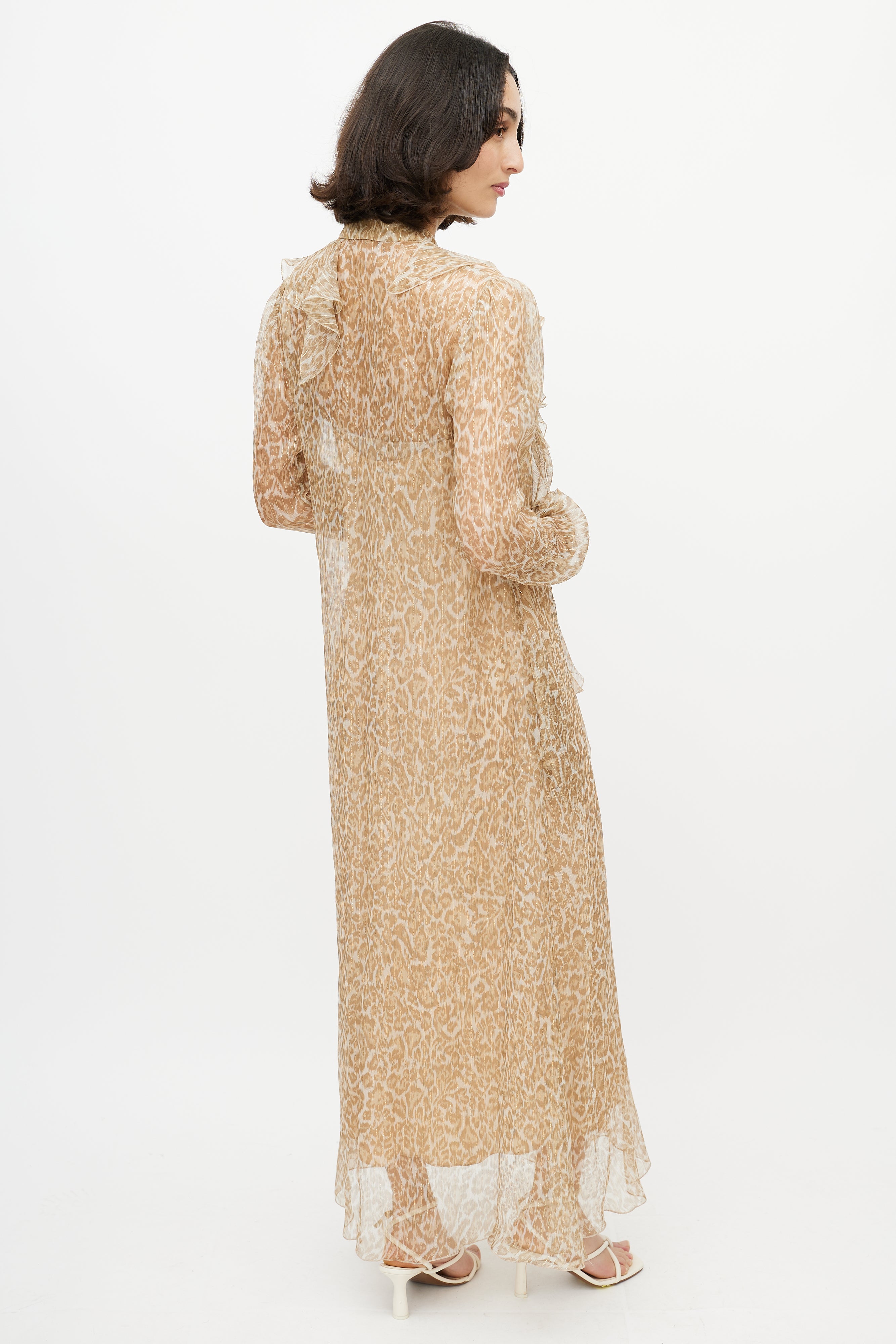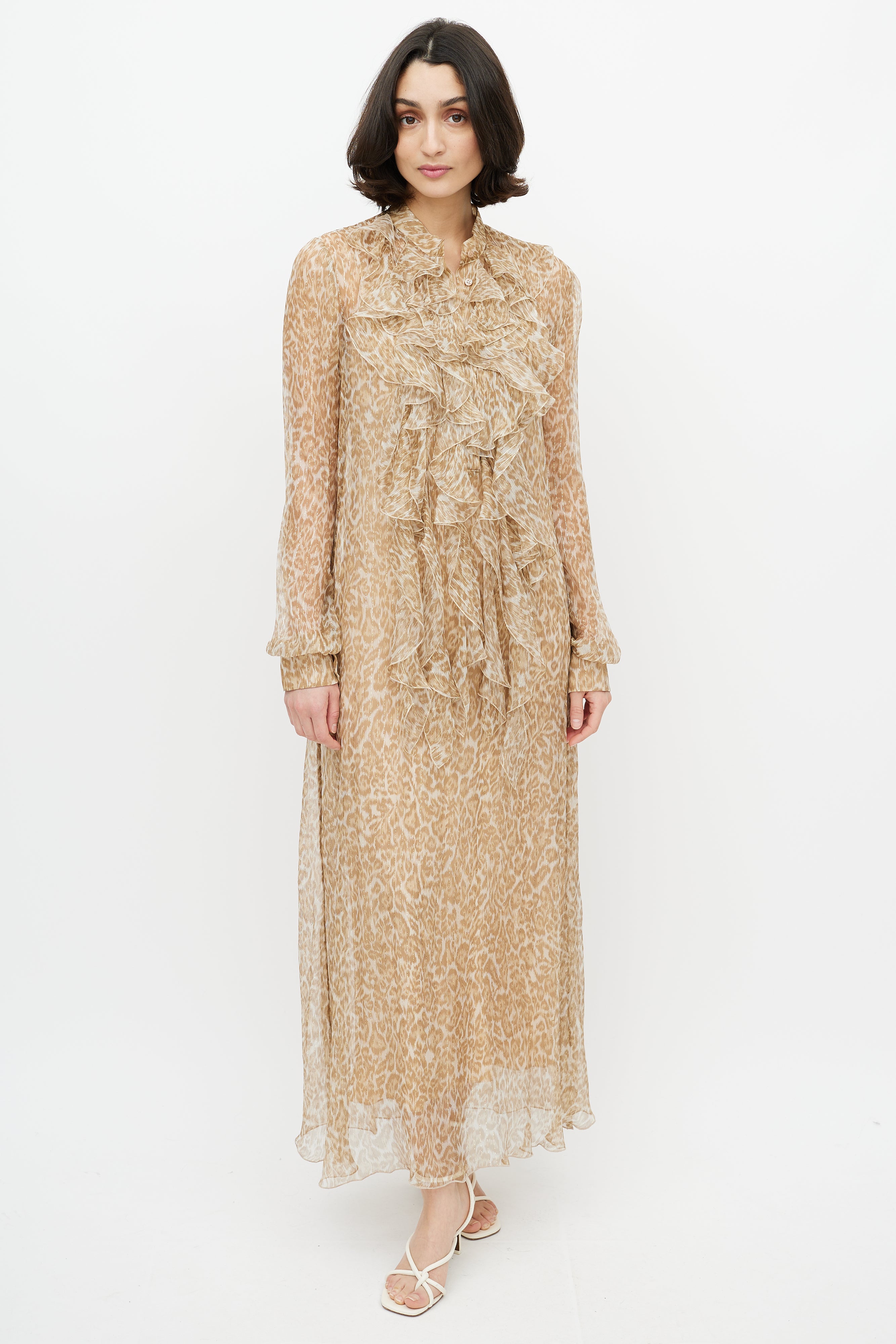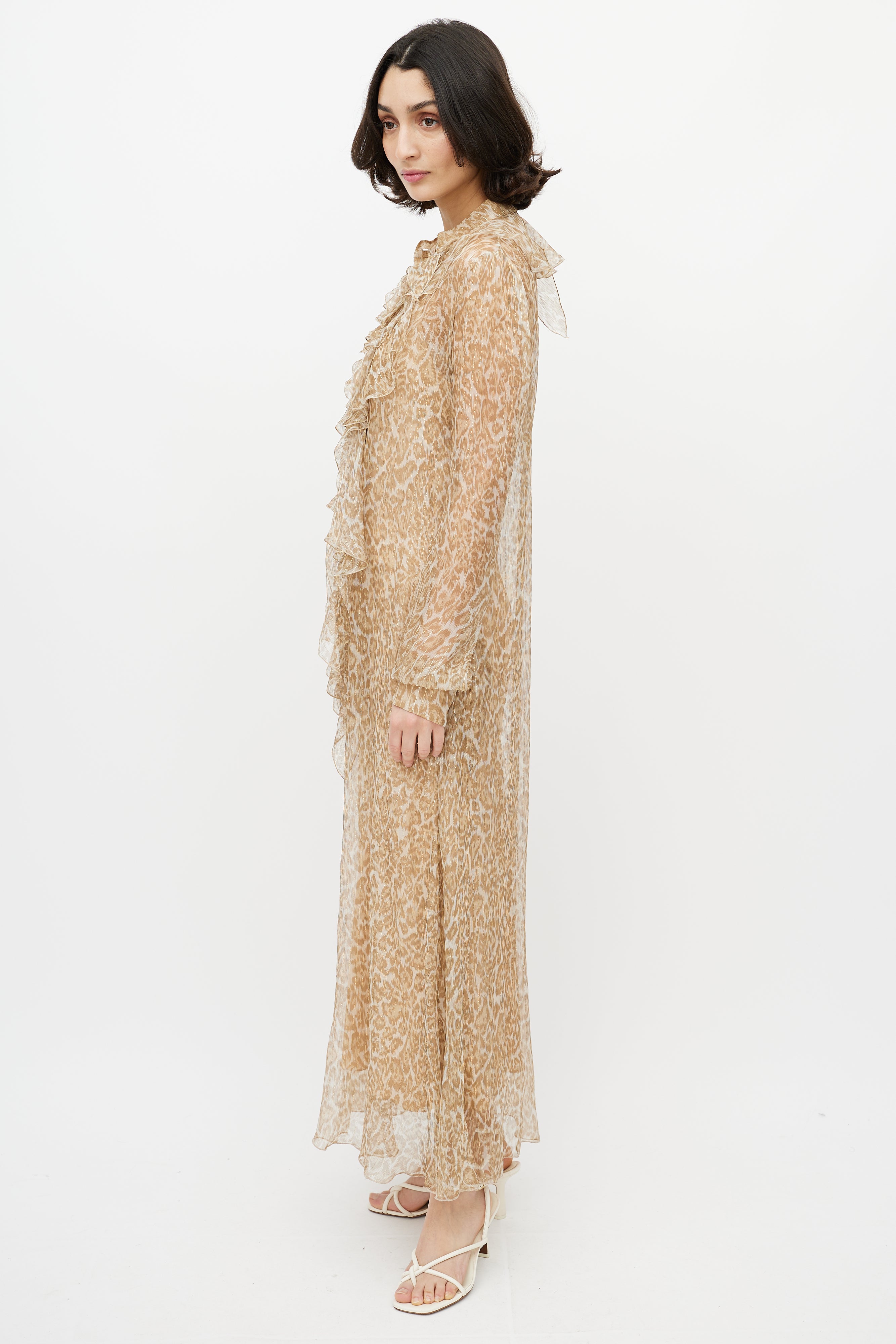 Pre-owned Ermanno Scervino brown and gold leopard print maxi sheer dress featuring detachable slip liner, ruffled V-neck collar, two buttons at collar, and cuffs with button closure.